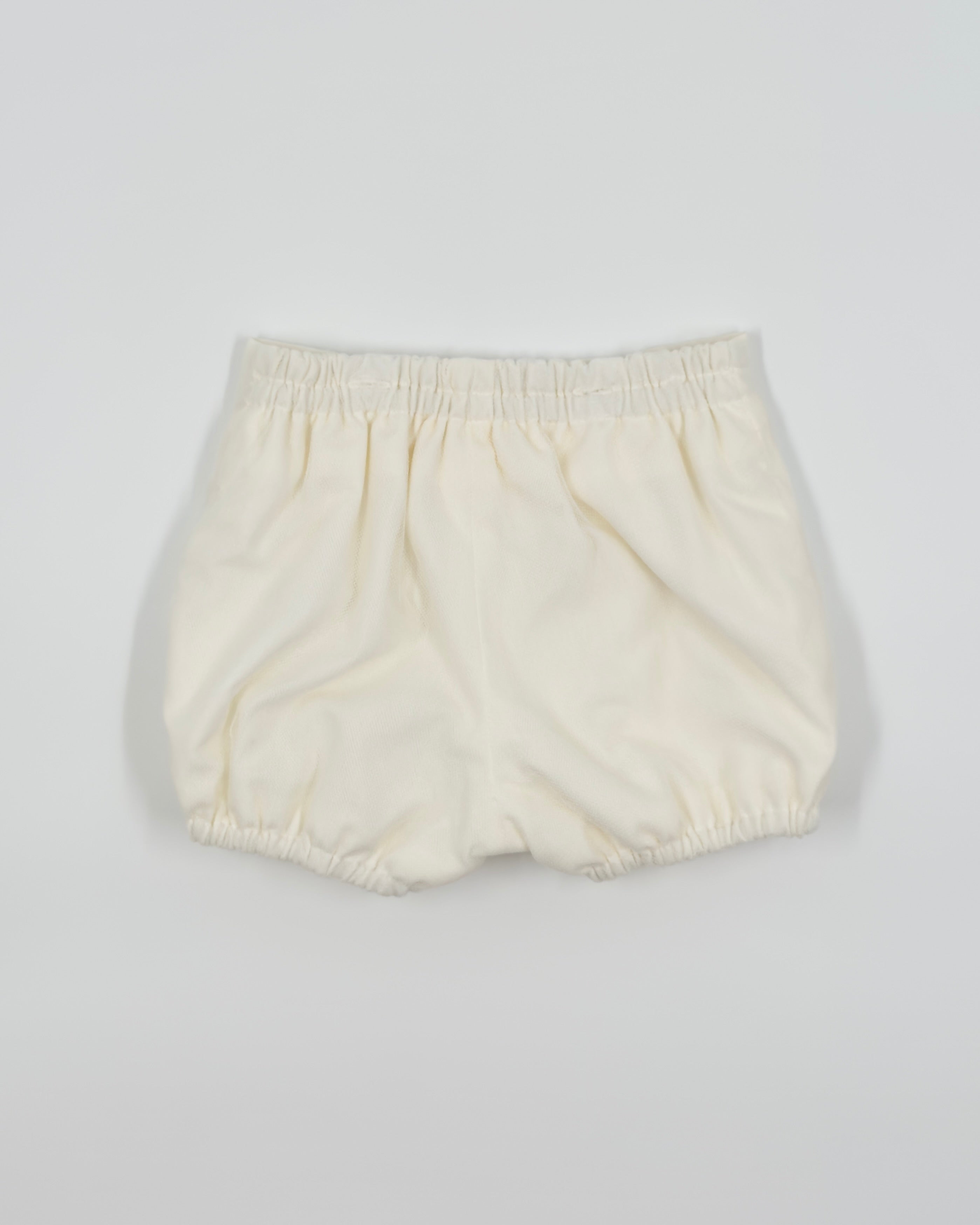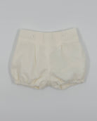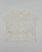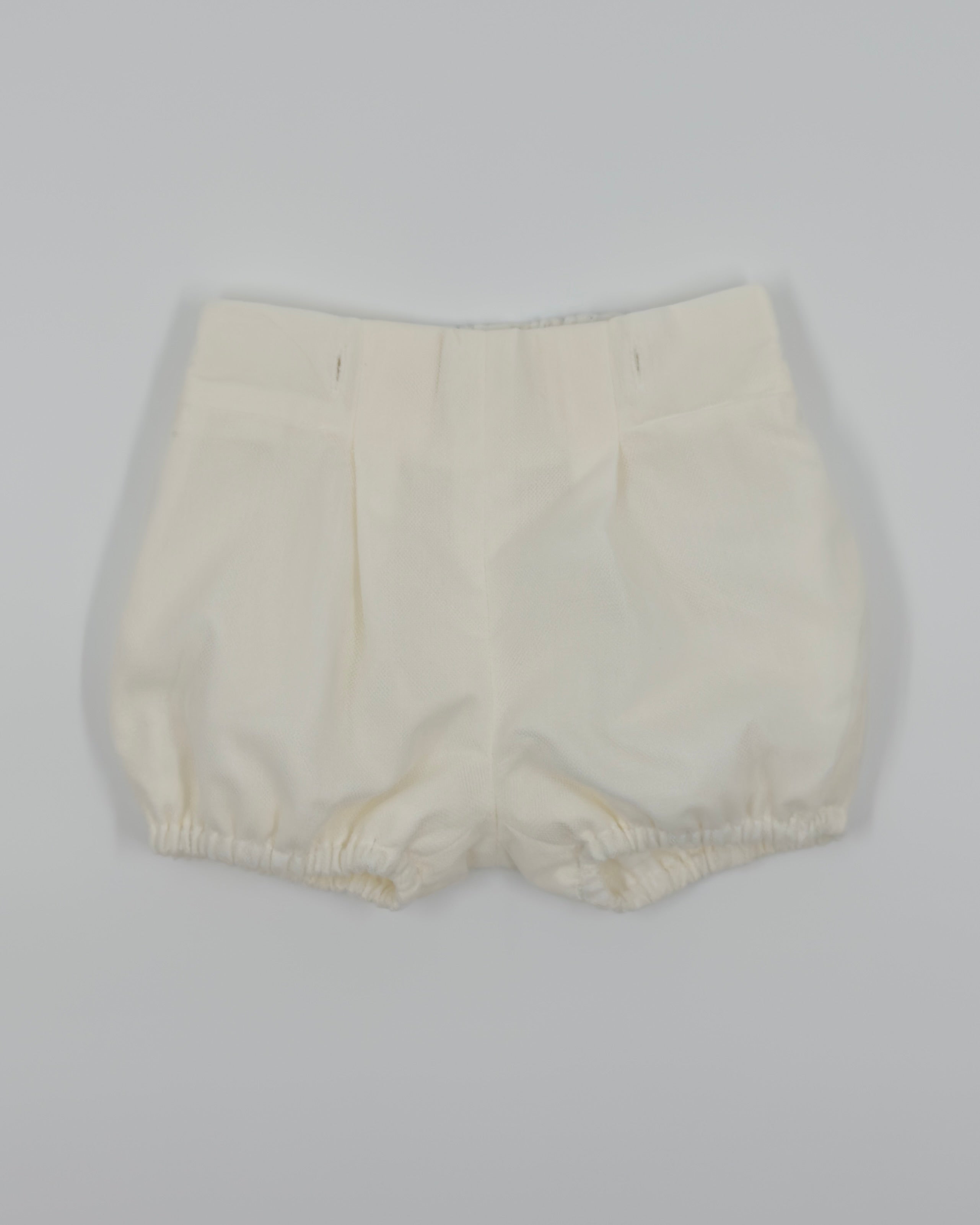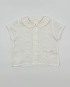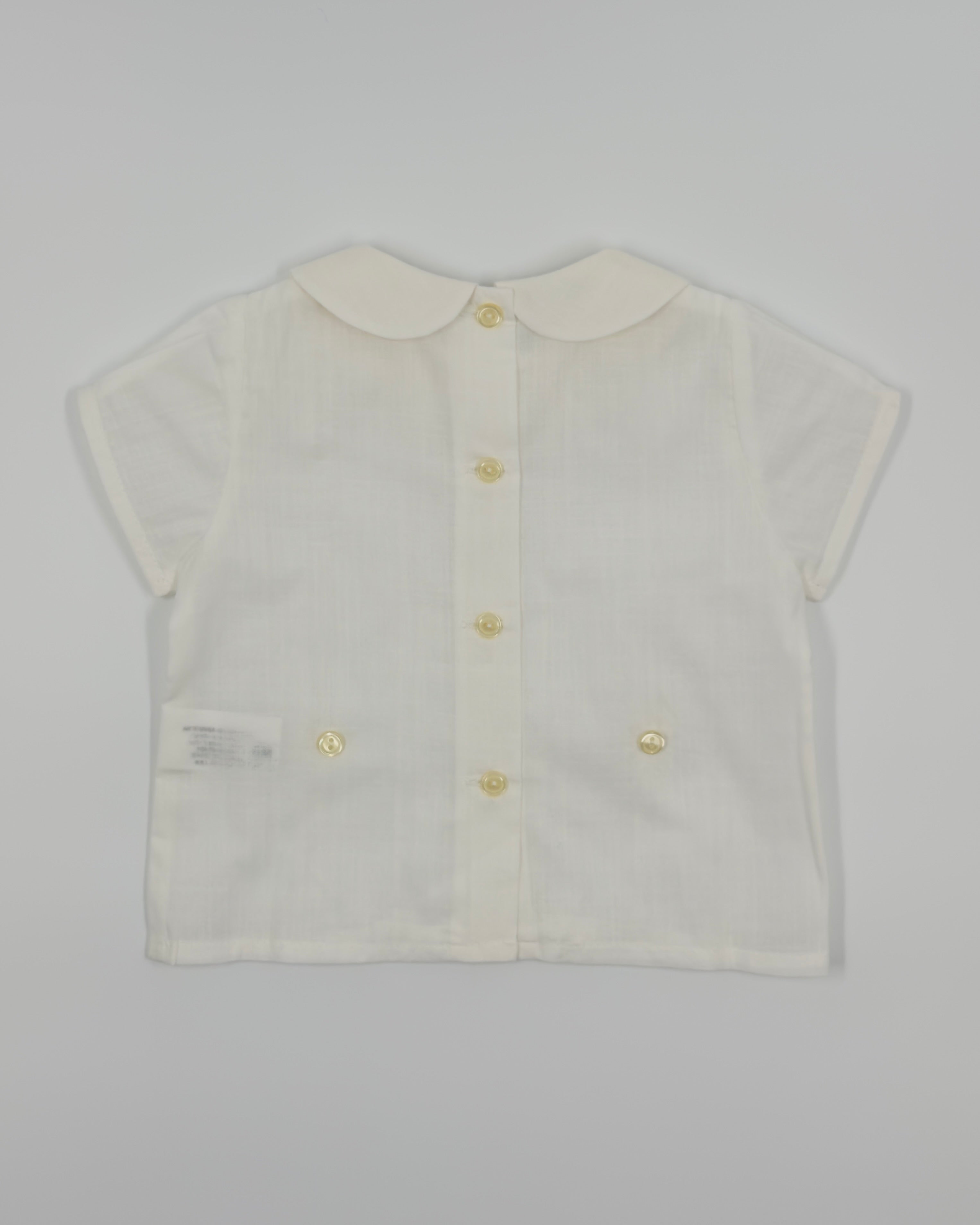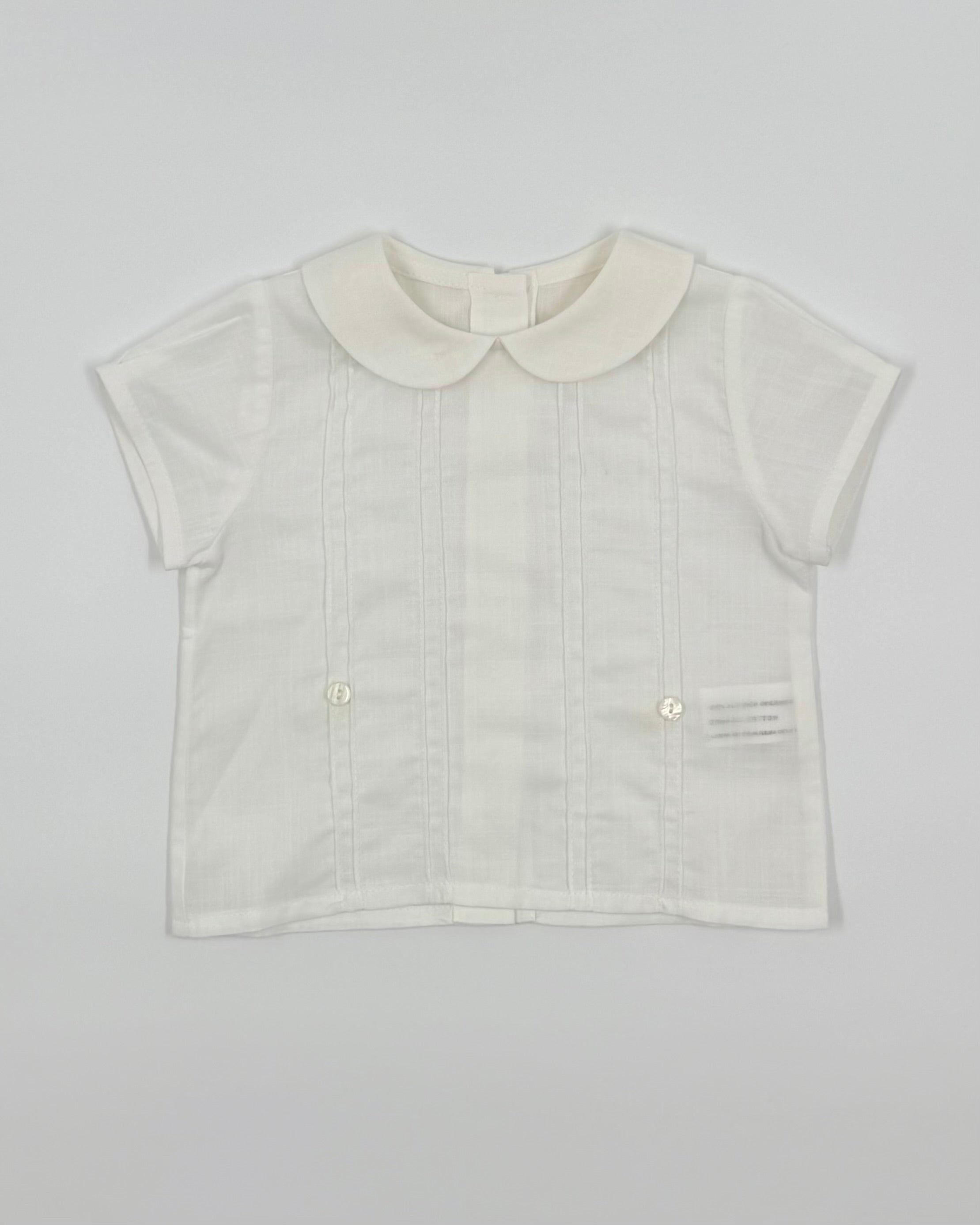 The Sebastián outfit is a classic two-piece set for baby boys, combining timeless style with refined details. The shirt is crafted from soft off-white batiste and features vertical pleats and a sweet Peter Pan collar, with button closure along the back. It pairs perfectly with pique bubble shorts in matching off-white, offering comfort and elegance for baptisms, baby dedications, and special occasions.