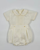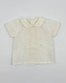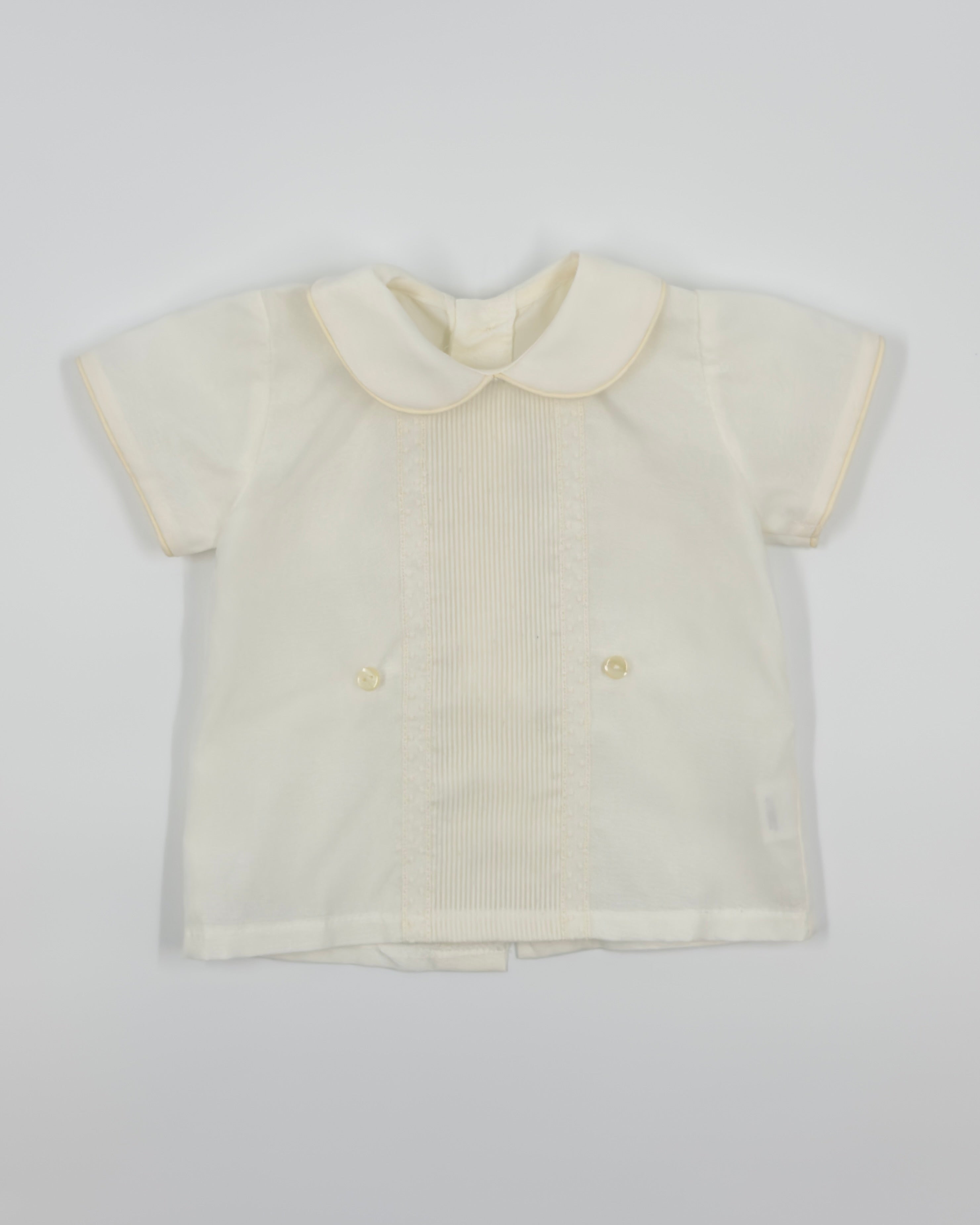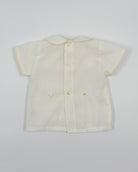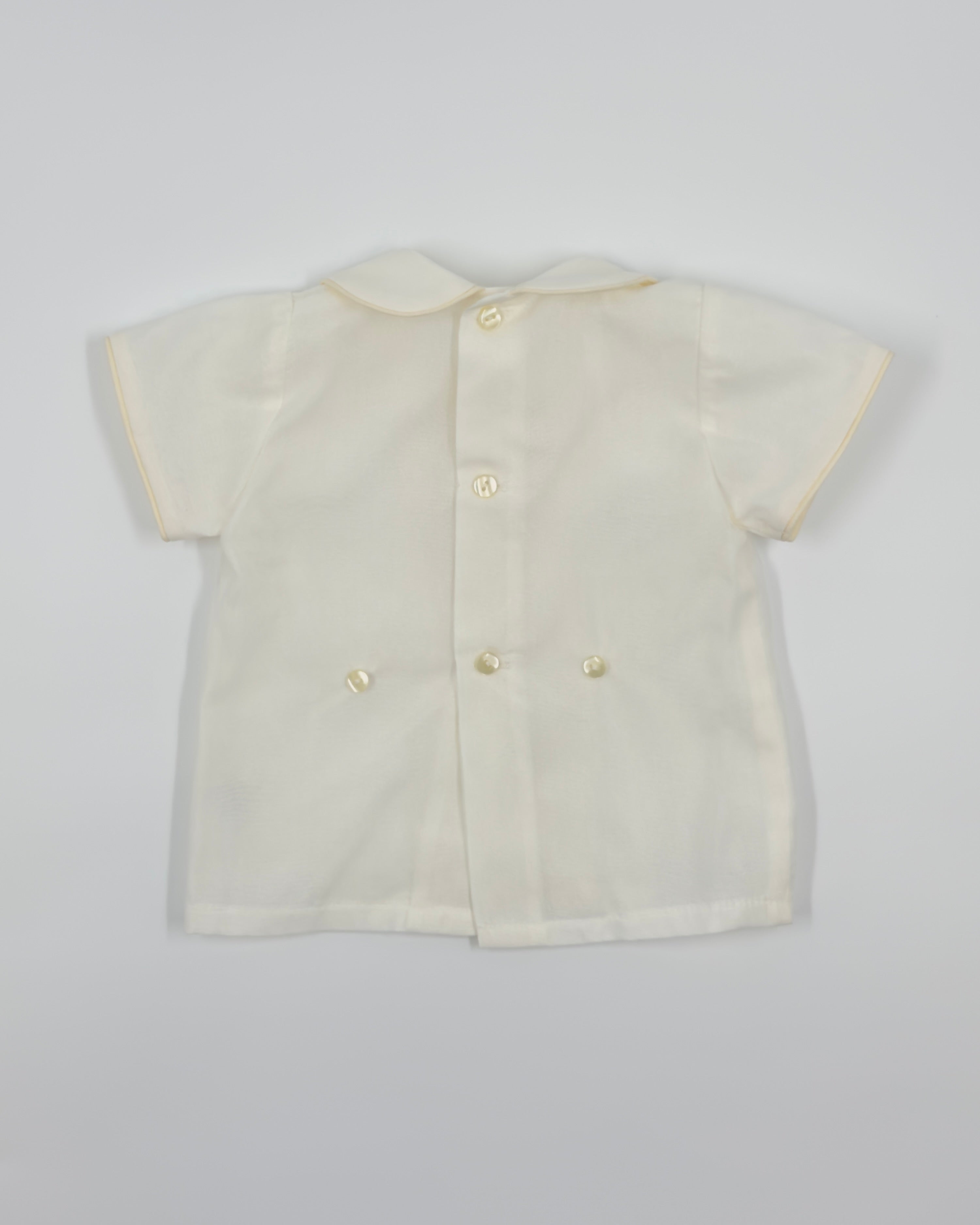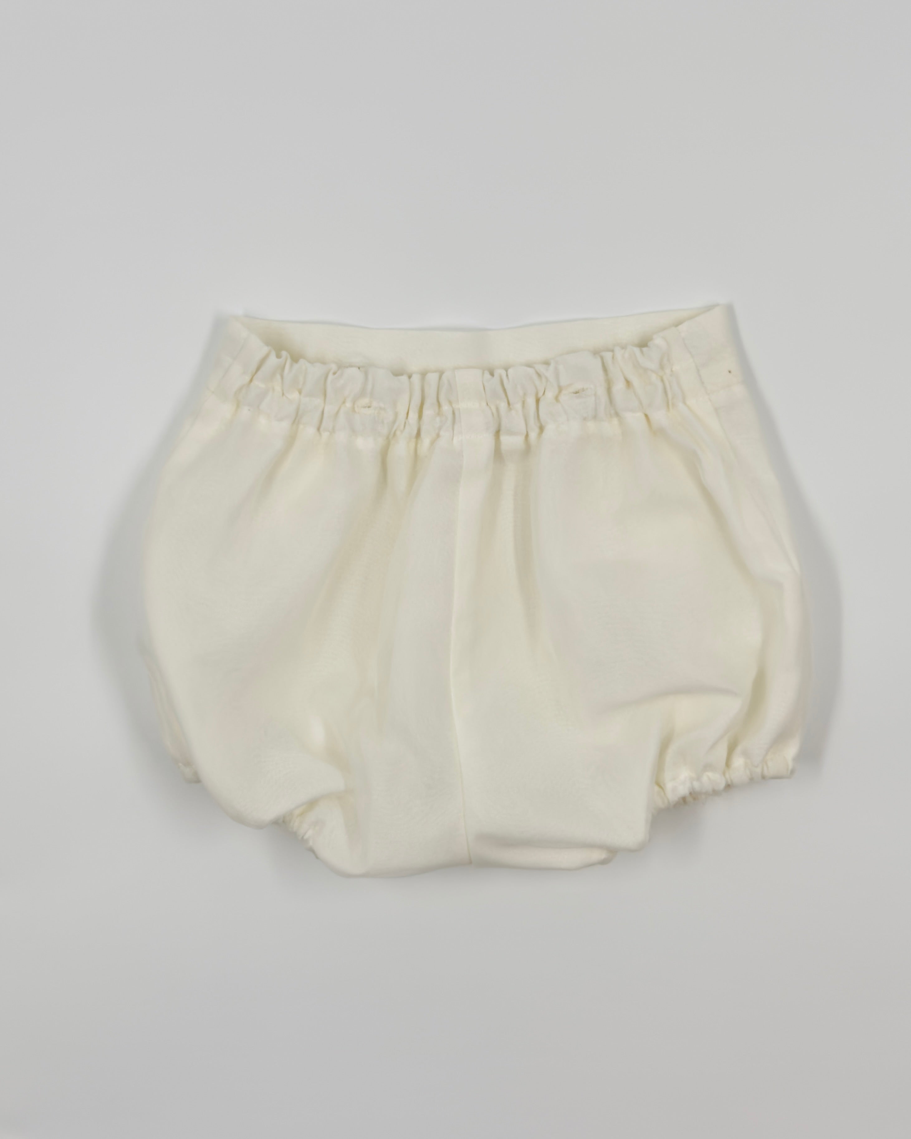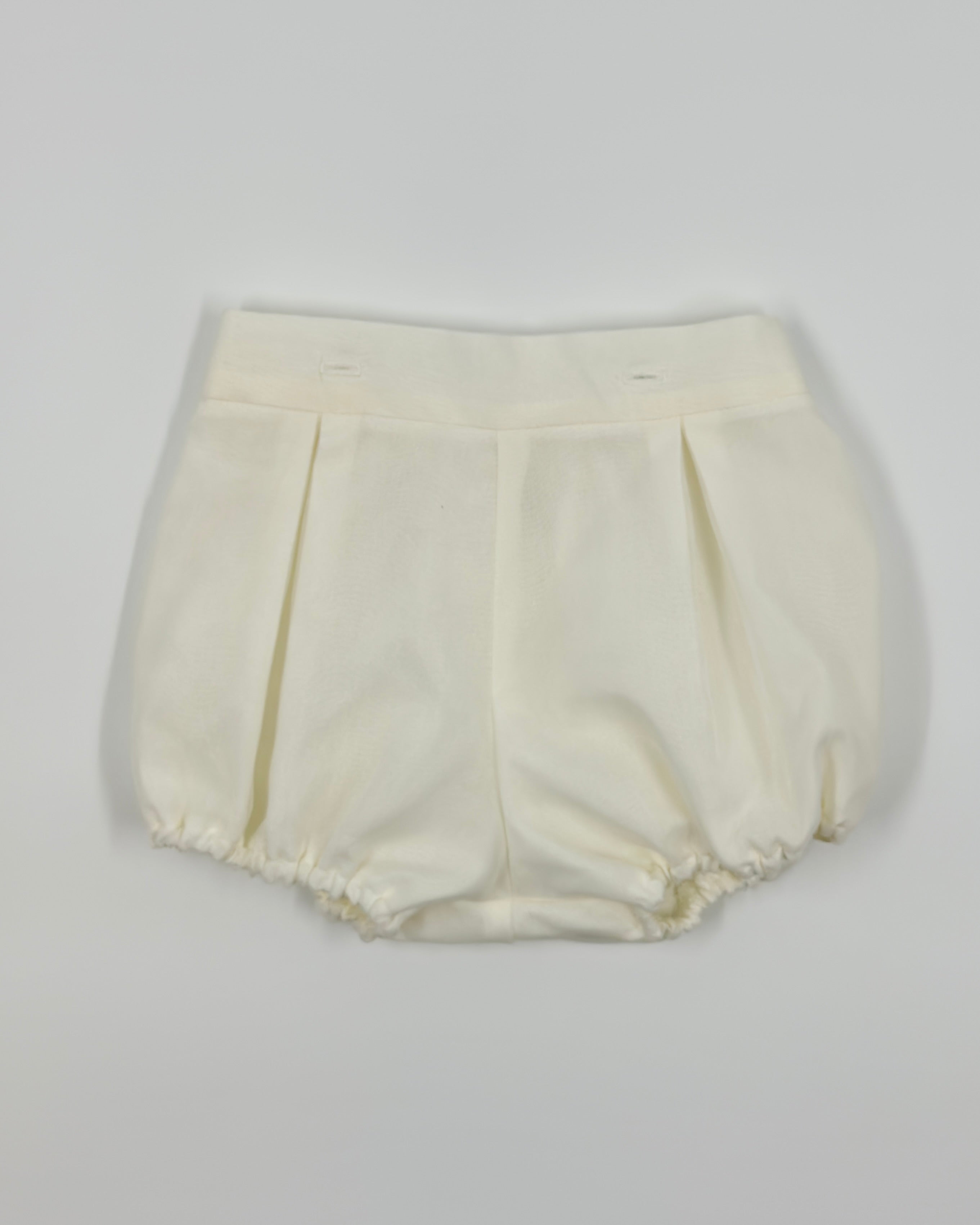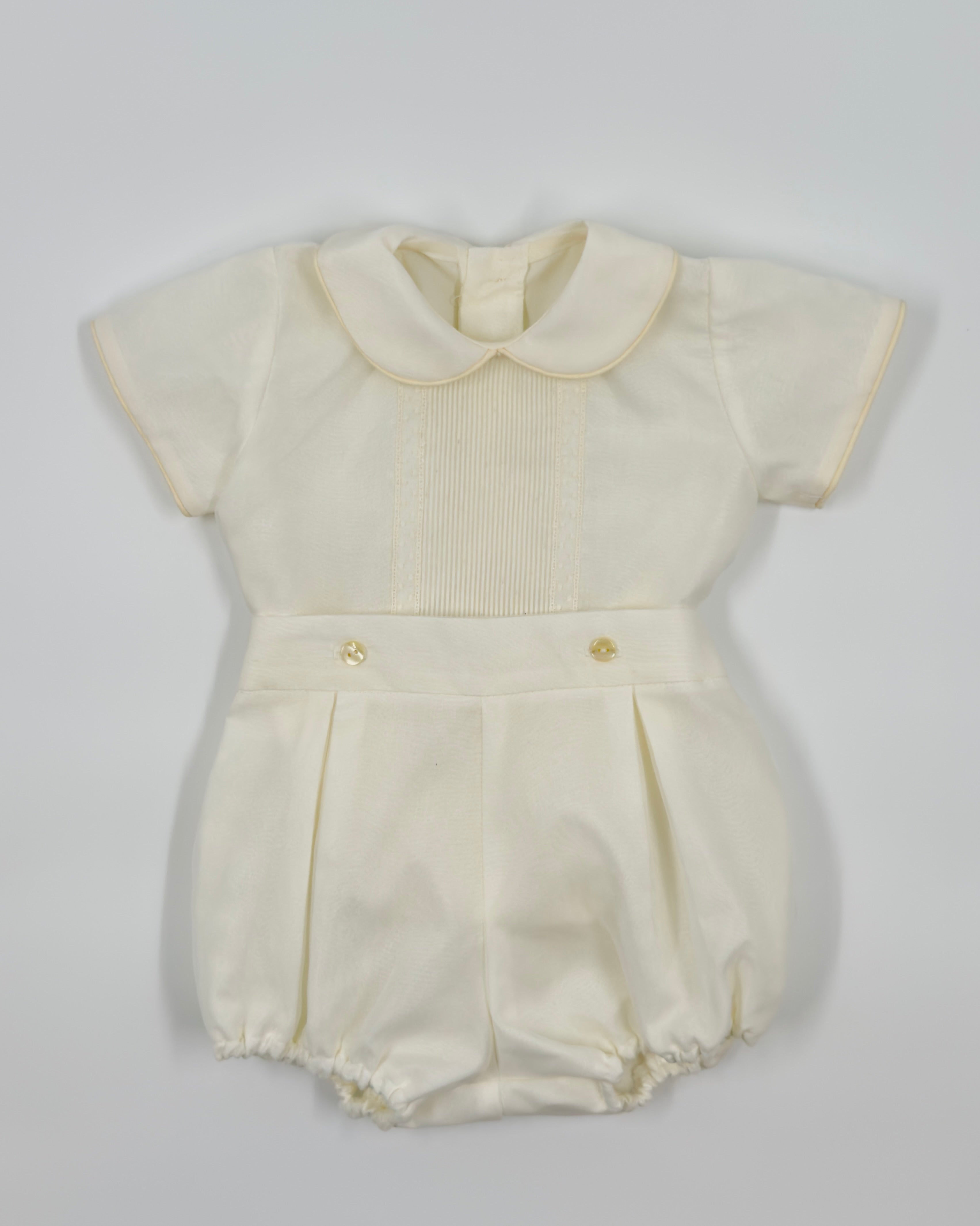 Zack is a traditional two-piece outfit for baby boys, made with a batiste lining and organza shell in off-white. The shirt has a peter pan collar and details with buttons on the back for closure. The bubble short has elastic on the leg opening, which is very soft, and buttons on the side for closure. Very elegant and unique option to dress your little one in any special occasion.