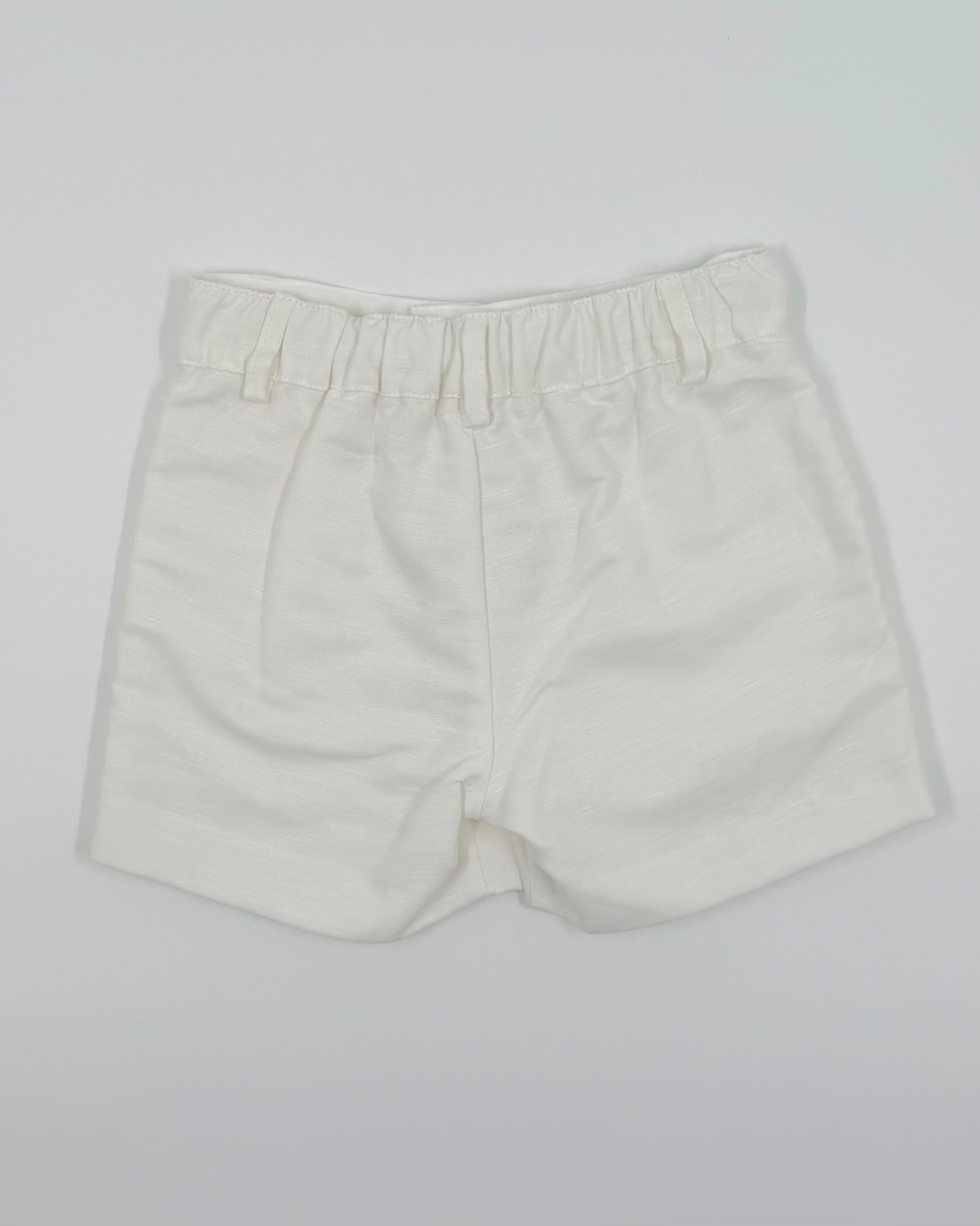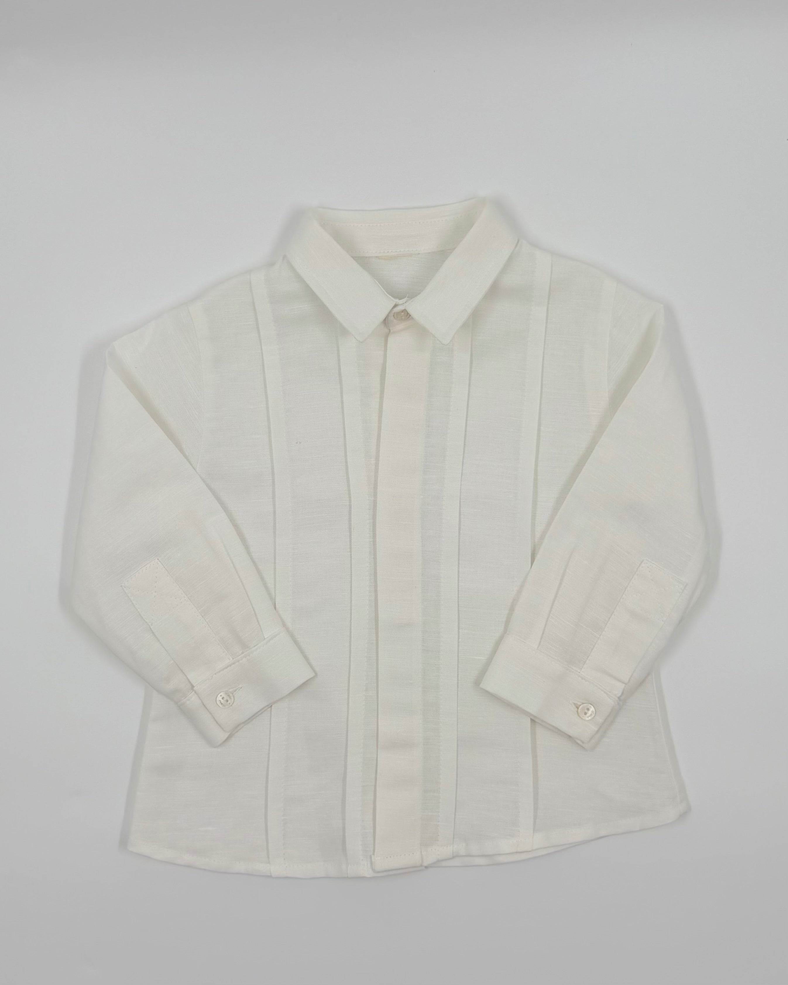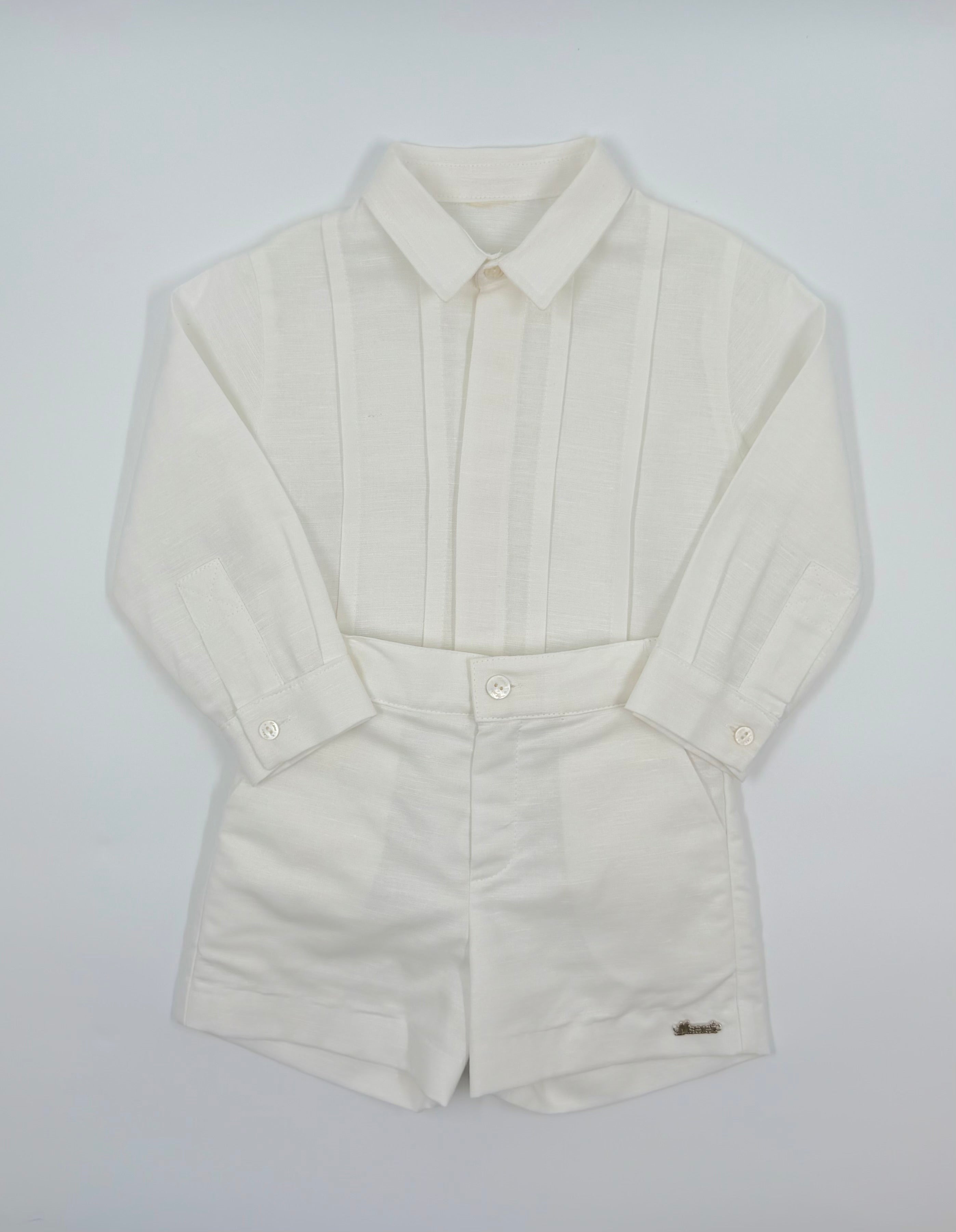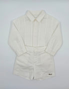 The Alejandro outfit is a sophisticated two-piece set for toddler boys, designed for style and comfort on any special occasion. Made from breathable white linen, the long-sleeve shirt features a classic front button closure for a polished look. Paired with matching tailored shorts, this timeless set is perfect for weddings, baptisms, family gatherings, and warm-weather celebrations.