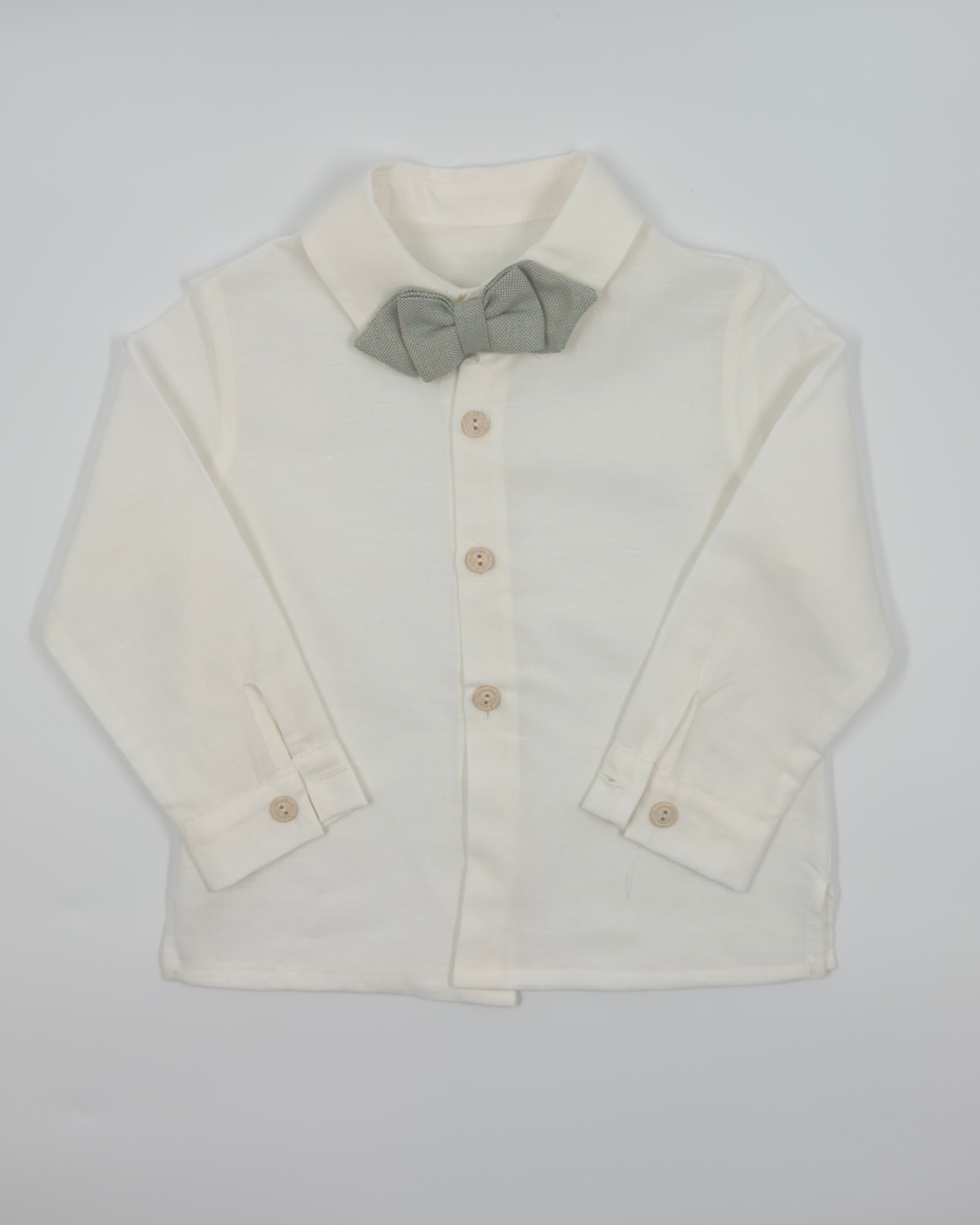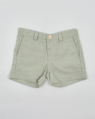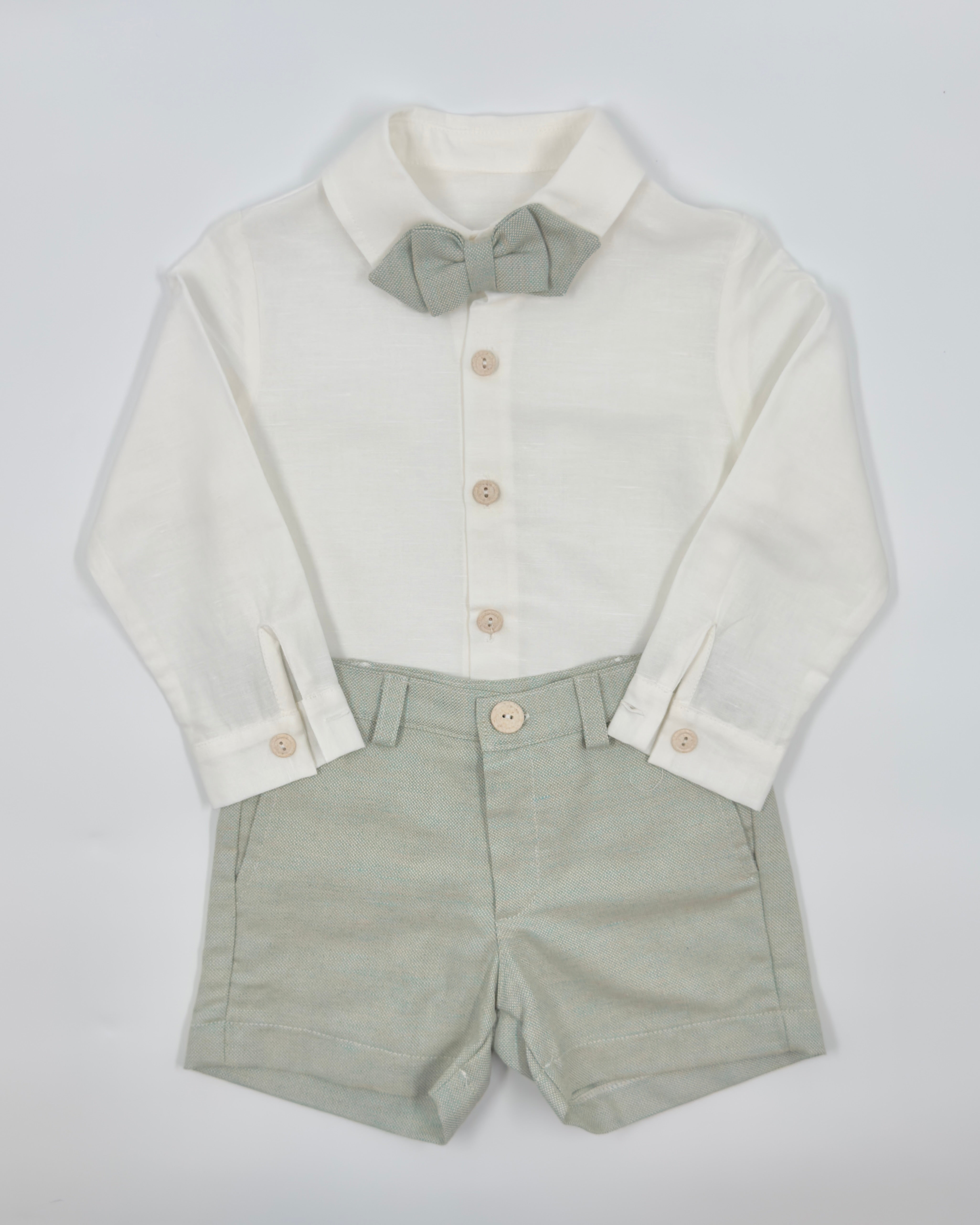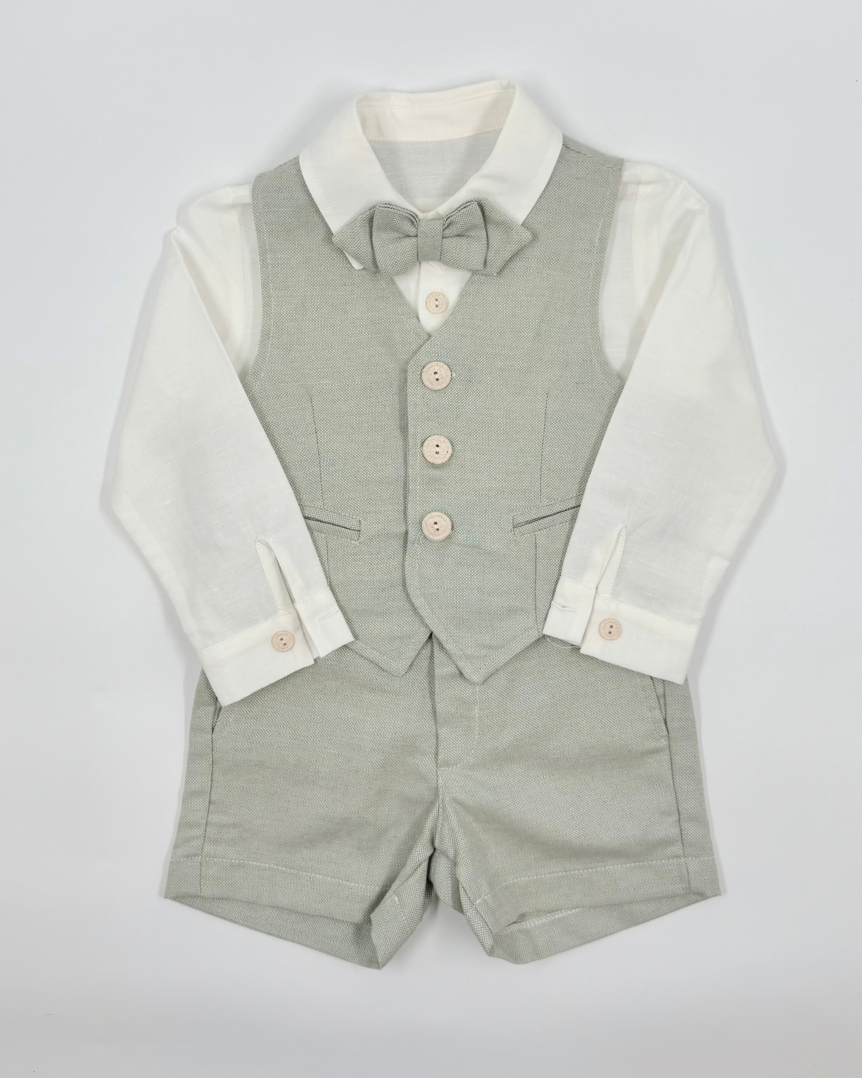 Alessandro is a four-piece set for boys to wear on any special occasion. It includes a white button down shirt, sage green vest, sage green bermudas, and tie.
