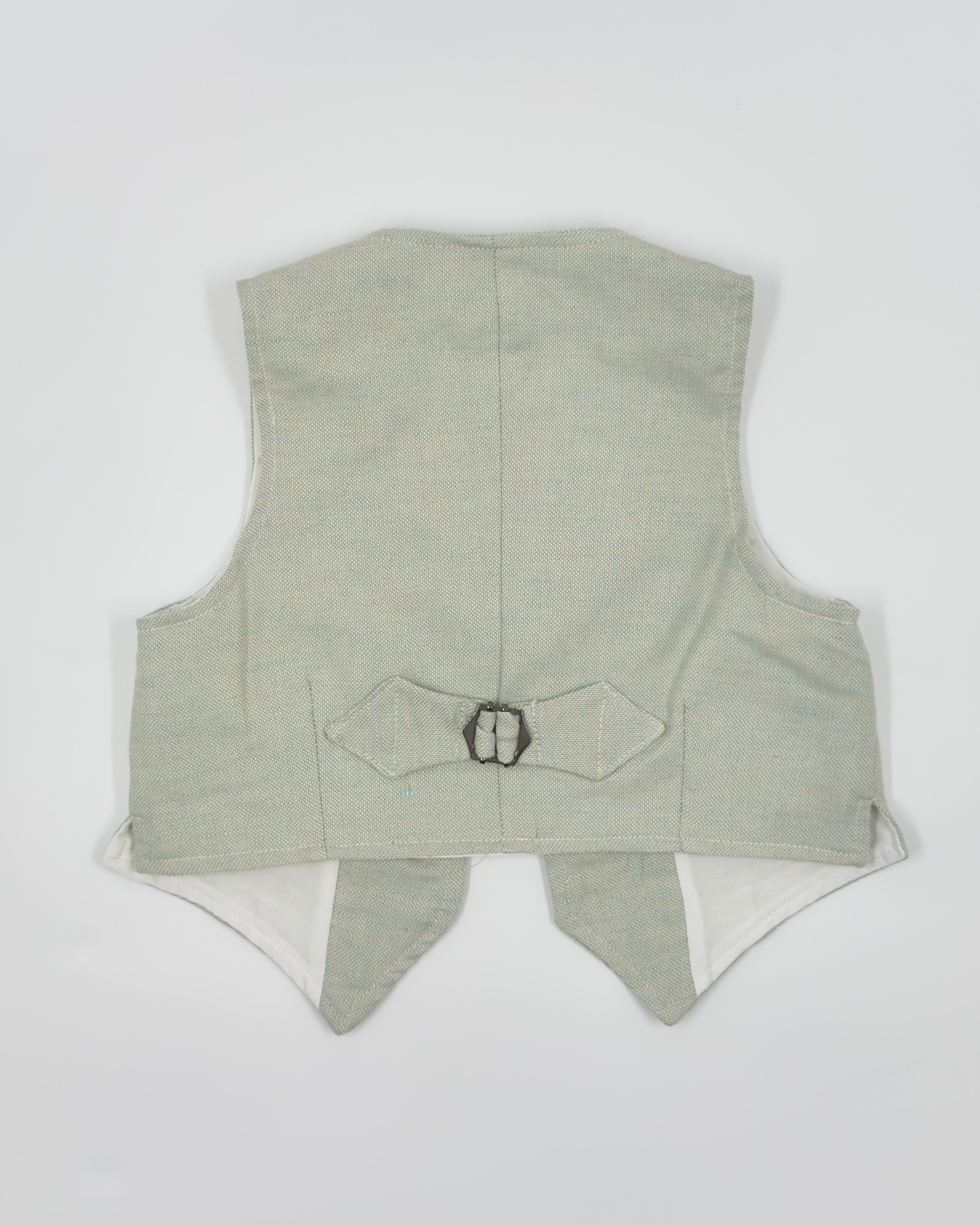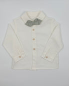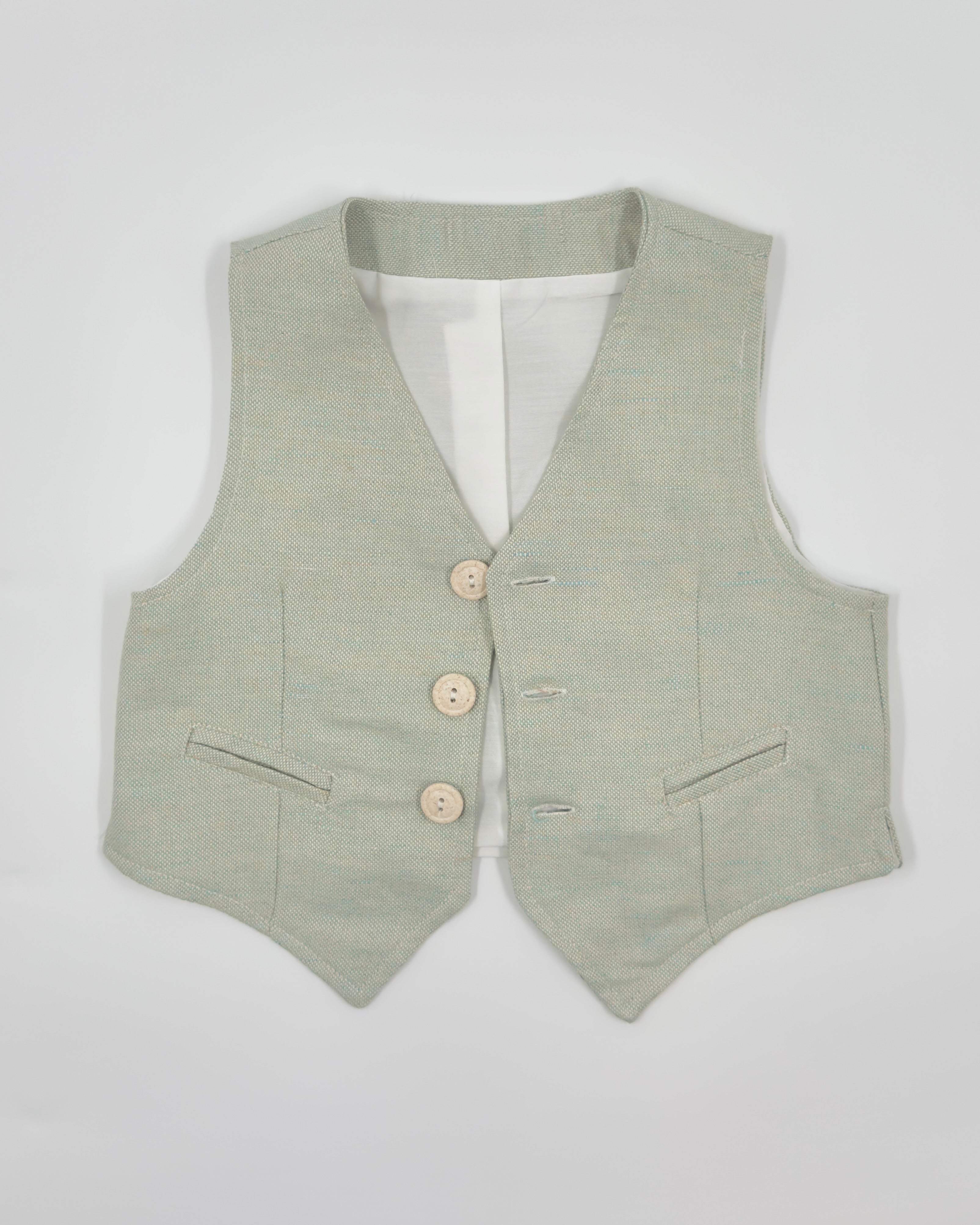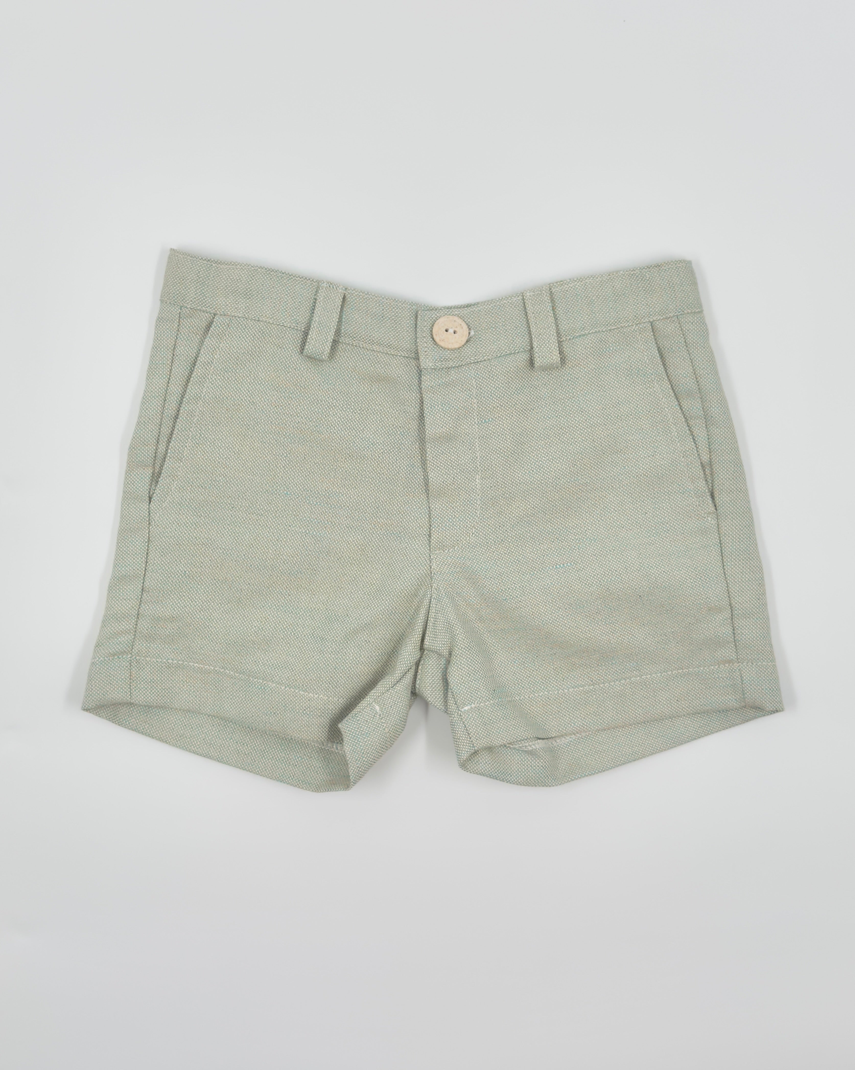 Alessandro is a four-piece set for boys to wear on any special occasion. It includes a white button down shirt, sage green vest, sage green bermudas, and tie.