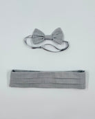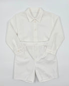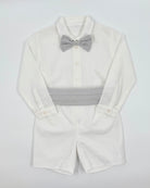 The Alex outfit is a classic and stylish two-piece set for toddler boys, designed for ring bearers and formal occasions. It features a crisp white long-sleeve shirt with front buttons, paired with tailored straight shorts. A soft grey bow tie and matching sash add a refined touch, making Alex the perfect choice for weddings, parties, and special celebrations.