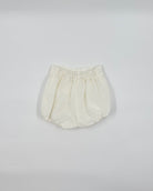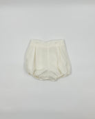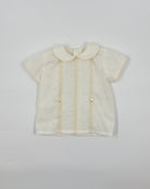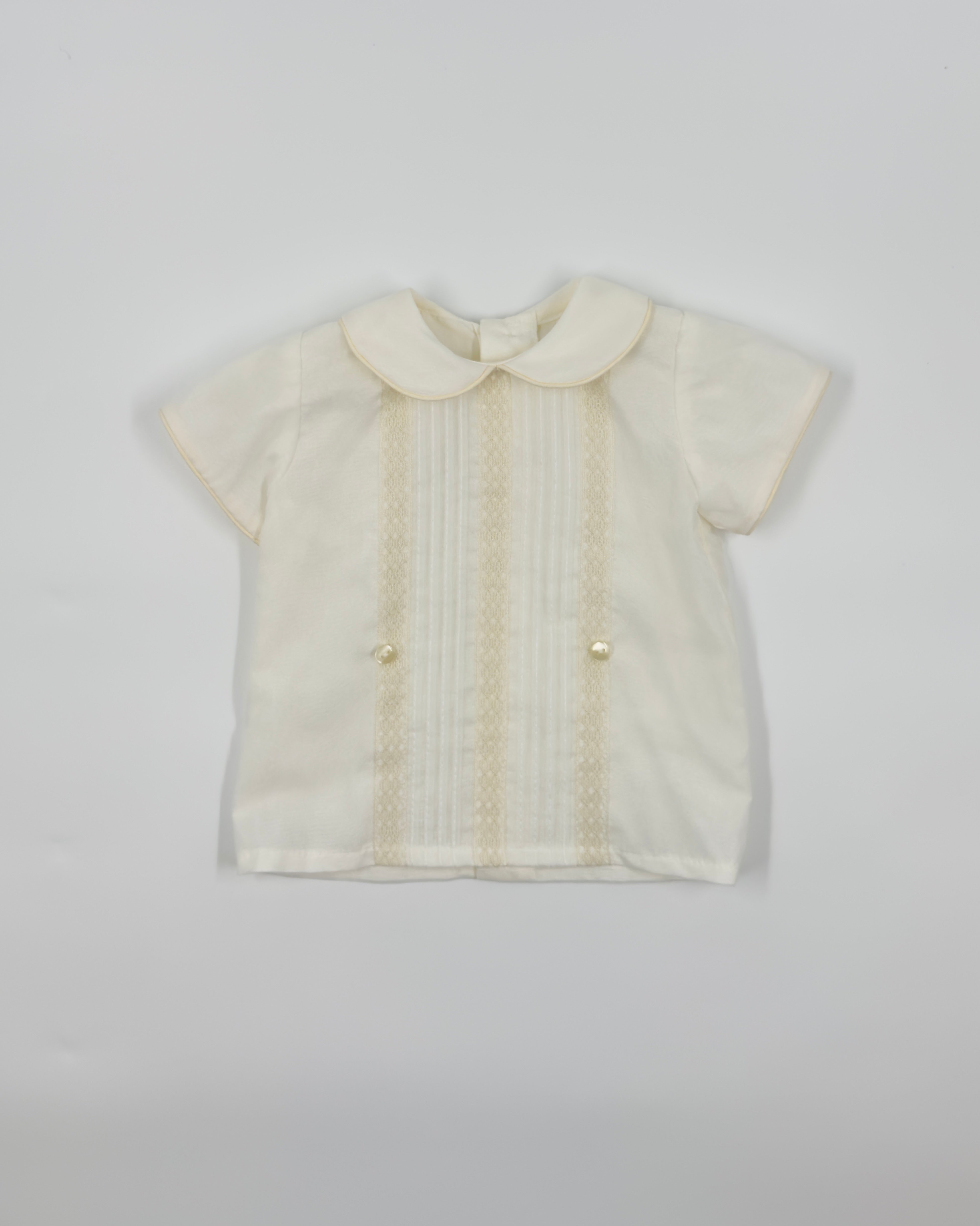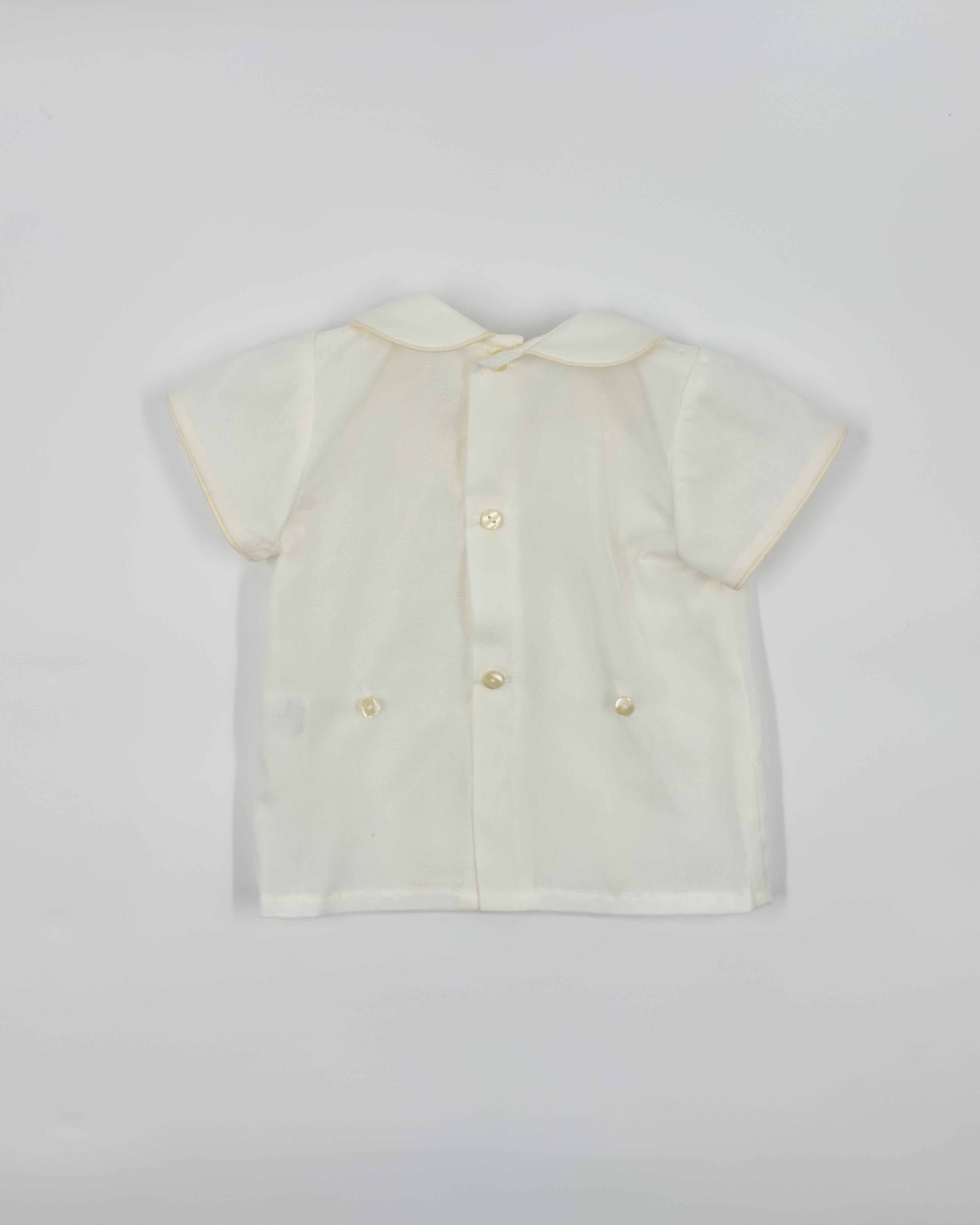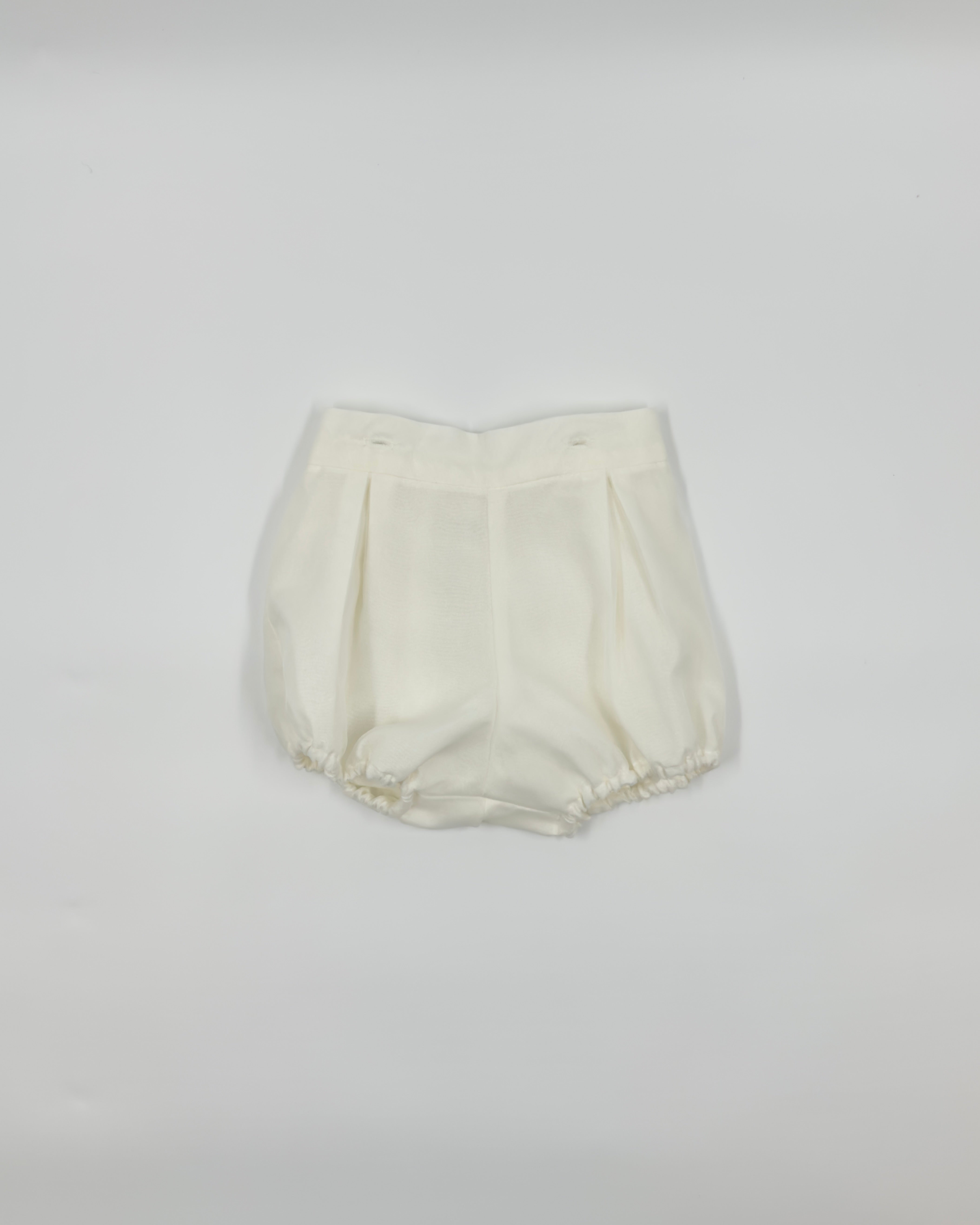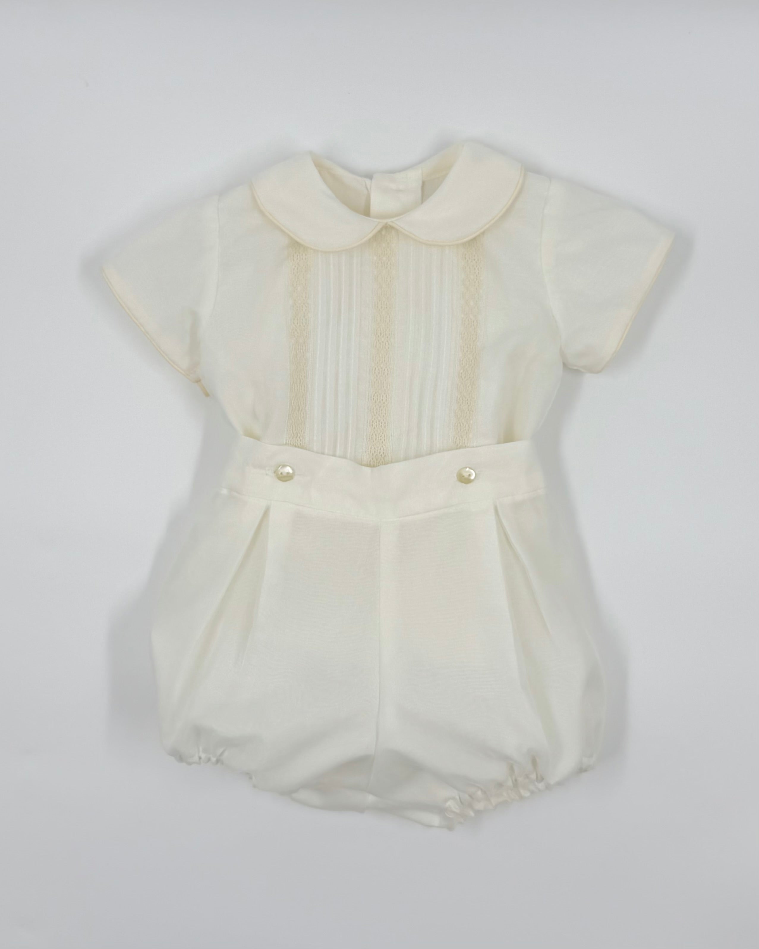 Cesar is a traditional two-piece outfit for baby boys, made with a batiste lining and organza shell in off-white. The shirt has a peter pan collar and details with buttons on the back for closure. The bubble short has elastic on the leg opening, which is very soft, and buttons on the side for closure. Very elegant and unique option to dress your little one in any special occasion.