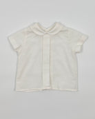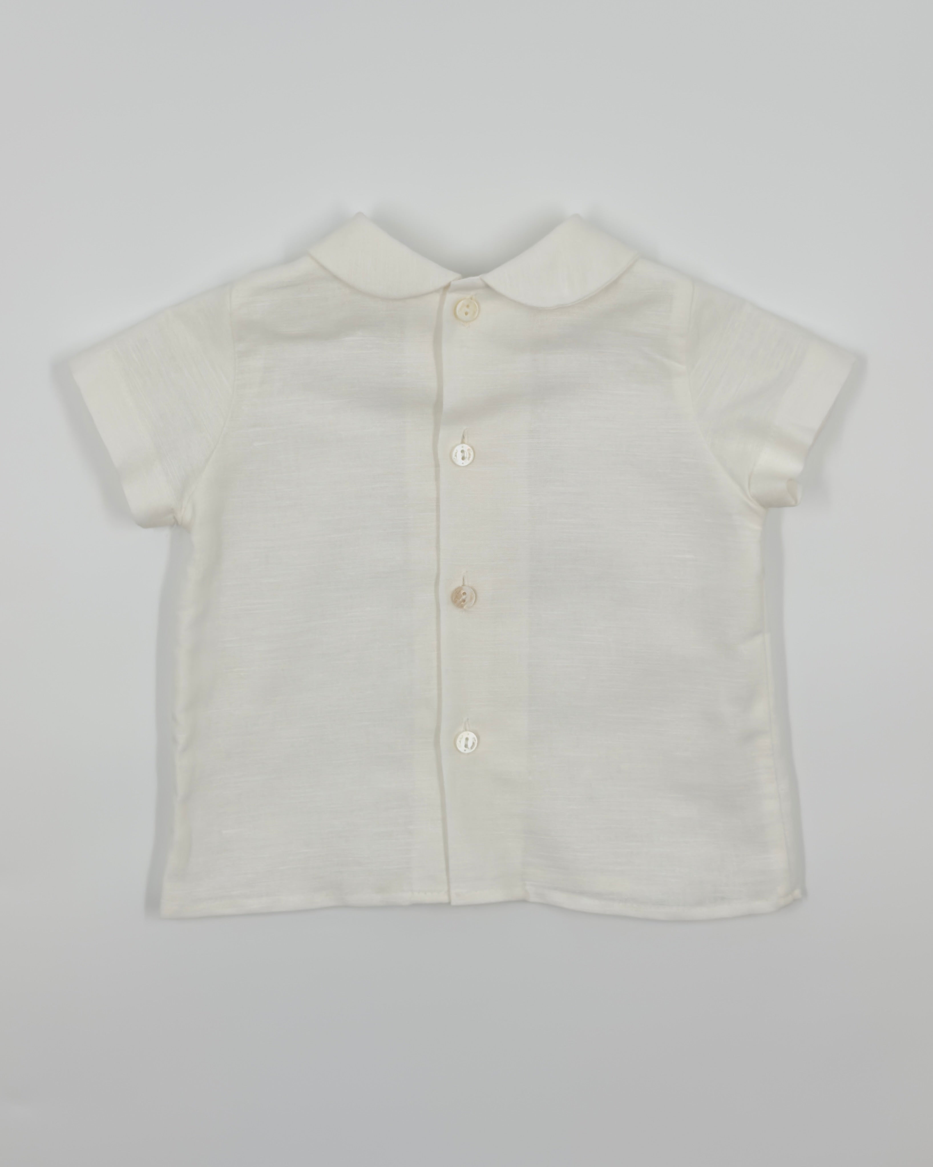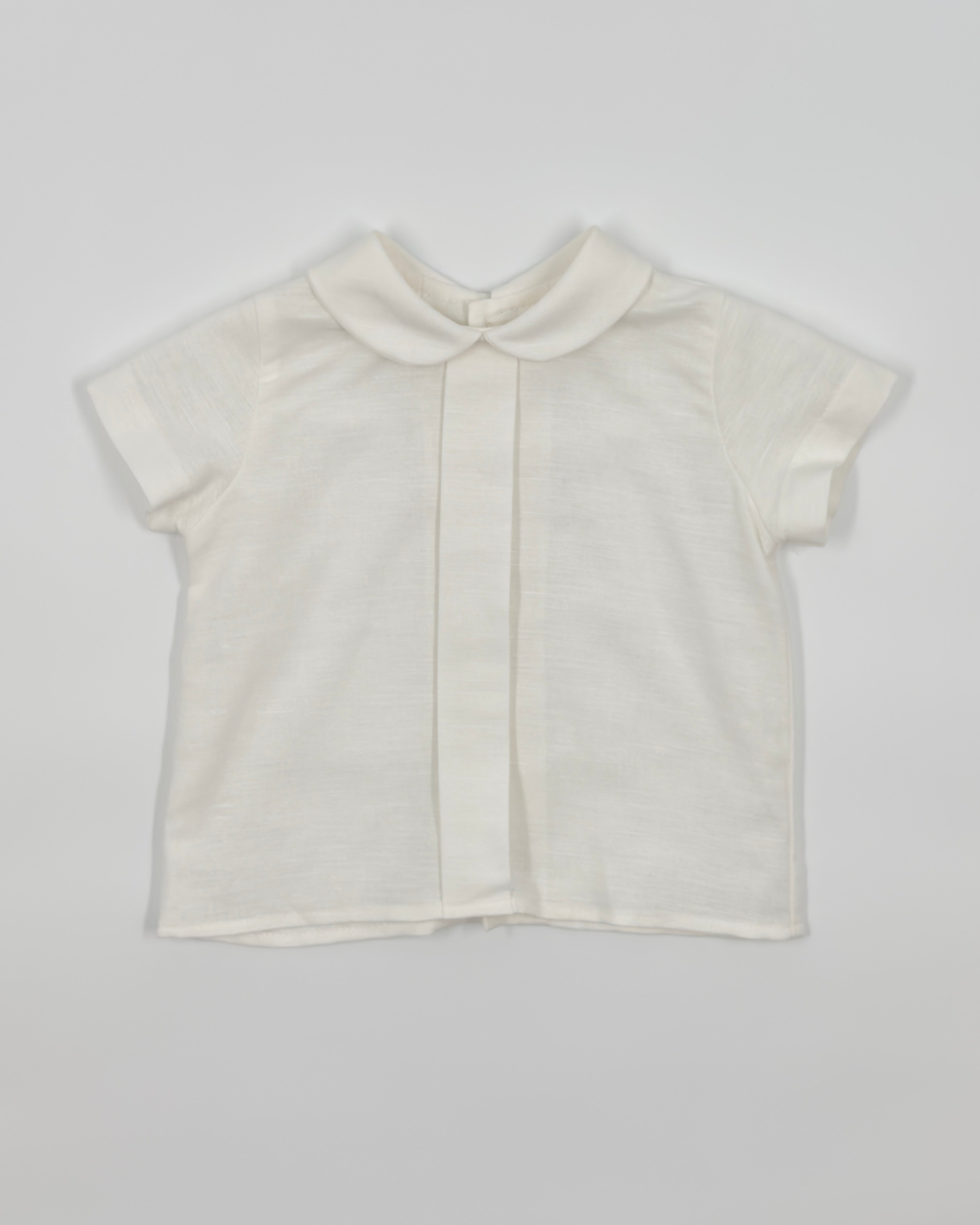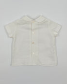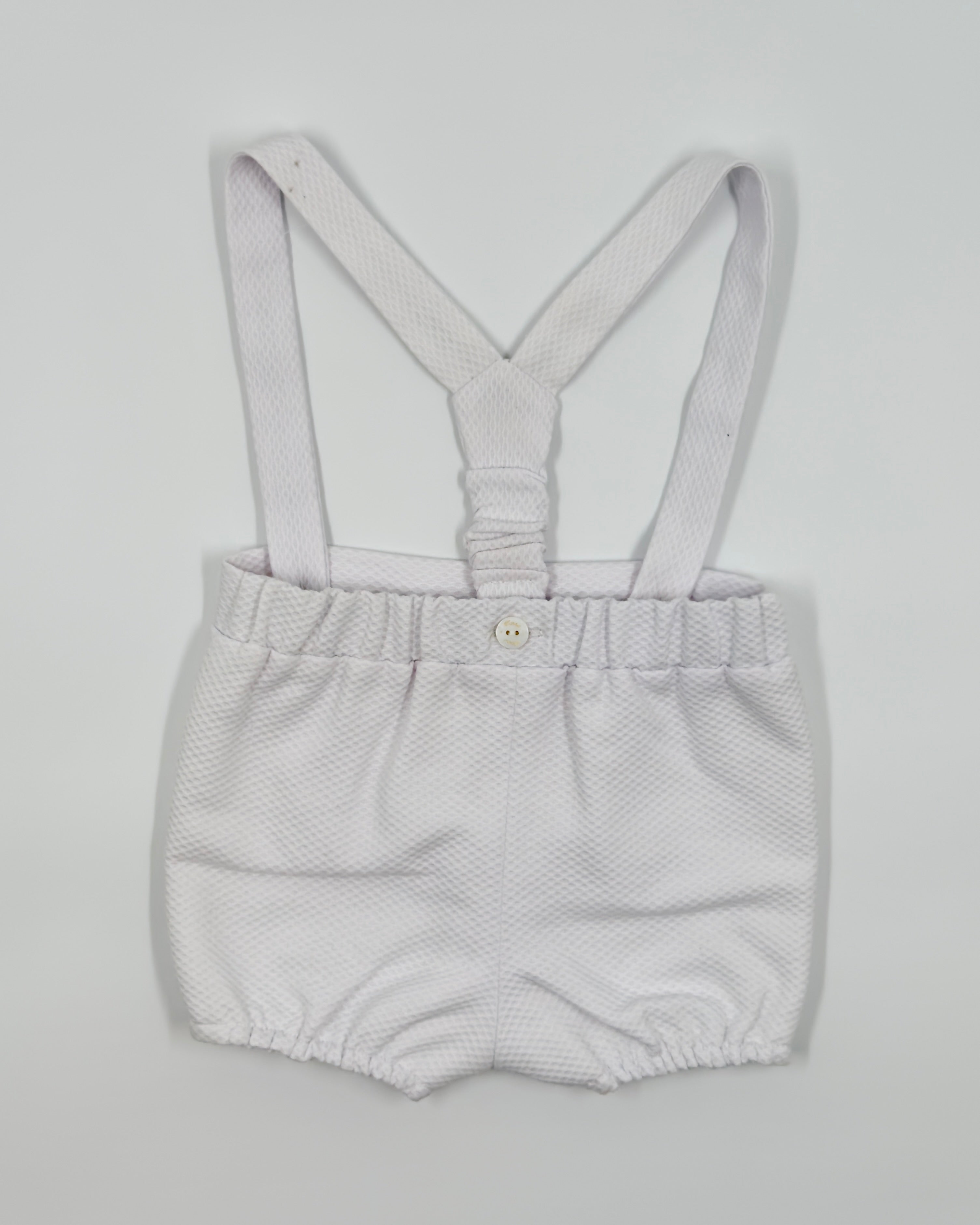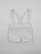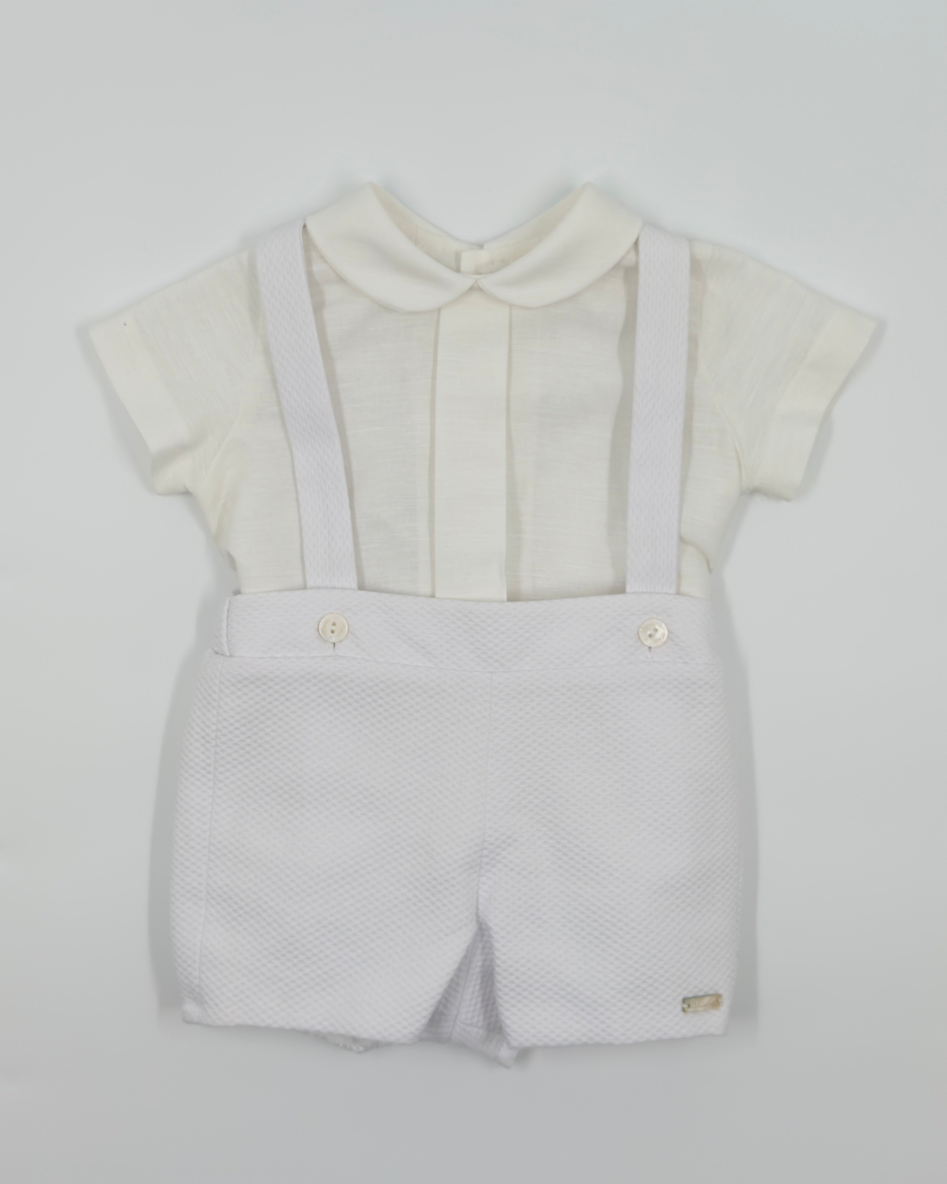 The Alan outfit is a classic two-piece set for baby boys, perfect for looking polished and staying comfortable during any special occasion. The shirt is made from soft white batiste and features a timeless Peter Pan collar with back button closure. Paired with white piqué shorts and attached suspenders, Alan is the ideal ensemble for christenings, birthdays, weddings, and elegant gatherings.