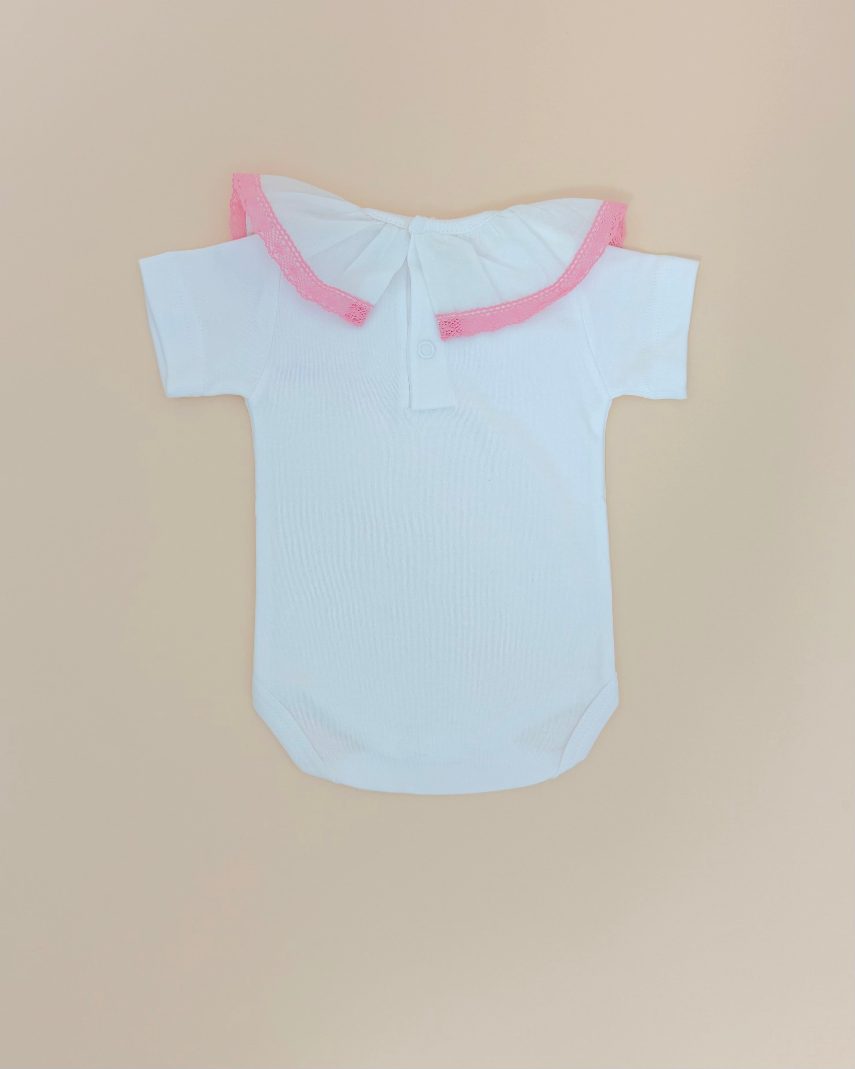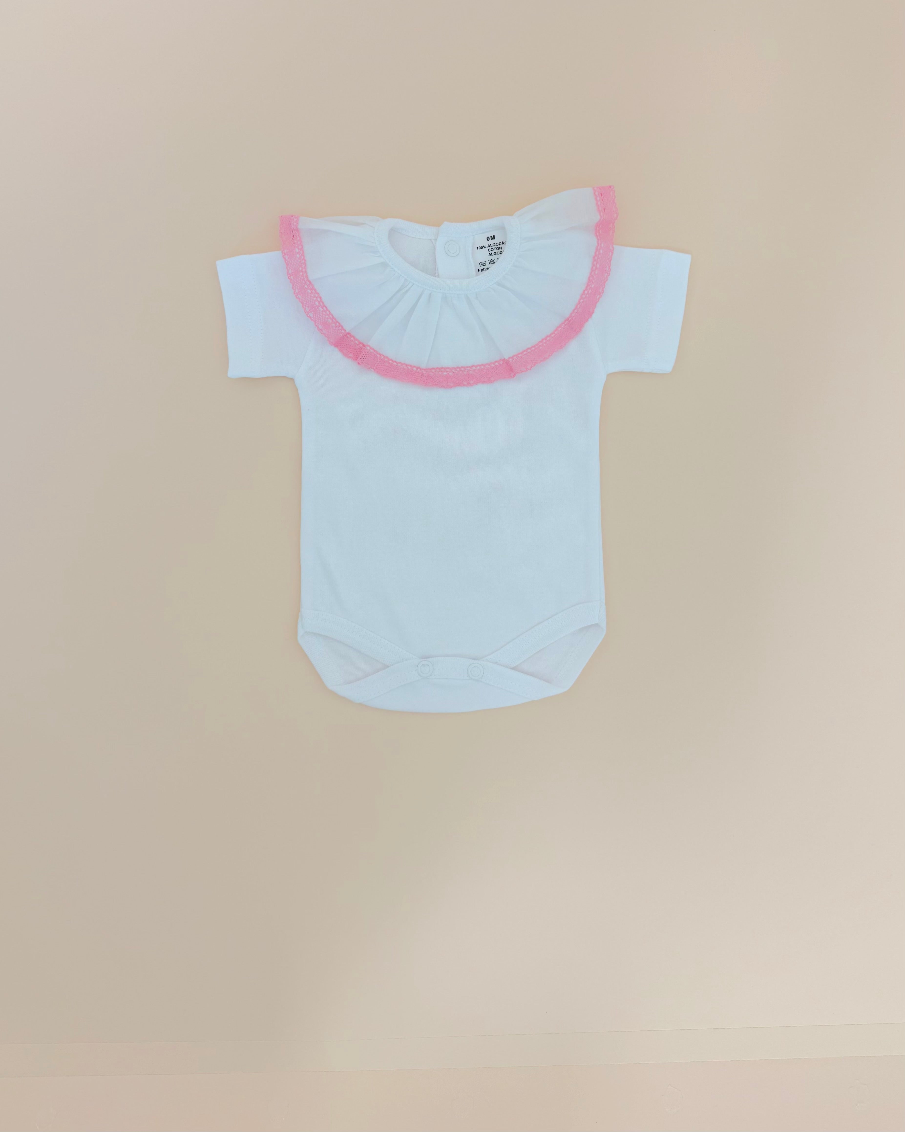 Sweet and sophisticated, this baby girl onesie features a delicate lace collar finished with a soft pink trim, paired with dainty cap sleeves for a charming touch. Made in Portugal from premium, breathable cotton, it’s designed to feel as gentle as a mother’s embrace on your baby’s skin.