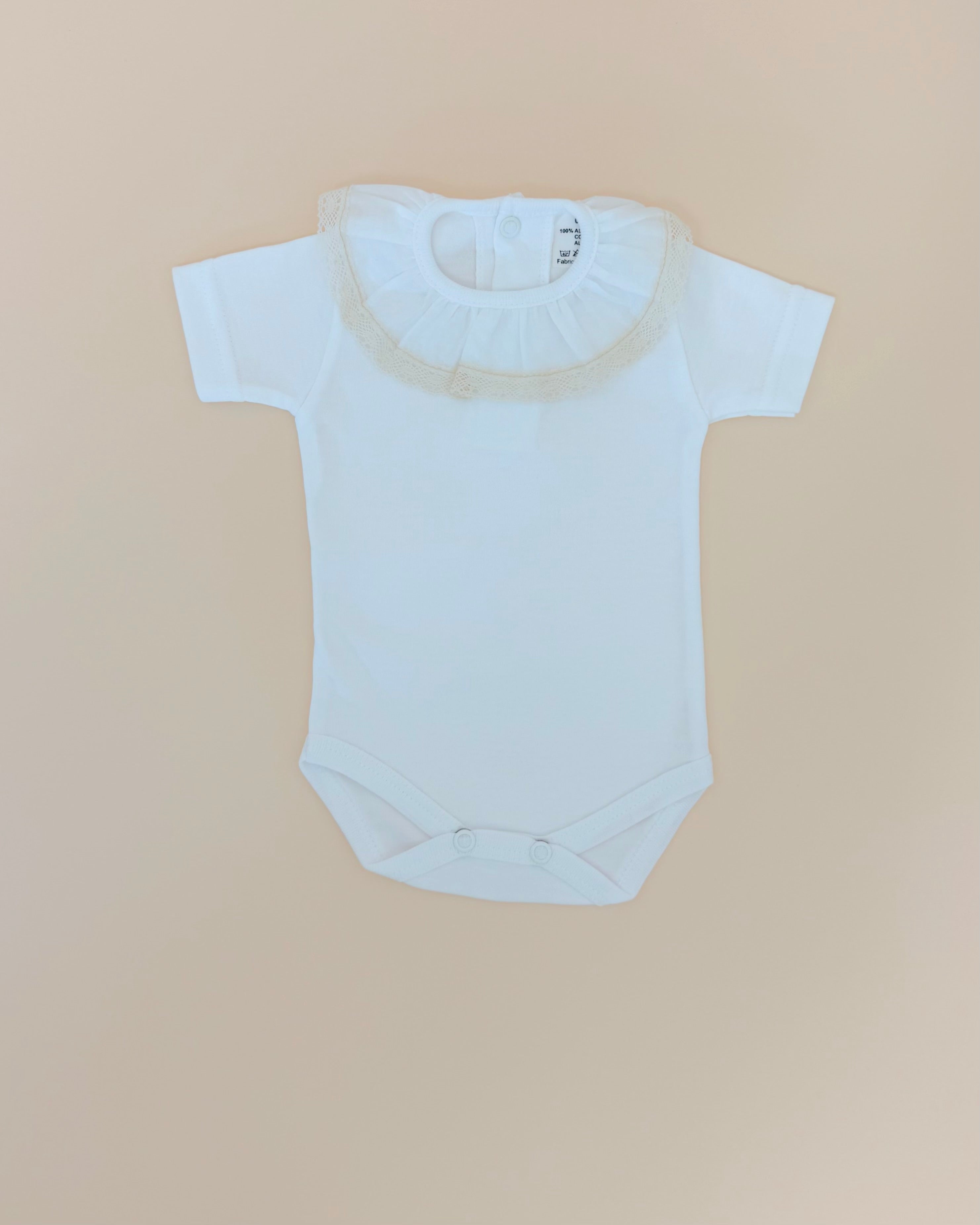 Sweet and sophisticated, this baby girl onesie features a delicate lace collar finished with a soft off-white trim, paired with dainty cap sleeves for a charming touch. Made in Portugal from premium, breathable cotton, it’s designed to feel as gentle as a mother’s embrace on your baby’s skin.