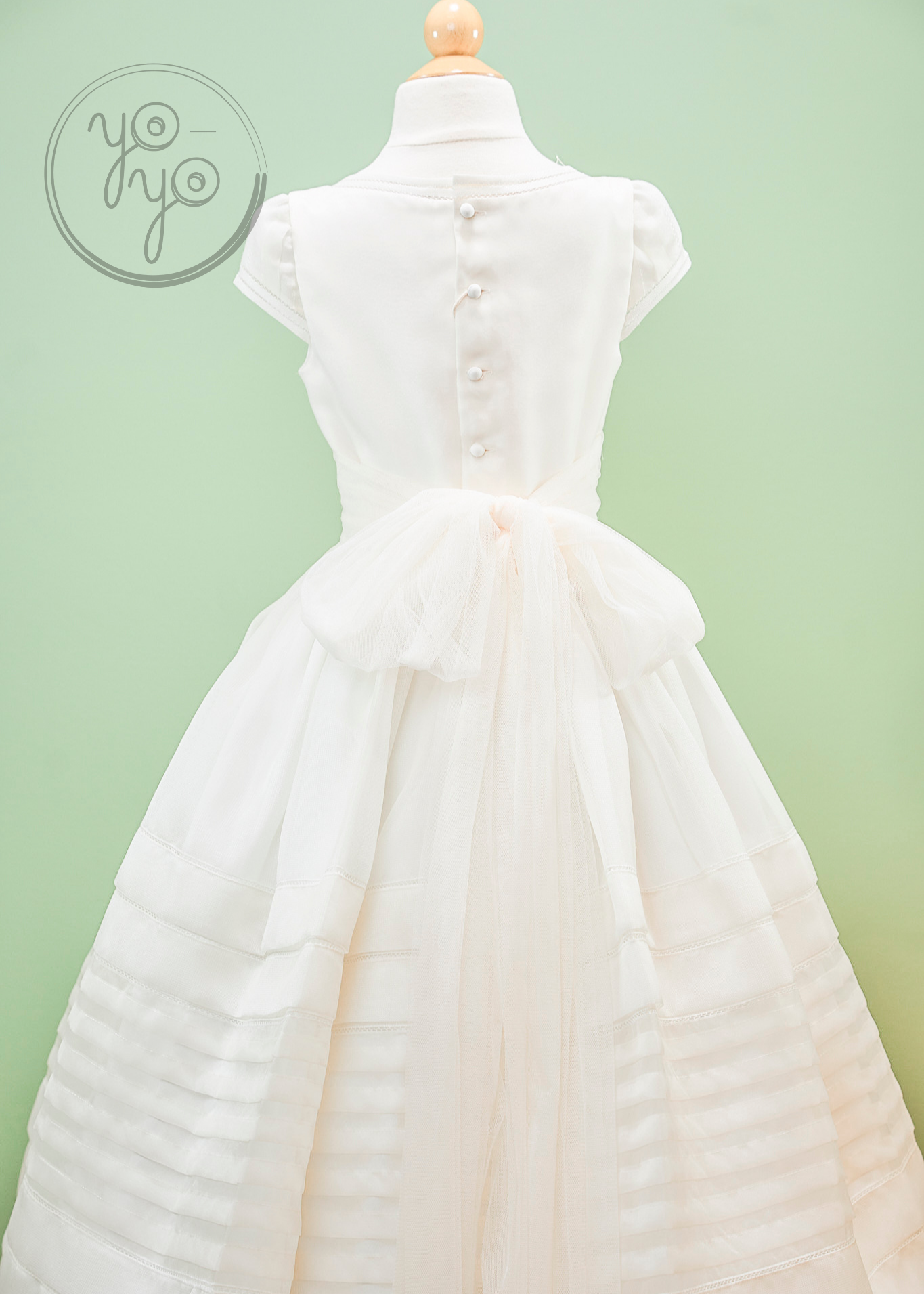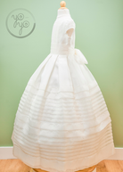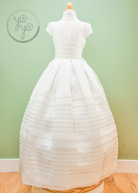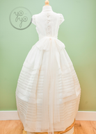 The Amaranto First Communion Dress is a distinctive design that blends texture, tradition, and elegance. Crafted in soft off-white organza and rustic gauze, this gown features beautifully structured pleats throughout for a refined silhouette.