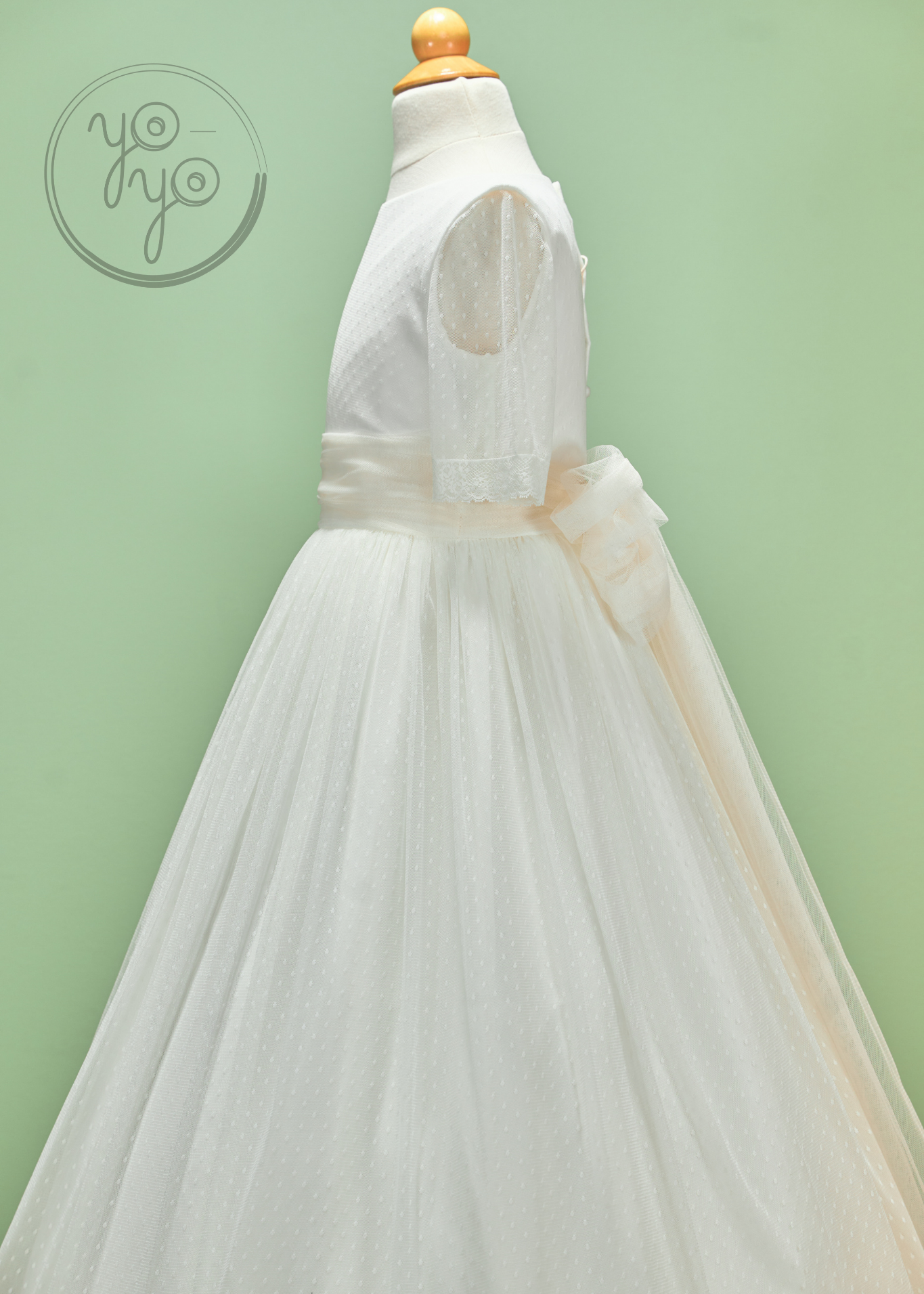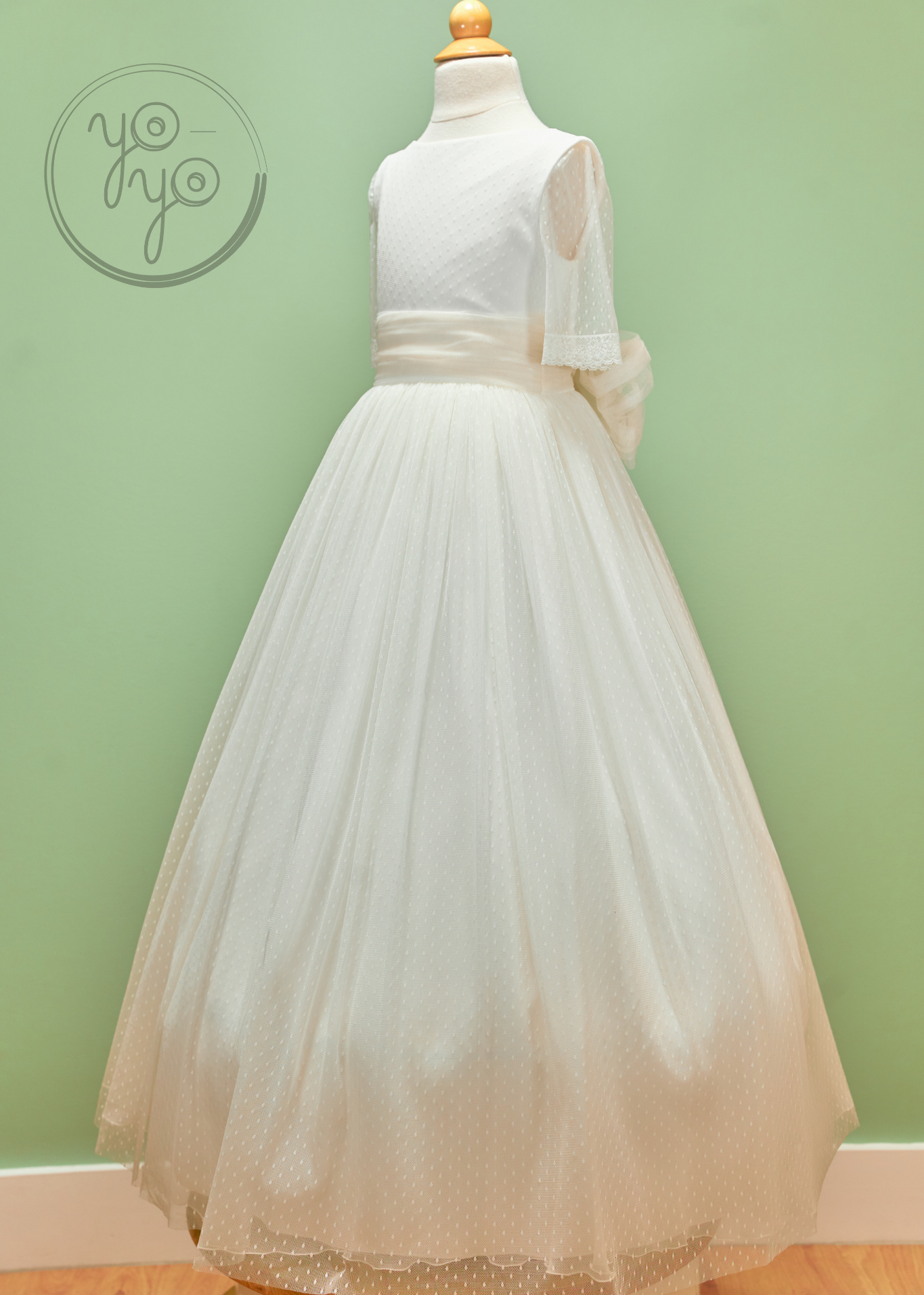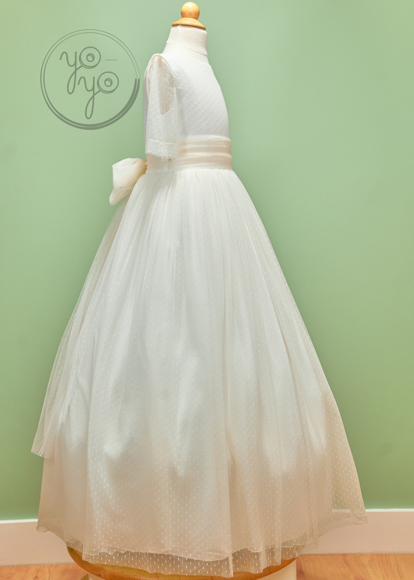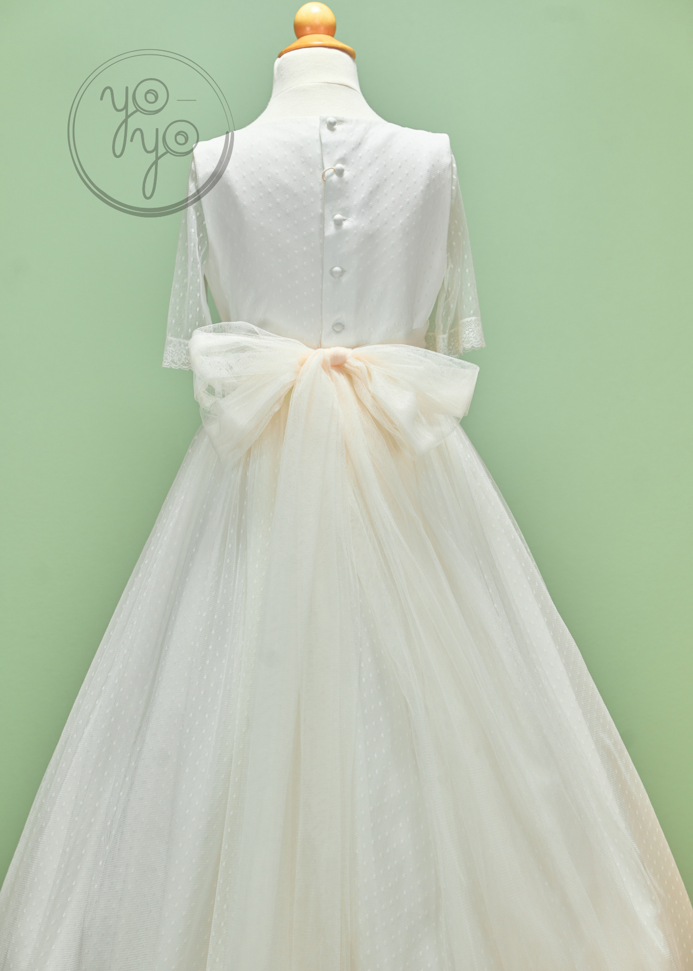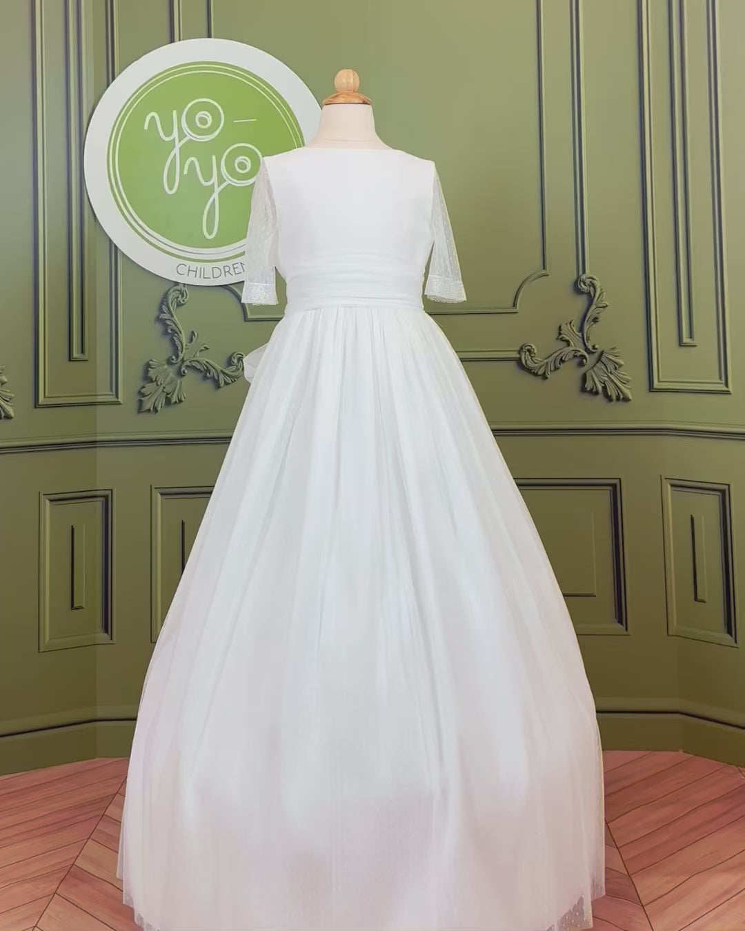The Amarilis Communion Dress is a traditional yet dainty design, crafted in lightweight off-white French tulle for an airy, elegant finish. The gown embodies simplicity, grace, and timeless beauty—perfect for her special day.