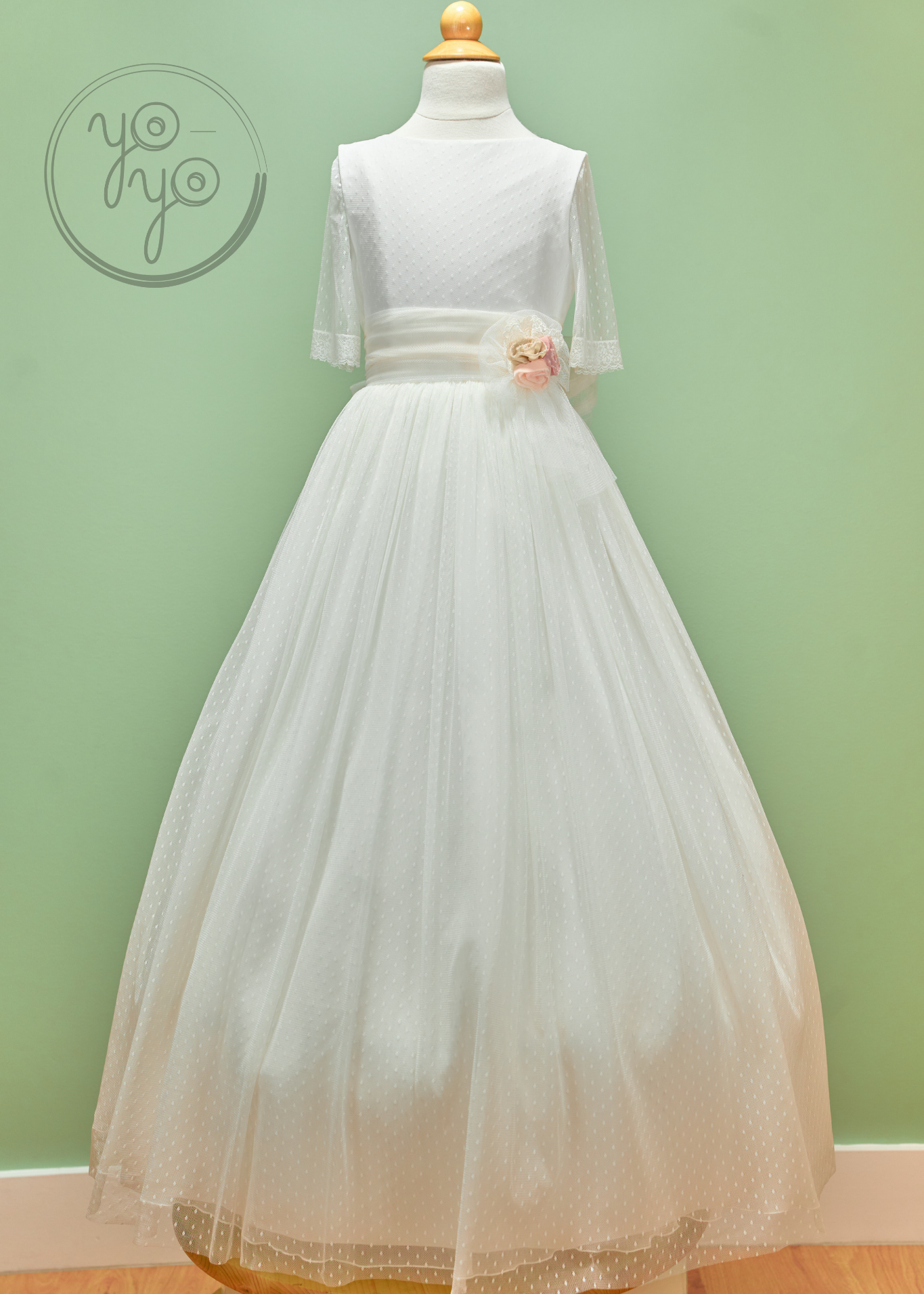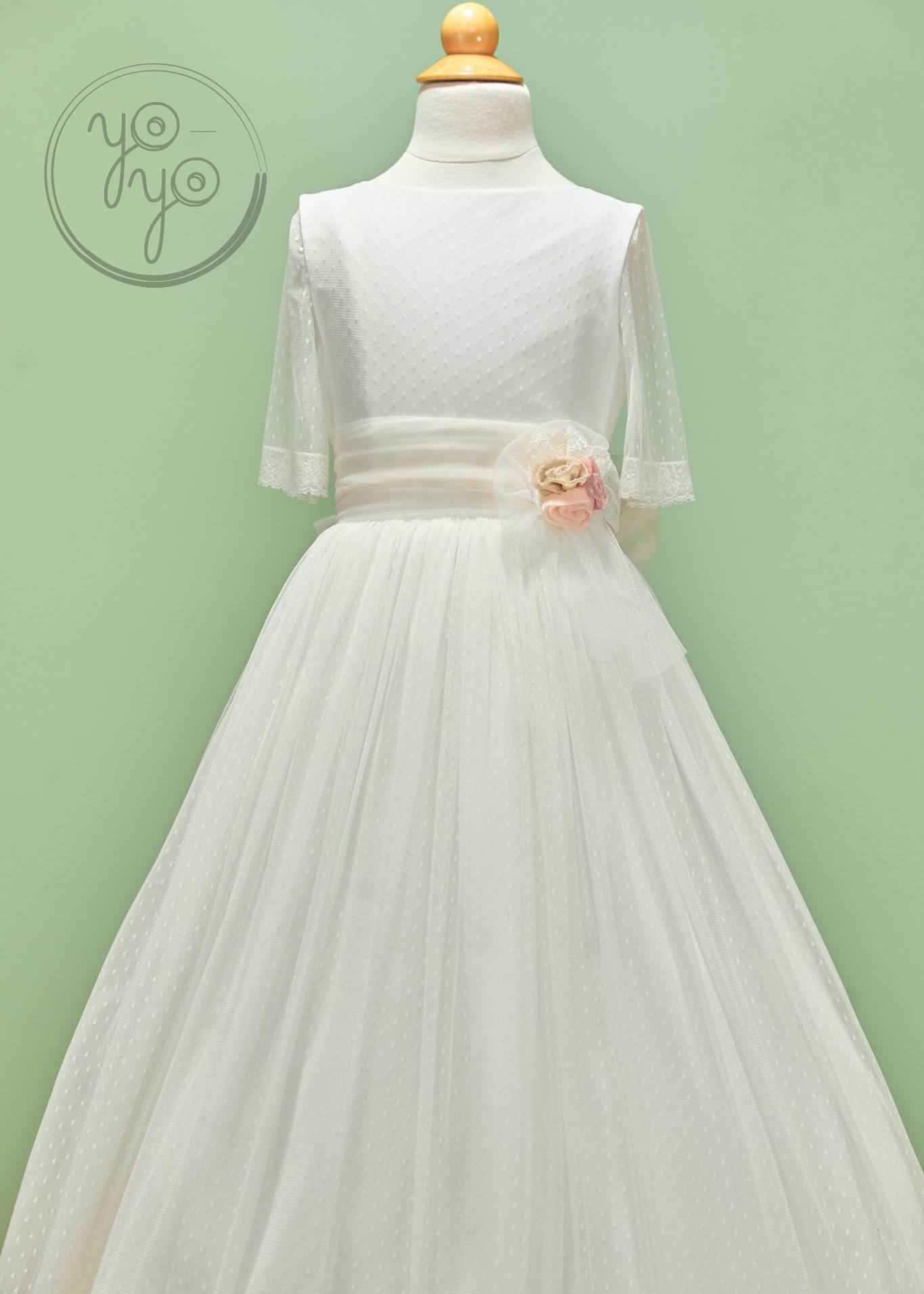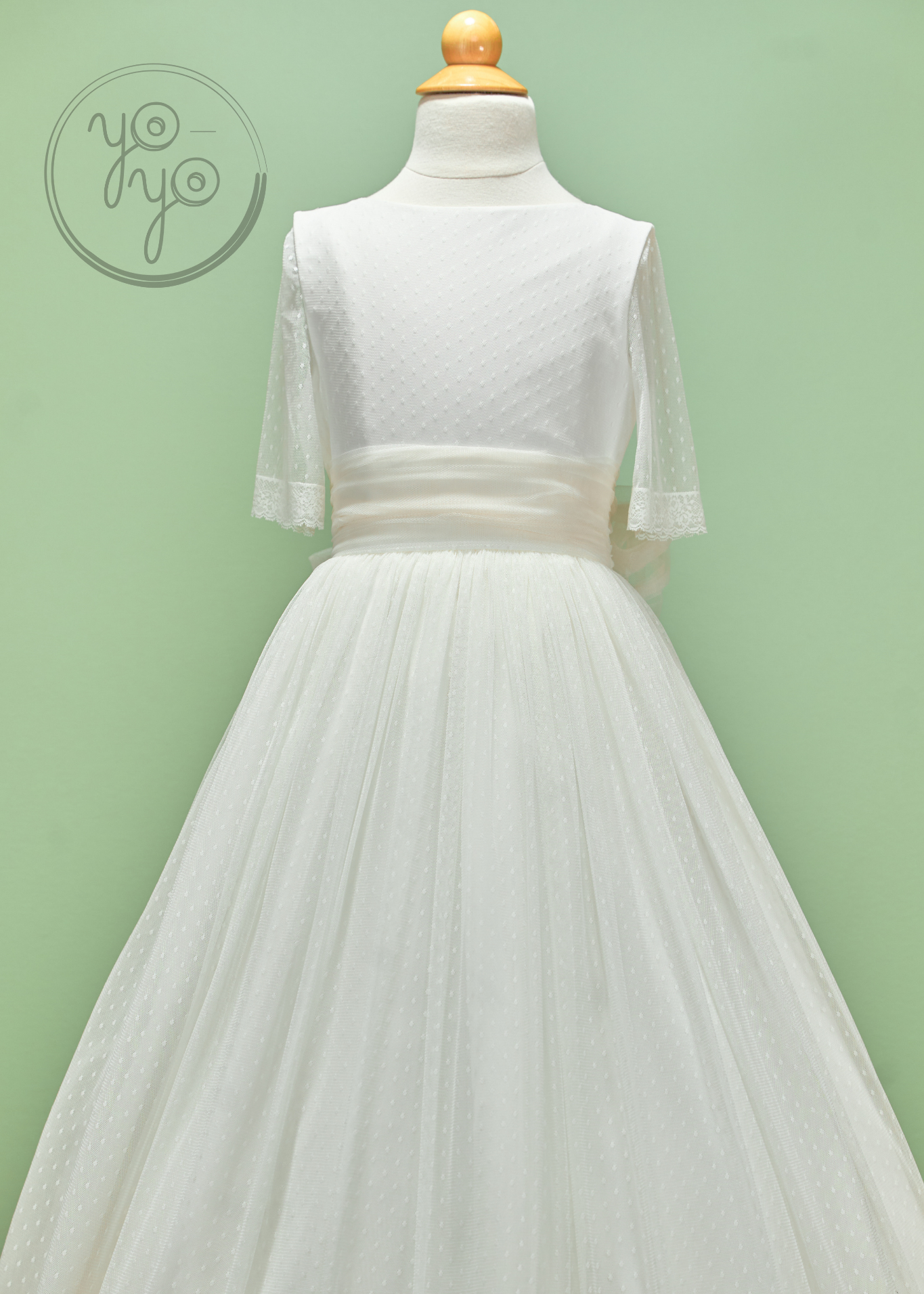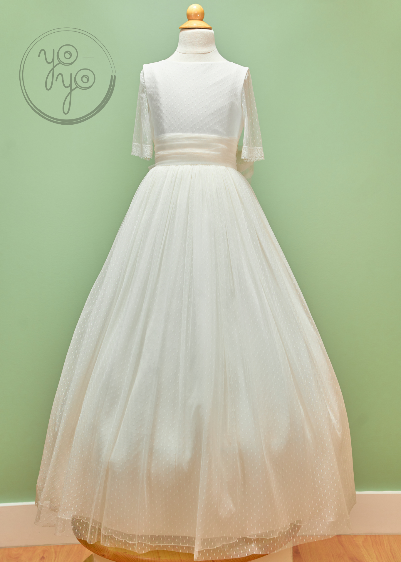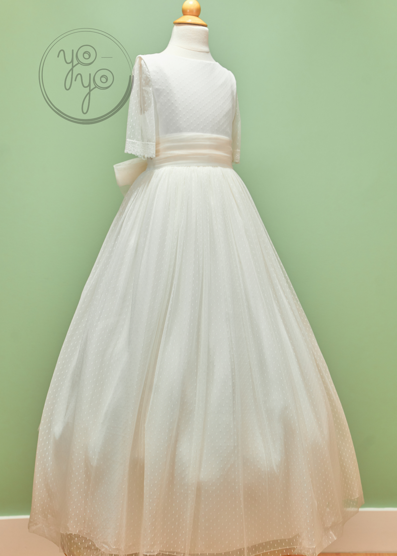 The Amarilis Communion Dress is a traditional yet dainty design, crafted in lightweight off-white French tulle for an airy, elegant finish. The gown embodies simplicity, grace, and timeless beauty—perfect for her special day.