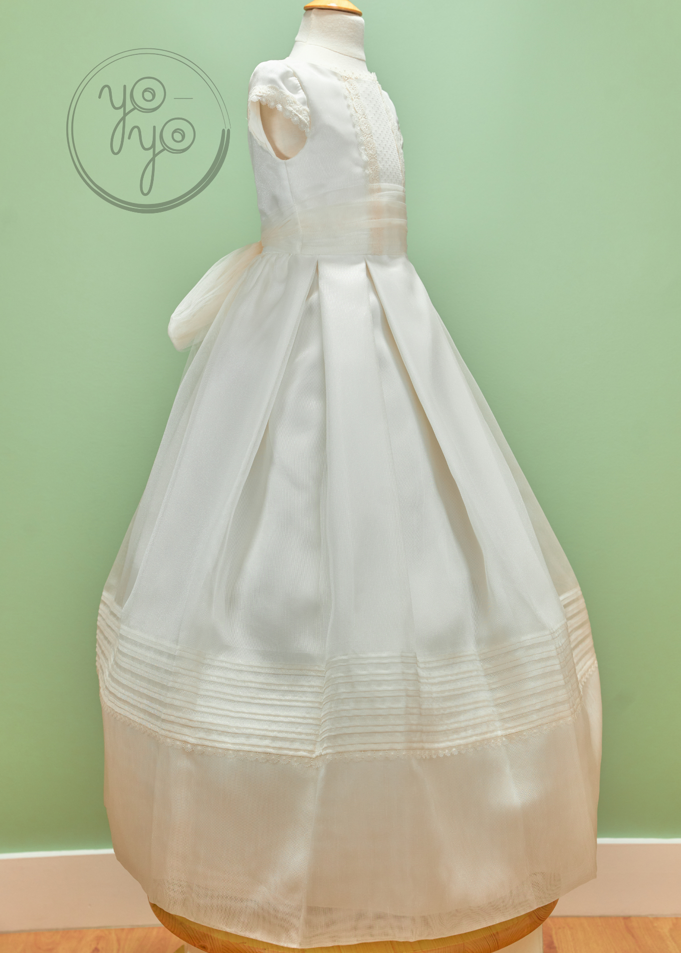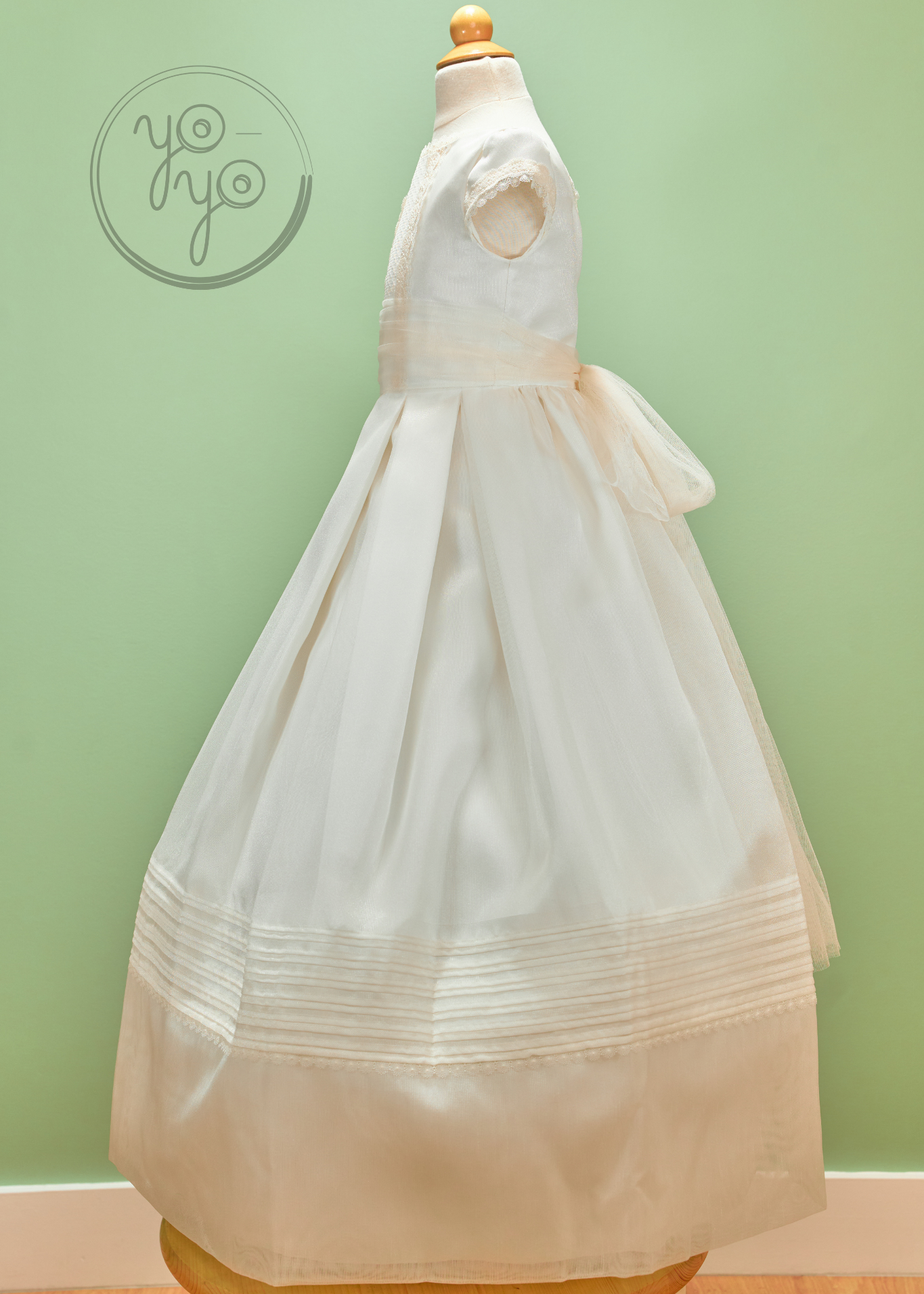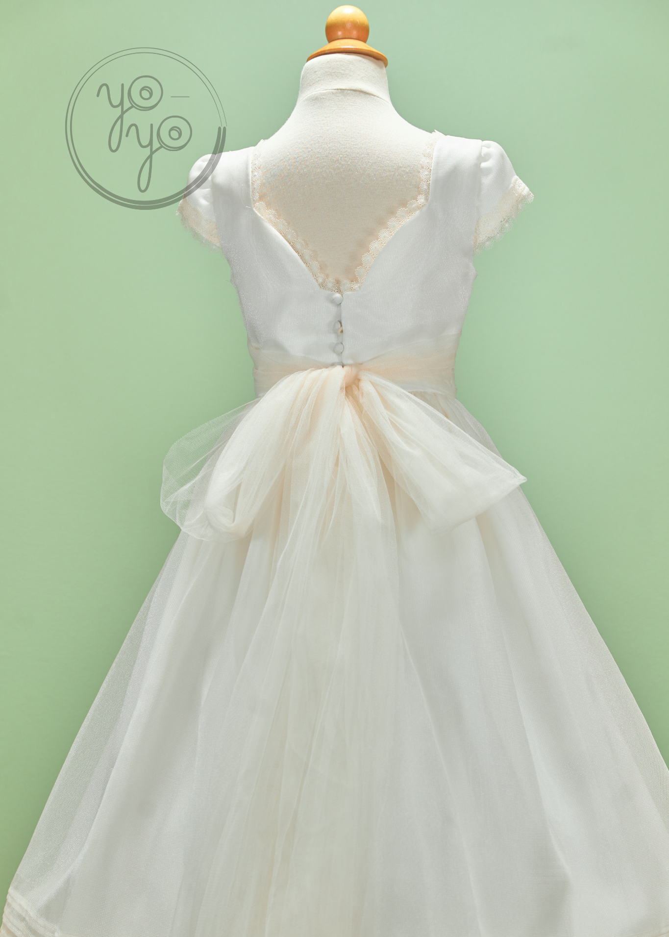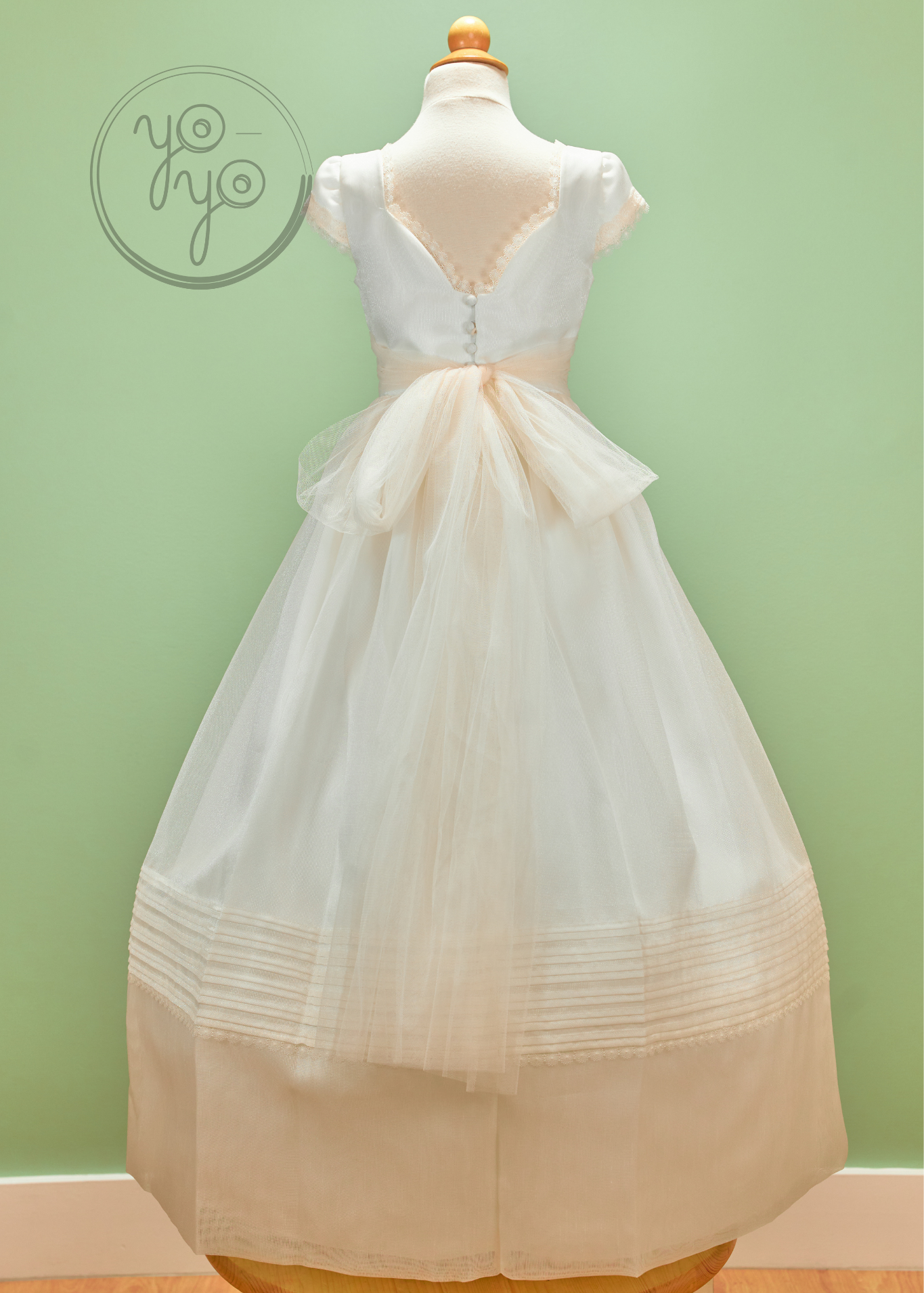 The Begonia First Communion Dress is an exquisite gown that blends simplicity with unforgettable detail. Crafted in soft off-white rustic gauze, it has an airy, natural elegance that feels both traditional and modern.