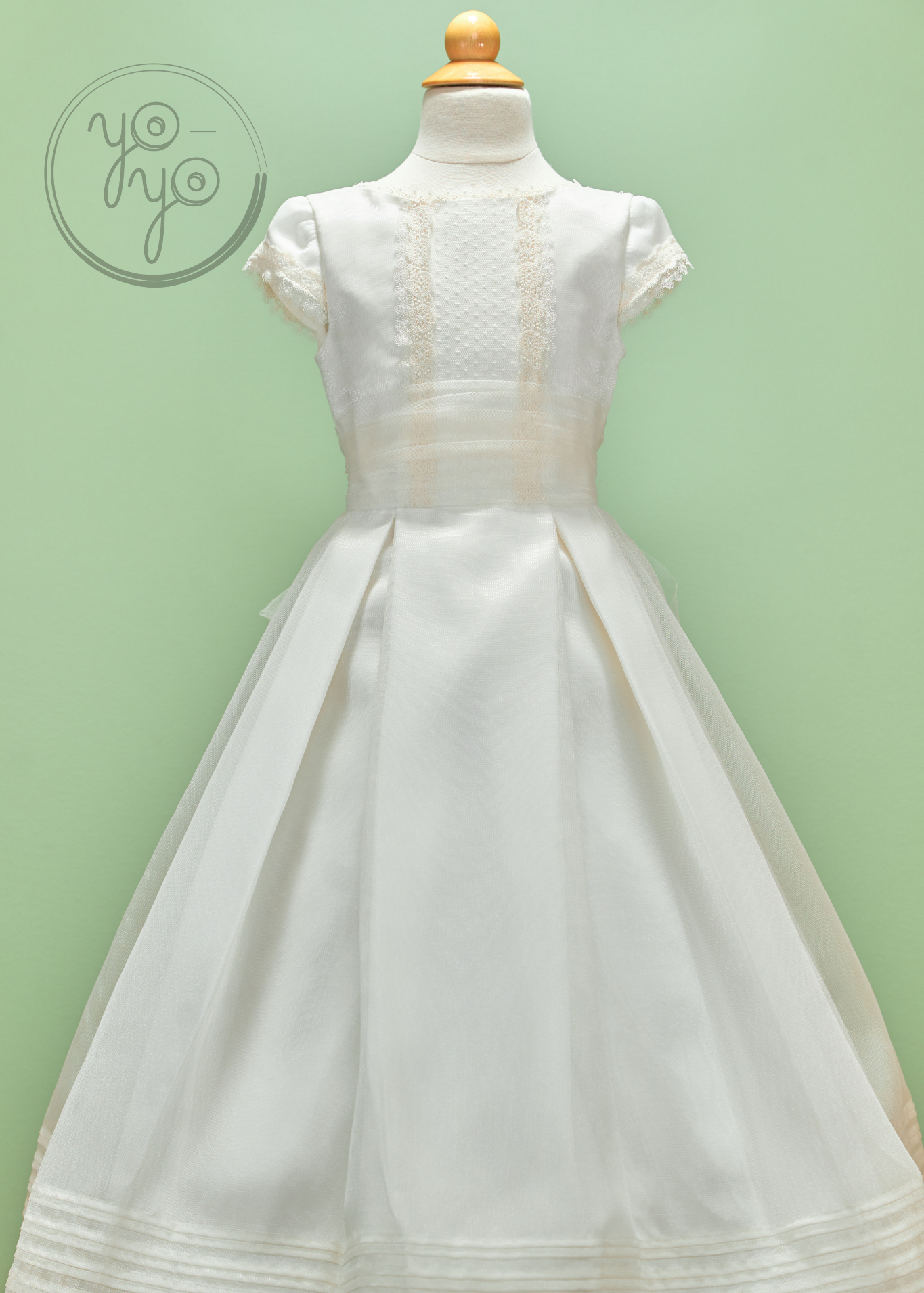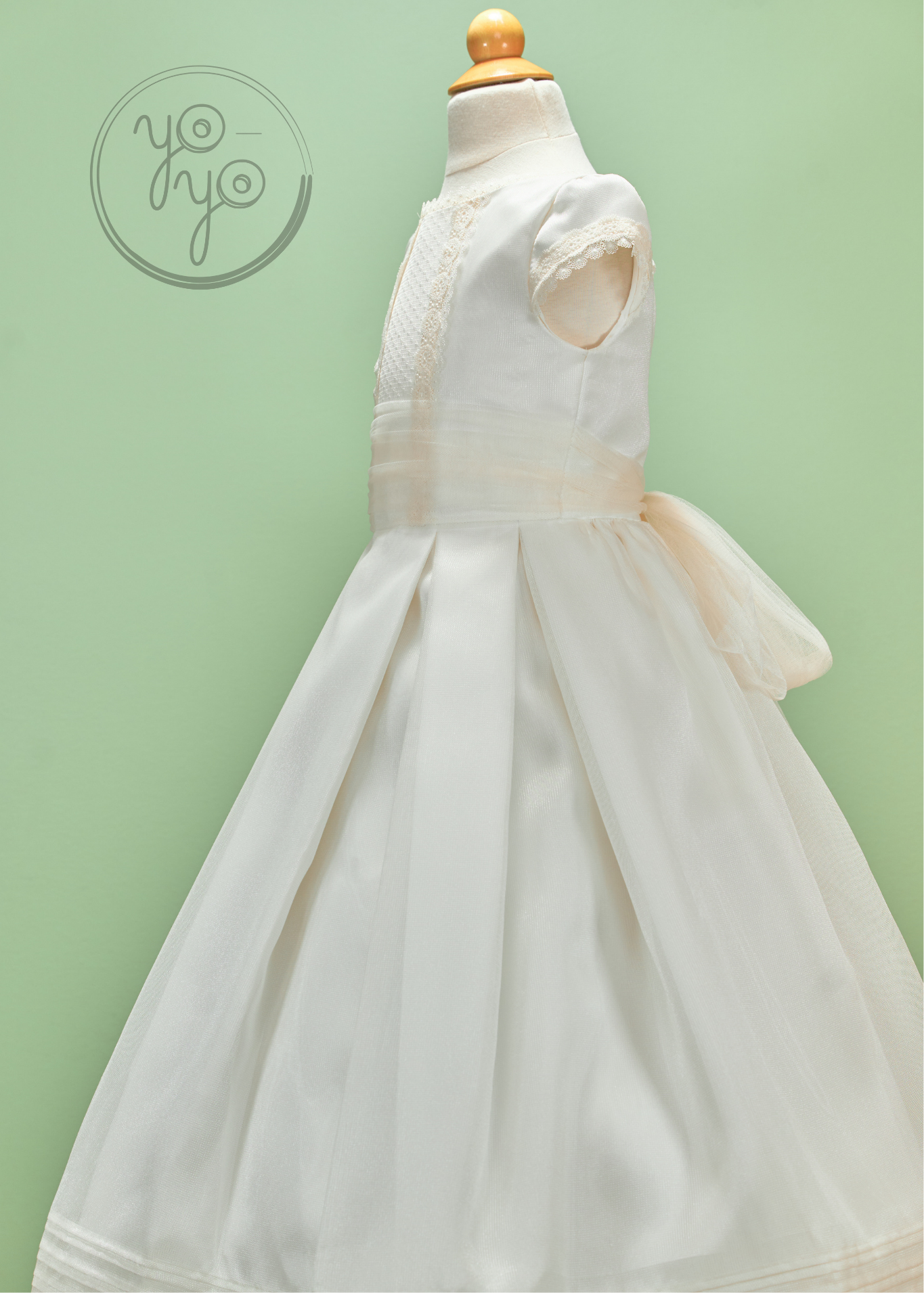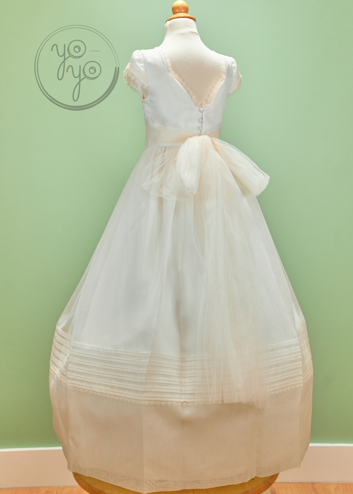 The Begonia First Communion Dress is an exquisite gown that blends simplicity with unforgettable detail. Crafted in soft off-white rustic gauze, it has an airy, natural elegance that feels both traditional and modern.