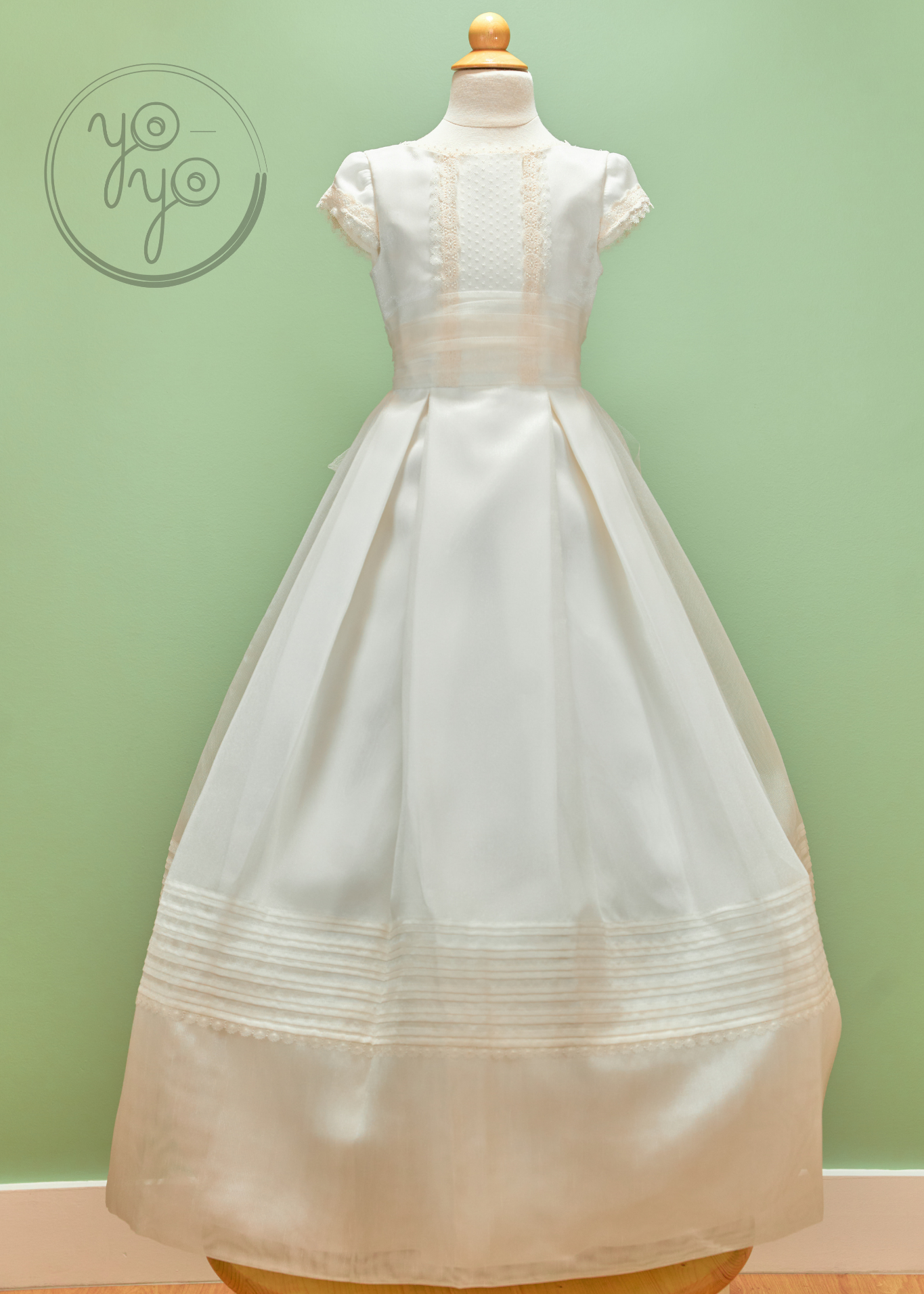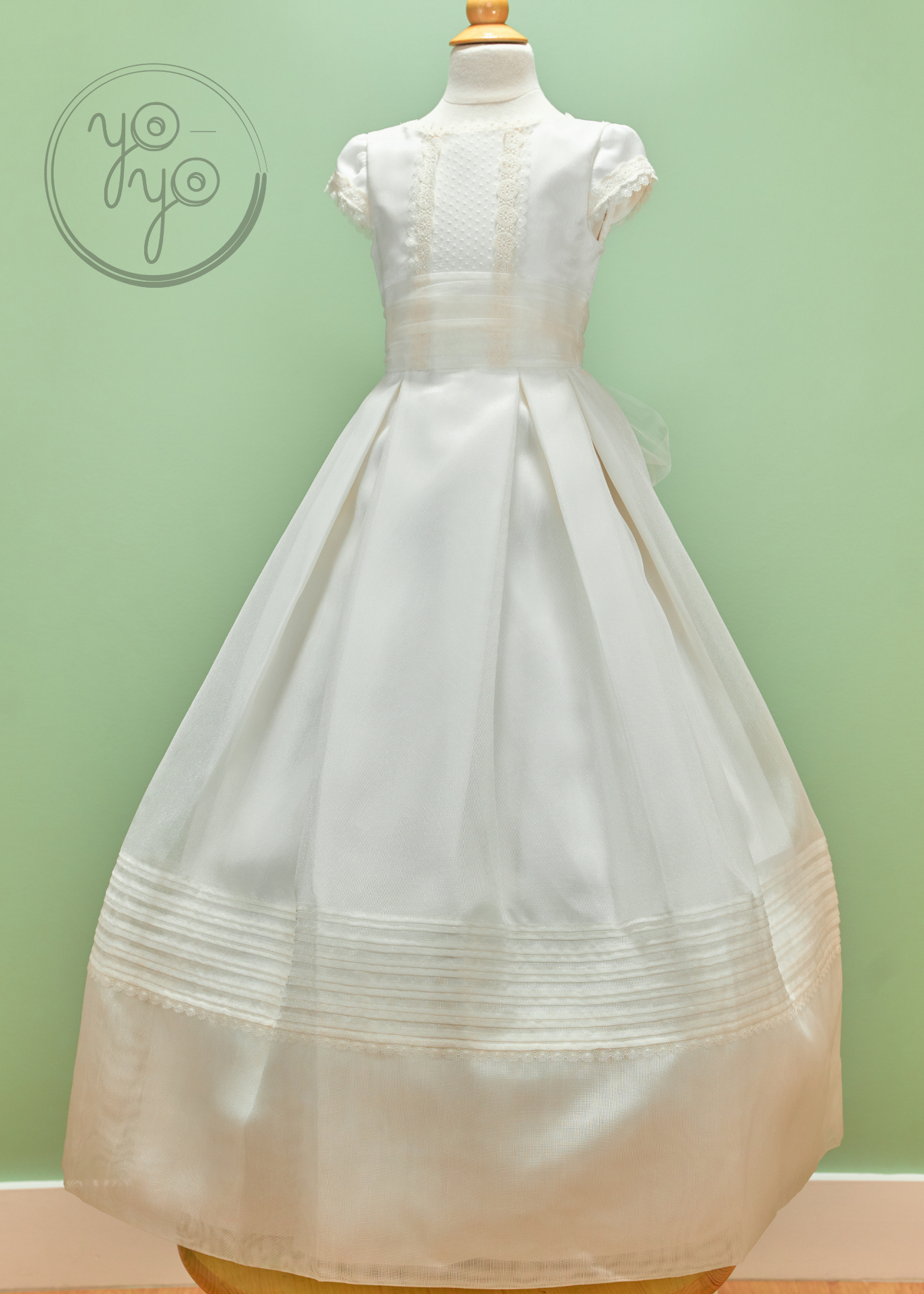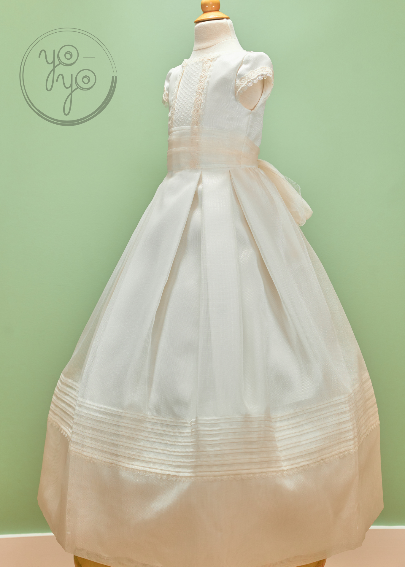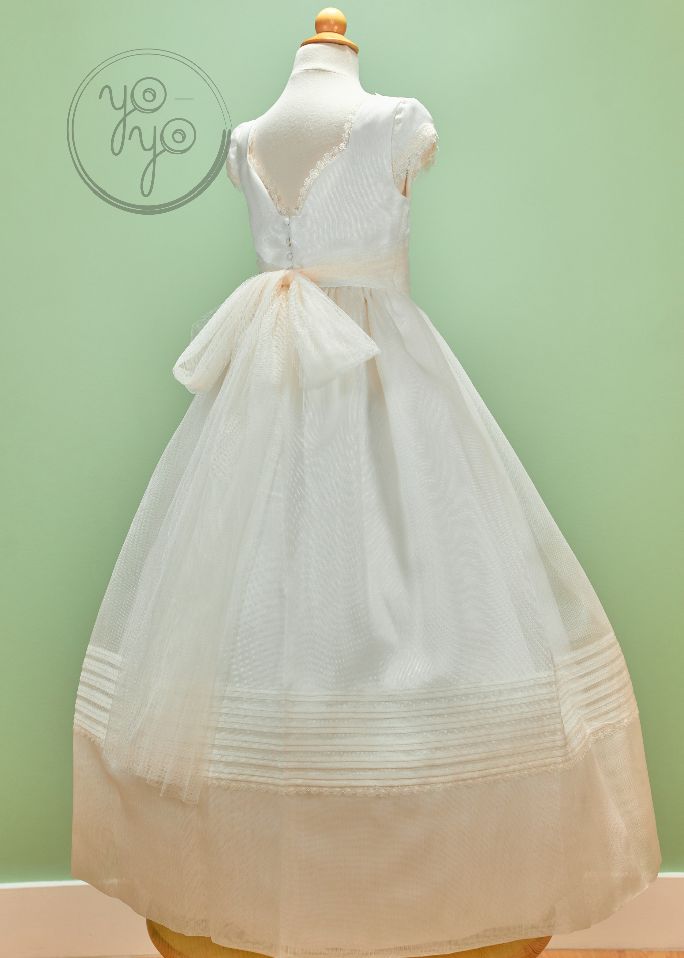 The Begonia First Communion Dress is an exquisite gown that blends simplicity with unforgettable detail. Crafted in soft off-white rustic gauze, it has an airy, natural elegance that feels both traditional and modern.