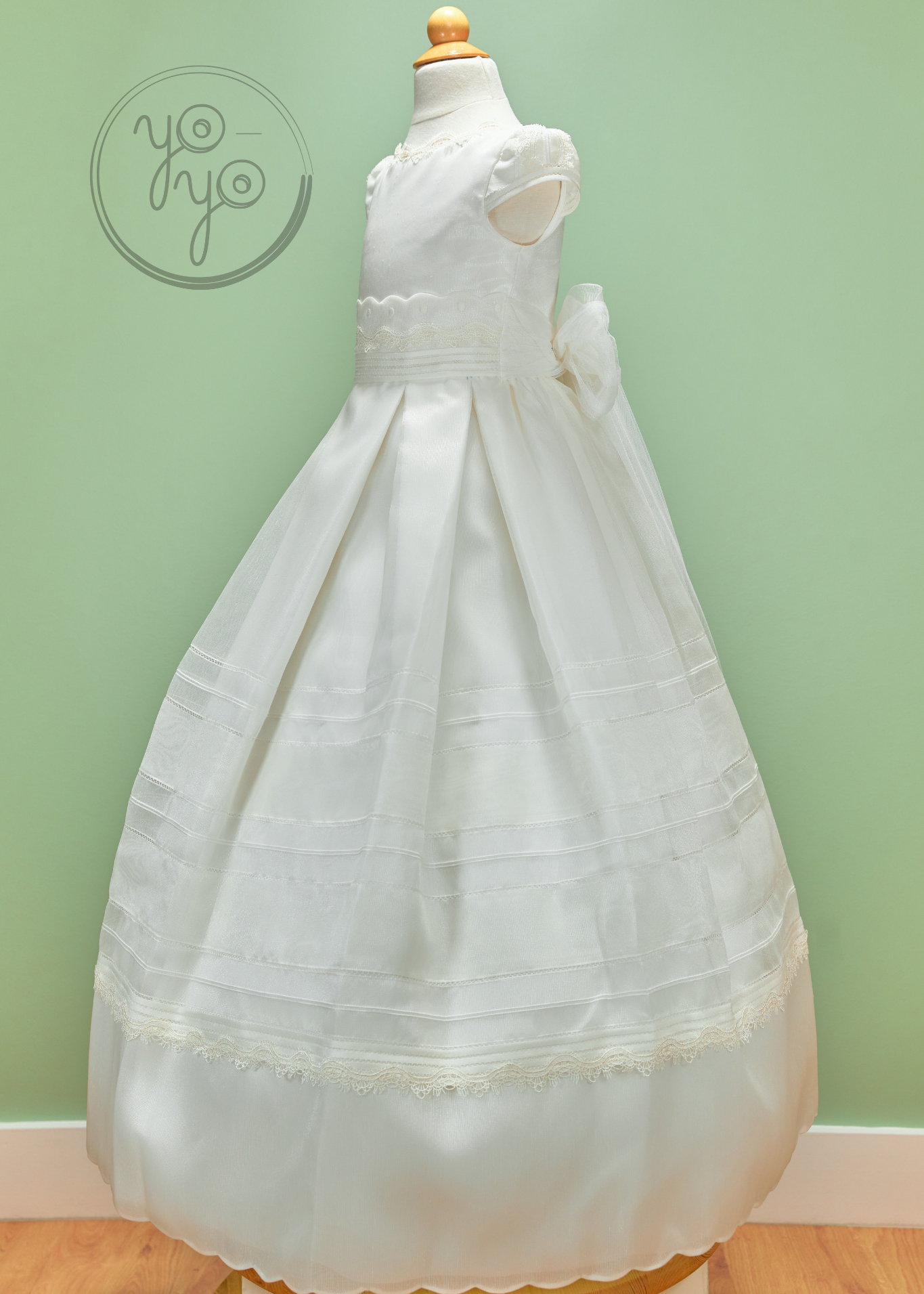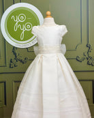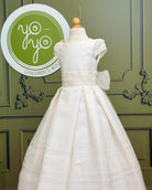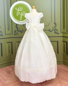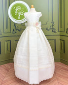 A removable floral appliqué at the waist offers styling versatility, and the back ties with thick gauze sashes into a full bow for a picture-perfect finish. Brisas is a graceful choice for families seeking a gown that balances simplicity with timeless elegance.