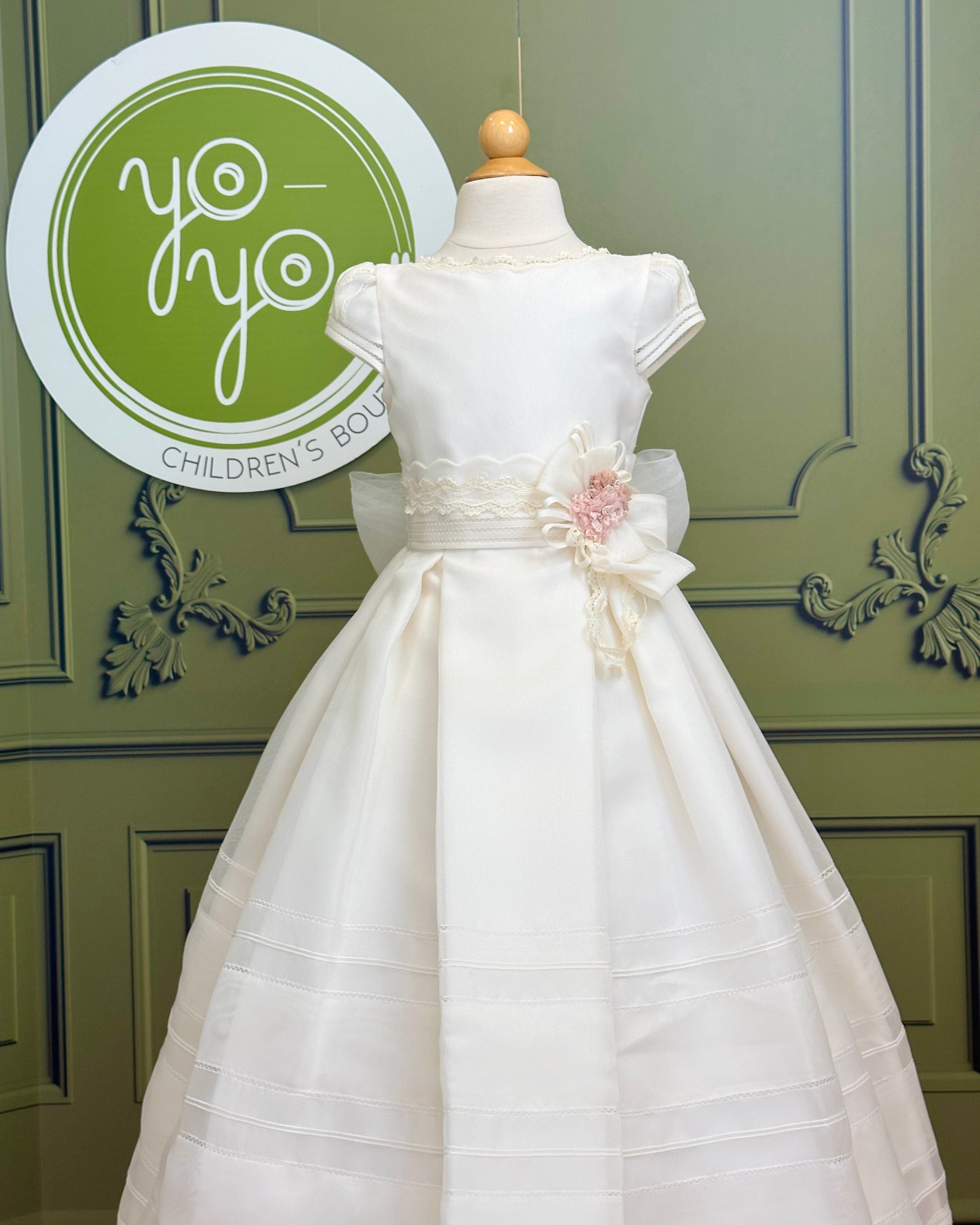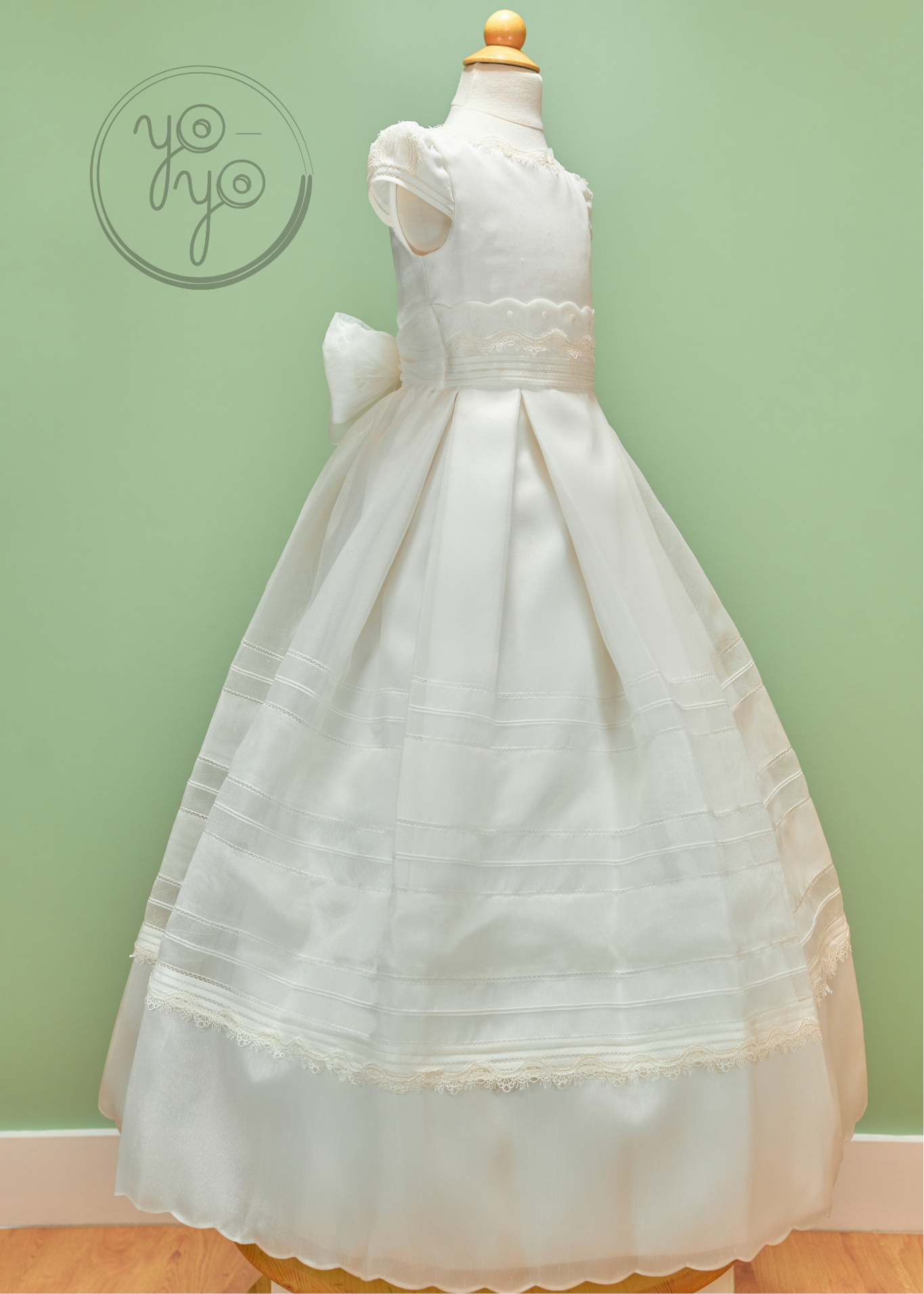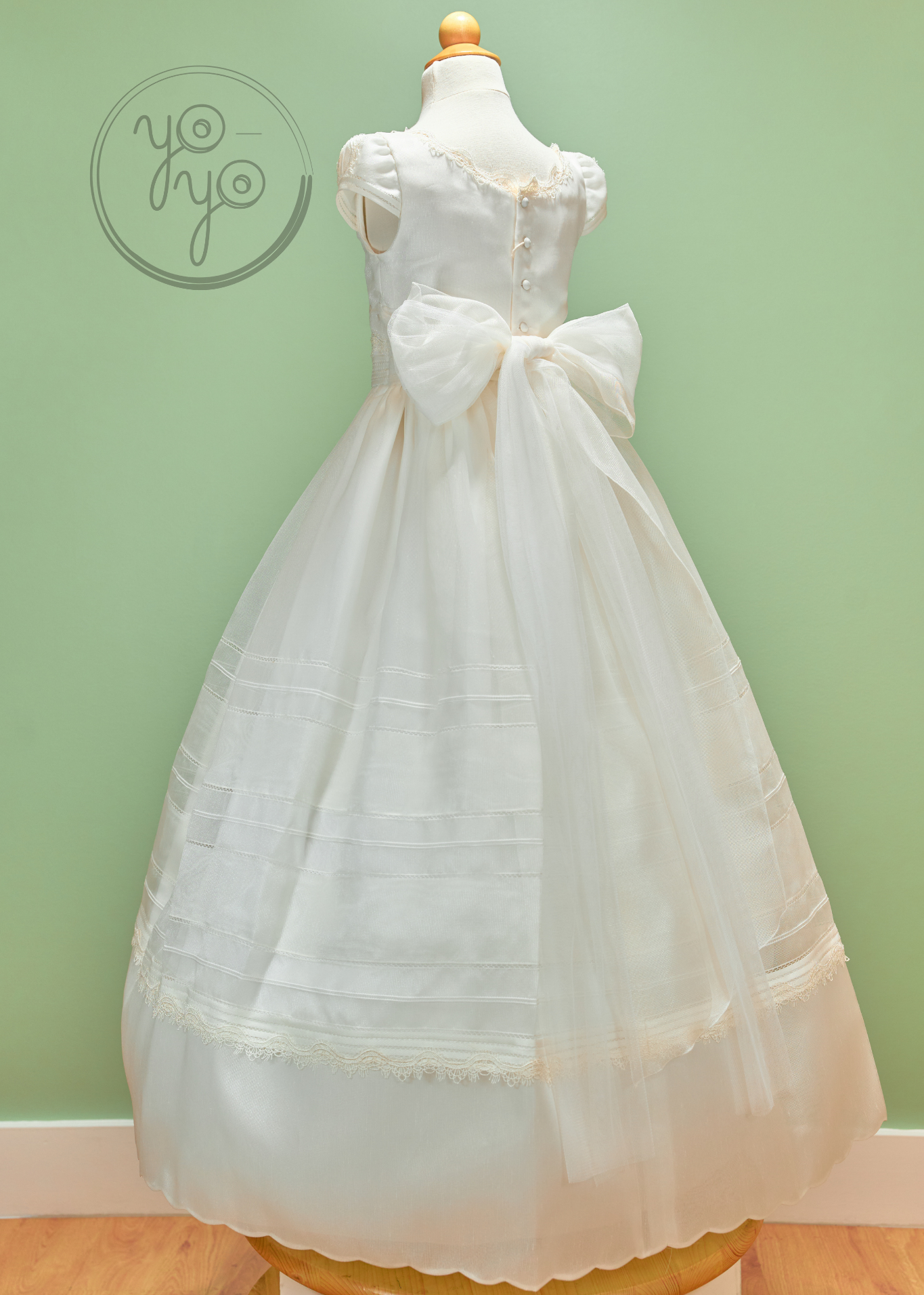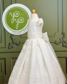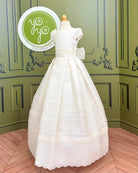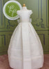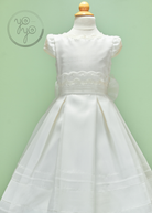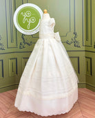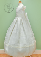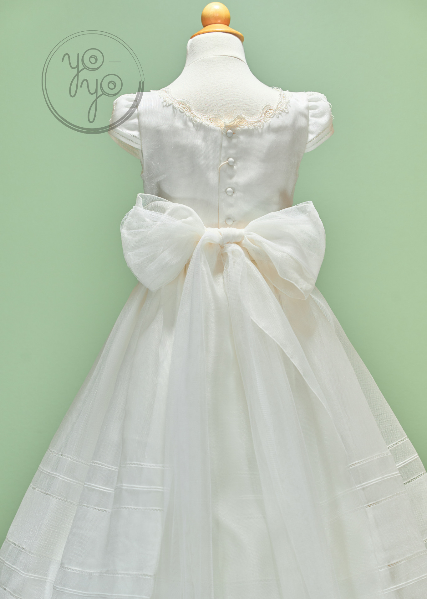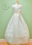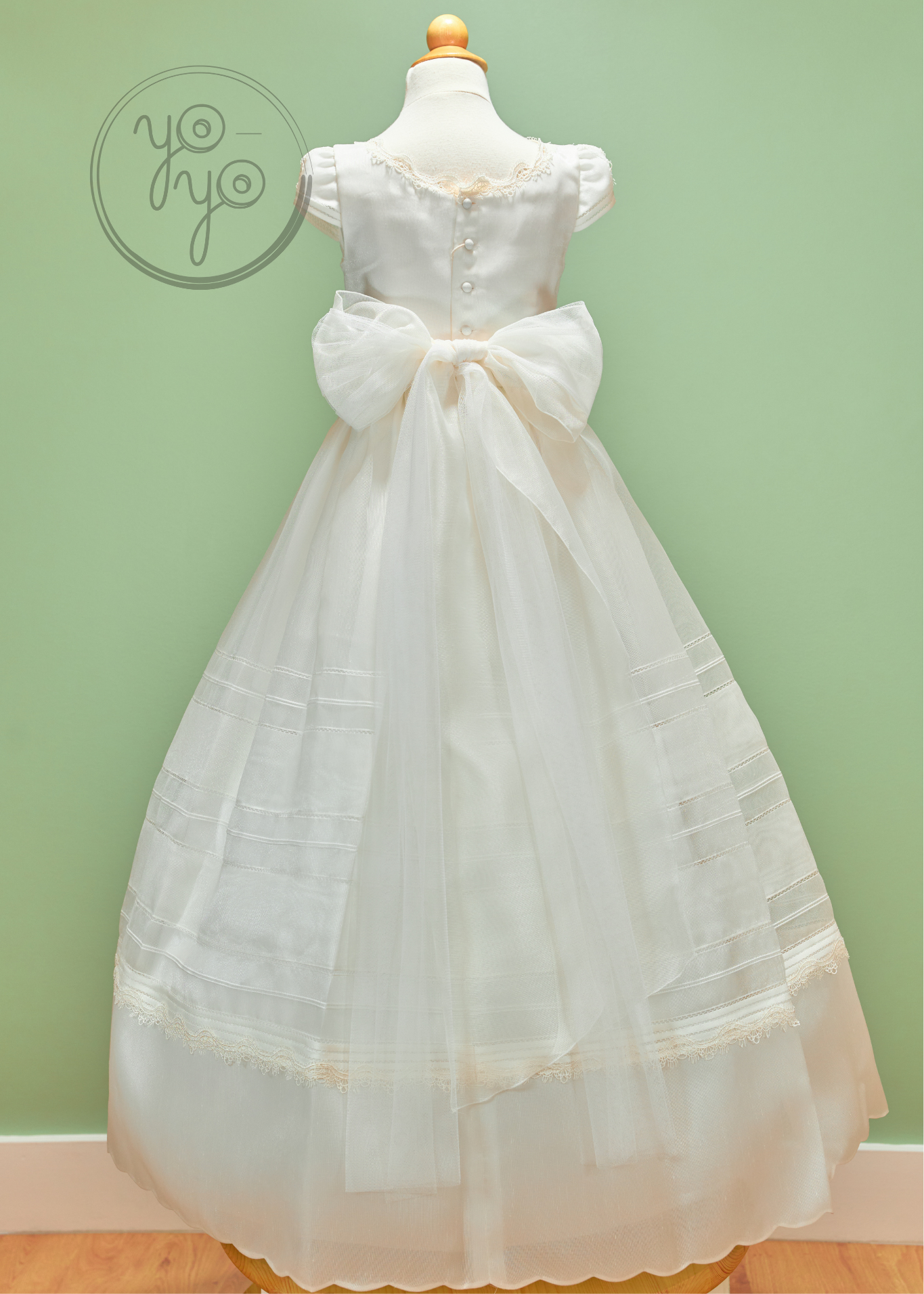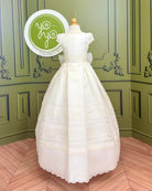 The Brisas First Communion Dress is a sophisticated and elegant gown designed to make her special day unforgettable. Made in soft off-white rustic gauze, it combines natural texture with artisanal craftsmanship.