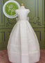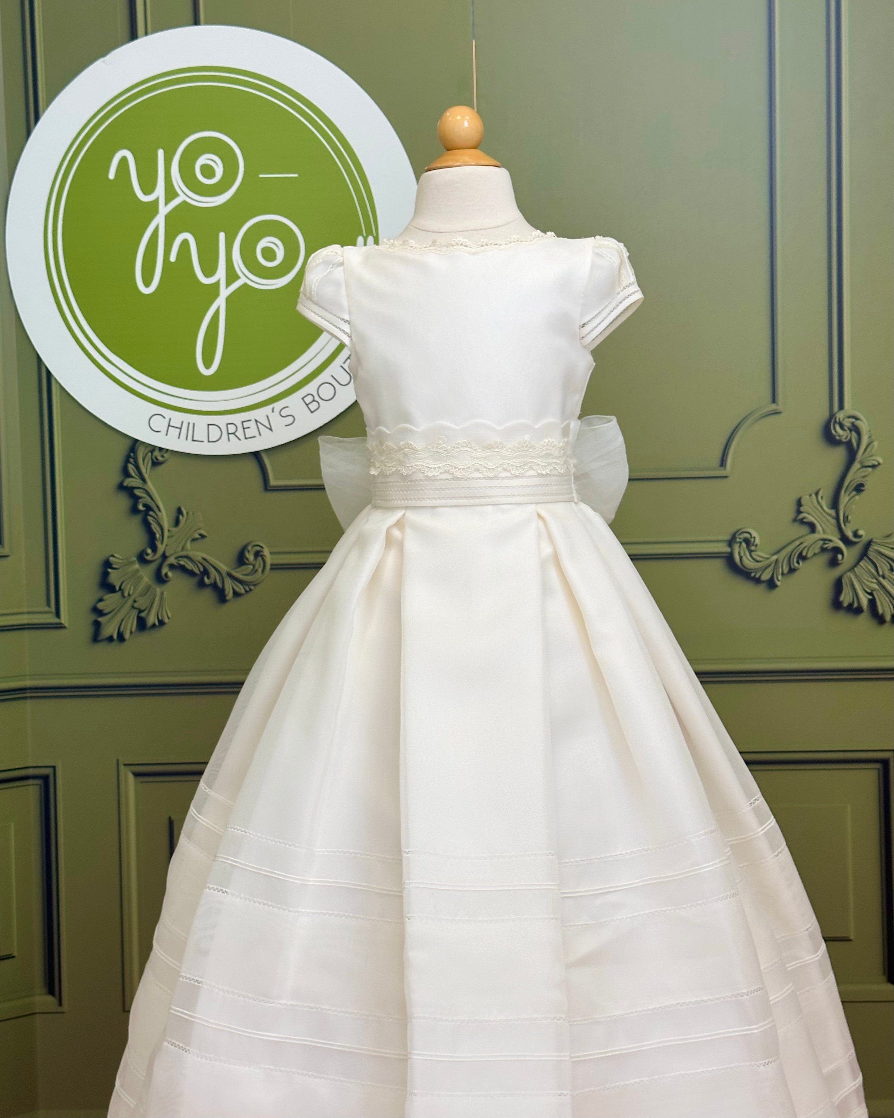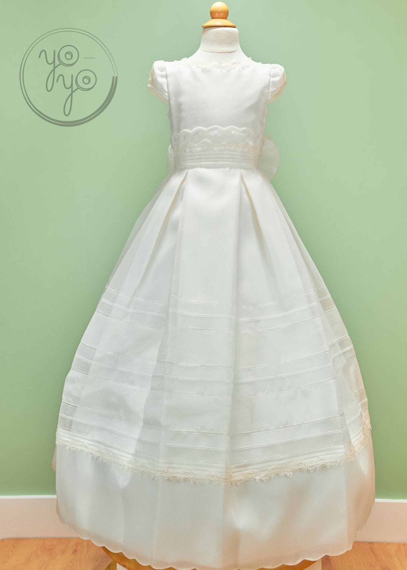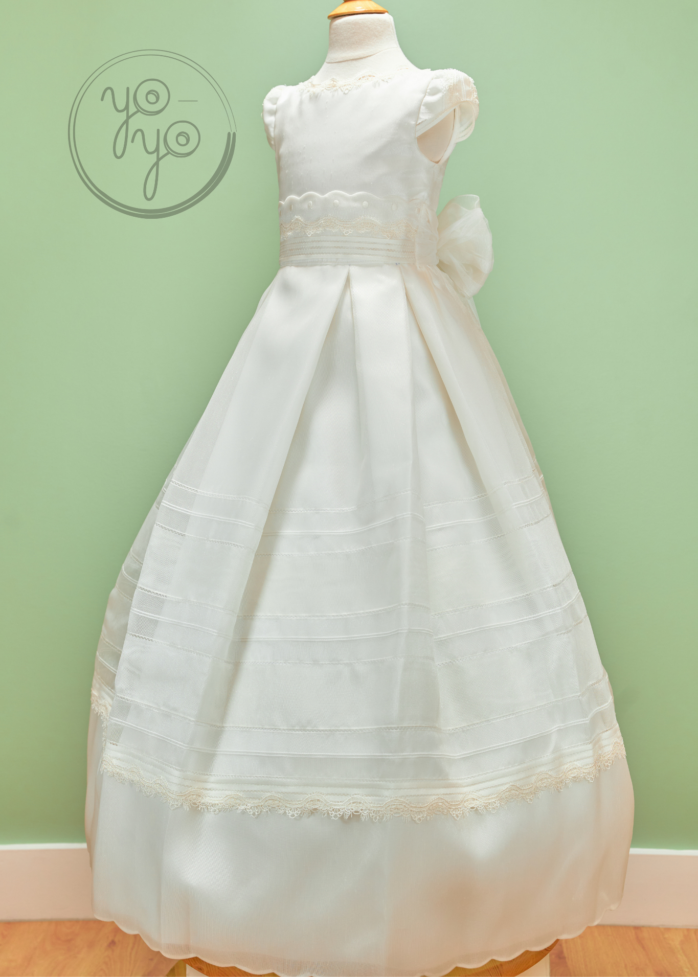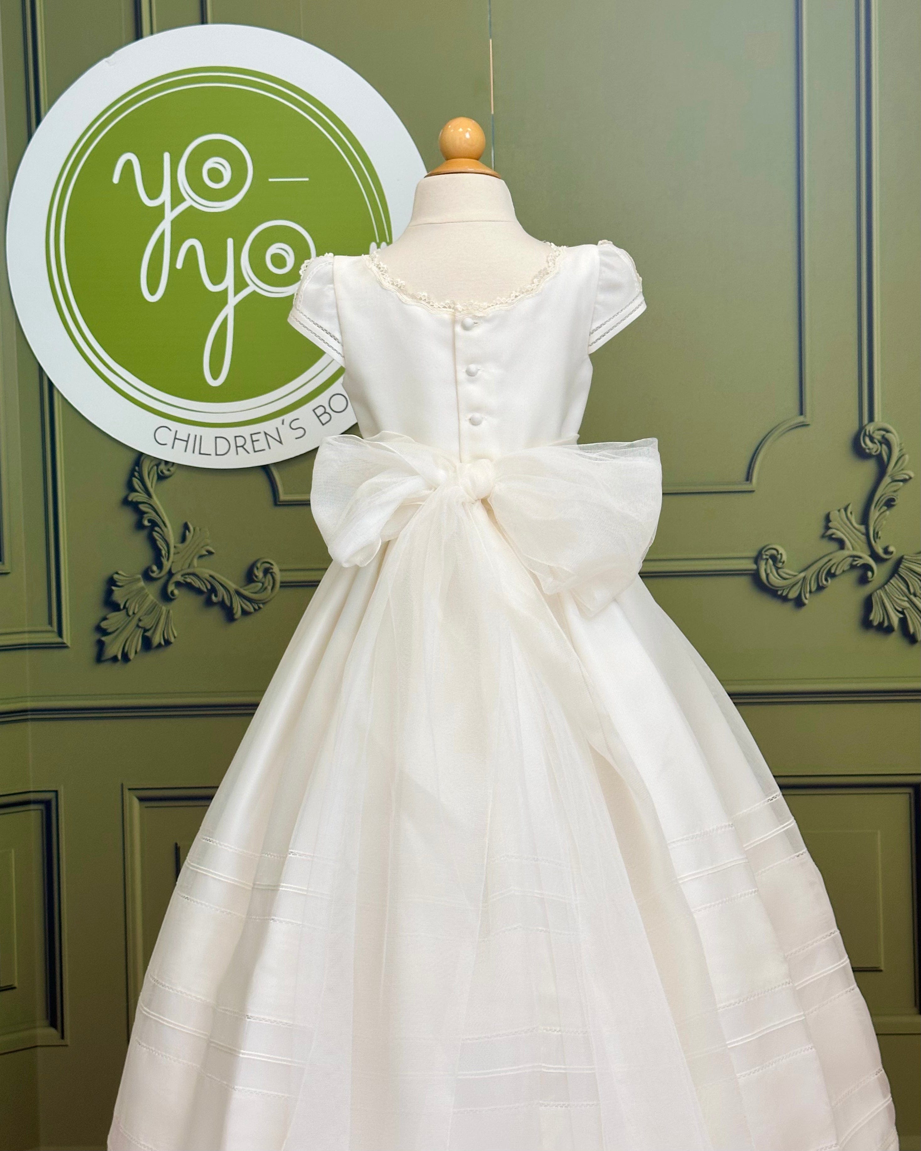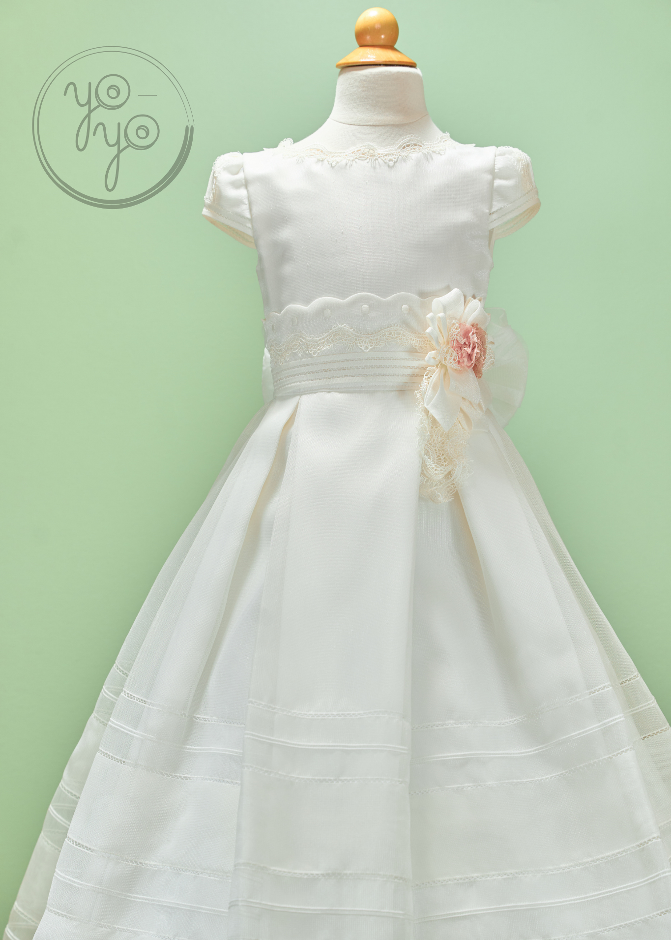 The Brisas First Communion Dress is a sophisticated and elegant gown designed to make her special day unforgettable. Made in soft off-white rustic gauze, it combines natural texture with artisanal craftsmanship.