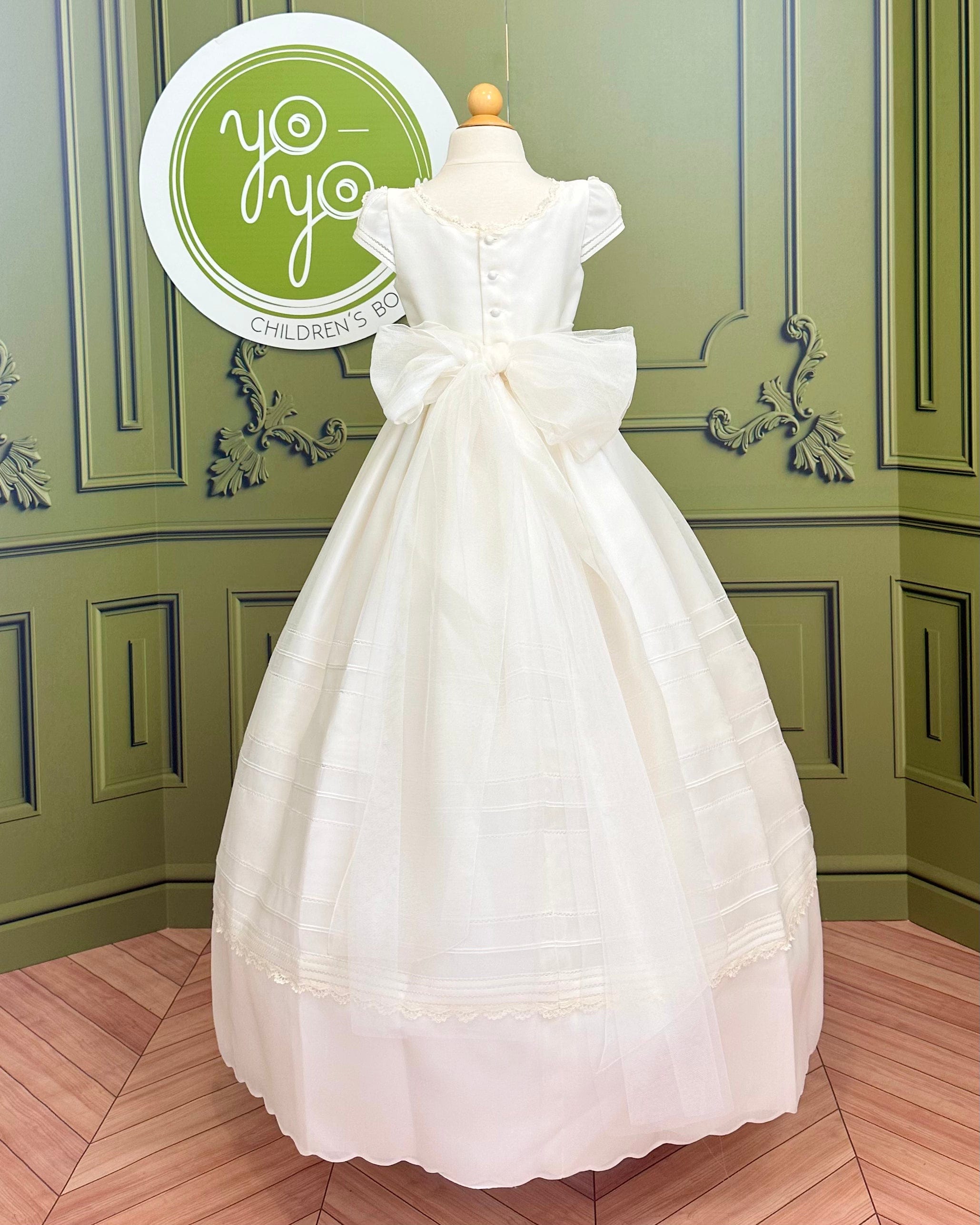 The dress features a beautifully pleated skirt with a scalloped edge and delicate detailing throughout. Cap sleeves are trimmed with lace and finished with Punto Paris for added refinement, while the round neckline is bordered with lace for a dainty touch.