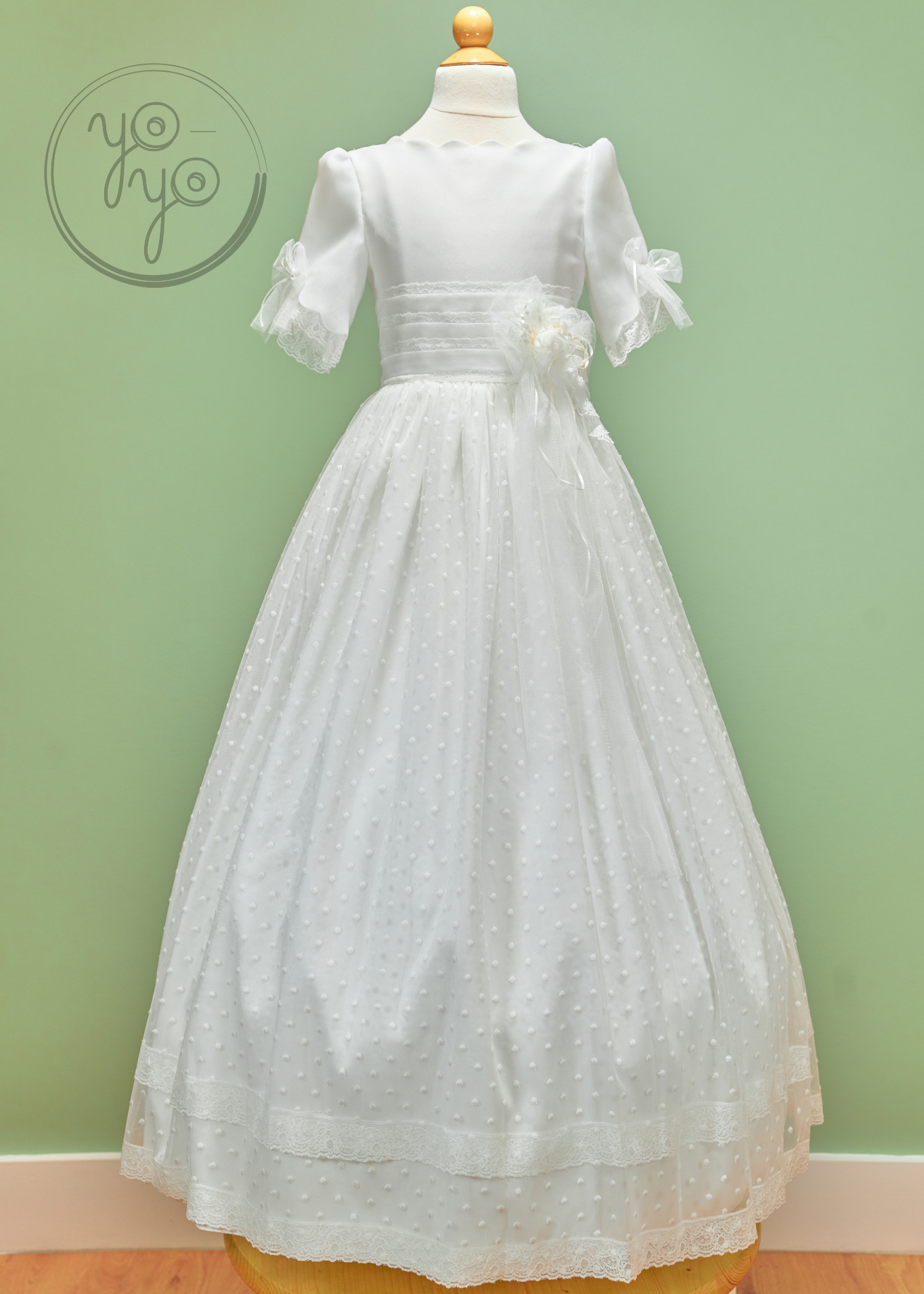 The Cala First Communion Dress is a one-of-a-kind design that beautifully merges tradition with boho charm. The bodice is crafted in soft off-white organza with linen French sleeves and a delicate scalloped neckline, offering a classic touch.
