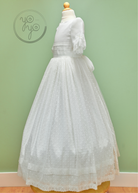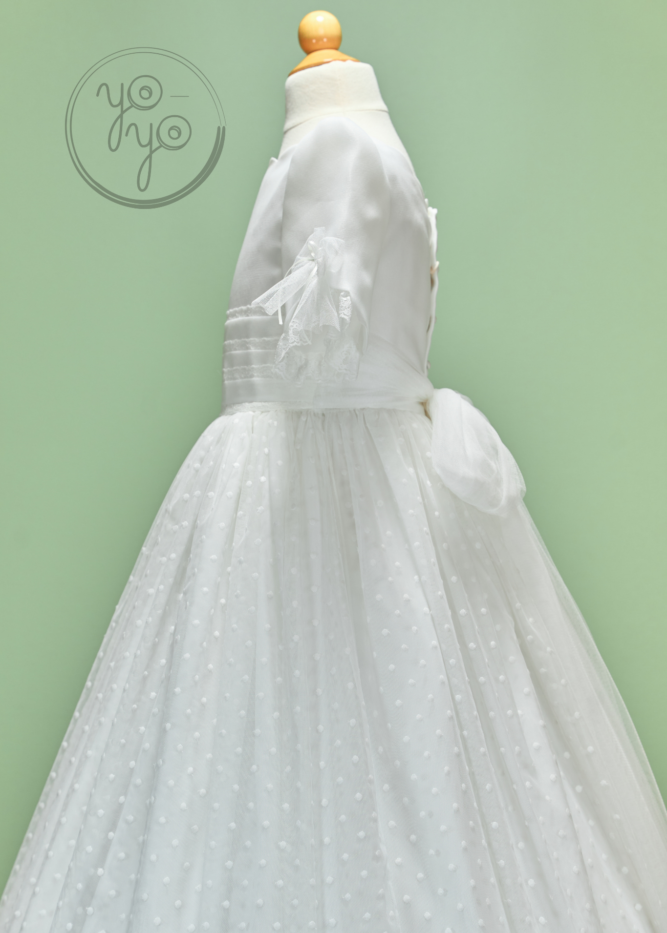 The pleated sash at the waist transitions into airy tulle ties that form a relaxed draped bow at the back. The skirt is crafted from embroidered French tulle, decorated with dainty polka dots for a playful yet elegant finish.