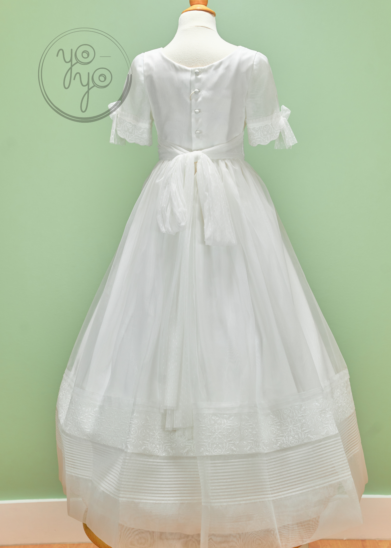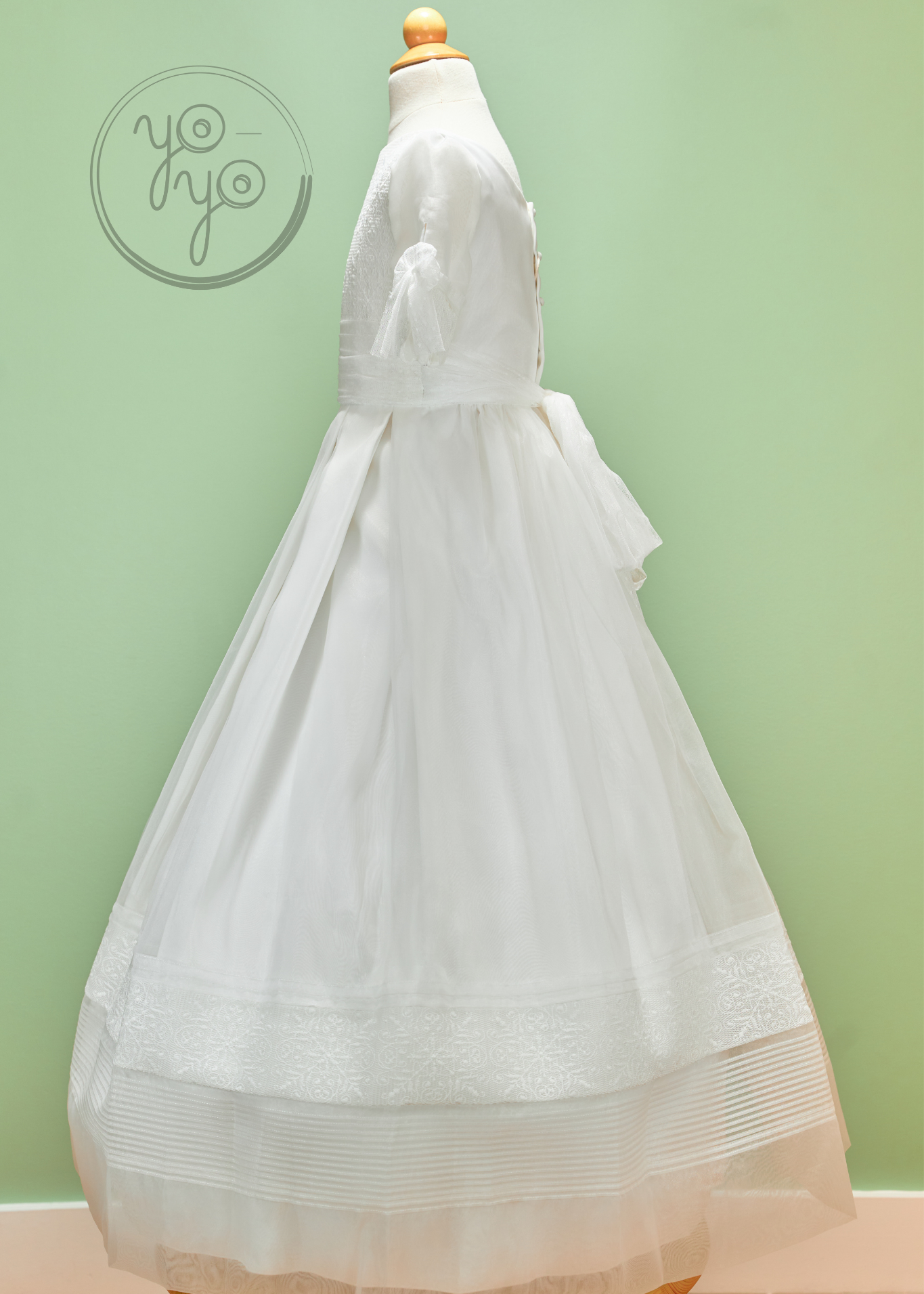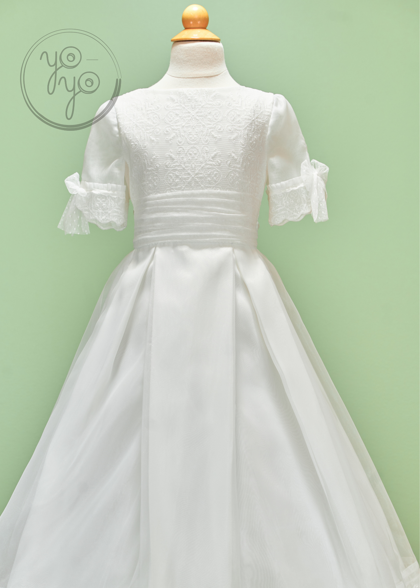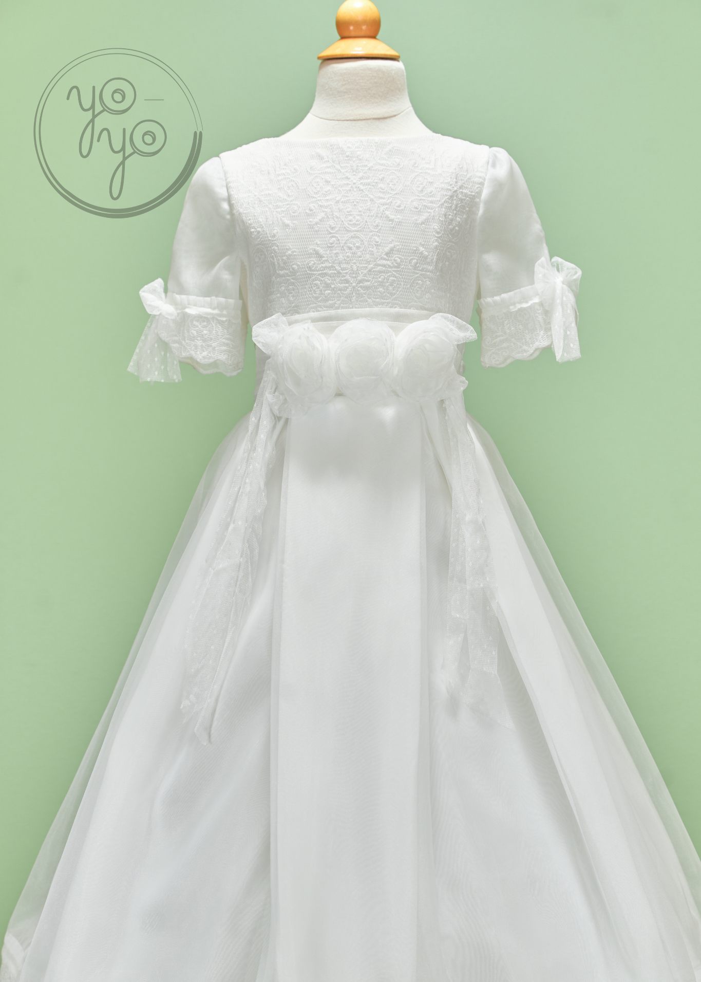 Camomila is an elegant design for families seeking a dress that combines traditional beauty with delicate, romantic details.
