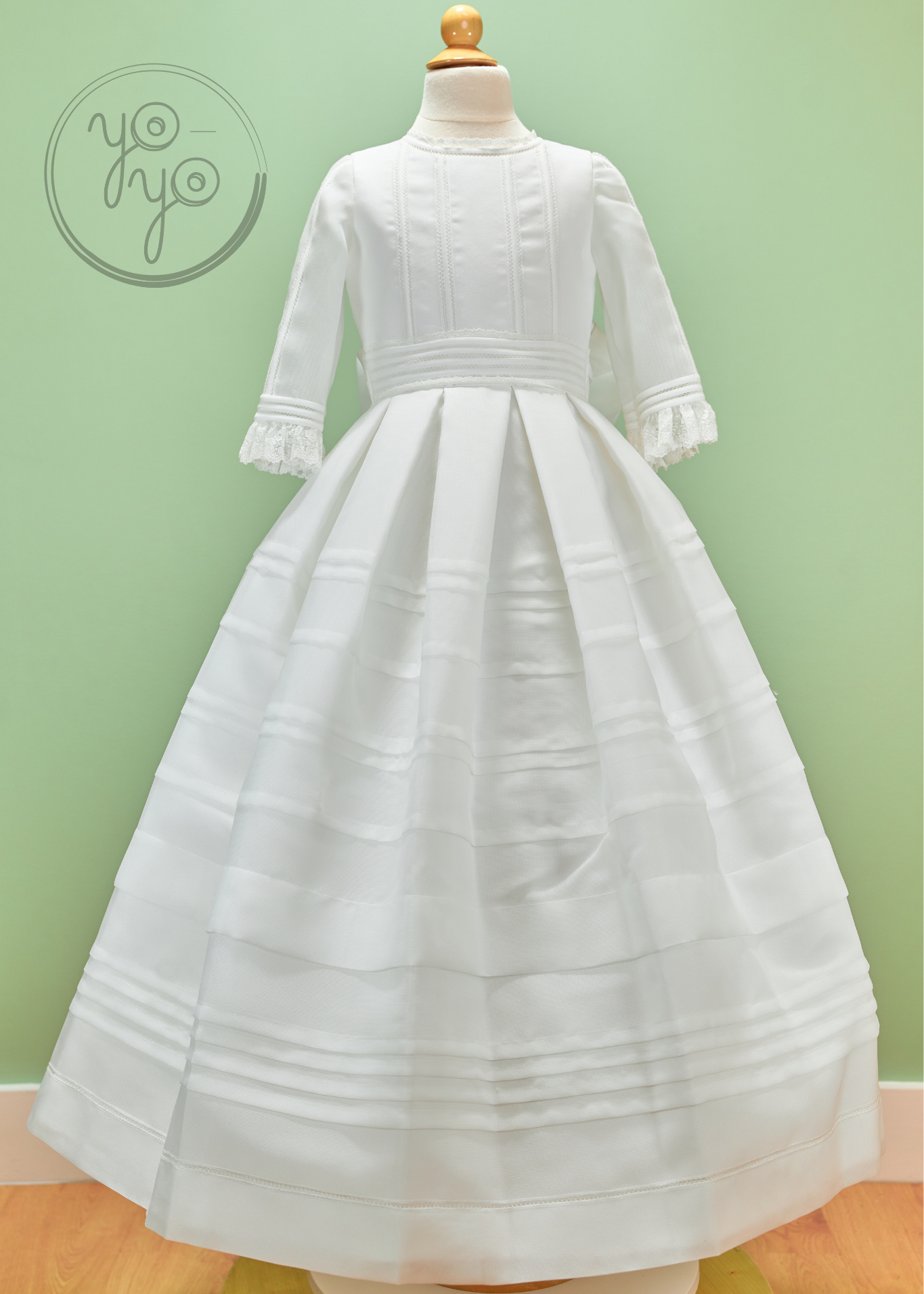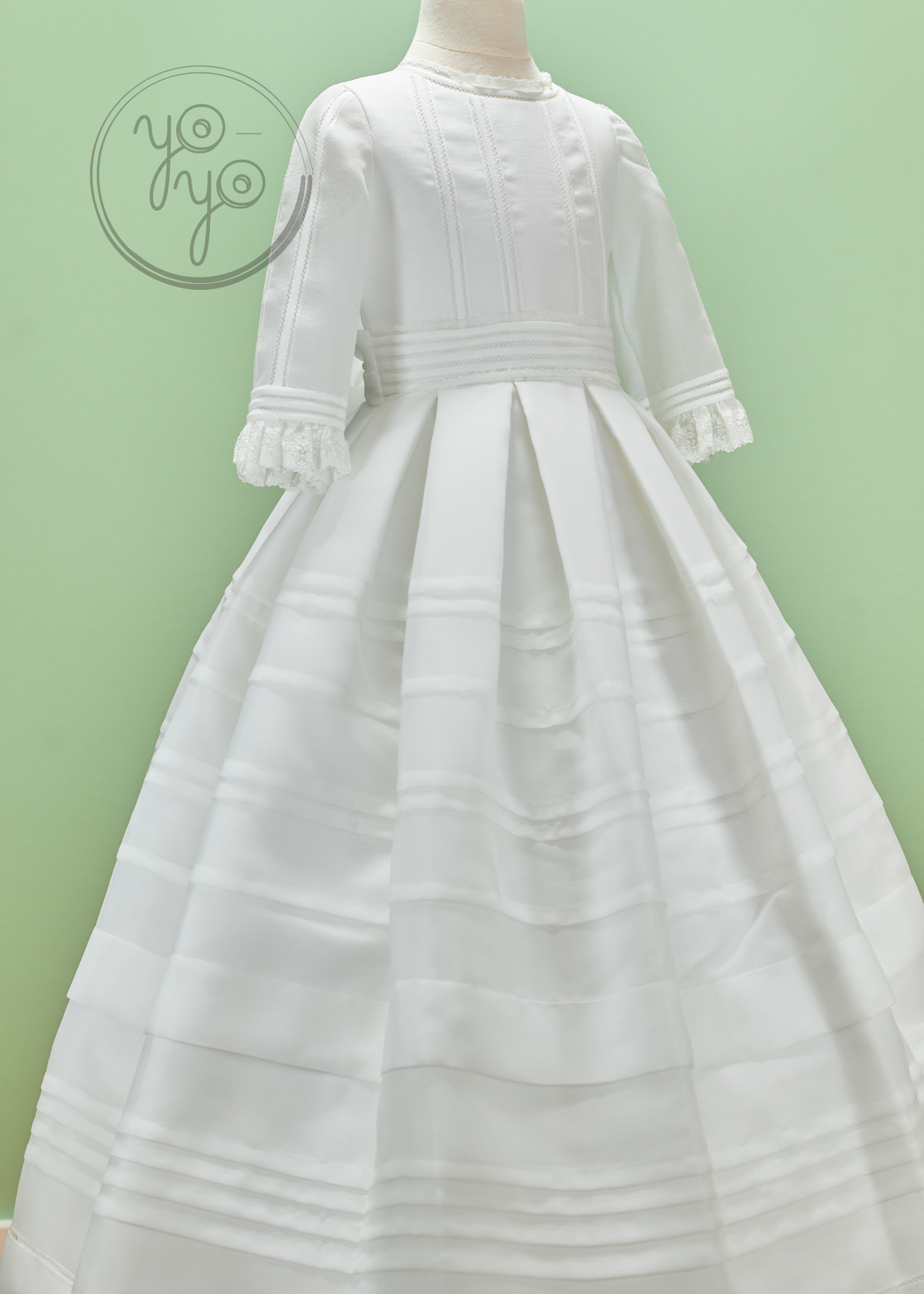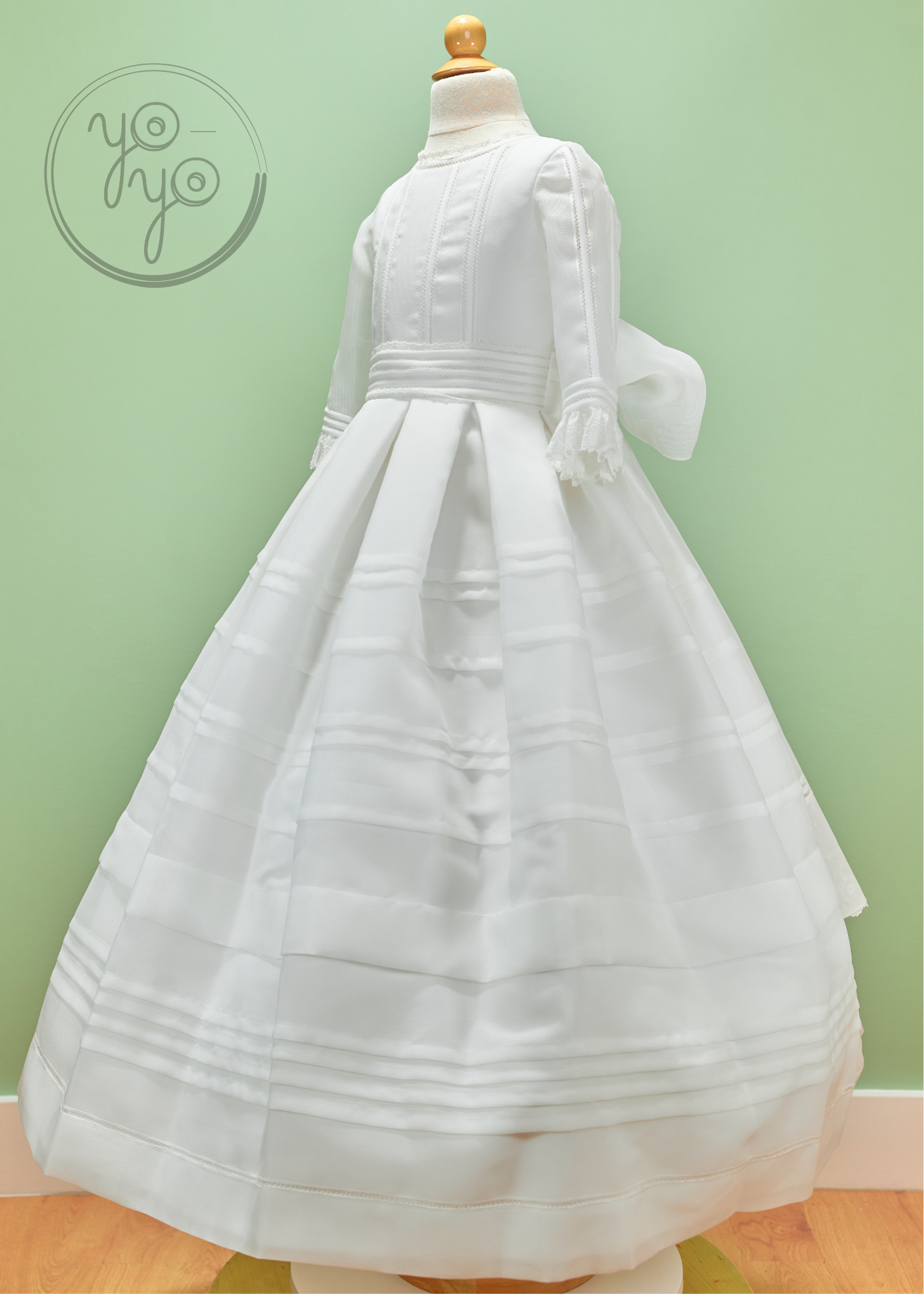 The Charlotte First Communion Dress from our deluxe collection is the definition of timeless elegance. Crafted in luxurious white Mikado silk, this gown has a structured yet graceful silhouette that makes it truly stand out.