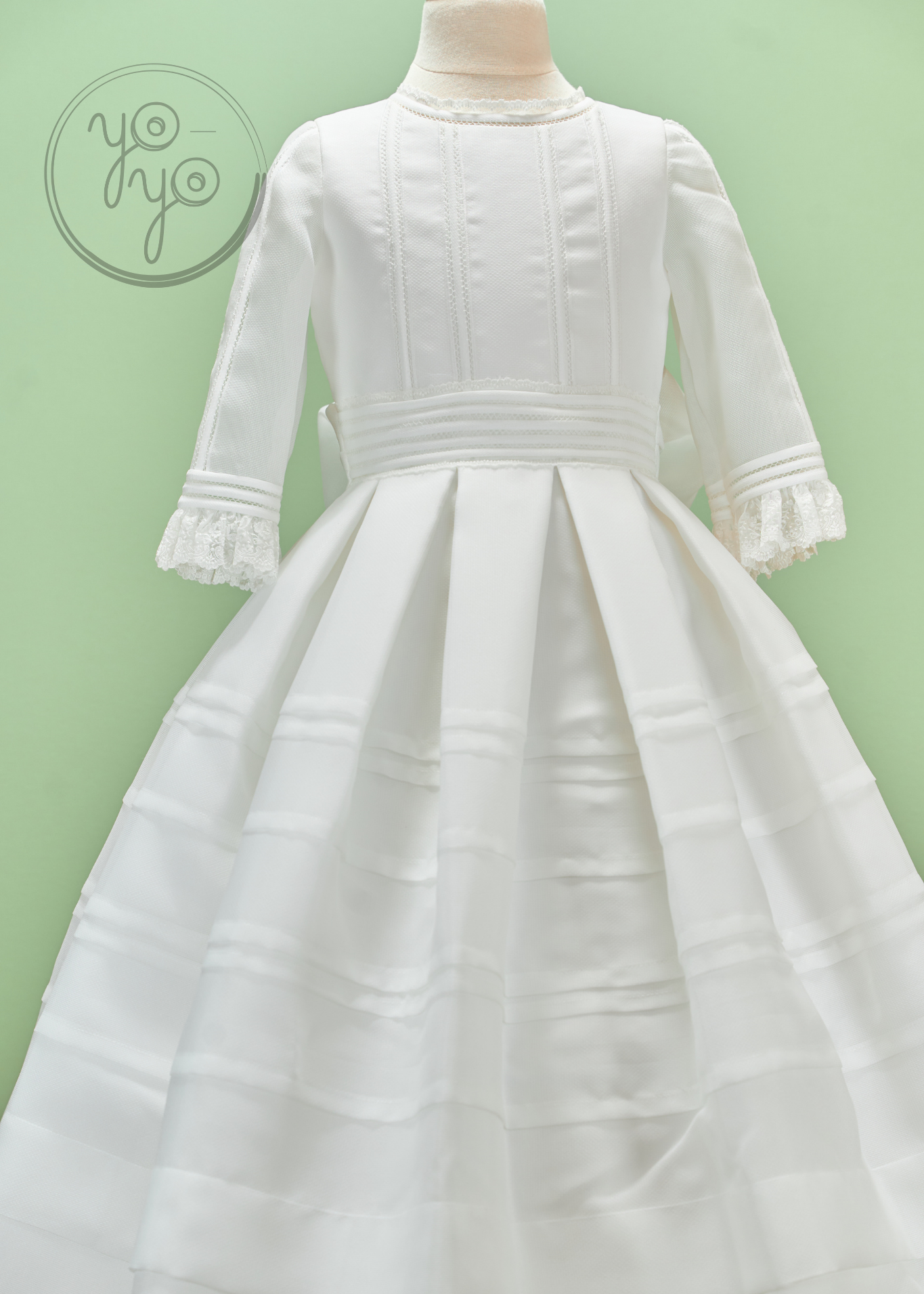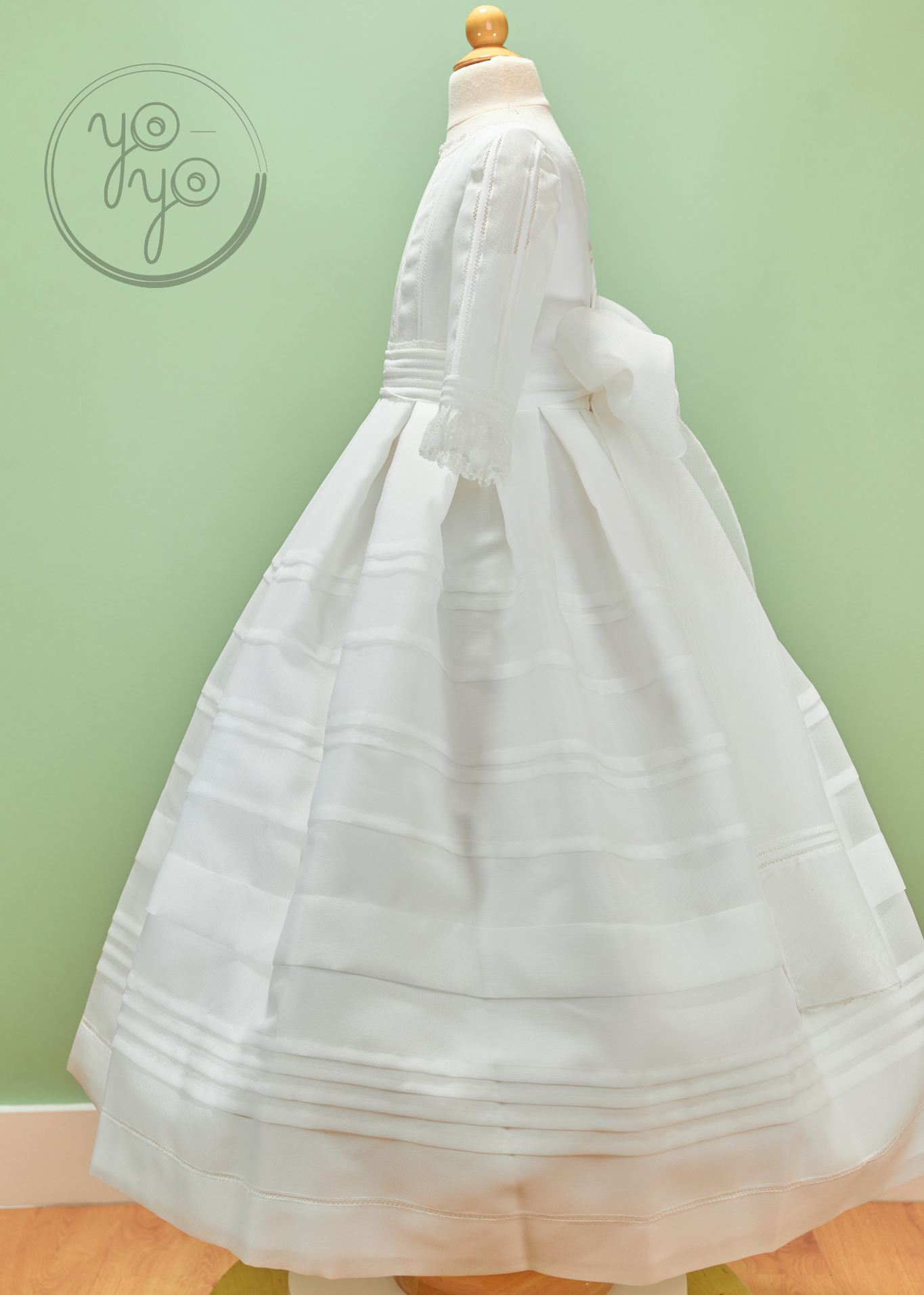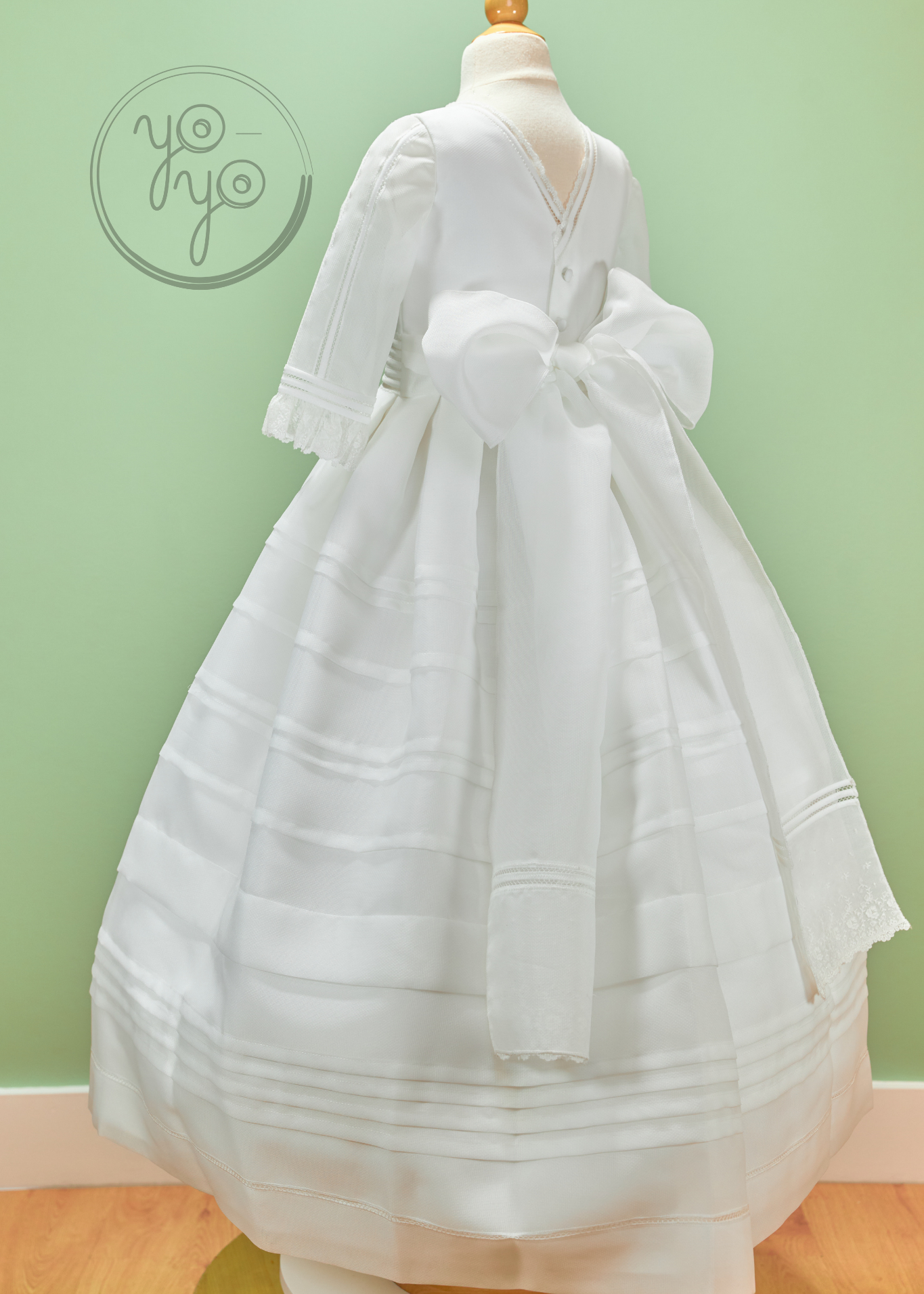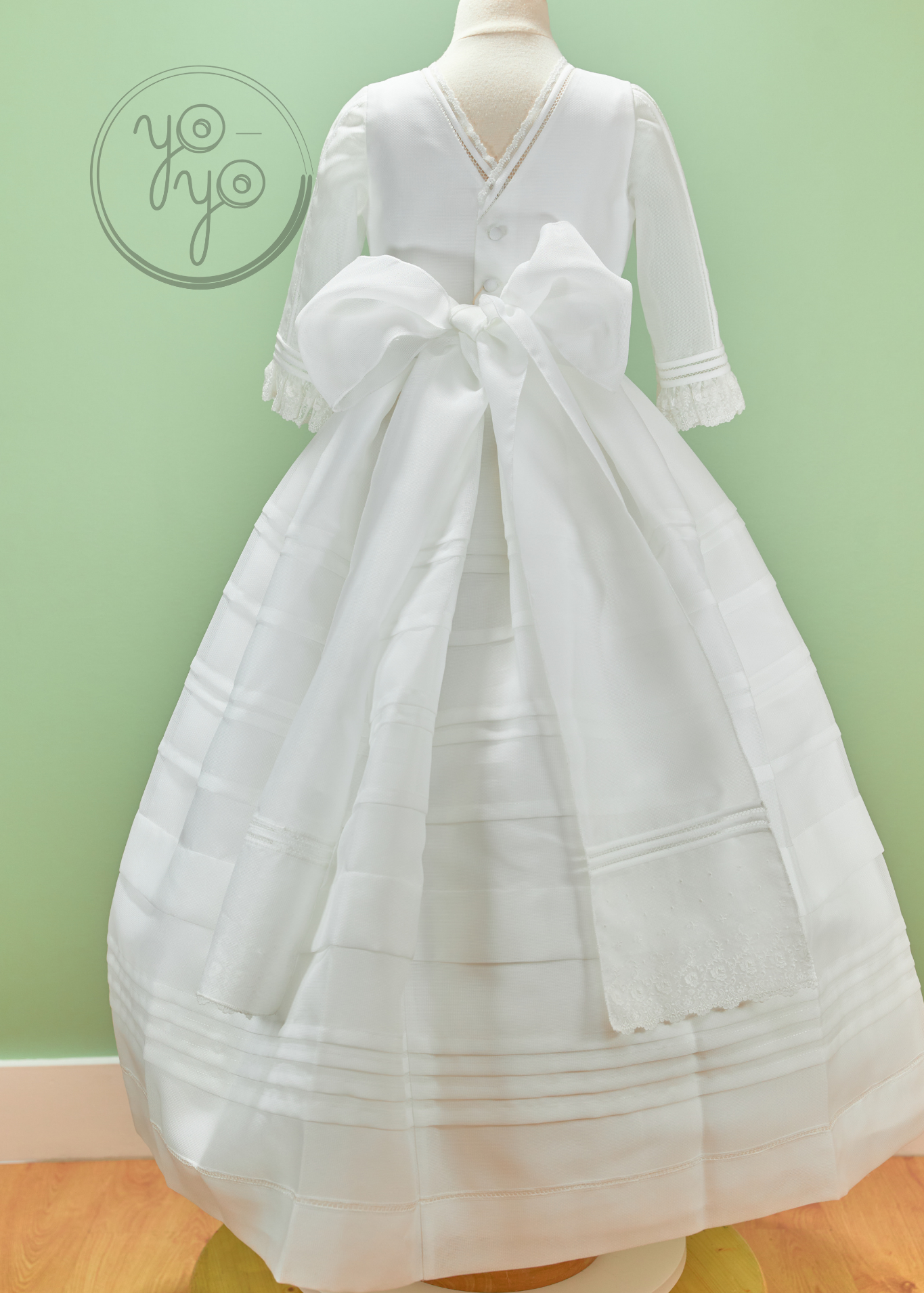 Its French sleeves are adorned with delicate Punto Paris embroidery and finished with lace edging, adding refinement to the design. The skirt is beautifully pleated throughout, offering volume and sophistication. A Punto Paris sash accents the waist in front, while the back features silk ties that form a grand bow beneath the elegant V-back design.