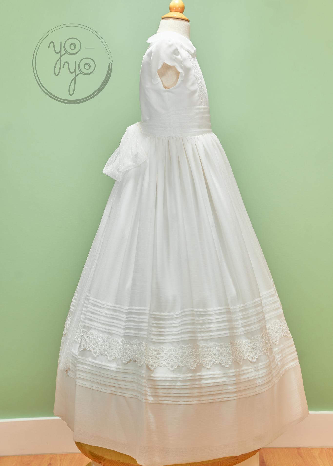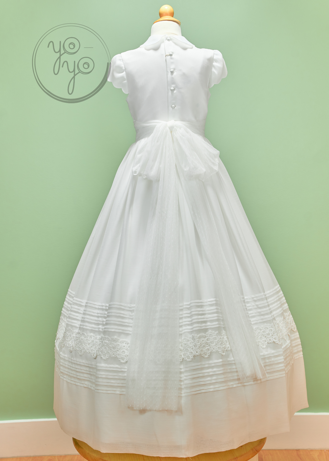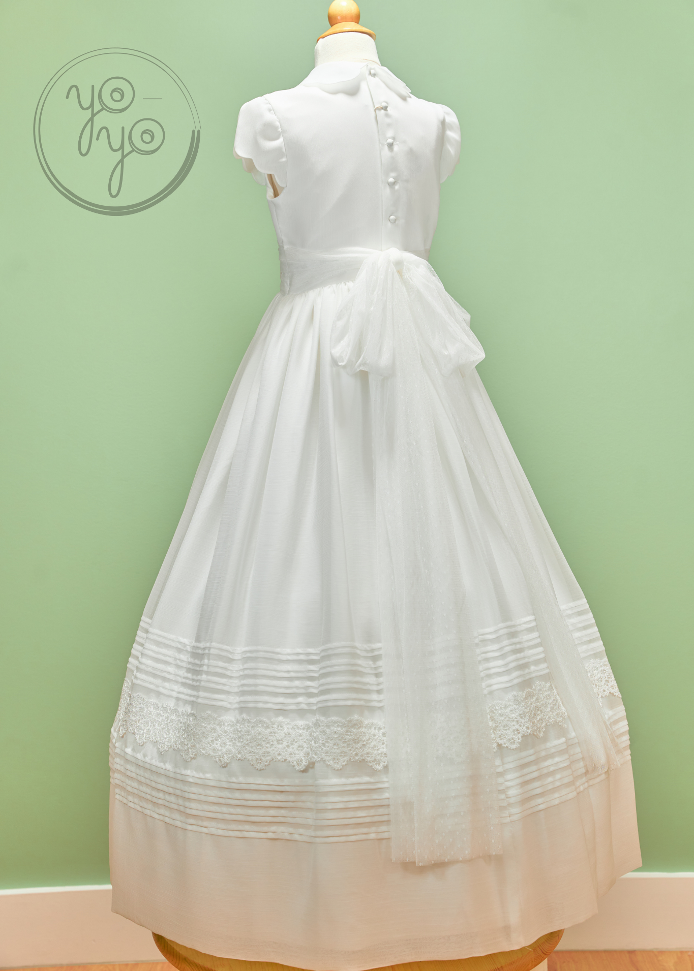The back fastens with covered buttons, ensuring a polished finish. Daisy is an elegant, dainty, and traditional dress—perfect for families seeking a First Communion gown that feels both classic and charming.