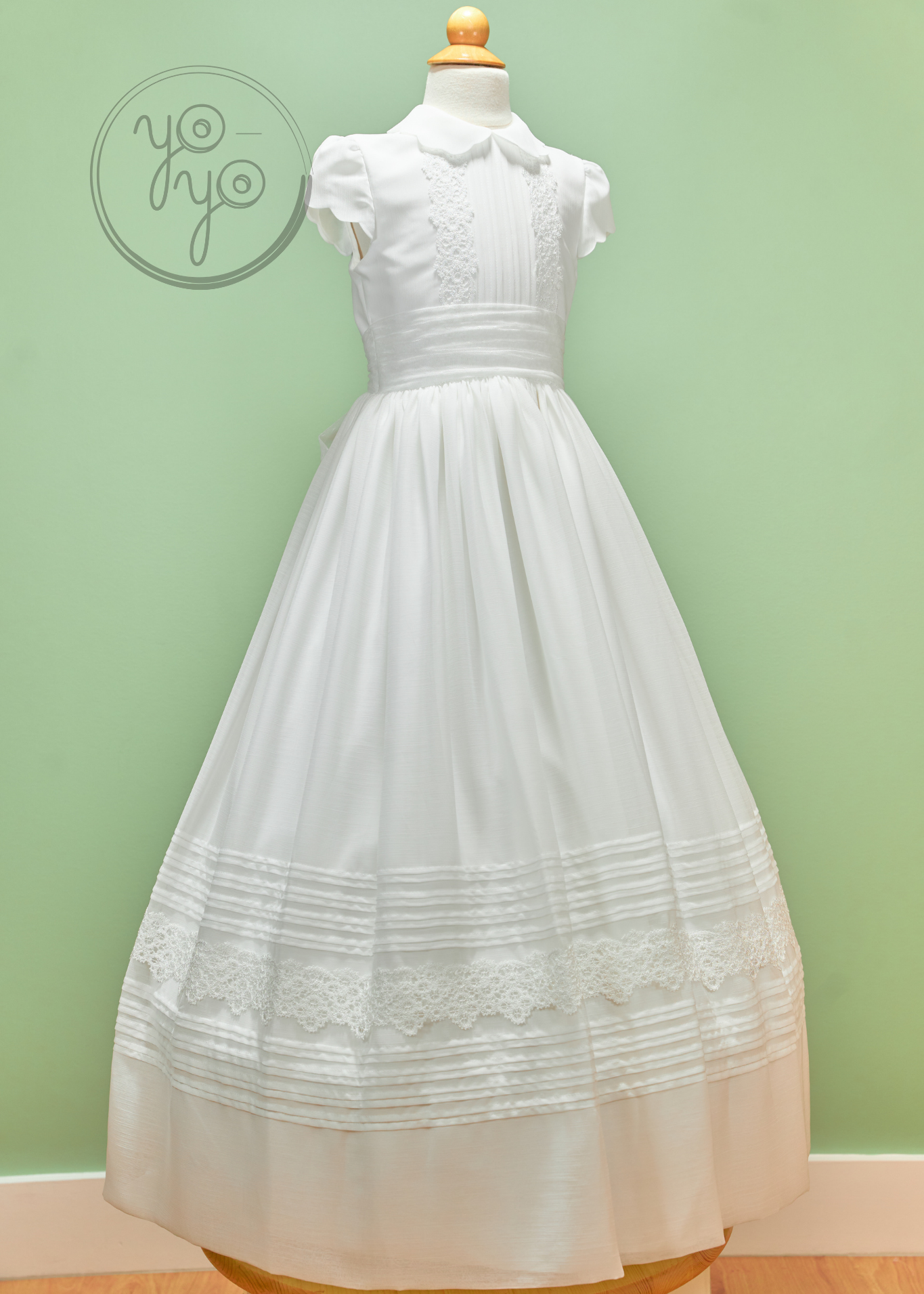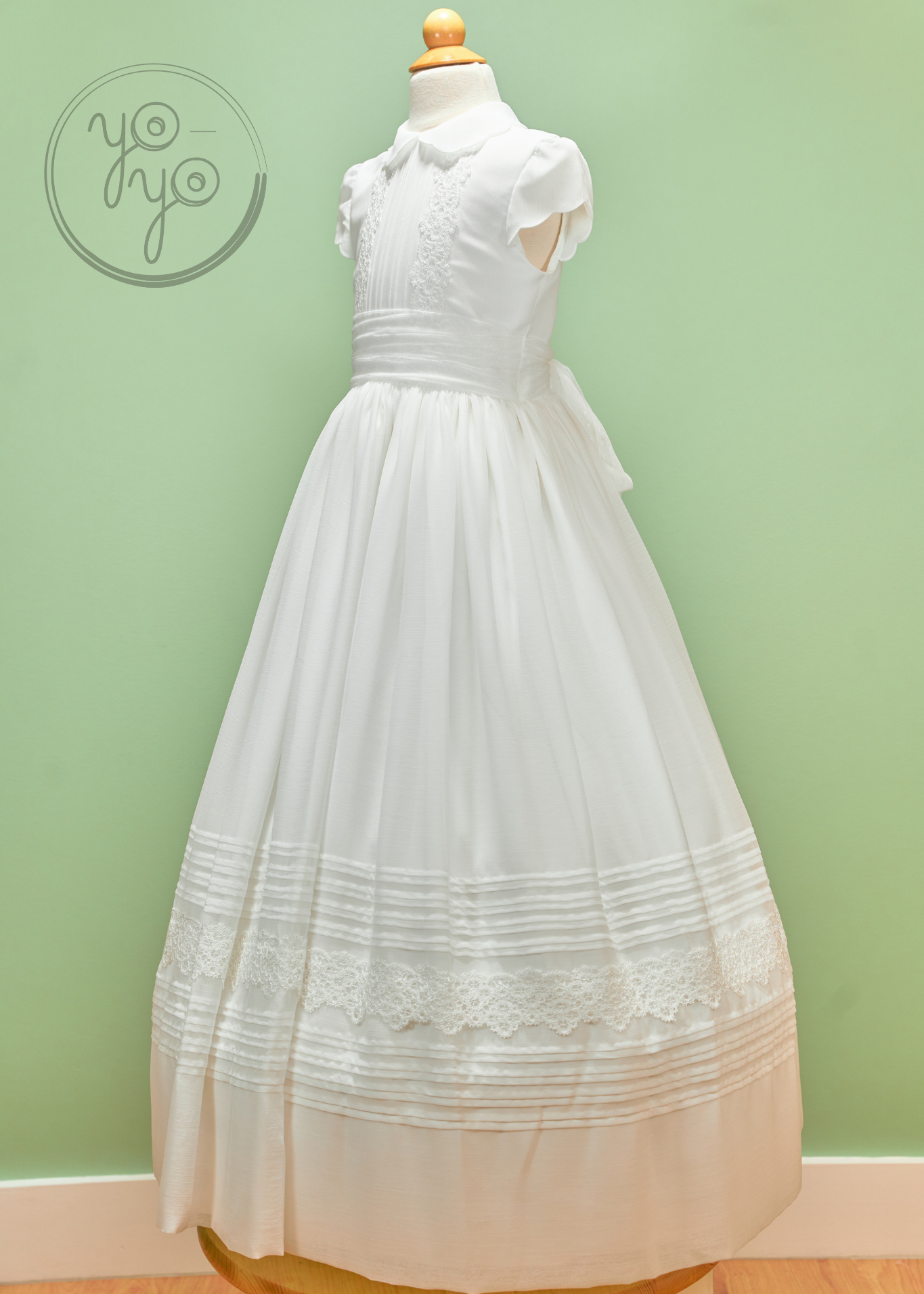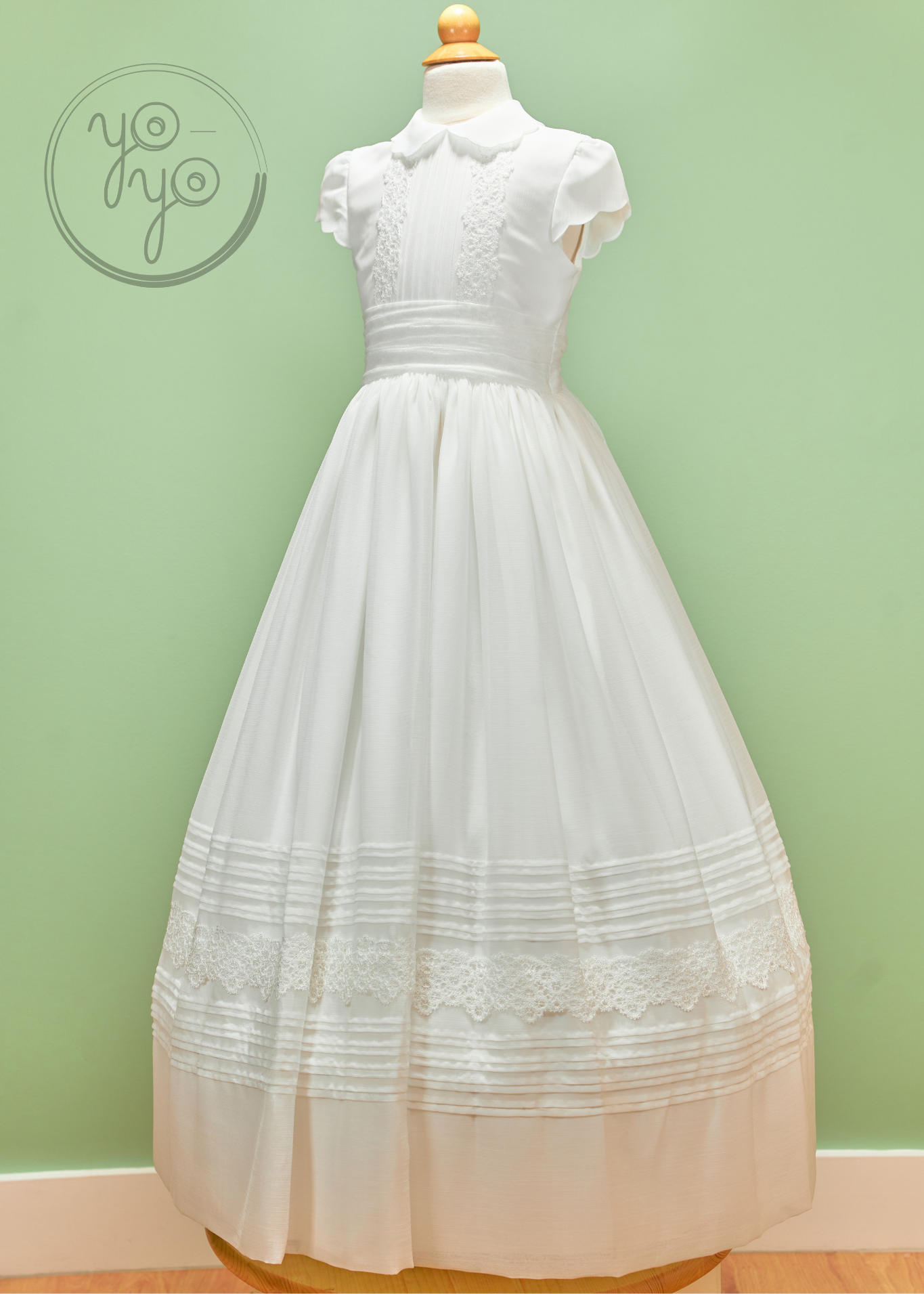 The back fastens with covered buttons, ensuring a polished finish. Daisy is an elegant, dainty, and traditional dress—perfect for families seeking a First Communion gown that feels both classic and charming.