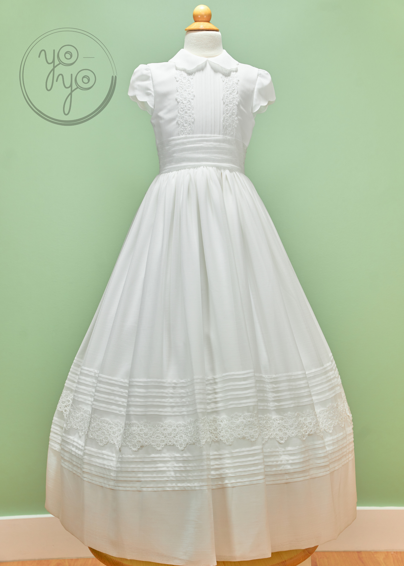 The gown features a scalloped Peter Pan collar, lace detailing on the chest, and charming scalloped cap sleeves. At the waist, a soft tulle sash ties into a romantic draped bow at the back. The pleated skirt is enhanced with lace accents, adding subtle texture and refinement.
