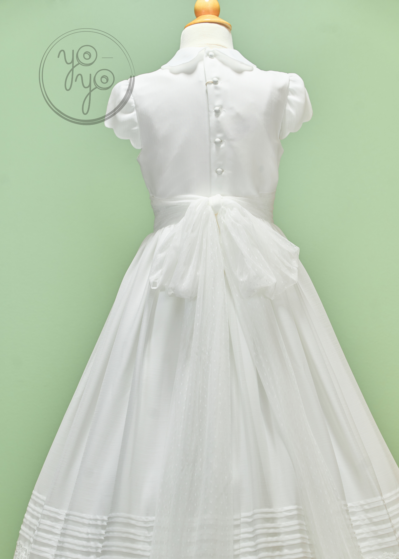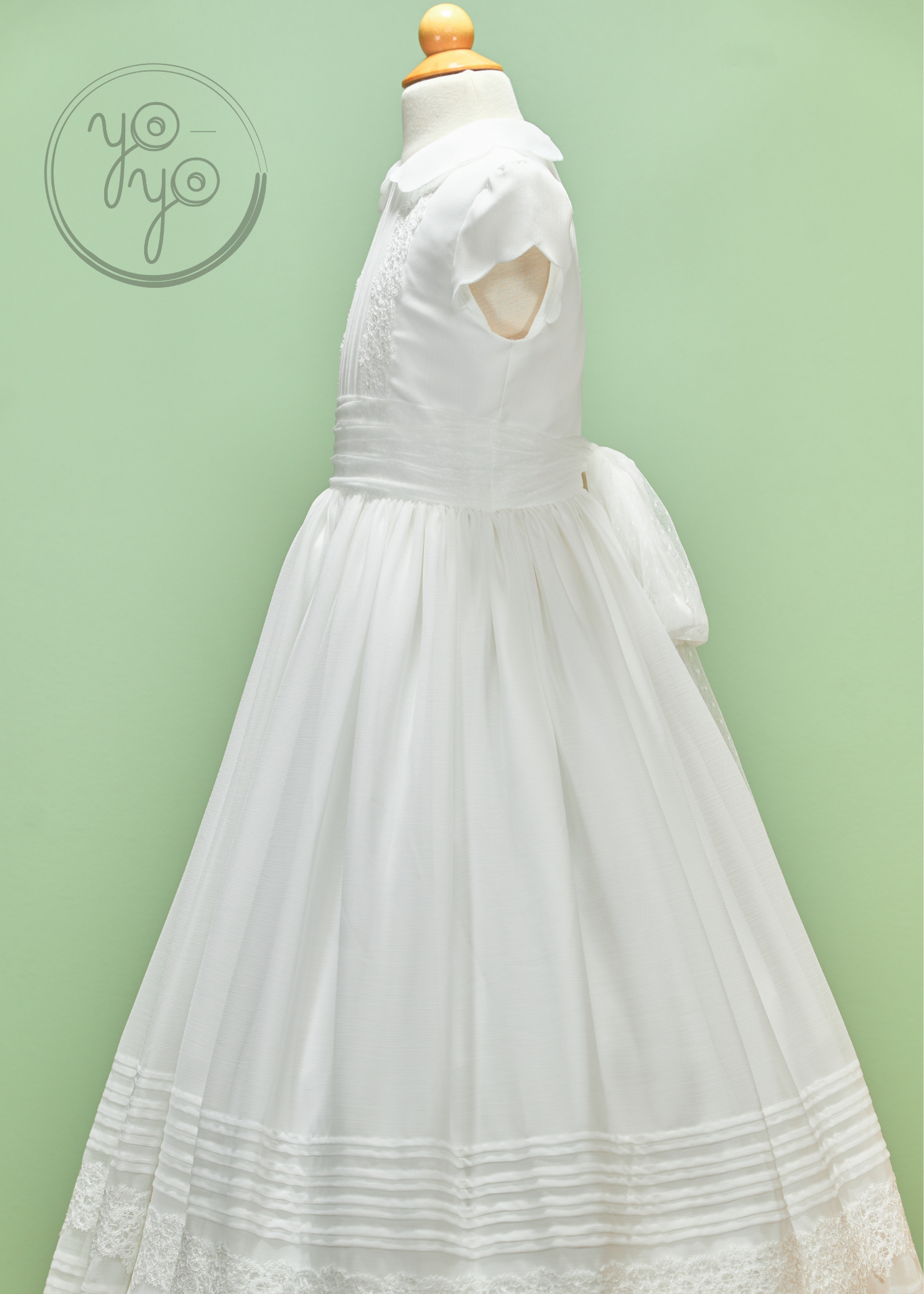 The Daisy First Communion Dress is a sweet and traditional gown, filled with delicate details that make it timeless. Made in white organza, it offers a light, graceful silhouette perfect for her special day.