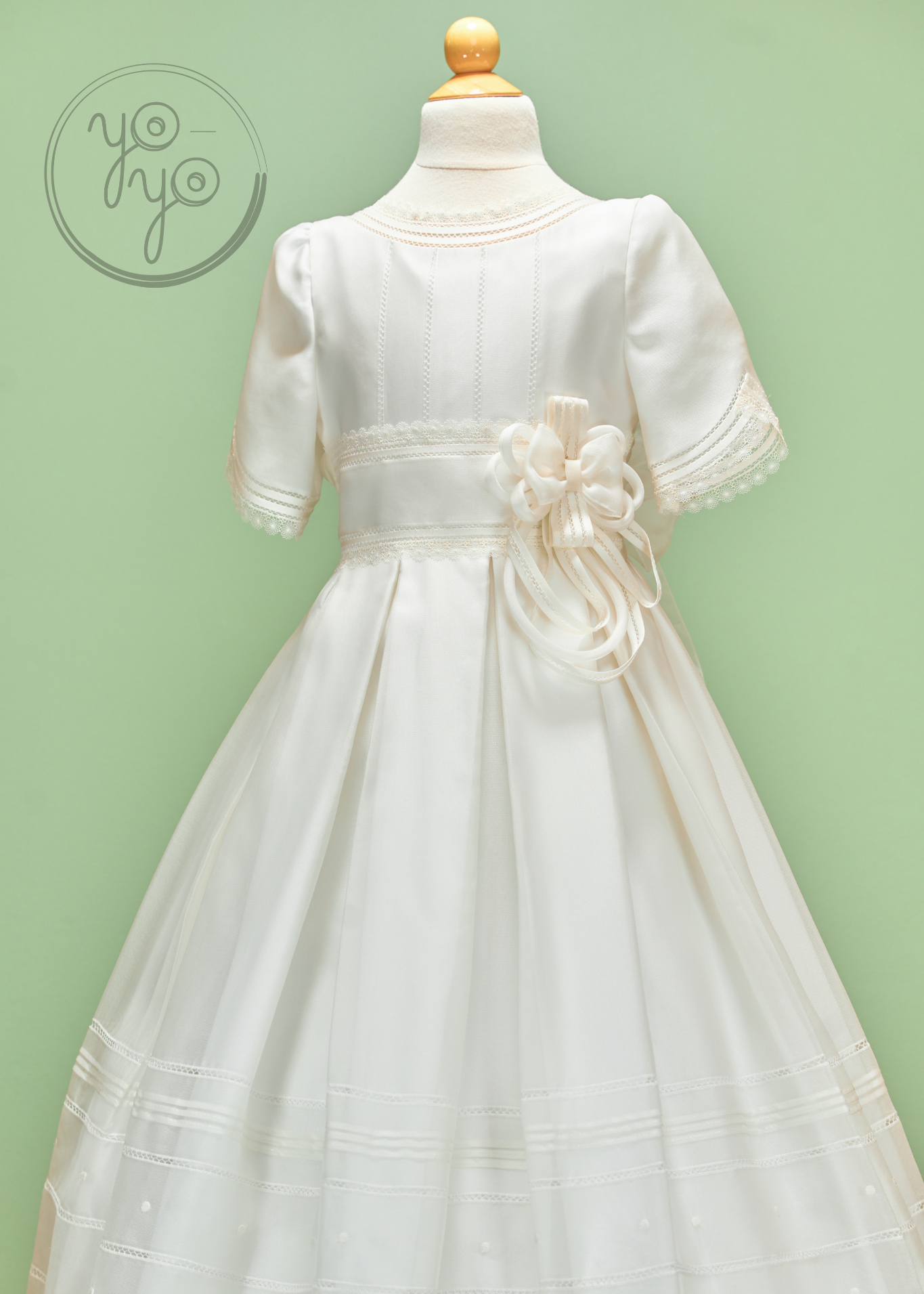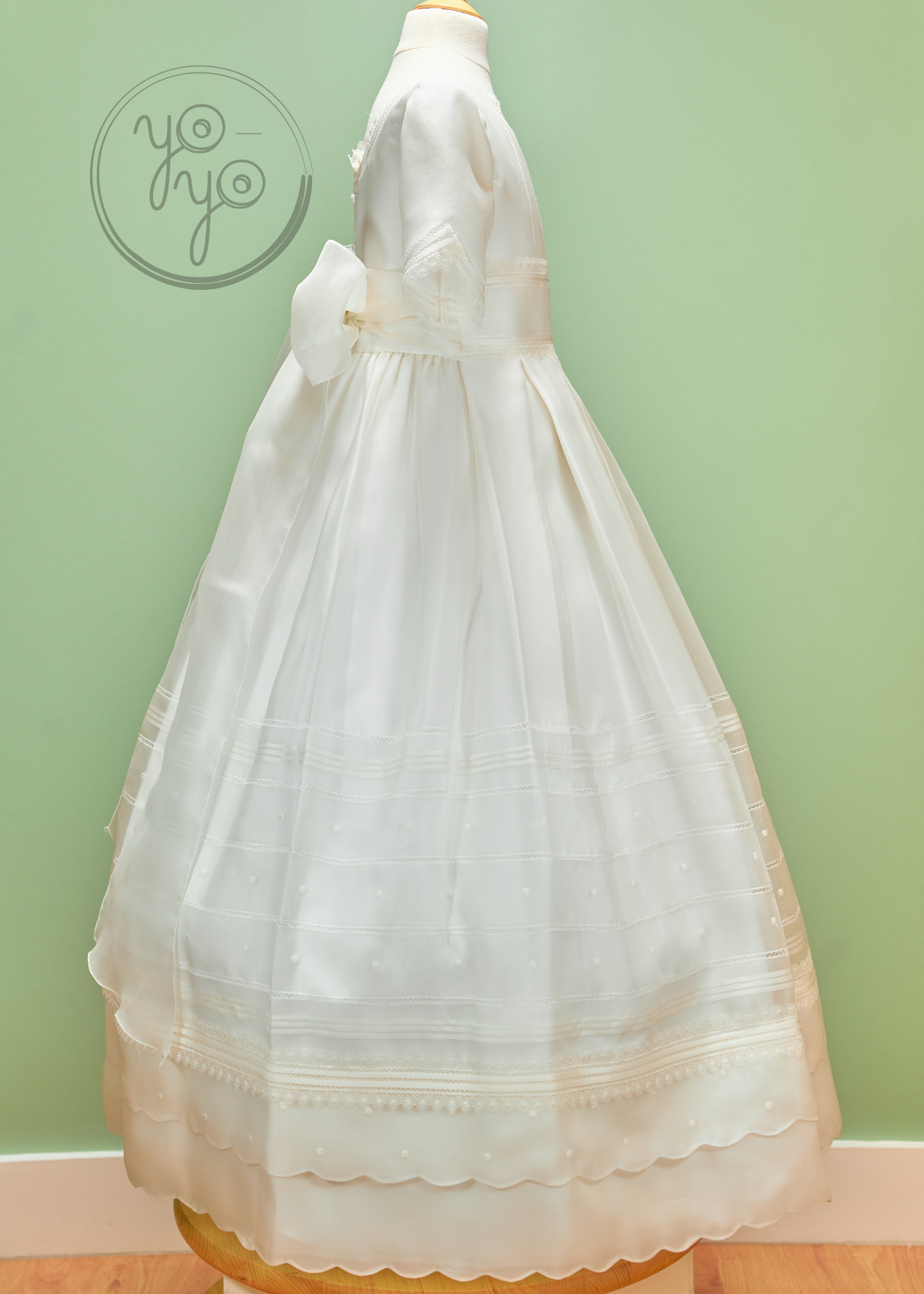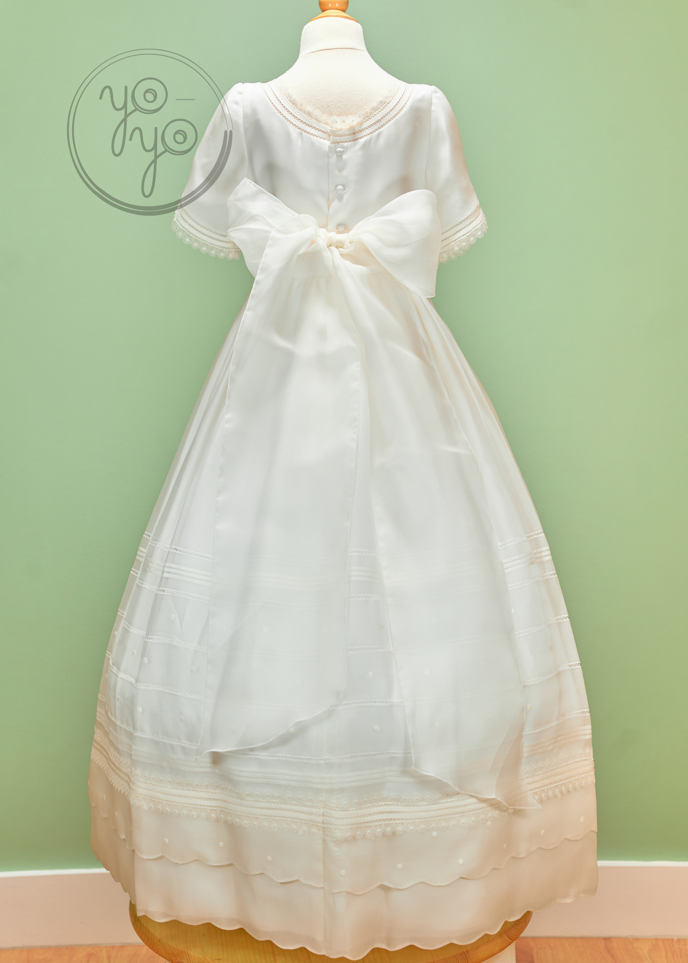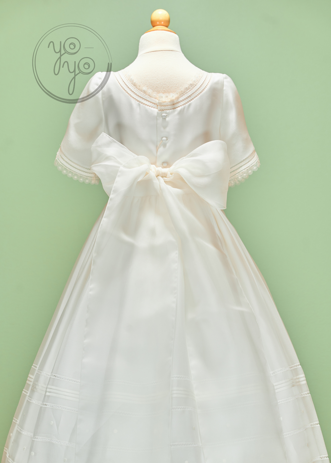 The Dalia First Communion Dress is an elegant and timeless gown, designed with refined details and exquisite craftsmanship. Made in luxurious off-white silk, this dress embodies sophistication and tradition.