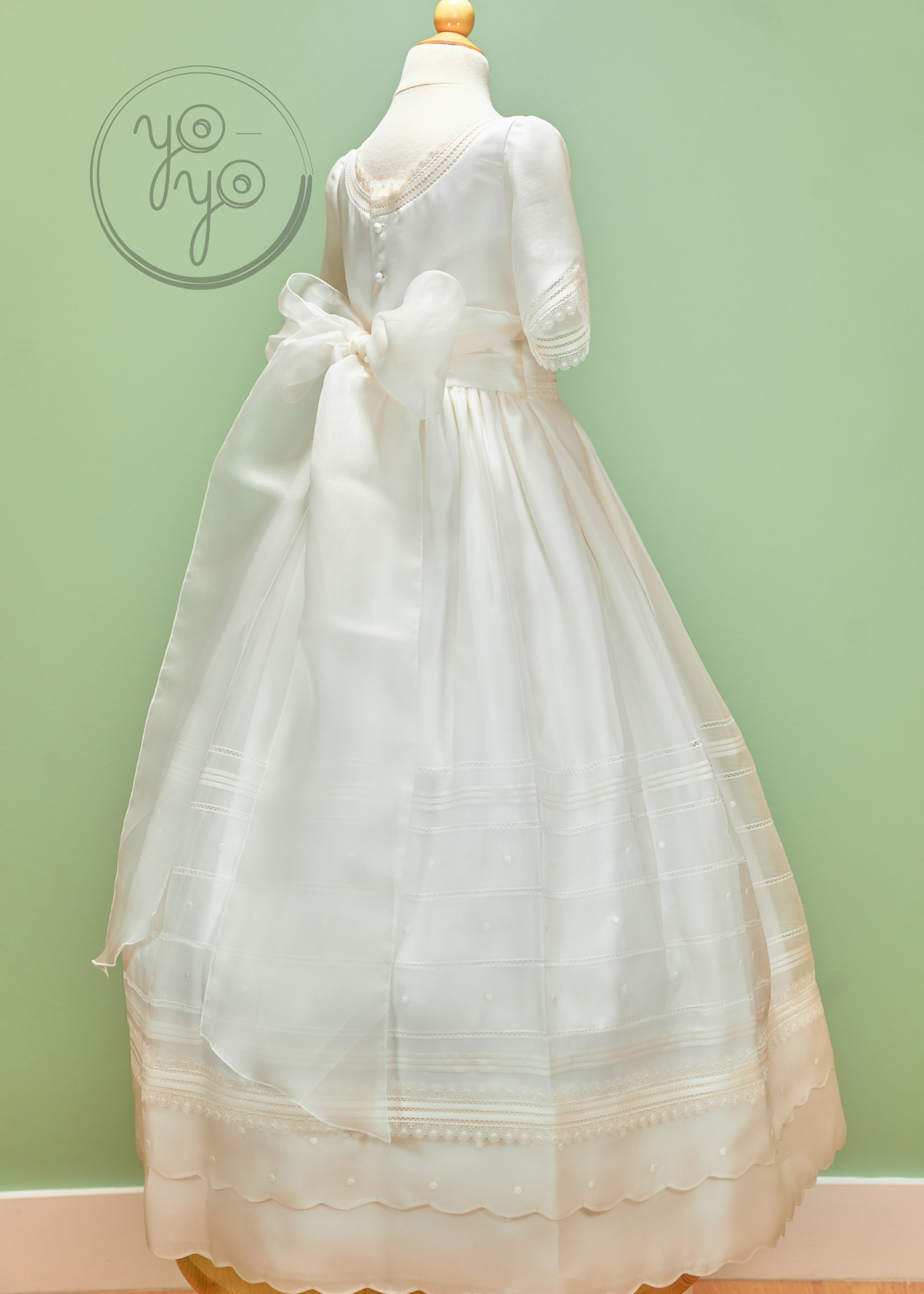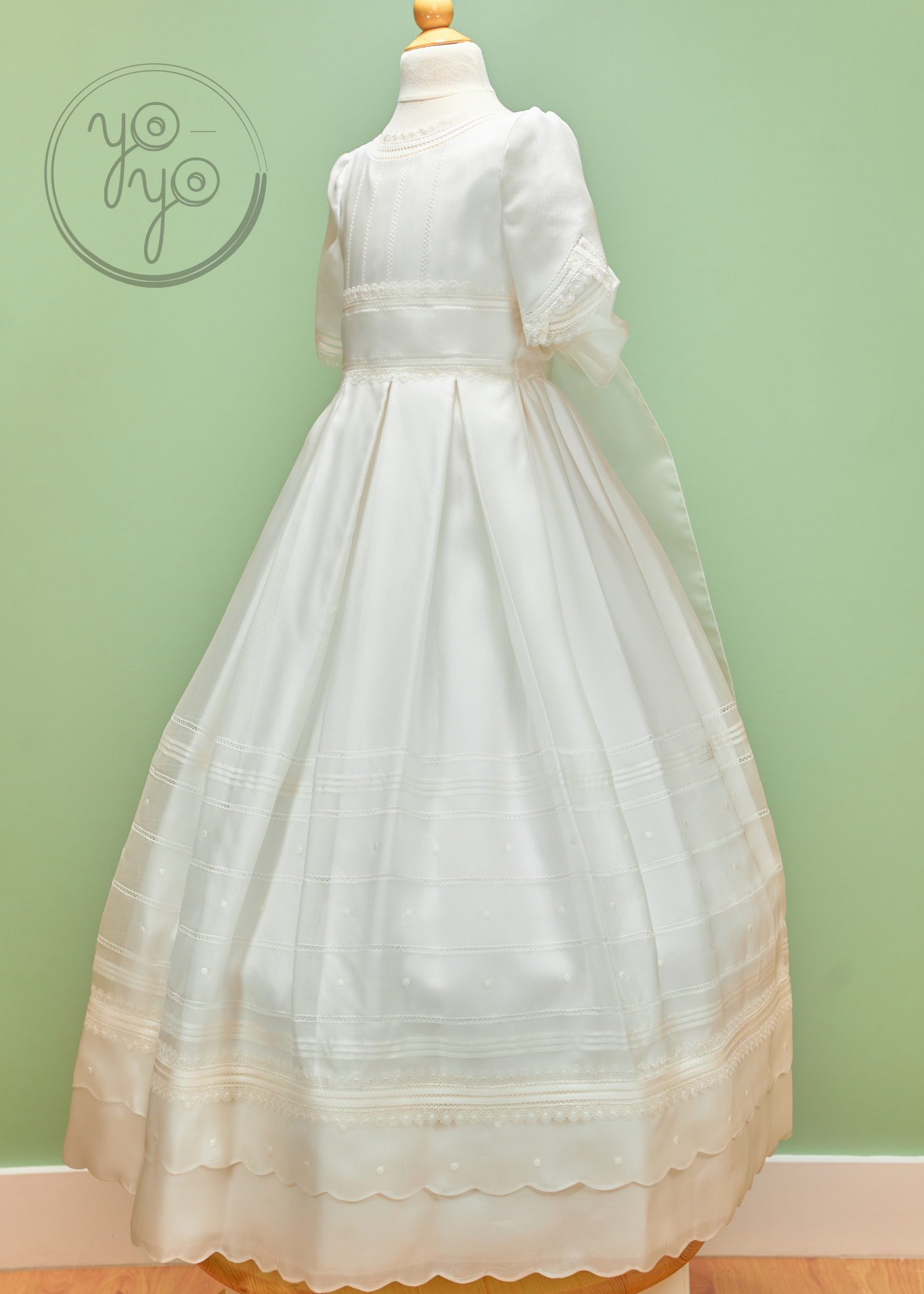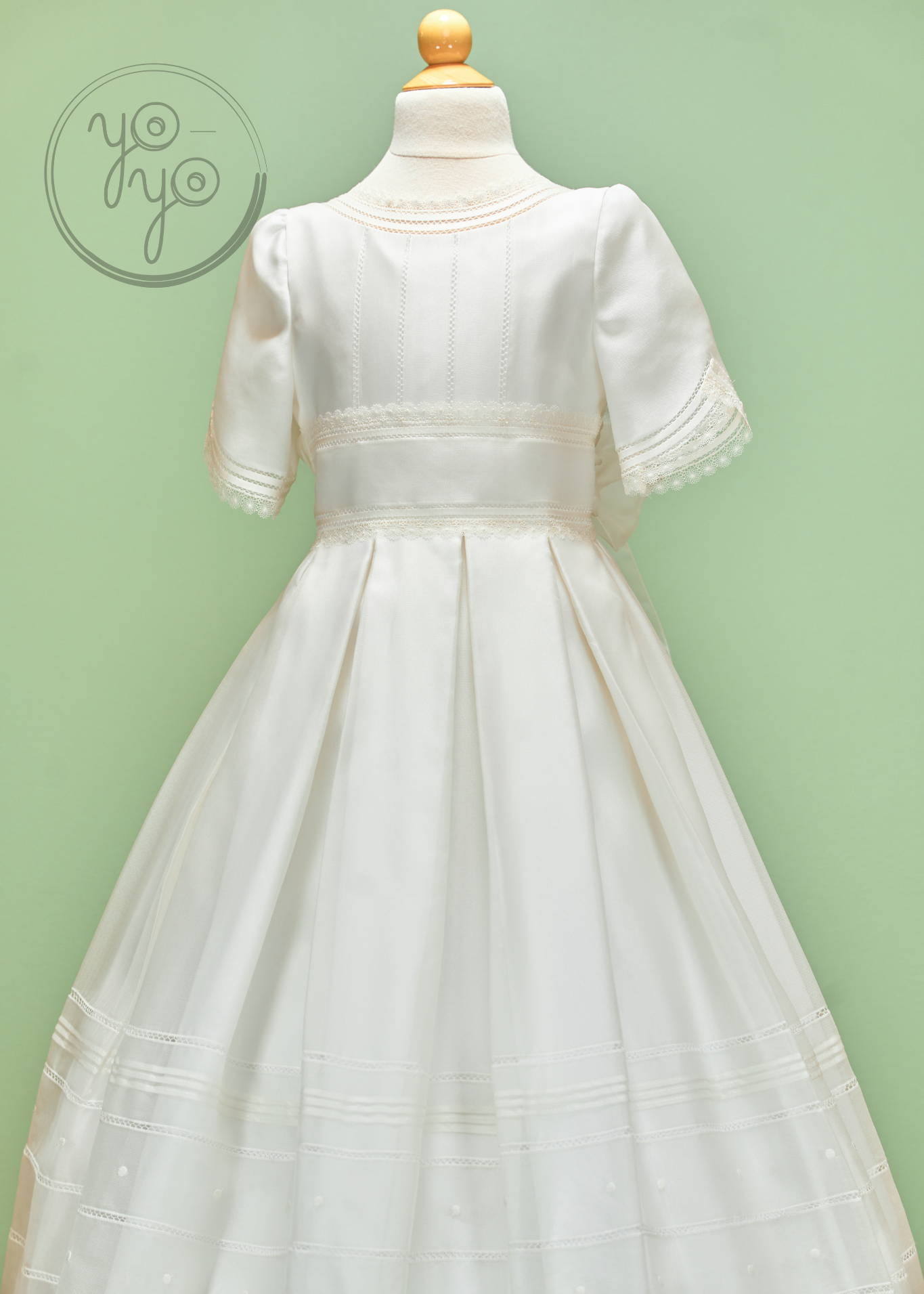 The Dalia First Communion Dress is an elegant and timeless gown, designed with refined details and exquisite craftsmanship. Made in luxurious off-white silk, this dress embodies sophistication and tradition.