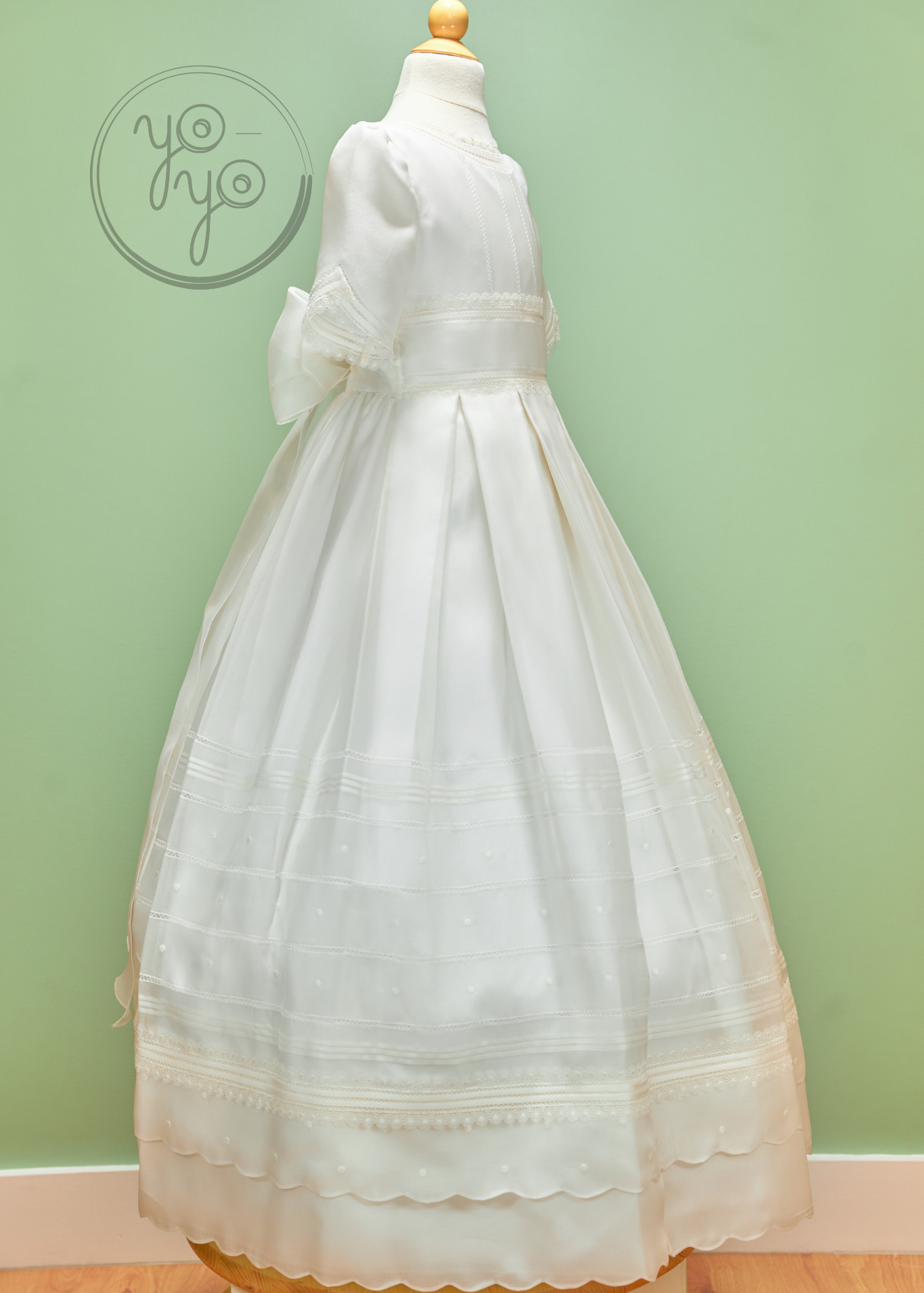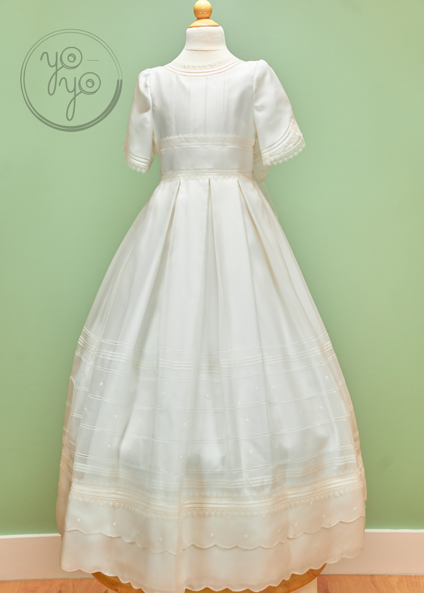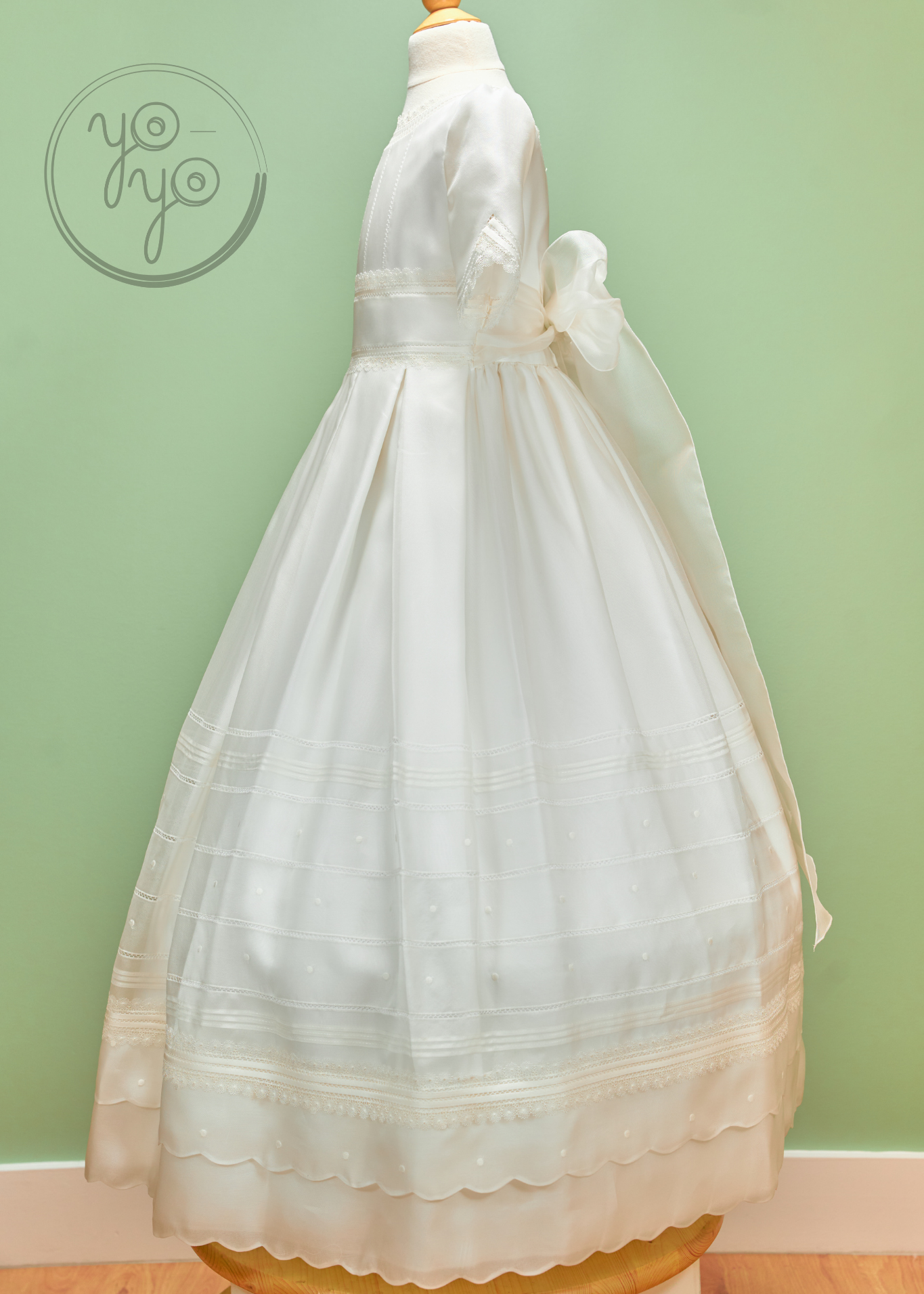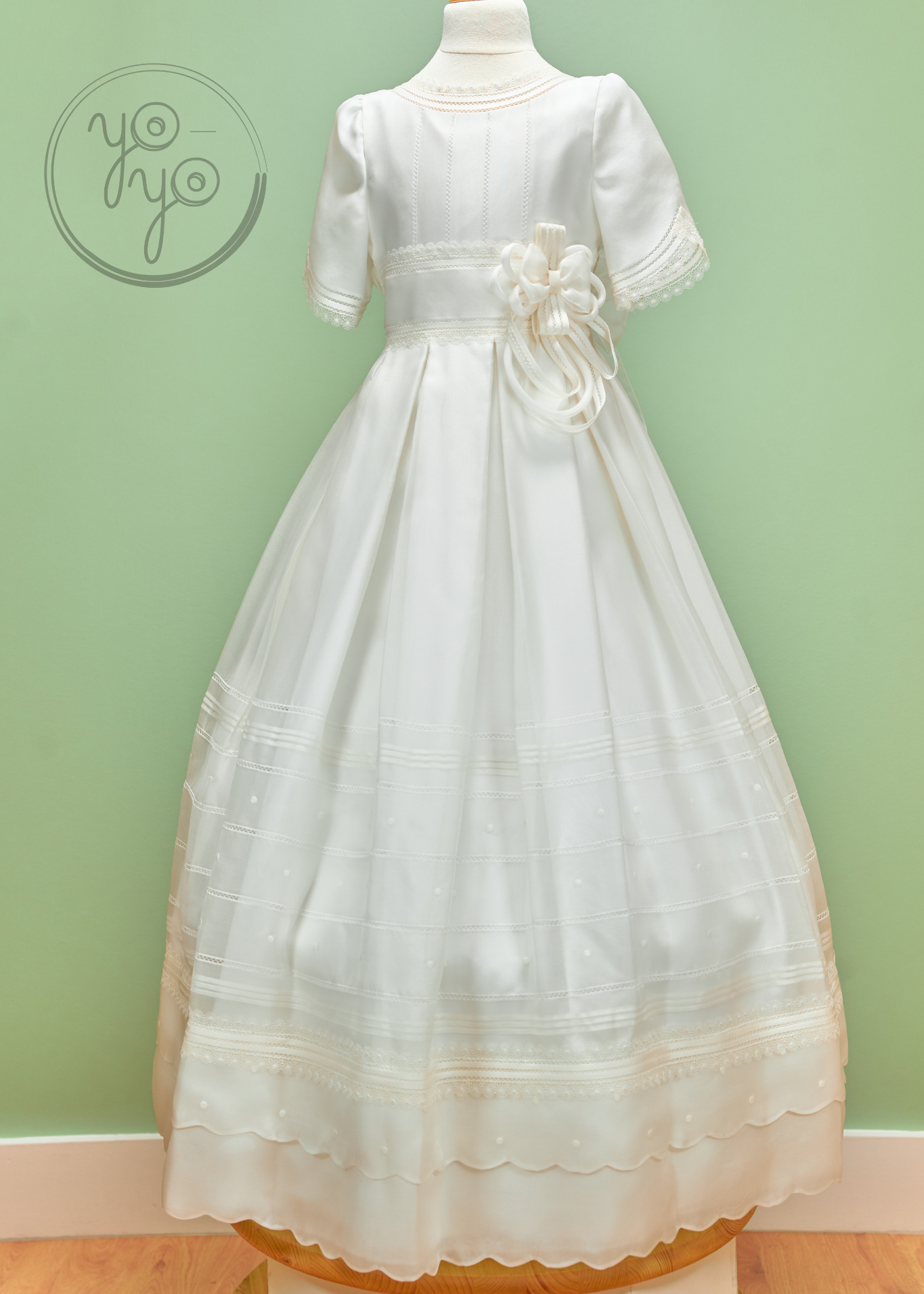 The Dalia First Communion Dress is an elegant and timeless gown, designed with refined details and exquisite craftsmanship. Made in luxurious off-white silk, this dress embodies sophistication and tradition.