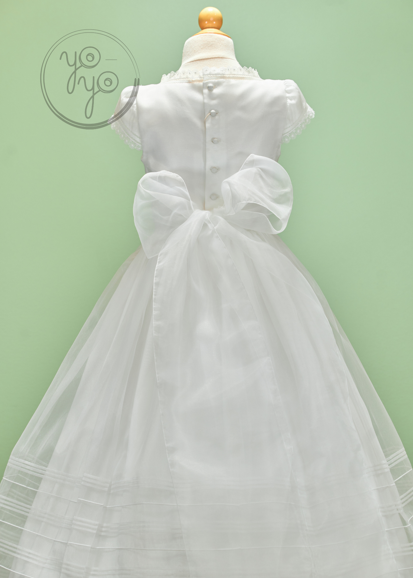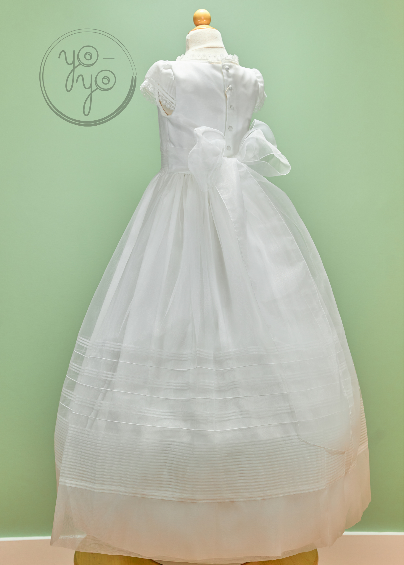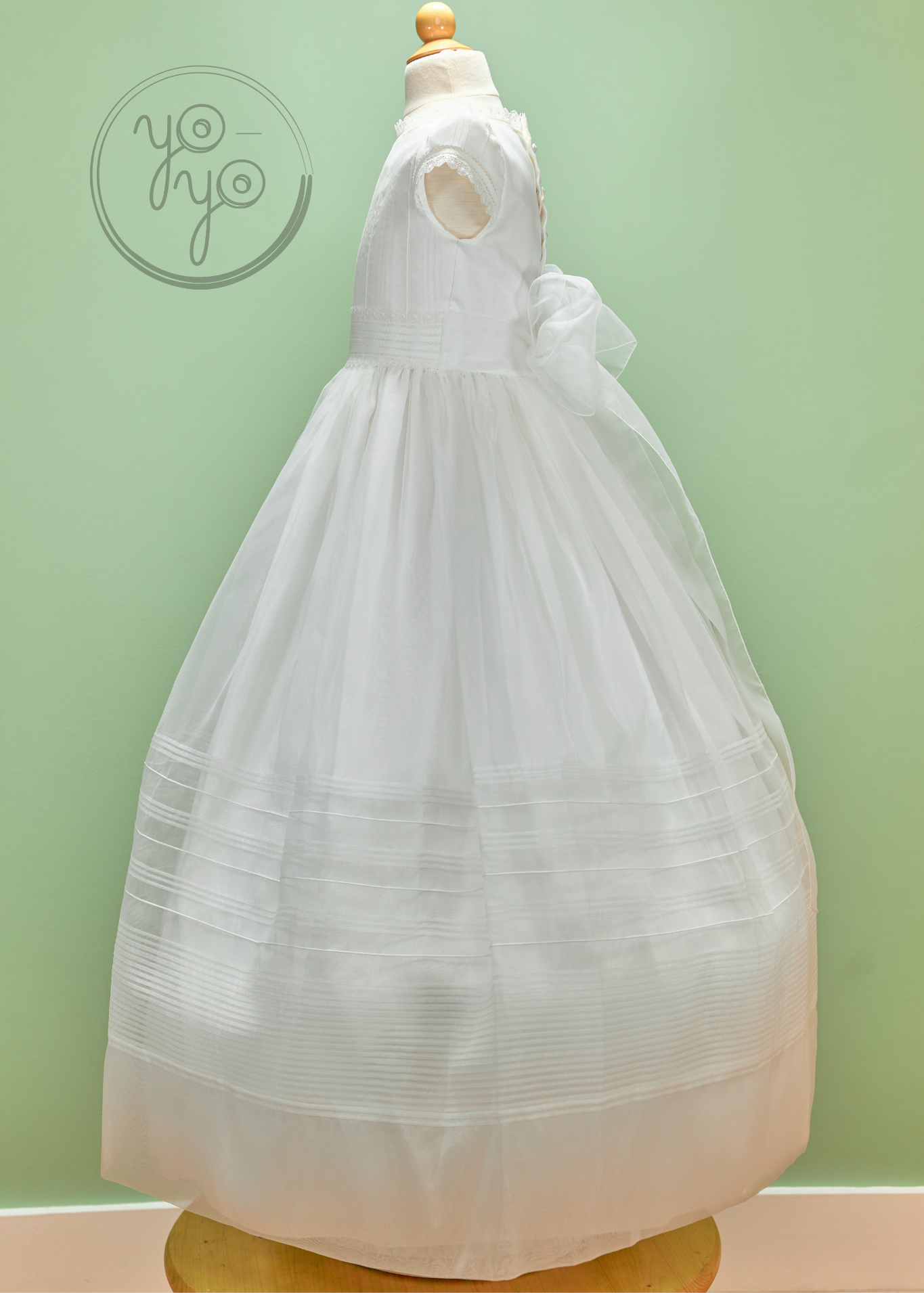 The Daphne First Communion Dress is a delicate and timeless gown designed for grace and simplicity. Crafted from natural white organza, it is lightweight and perfect for warm-weather celebrations.