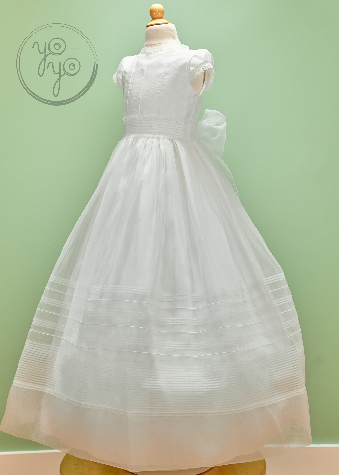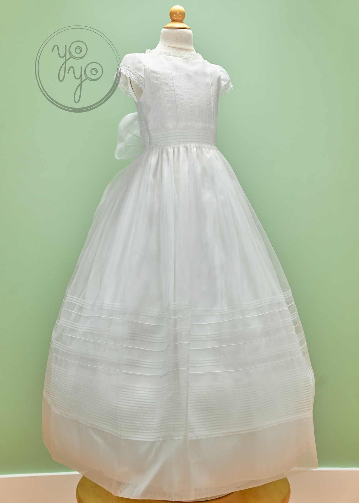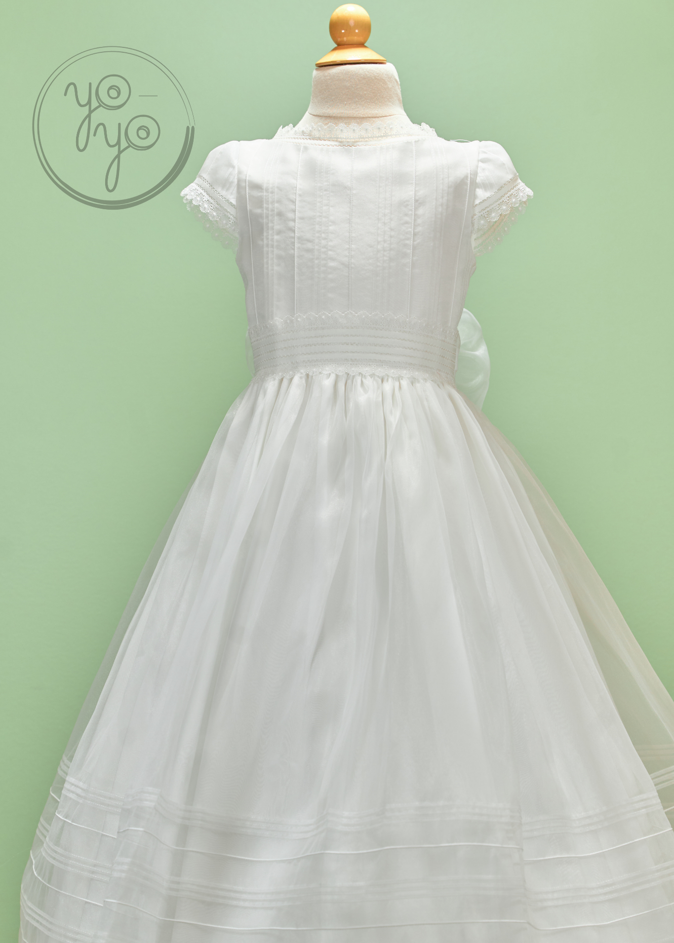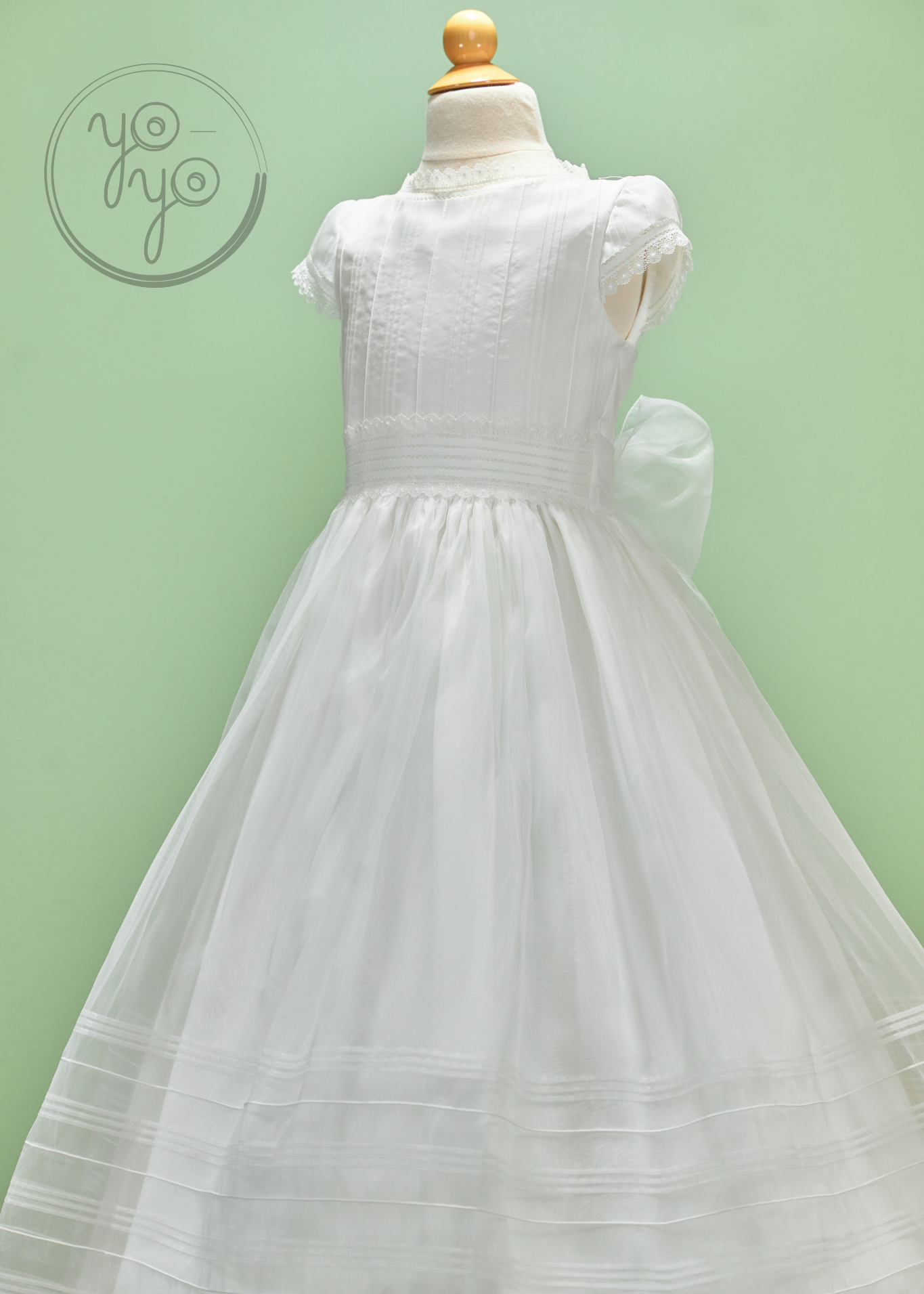 The Daphne First Communion Dress is a delicate and timeless gown designed for grace and simplicity. Crafted from natural white organza, it is lightweight and perfect for warm-weather celebrations.