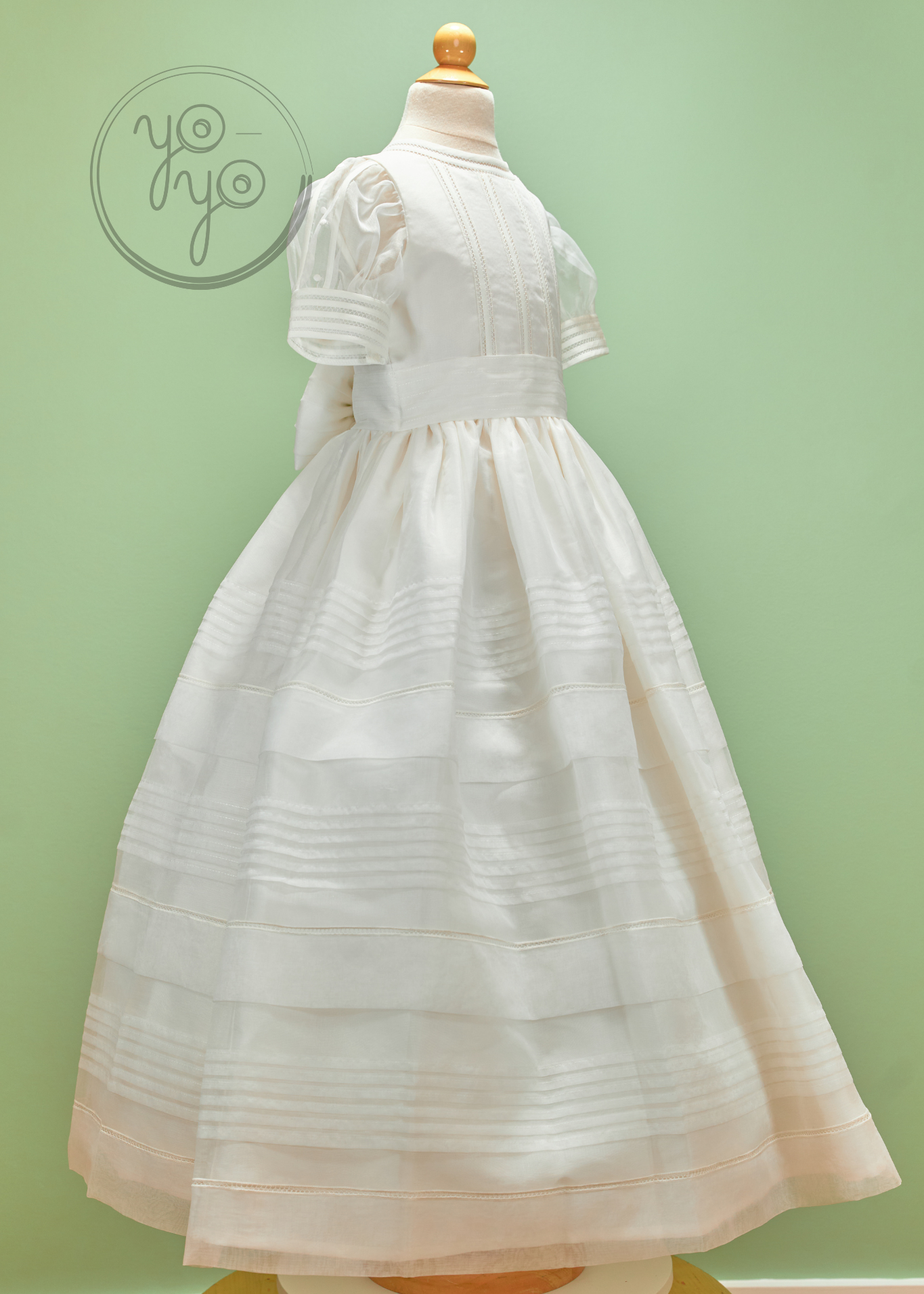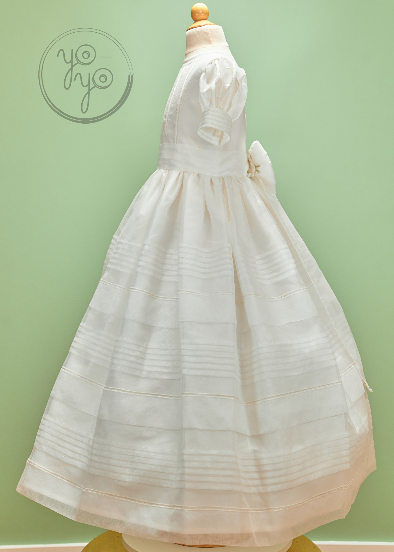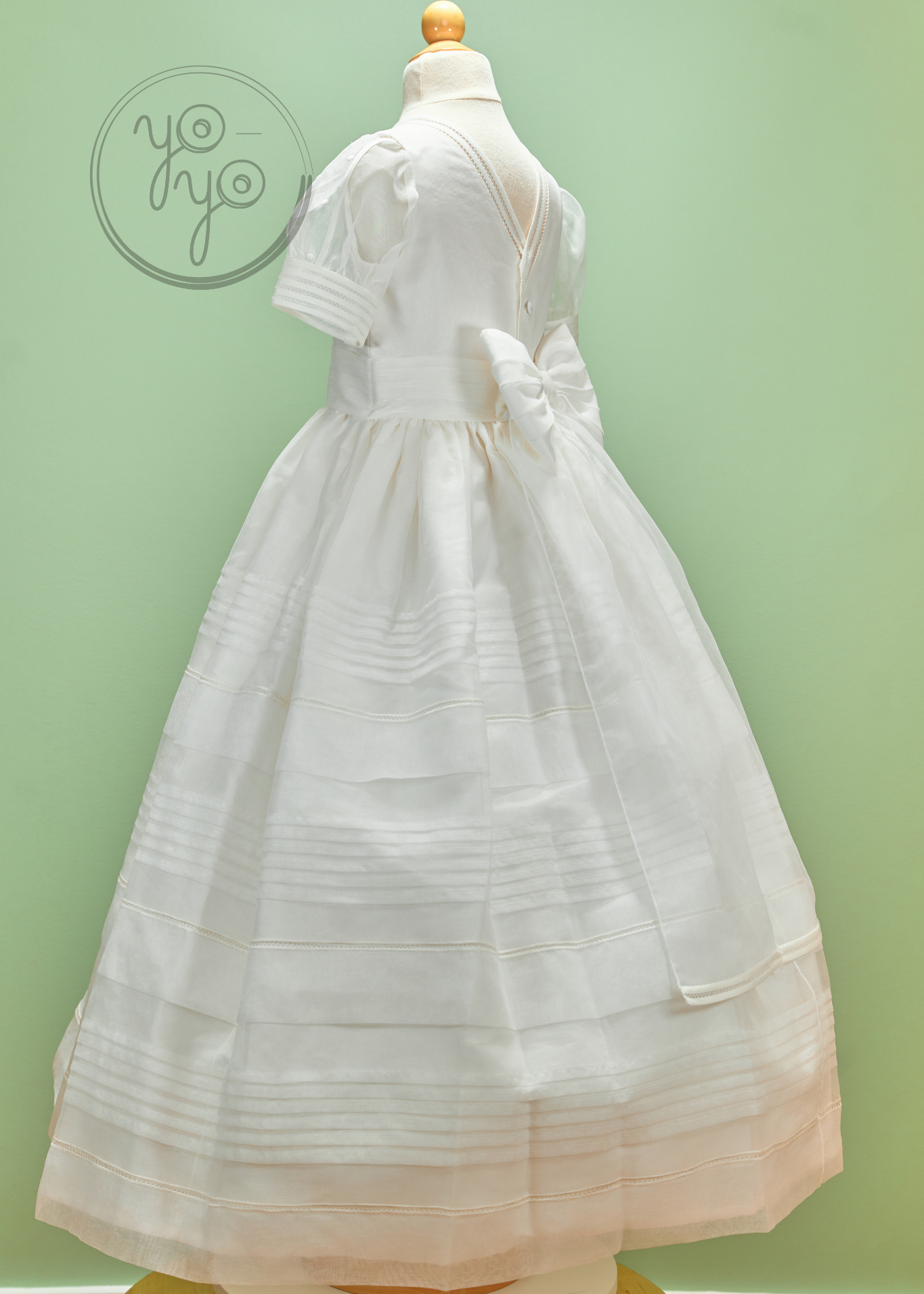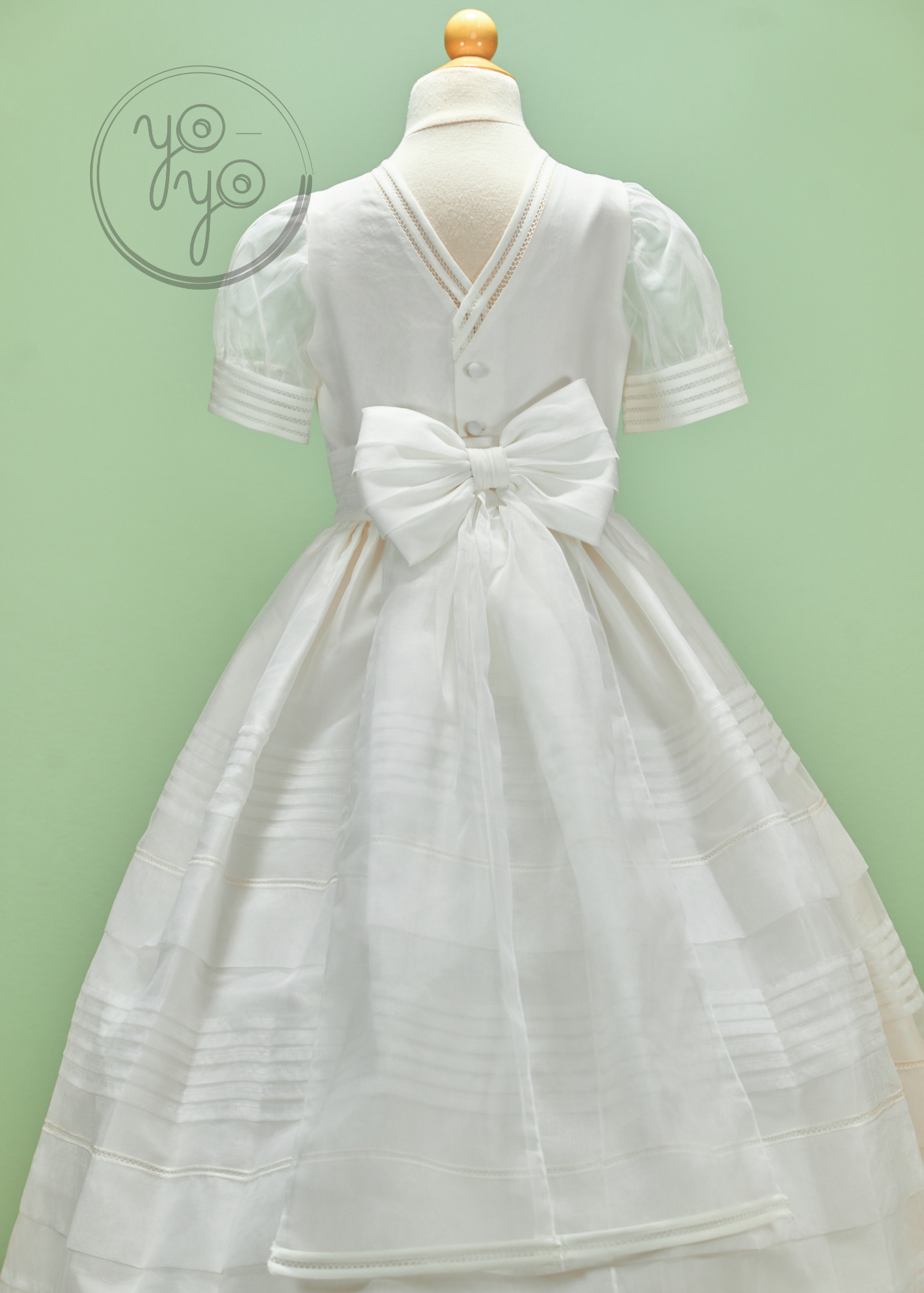 The Ella First Communion Dress is a masterpiece of Spanish craftsmanship from our Deluxe Collection, designed with exquisite detail and heirloom quality. Made in luxurious off-white silk organdy, it combines traditional elegance with artisanal refinement.