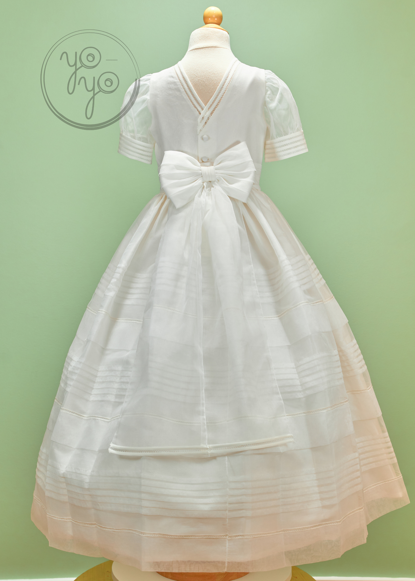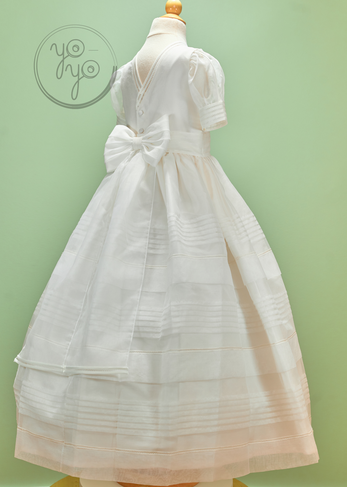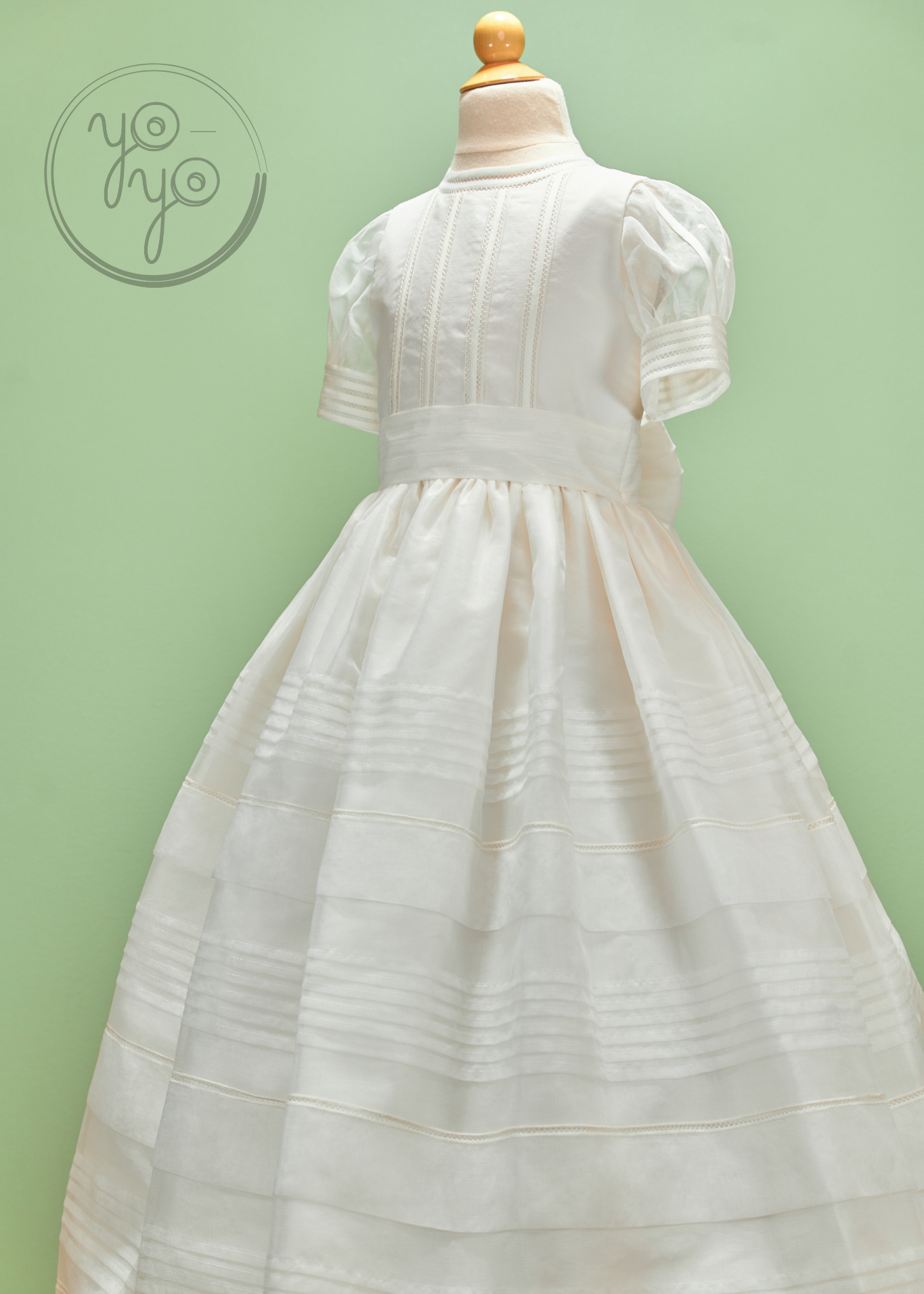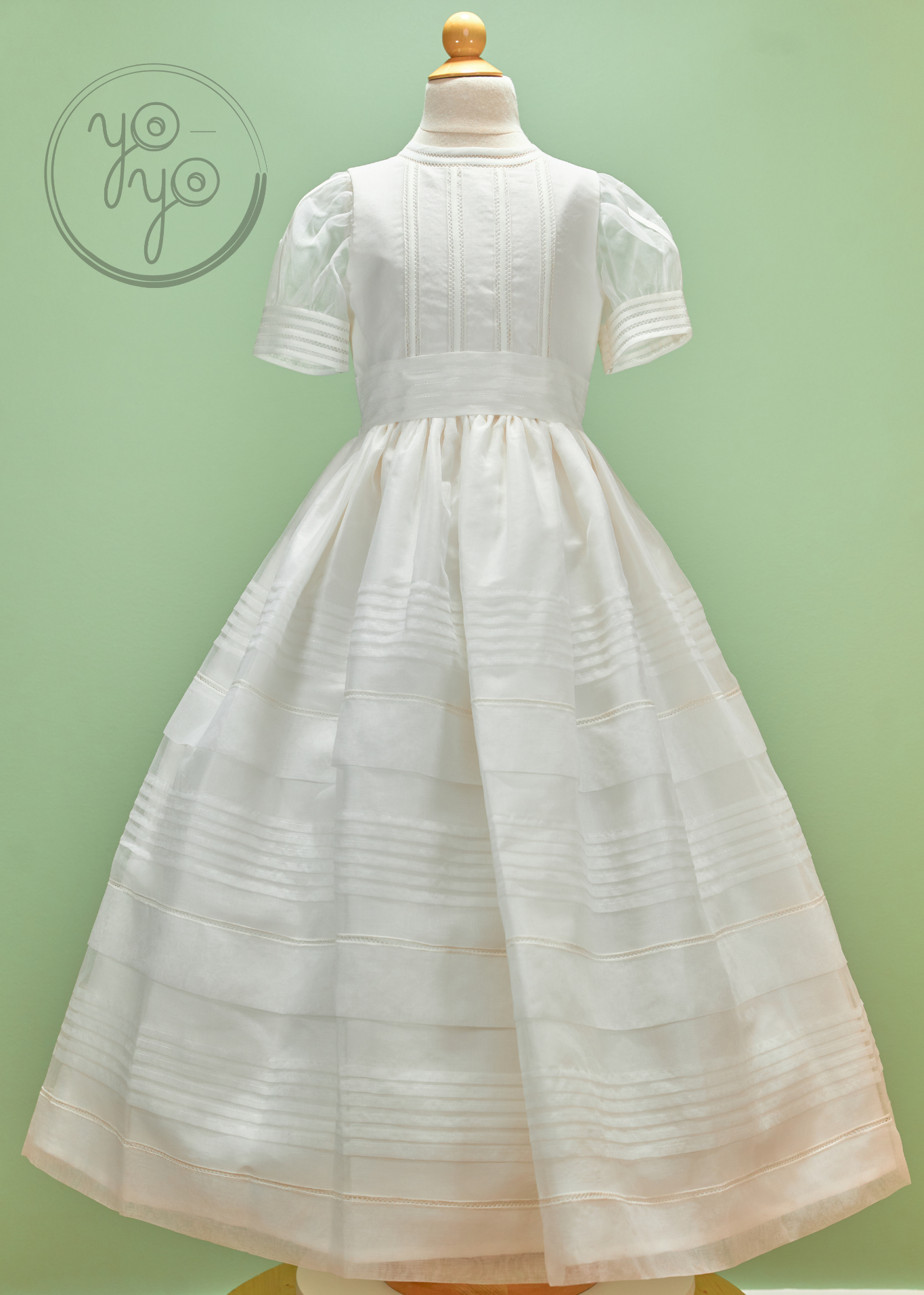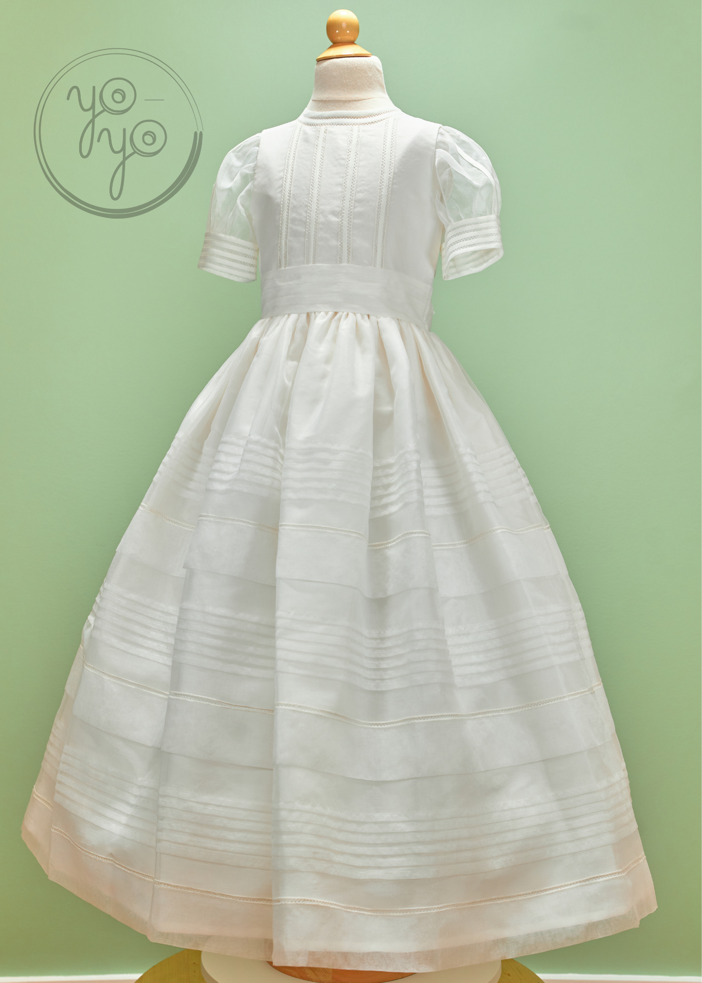 The Ella First Communion Dress is a masterpiece of Spanish craftsmanship from our Deluxe Collection, designed with exquisite detail and heirloom quality. Made in luxurious off-white silk organdy, it combines traditional elegance with artisanal refinement.