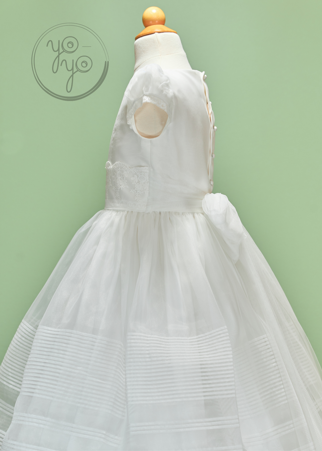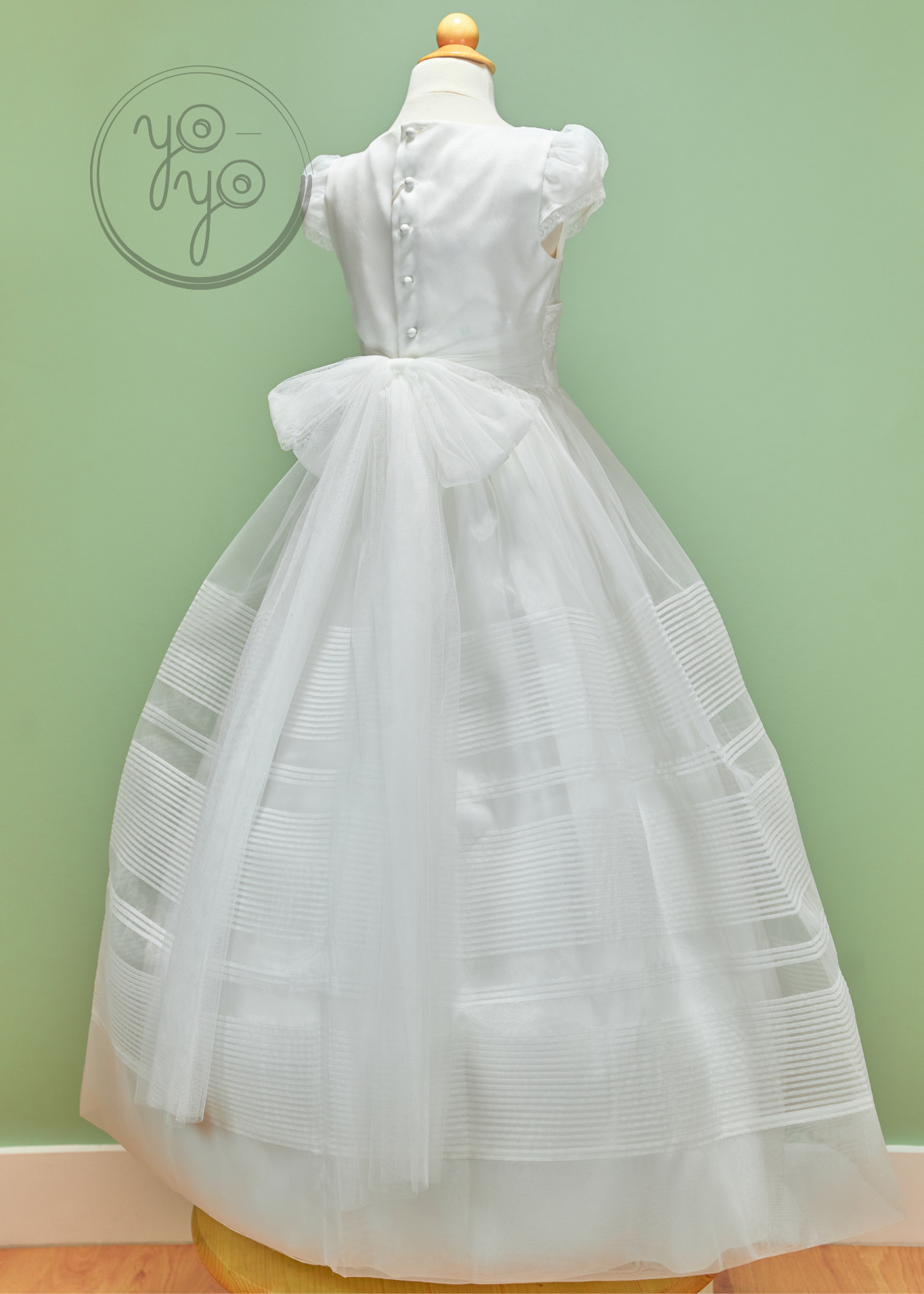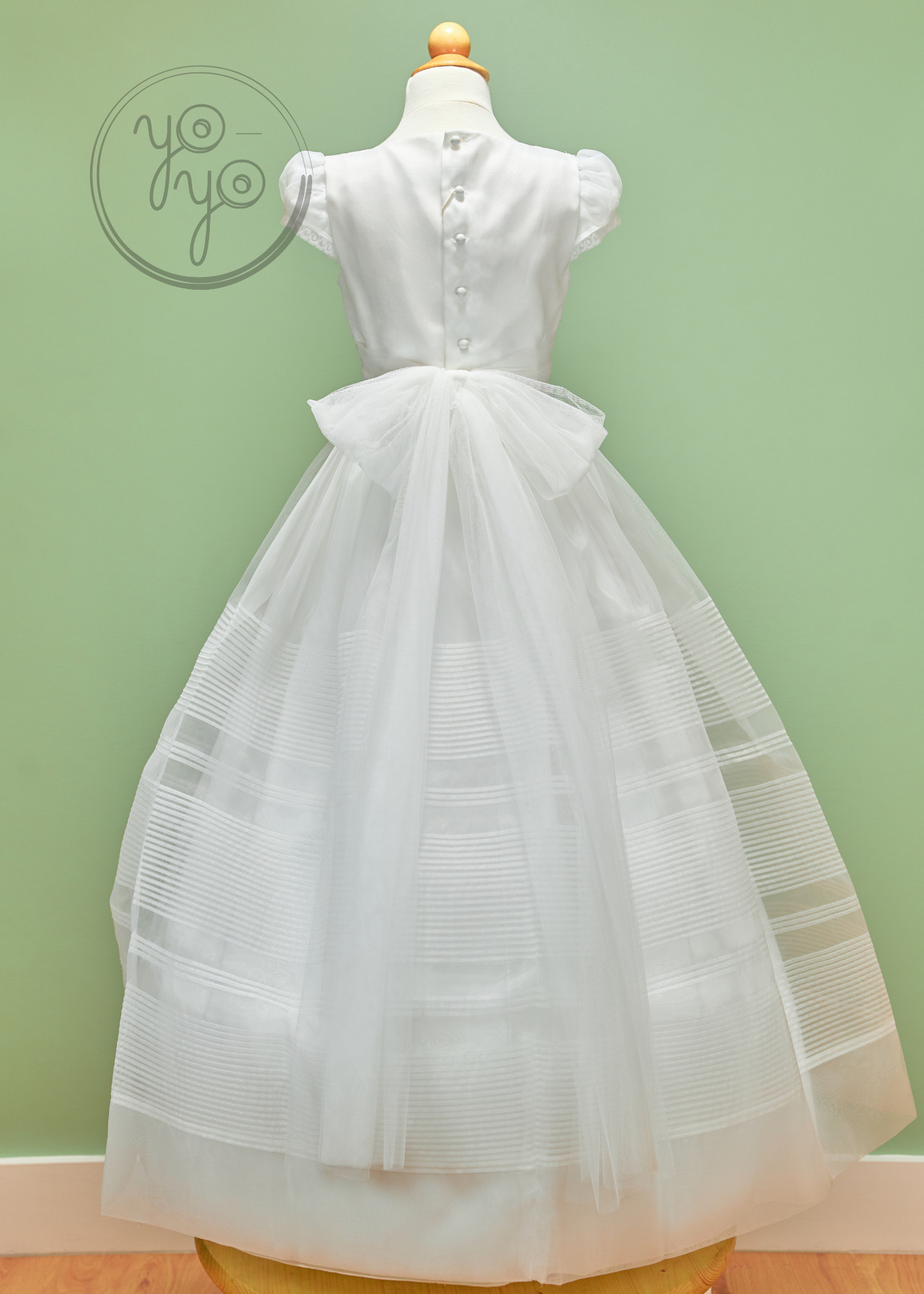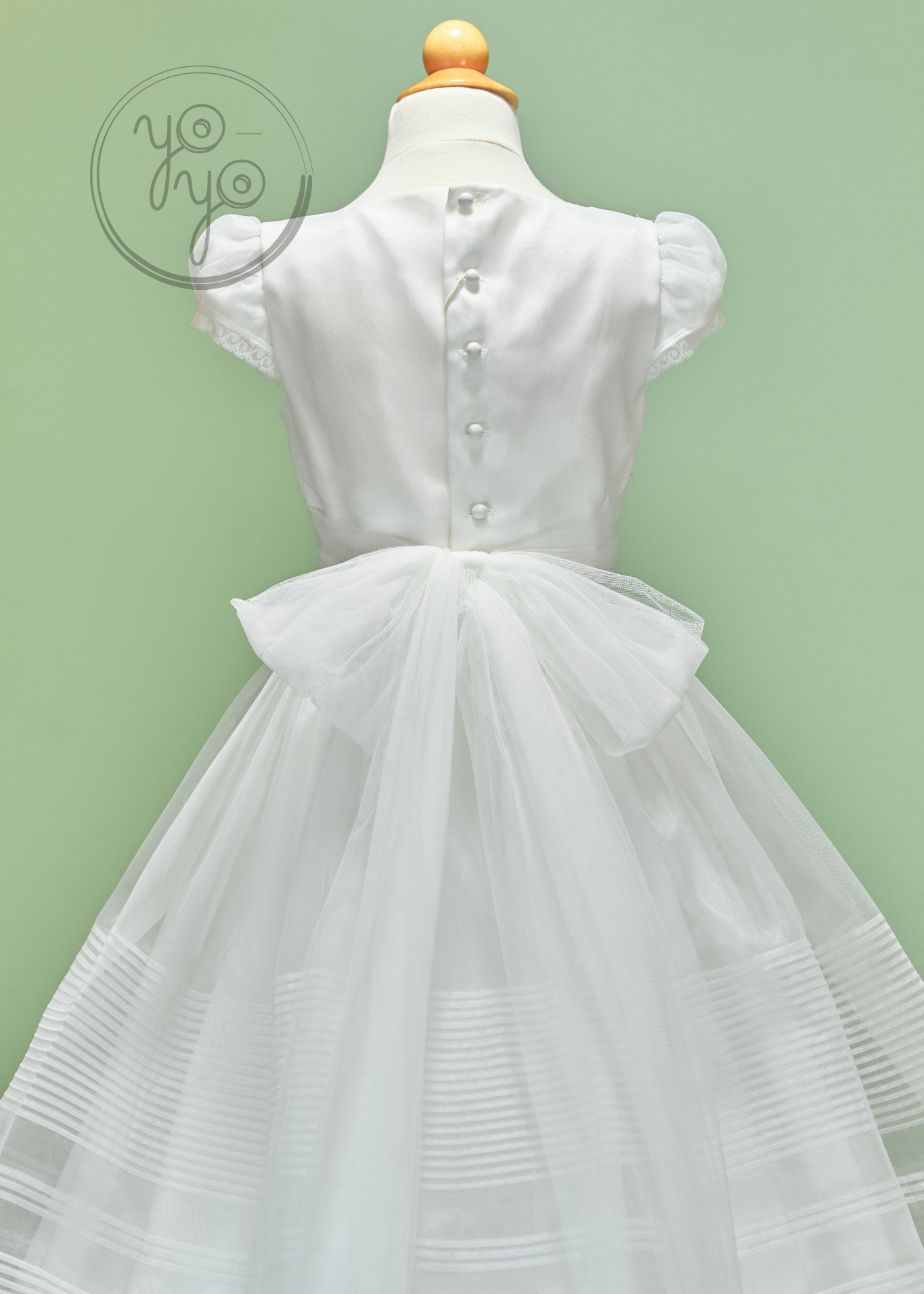 The back fastens with buttons and features tulle sashes that tie into a soft, draped bow, creating a graceful finish. Camelia is the perfect gown for girls who want a traditional yet delicate look on their First Communion day.