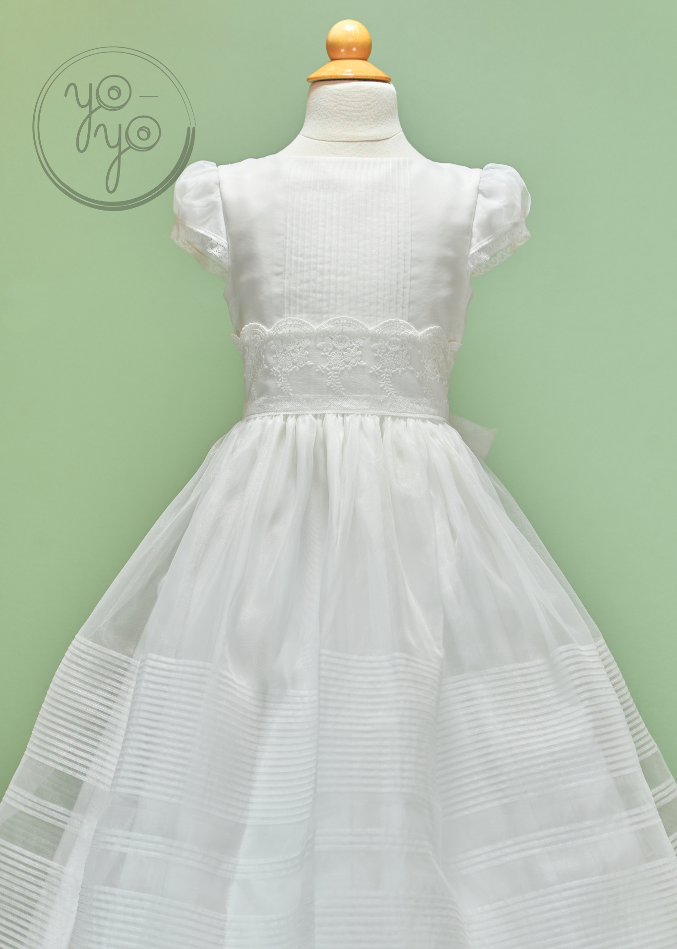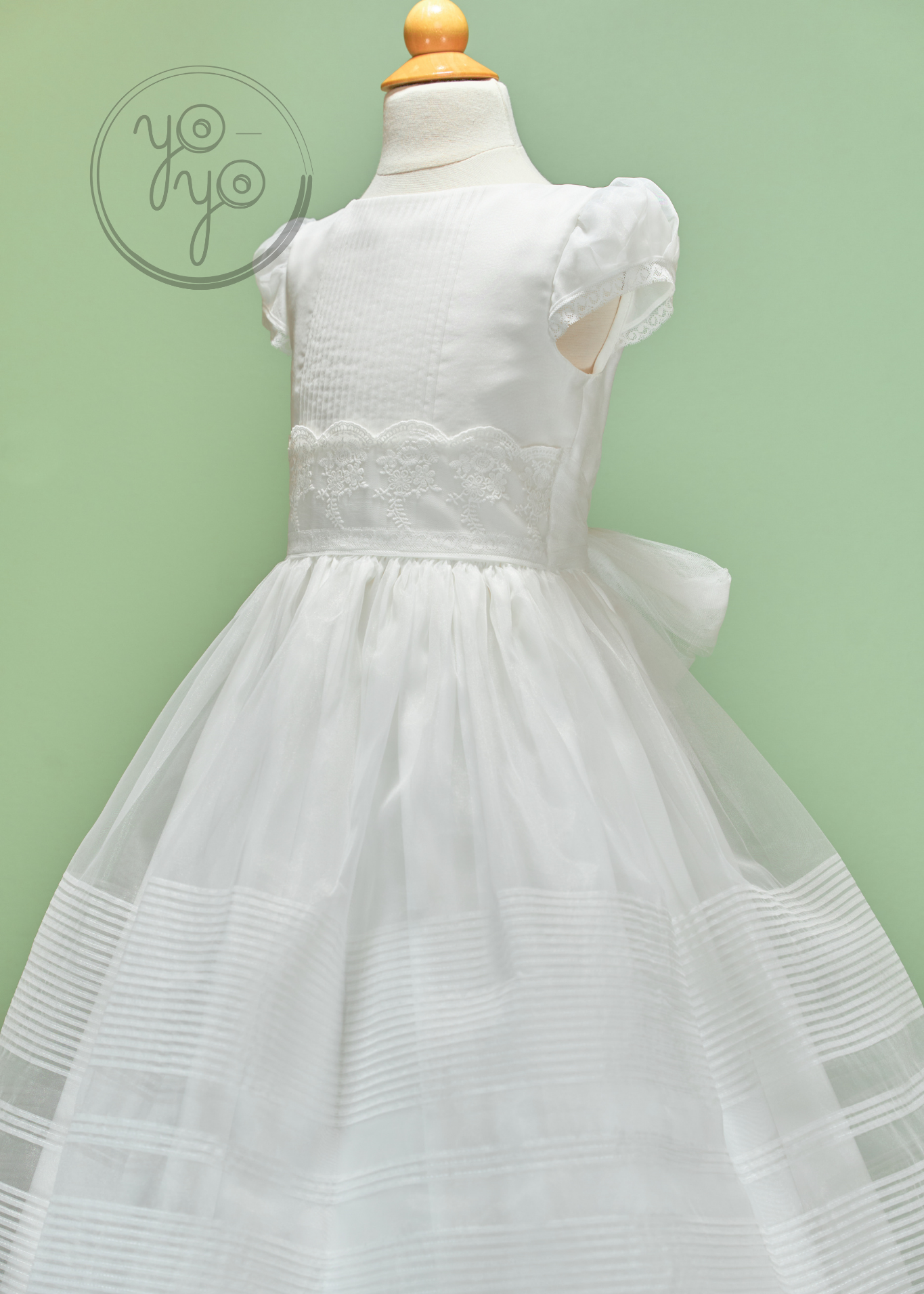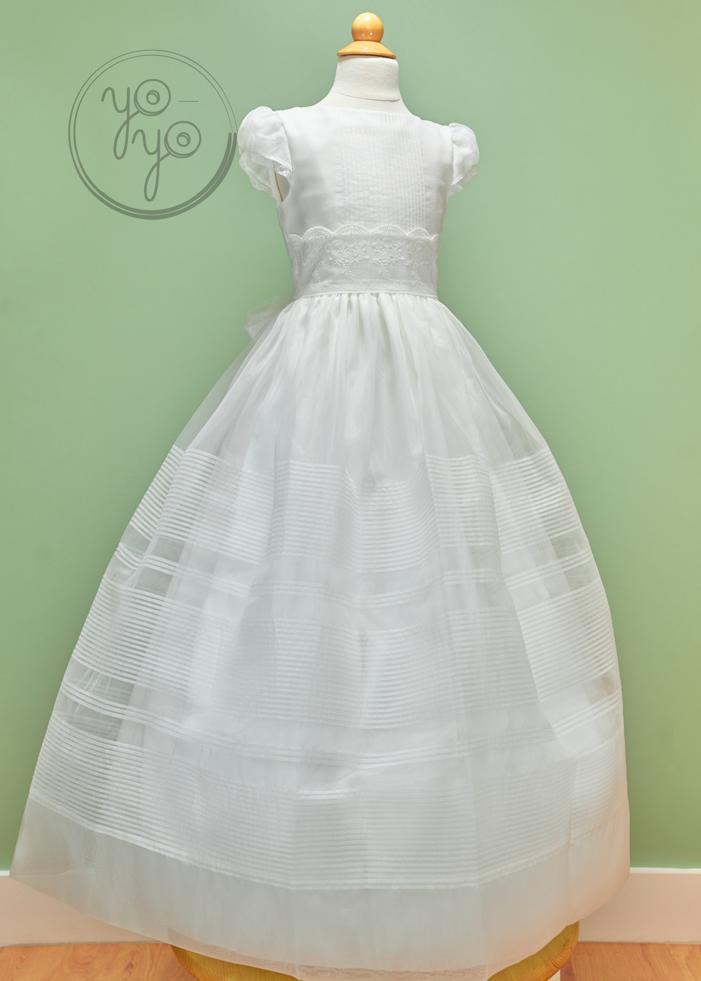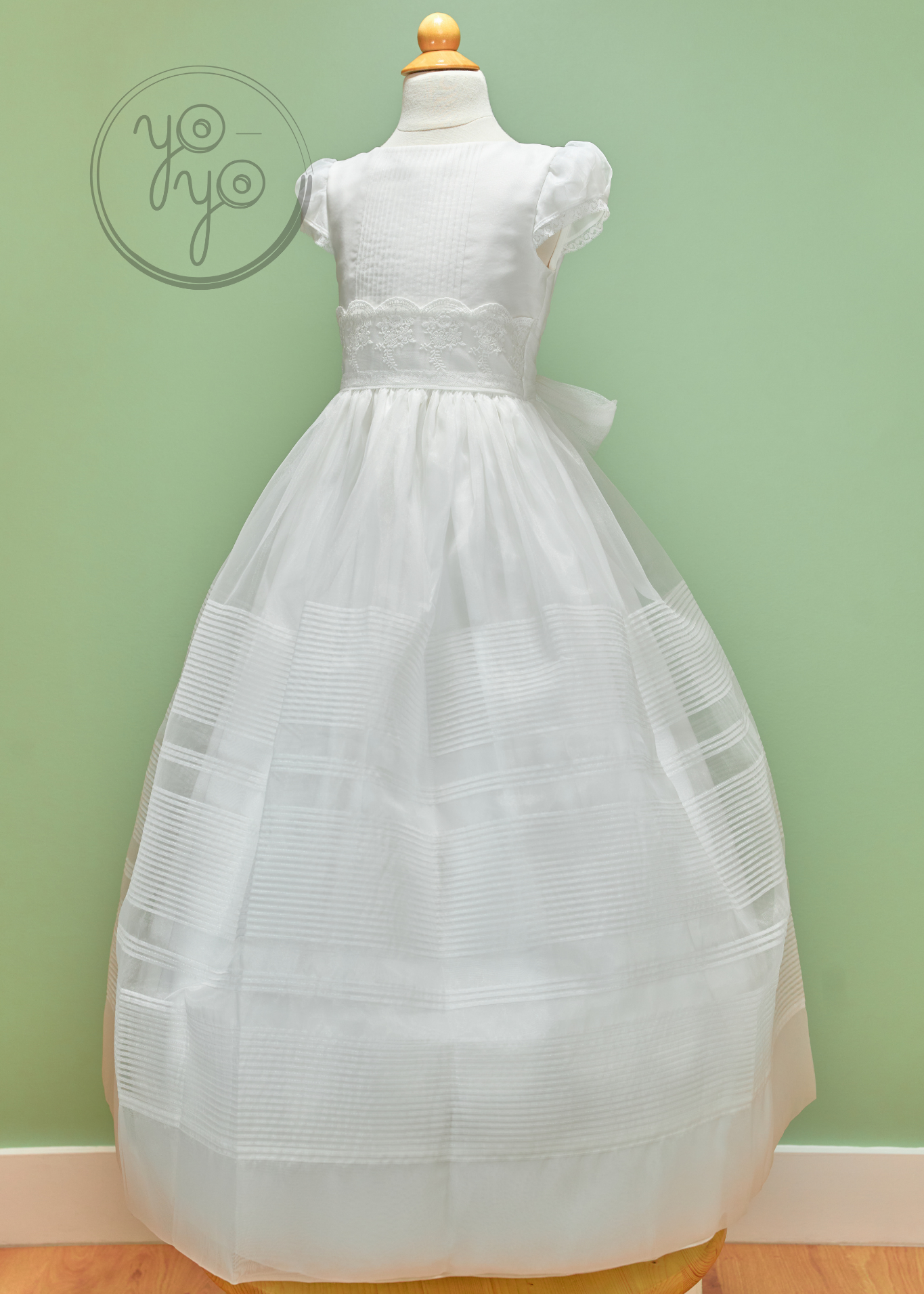 The Camelia First Communion Dress is a dainty and traditional design made with lightweight off-white organza and delicate lace. Pleats flow gracefully across the bodice and skirt, giving the dress an elegant structure.