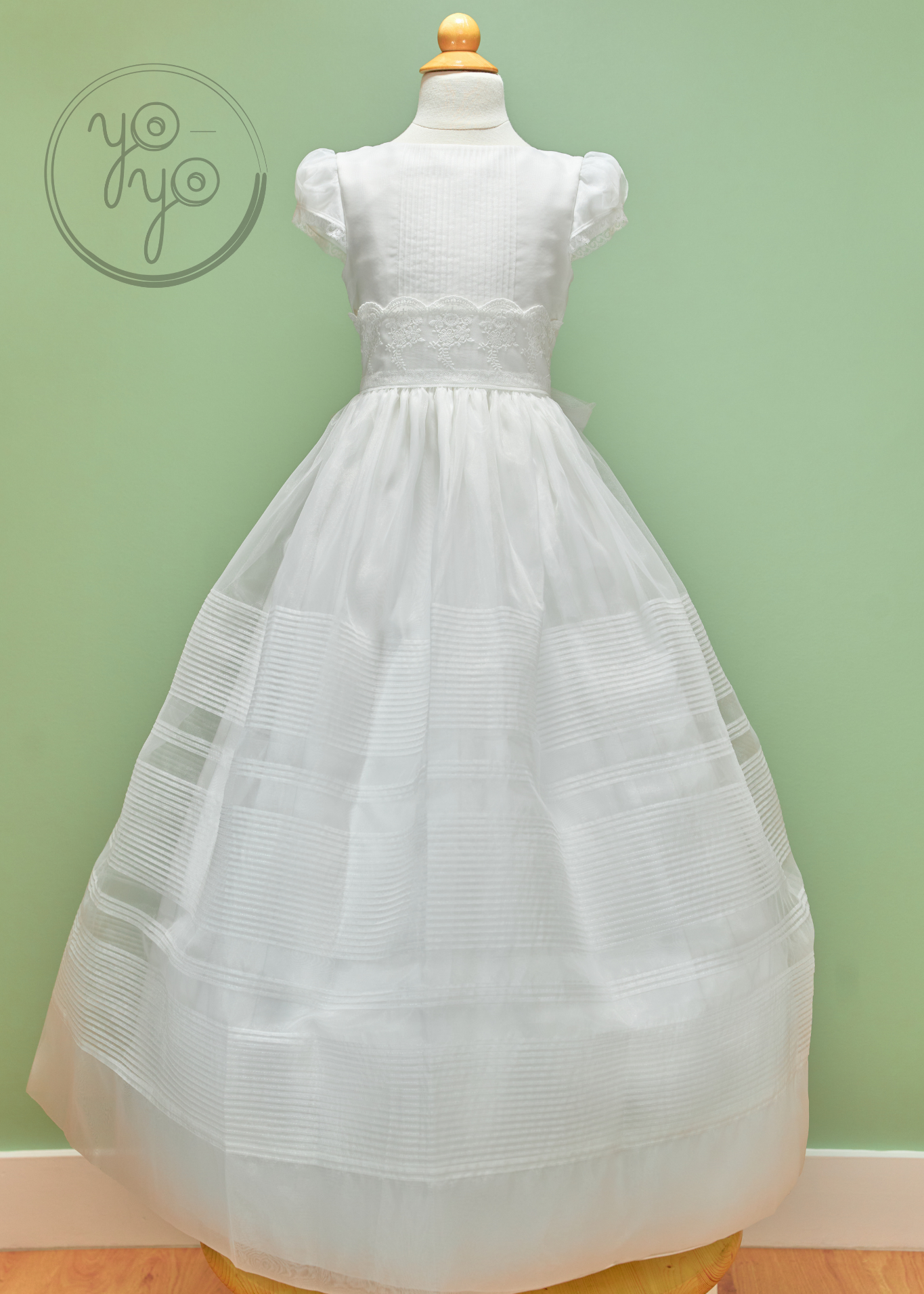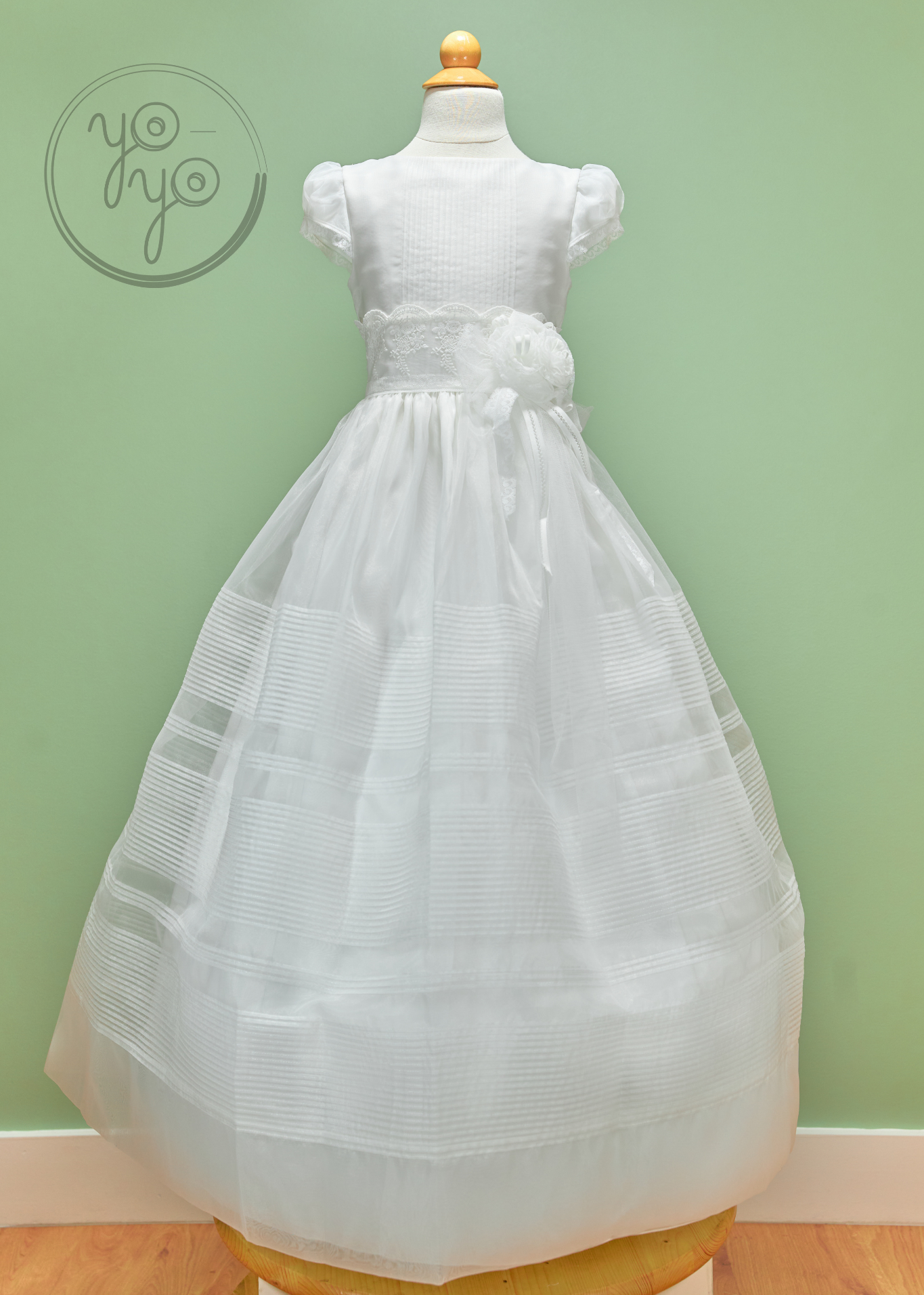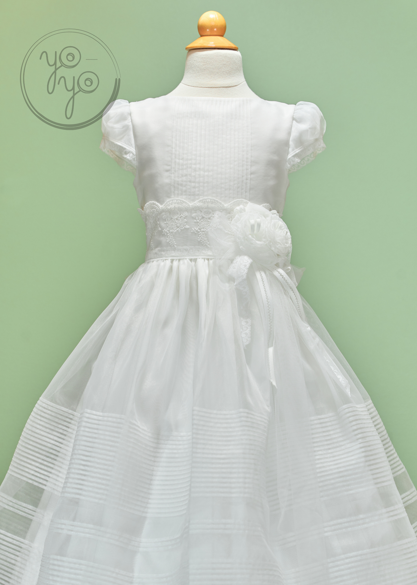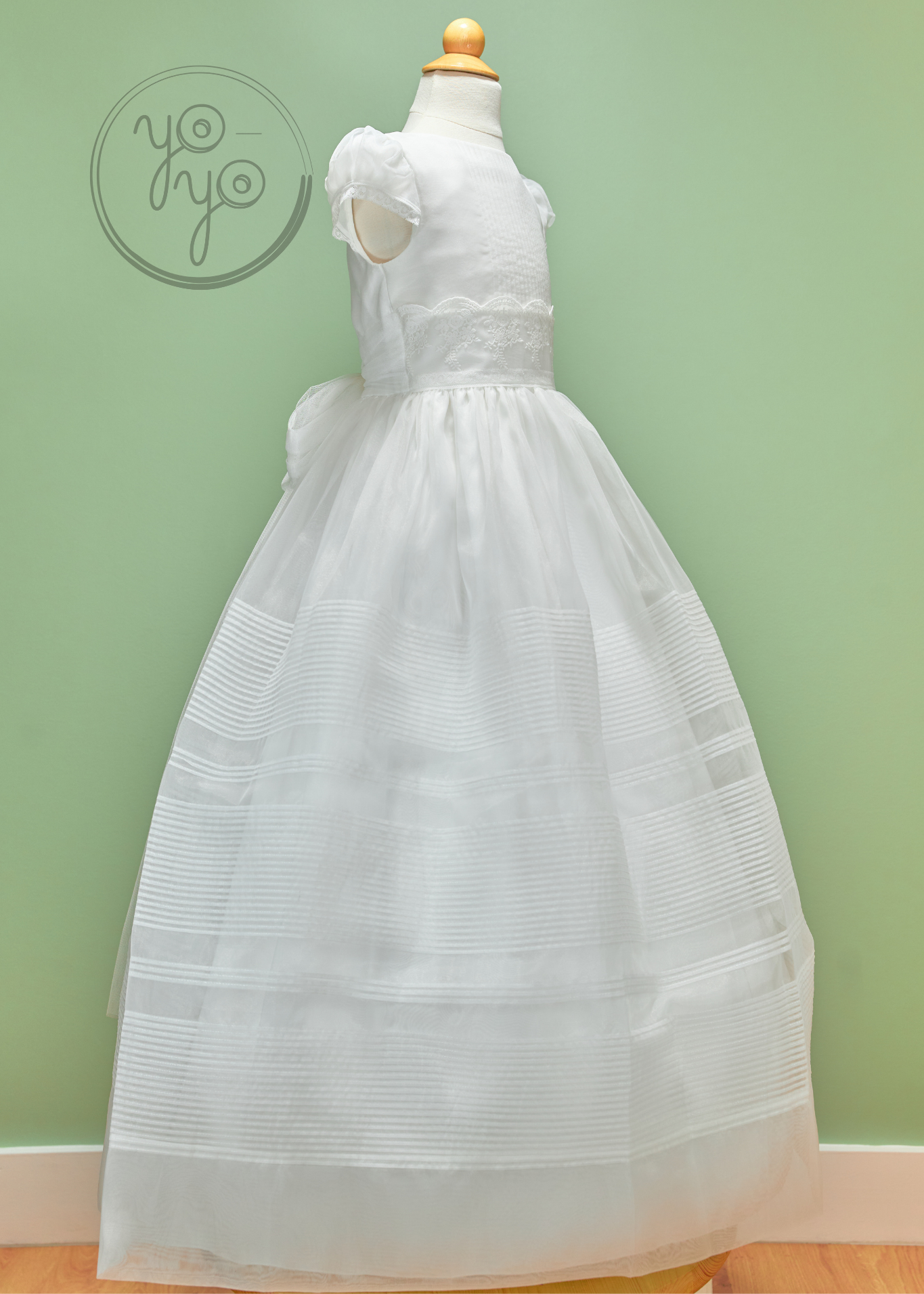 The Camelia First Communion Dress is a dainty and traditional design made with lightweight off-white organza and delicate lace. Pleats flow gracefully across the bodice and skirt, giving the dress an elegant structure.