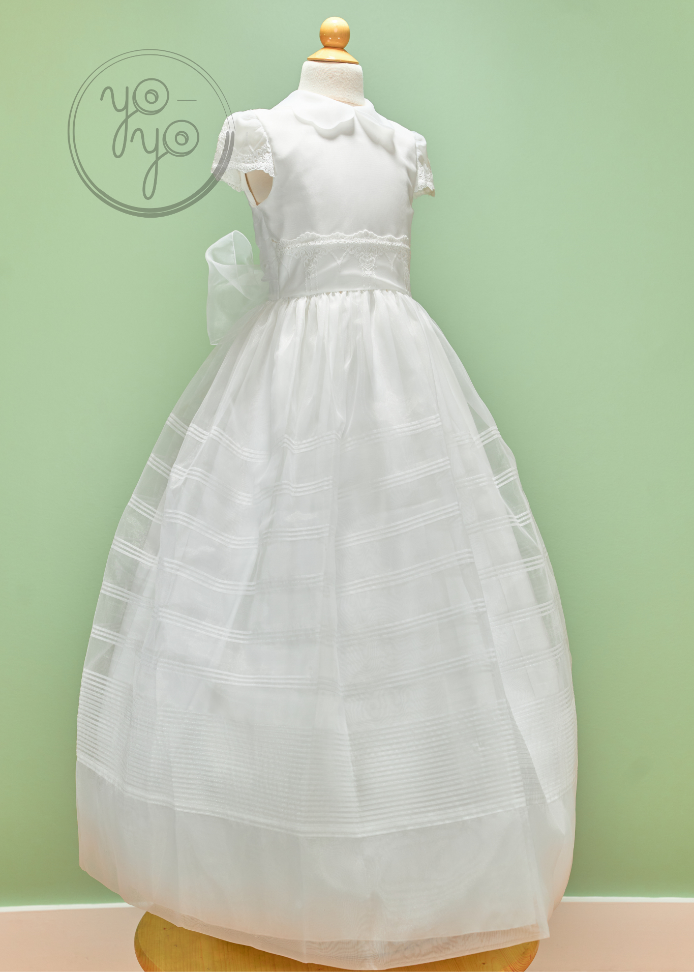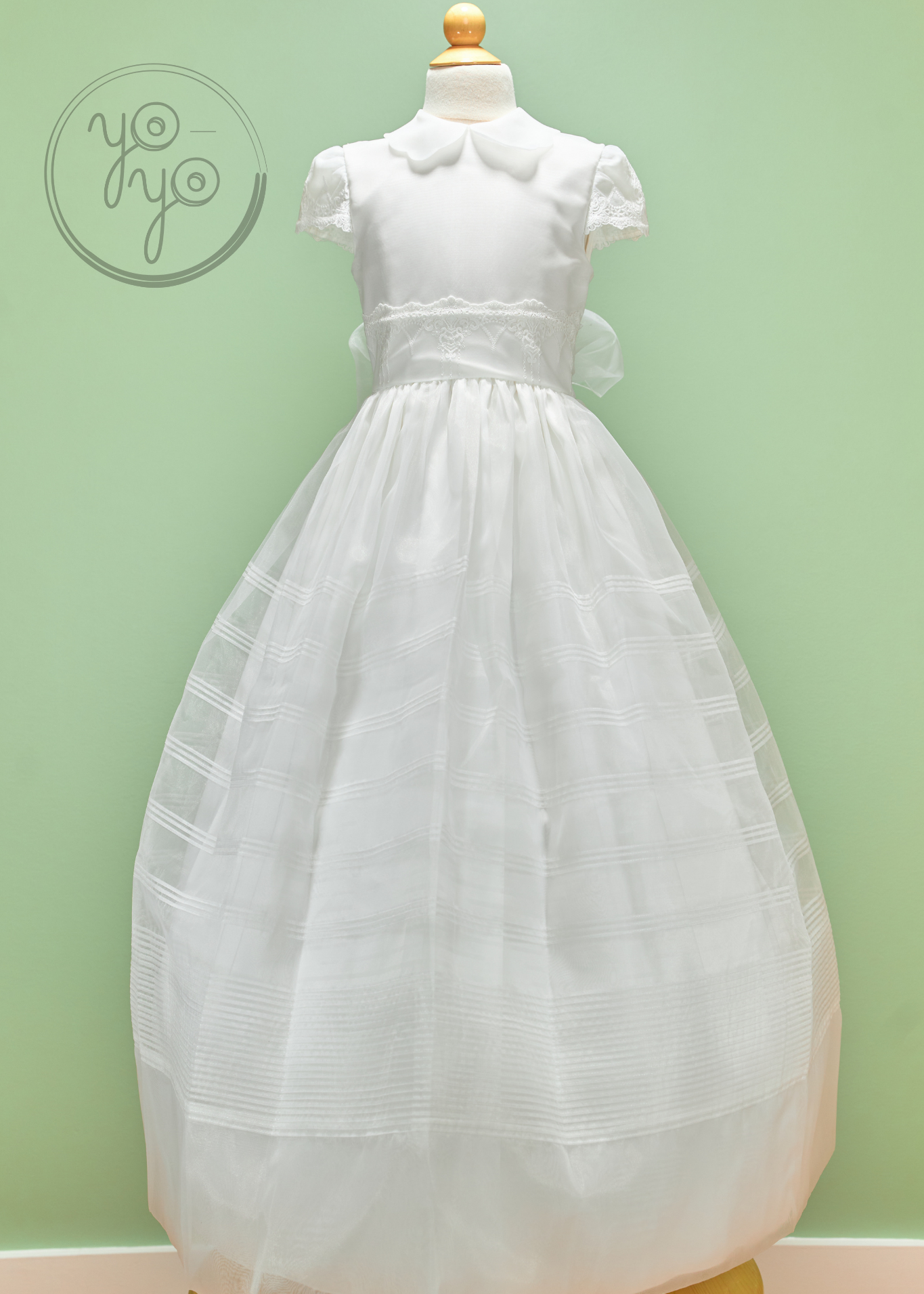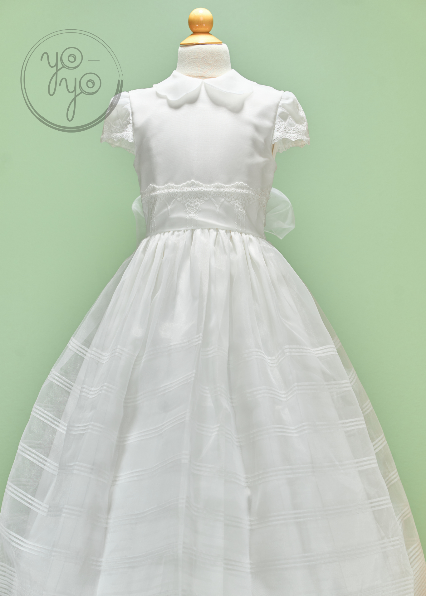 This dress features a delicate scalloped Peter Pan collar and intricate lace details across the bodice for a graceful touch. The skirt flows in structured pleats, creating a sophisticated silhouette. At the back, organza ties form a charming bow, and covered buttons complete the design with a refined finish.
