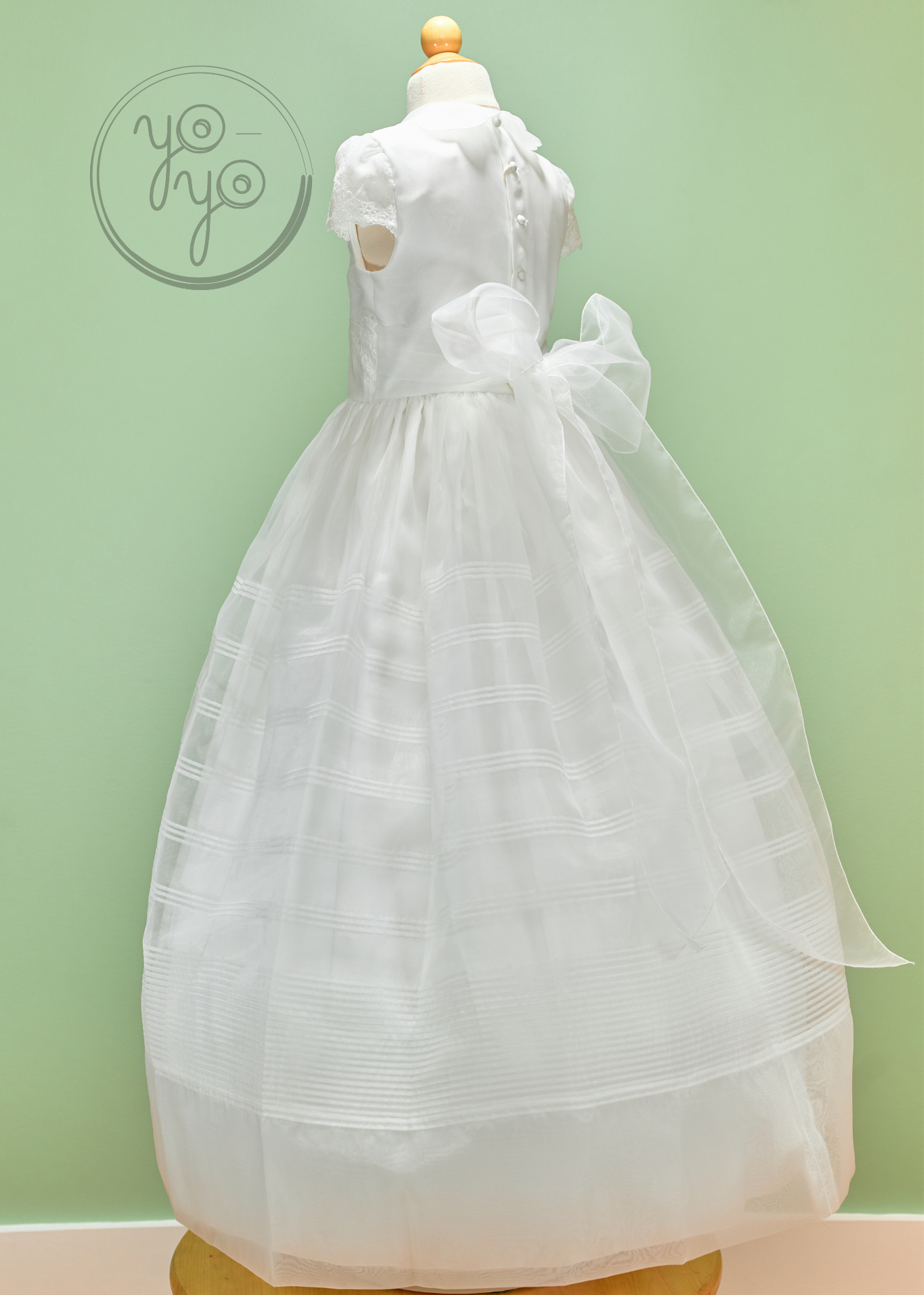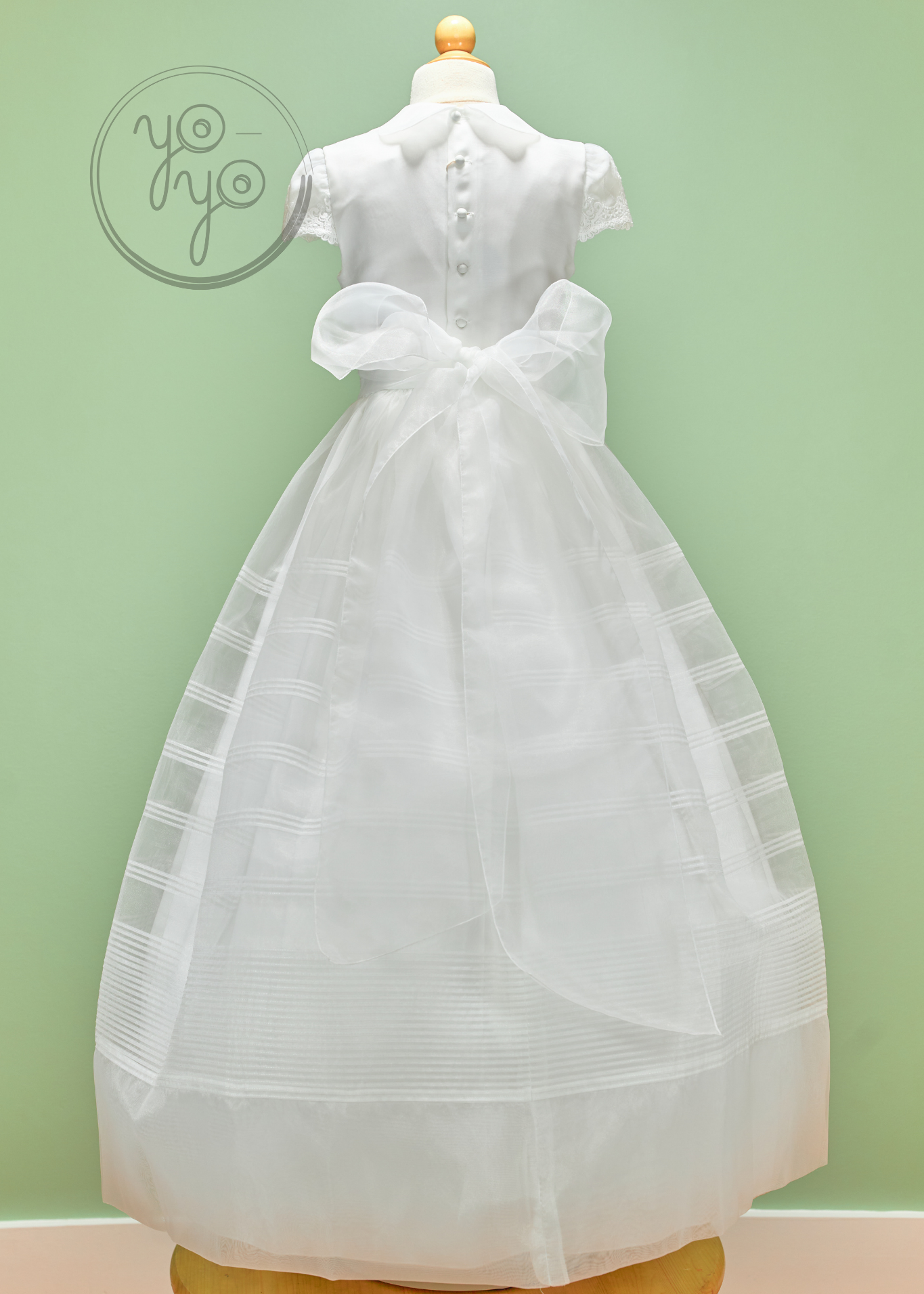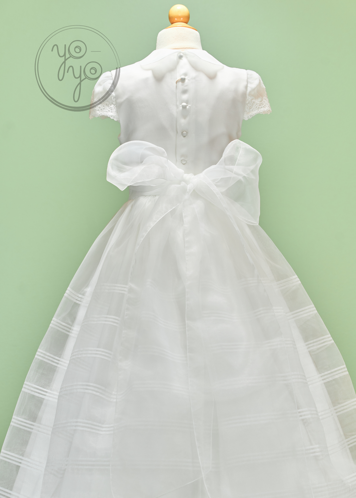 • Back: Covered buttons with organza bow ties