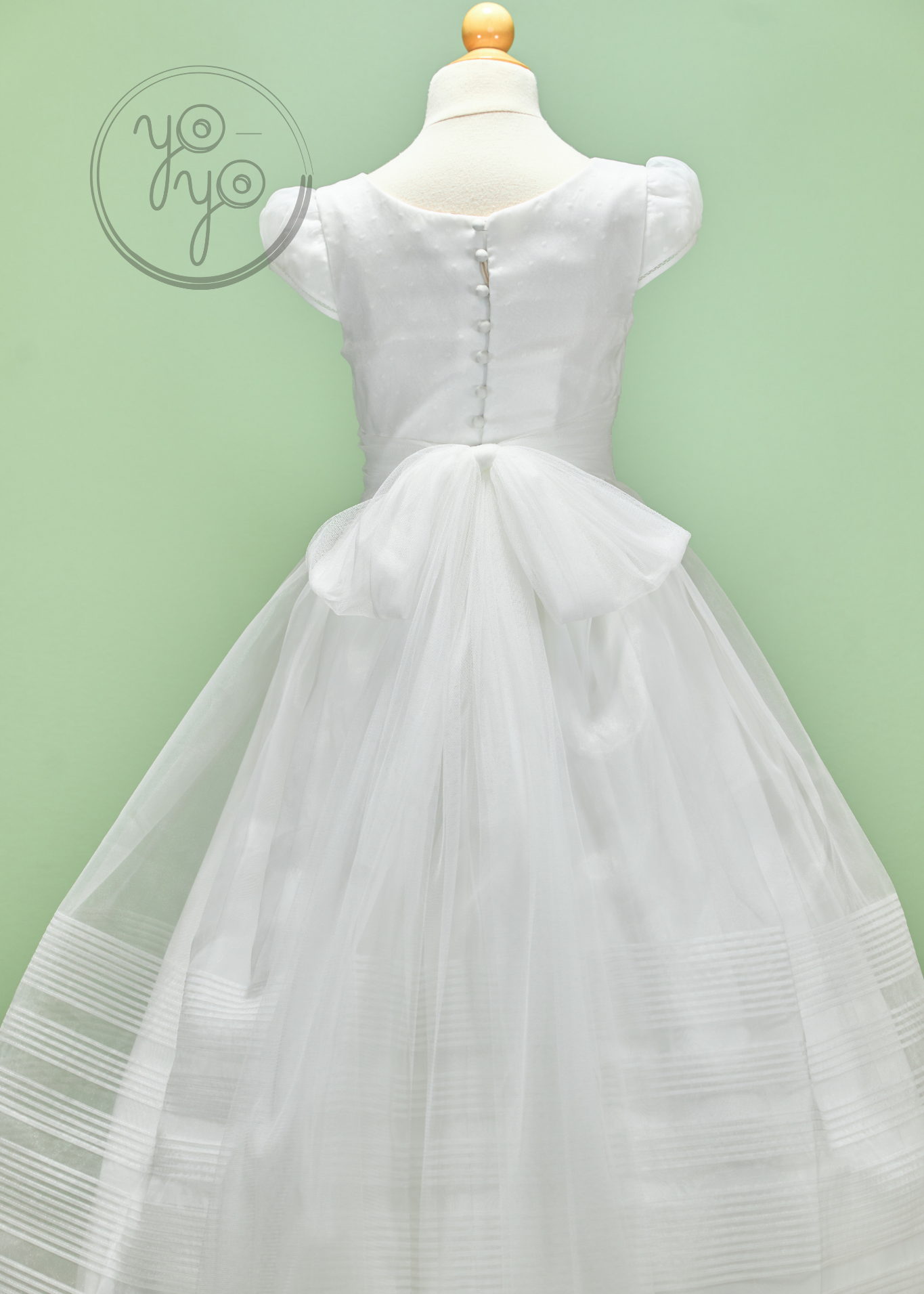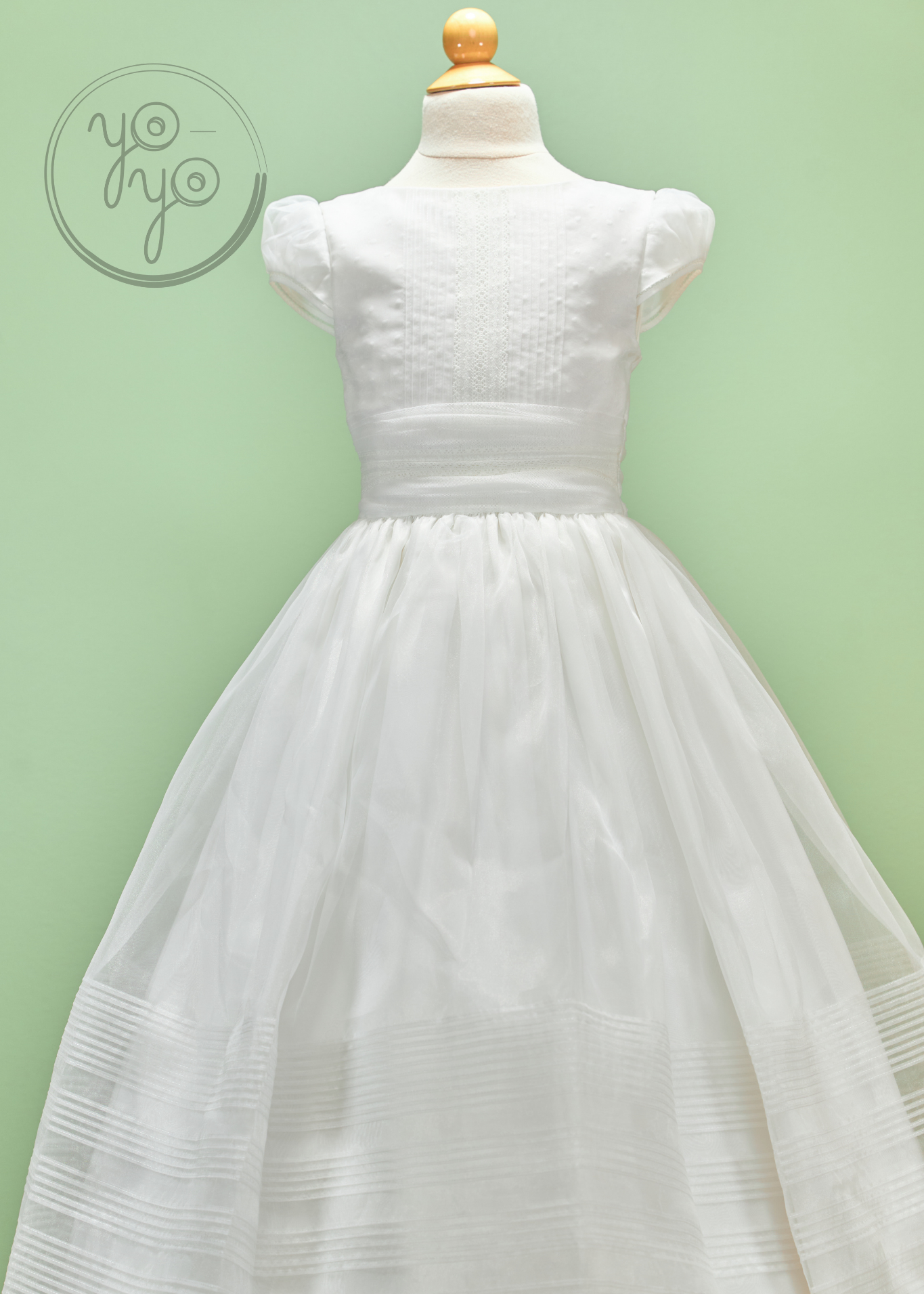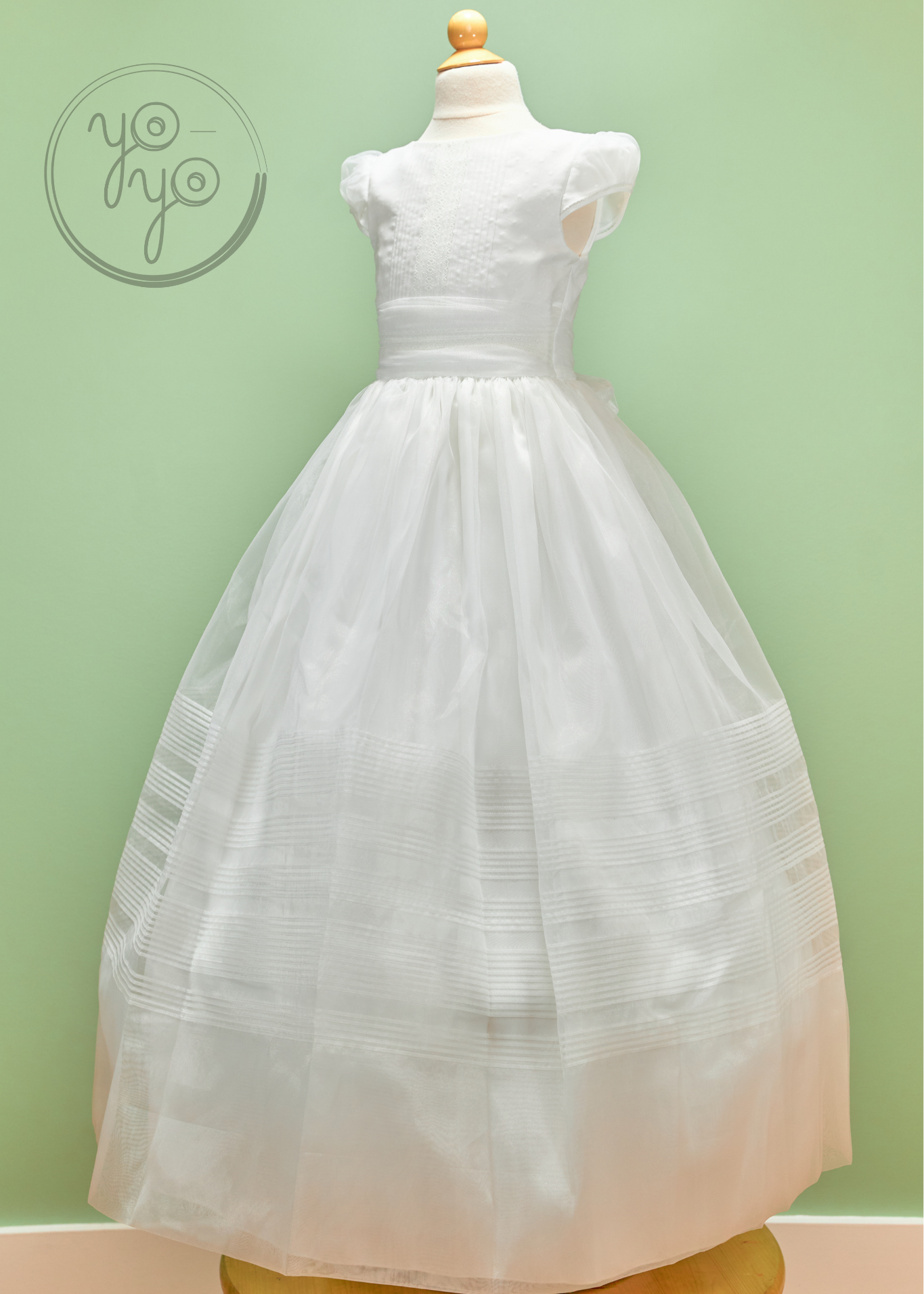 The Girasol First Communion Dress is an adorable gown filled with dainty and traditional details. Made in lightweight off-white organza, it has a graceful, airy design perfect for a meaningful celebration.