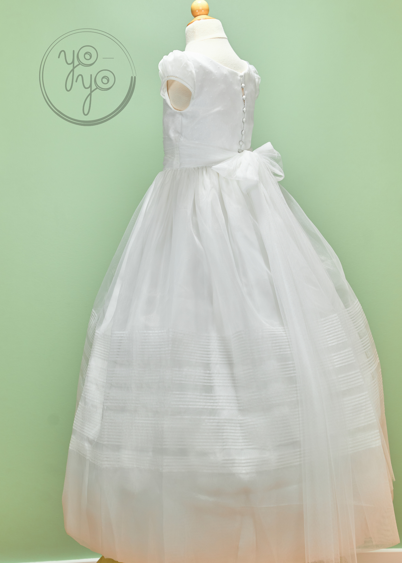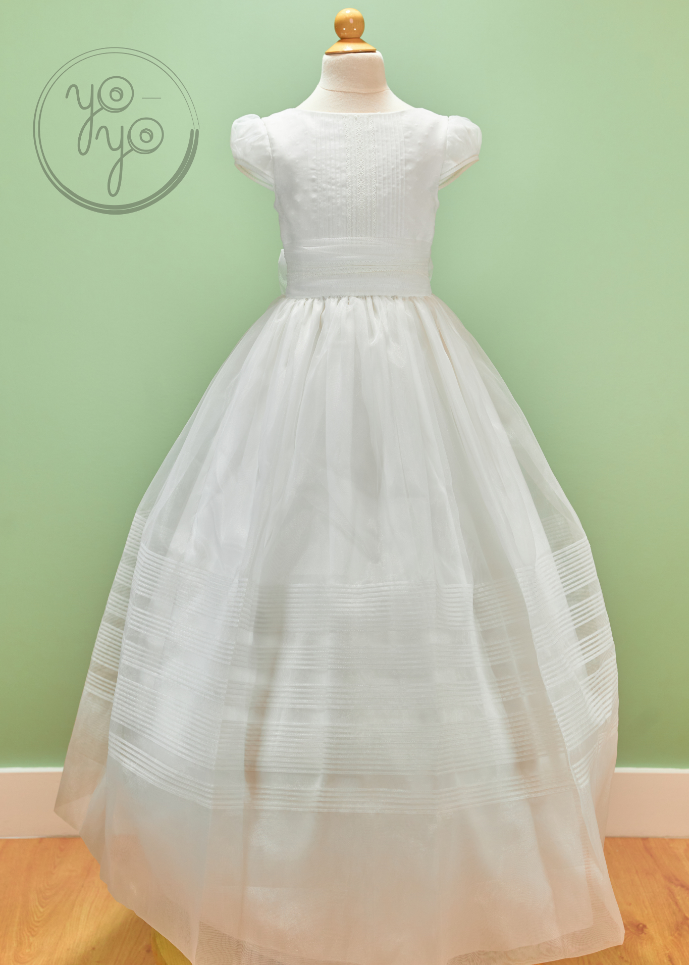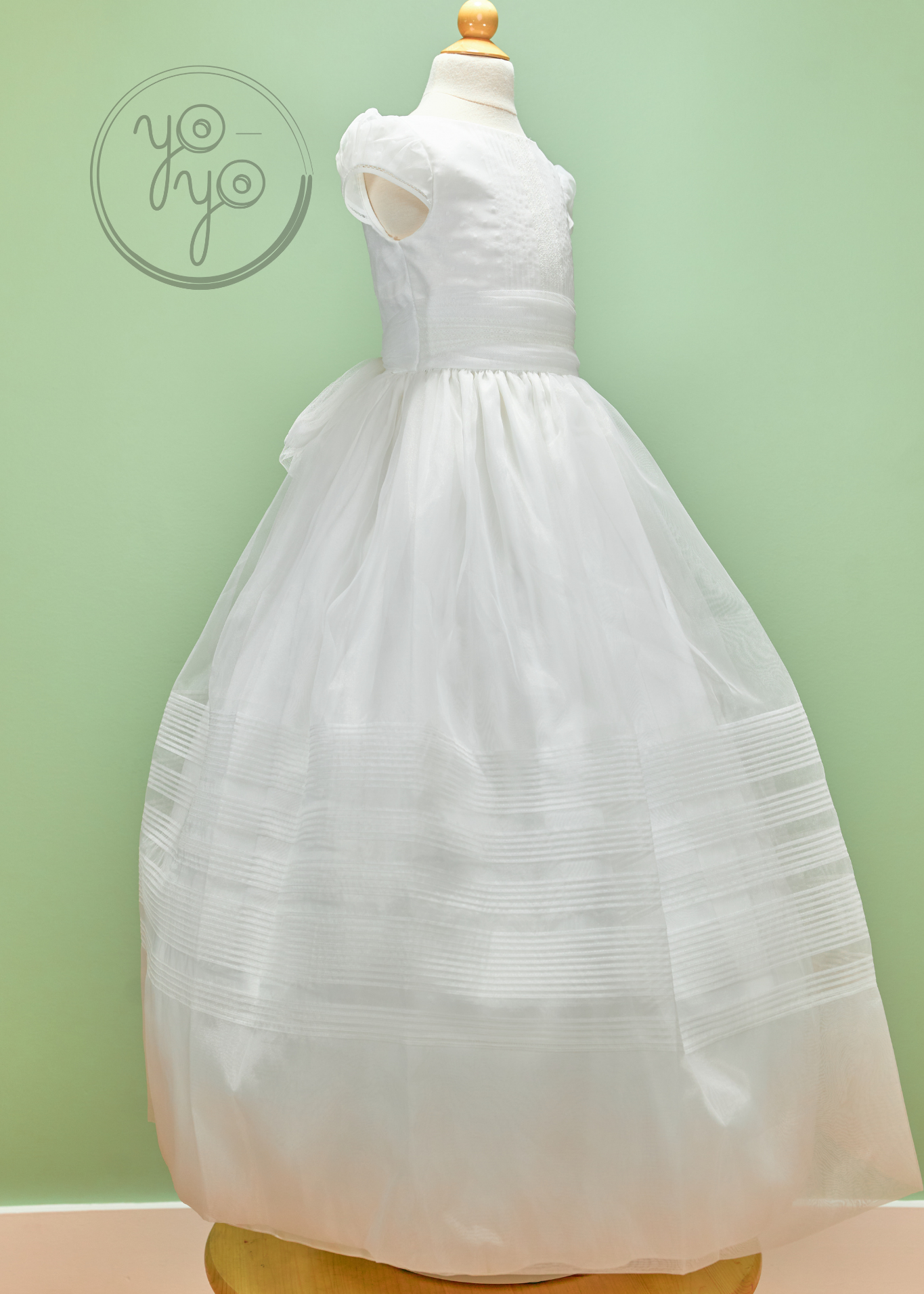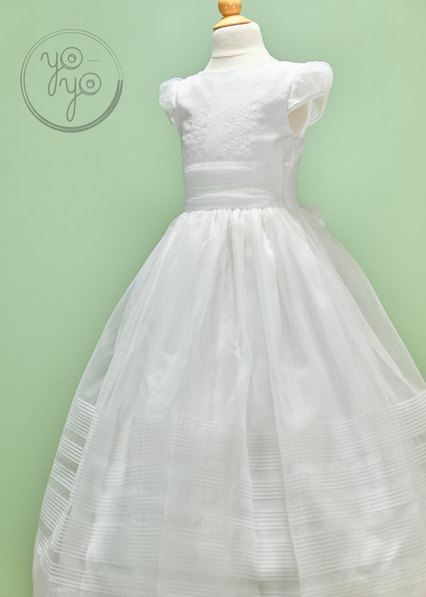 The Girasol First Communion Dress is an adorable gown filled with dainty and traditional details. Made in lightweight off-white organza, it has a graceful, airy design perfect for a meaningful celebration.