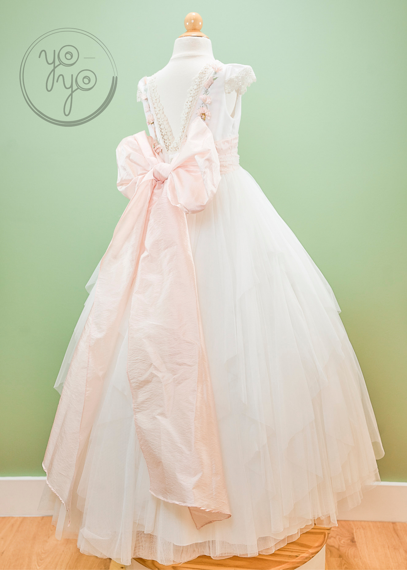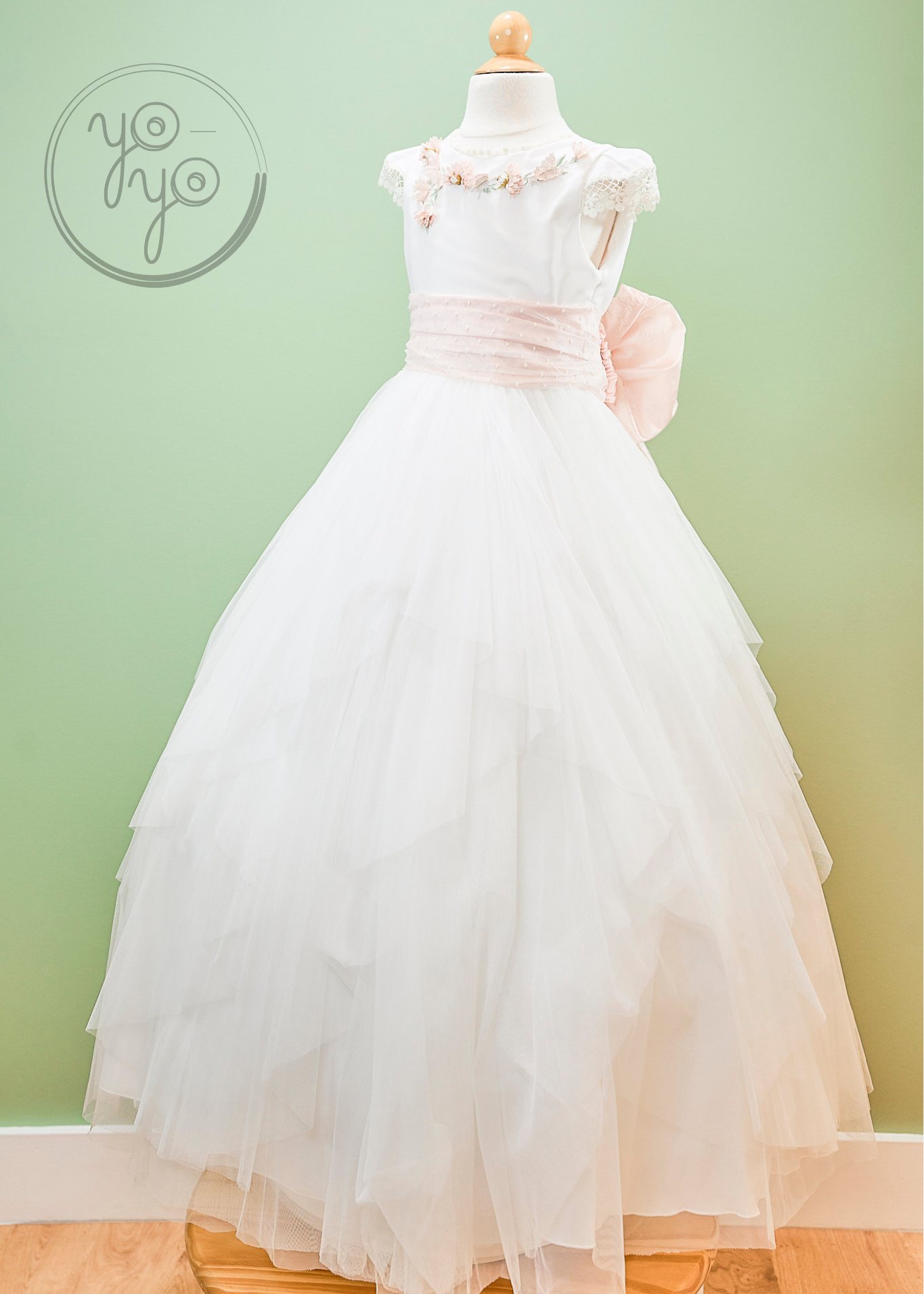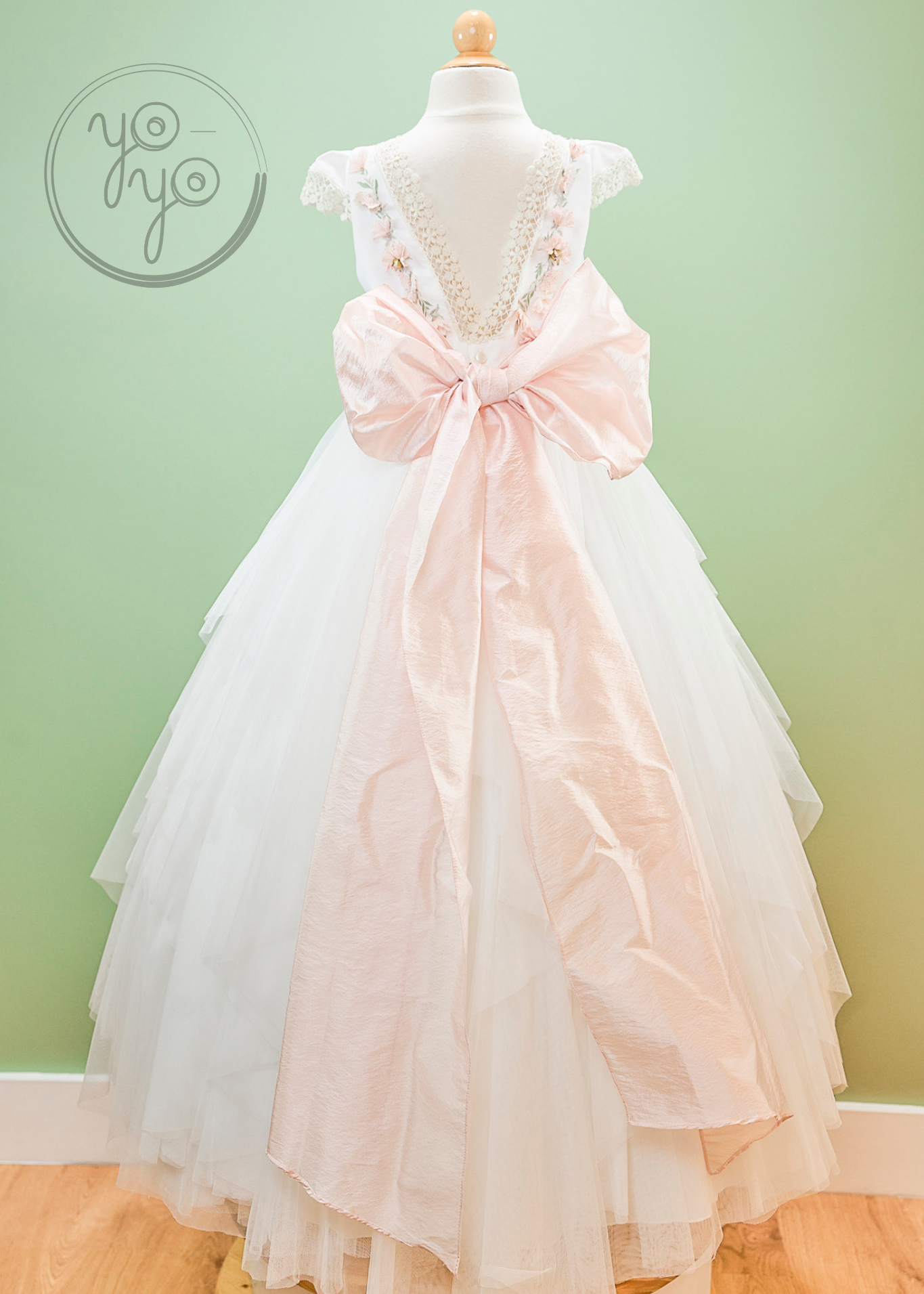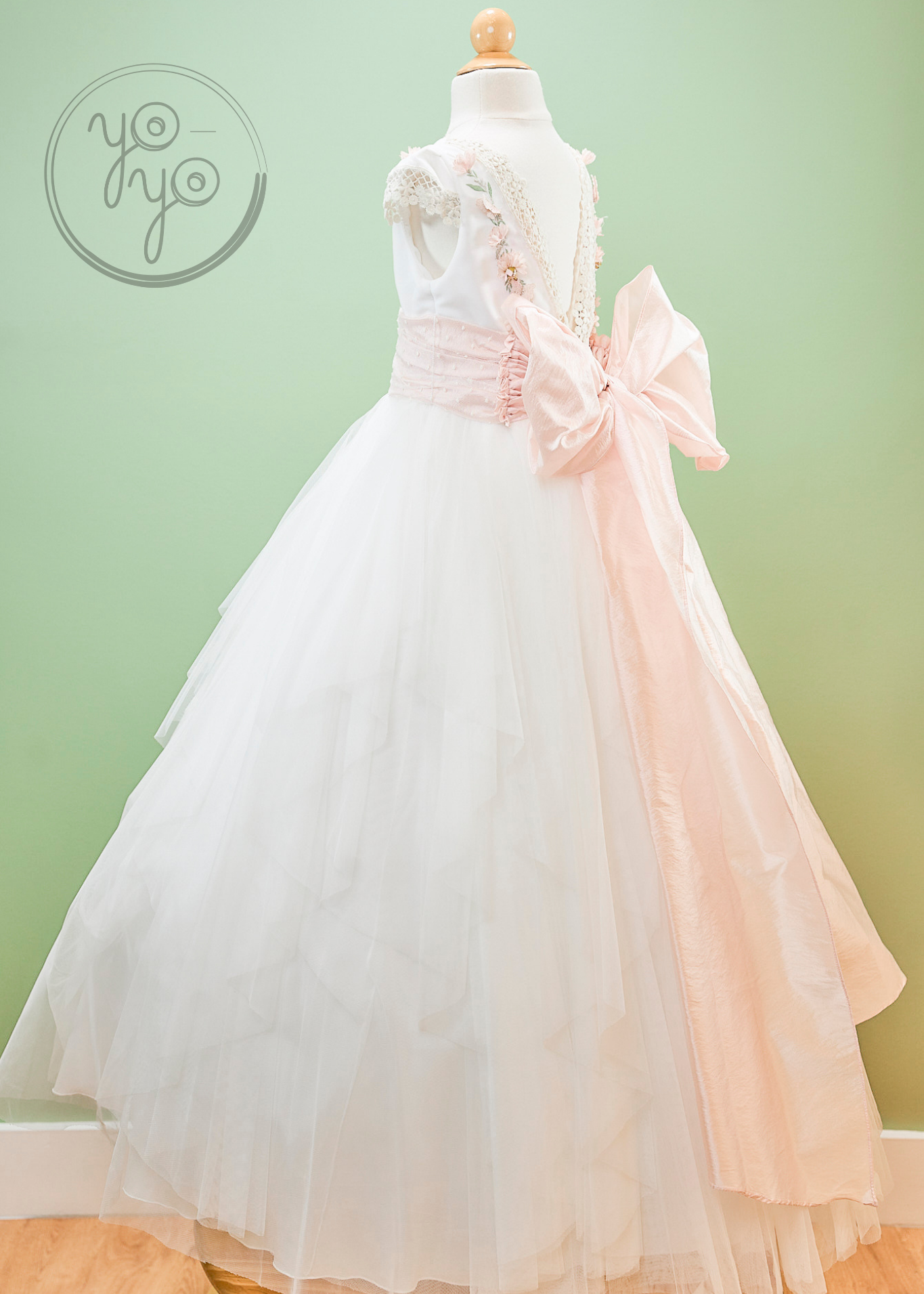The Giulia Dress is a romantic and unique design, perfect for First Communion or any special occasion. The skirt is crafted from layers of soft French tulle, creating a graceful, airy silhouette that moves beautifully with every step.