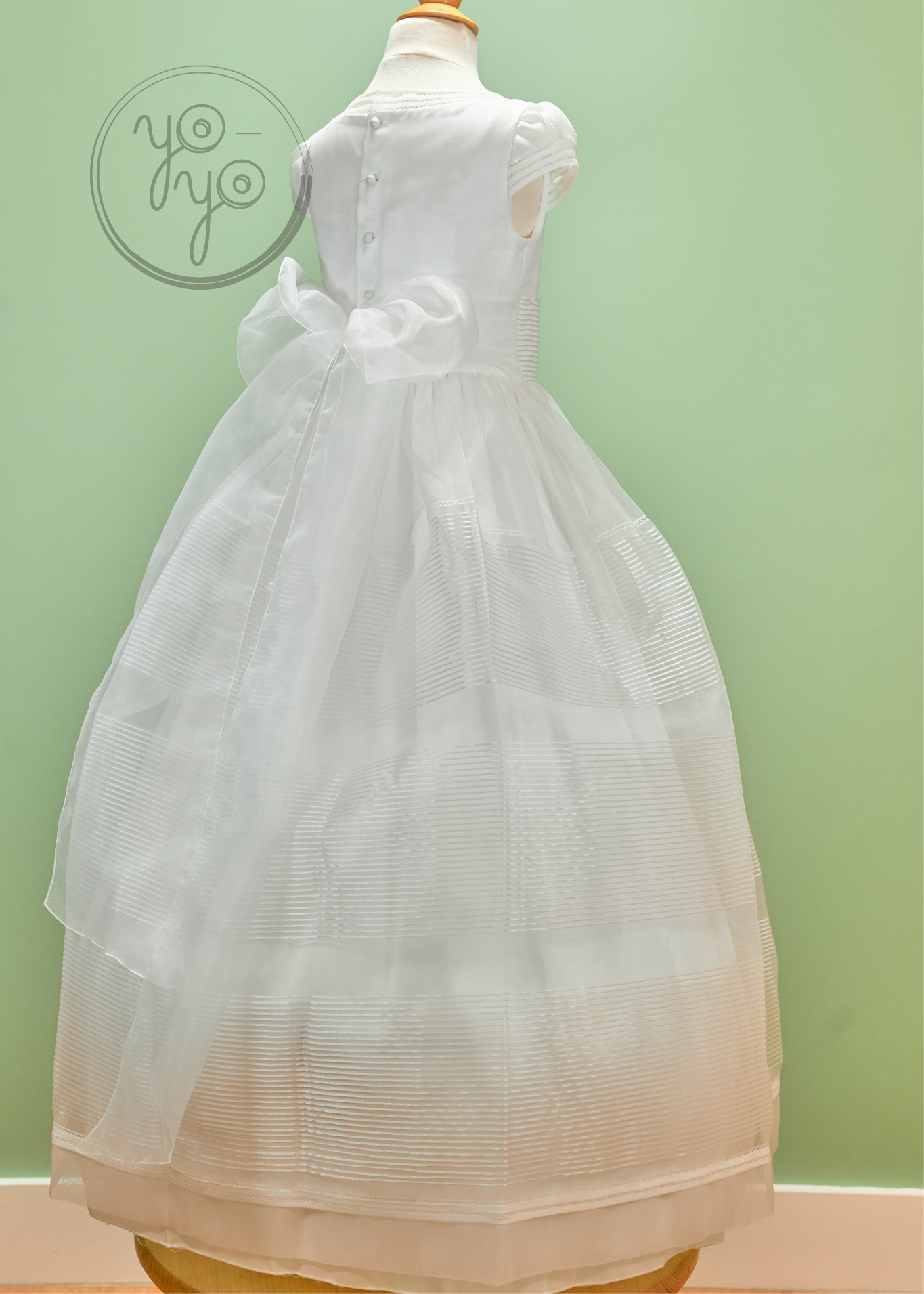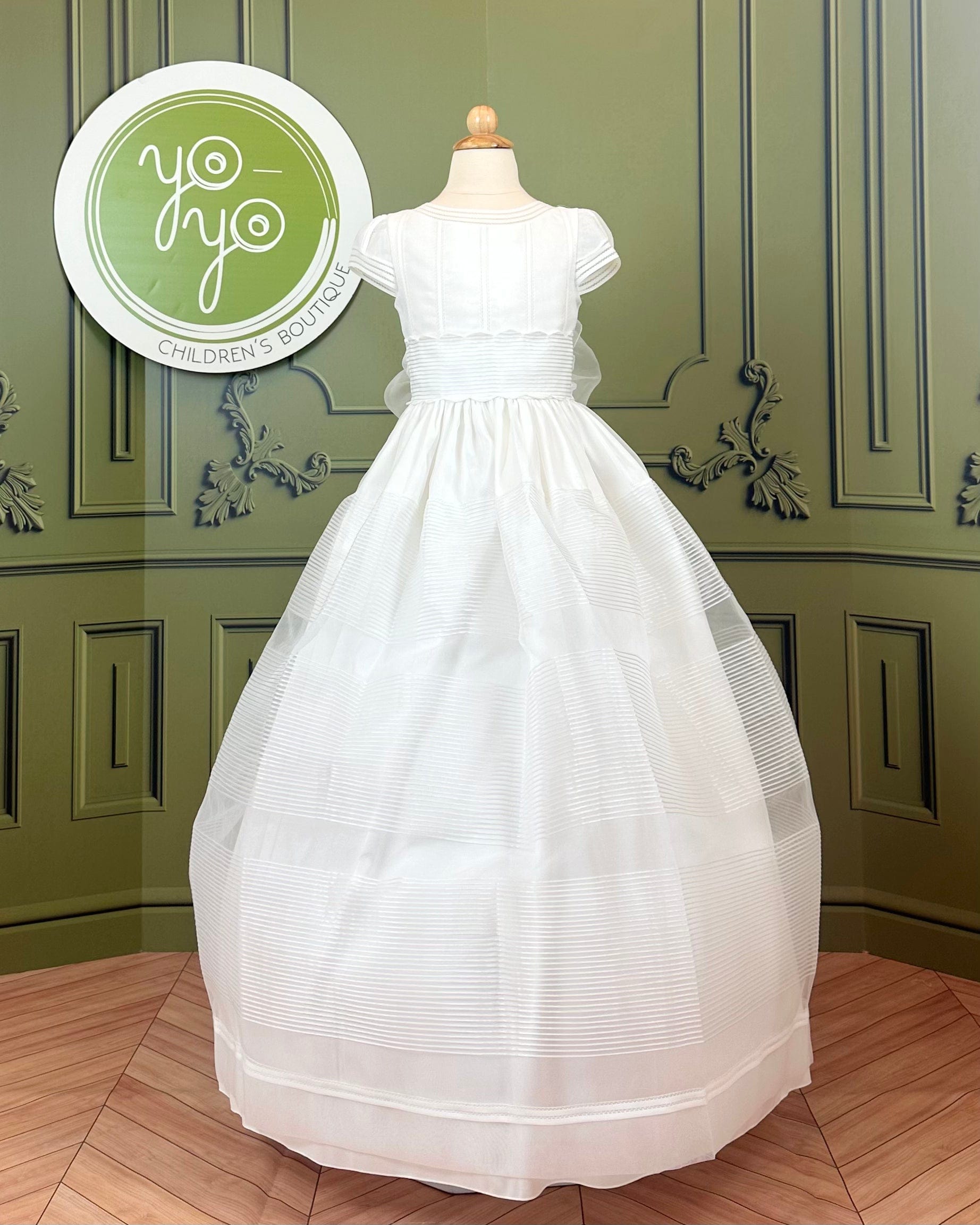 At the back, covered buttons provide a polished finish, and organza ties form a soft bow, completing this graceful design. Jade is a perfect choice for families who value simplicity, elegance, and tradition in a Communion dress.