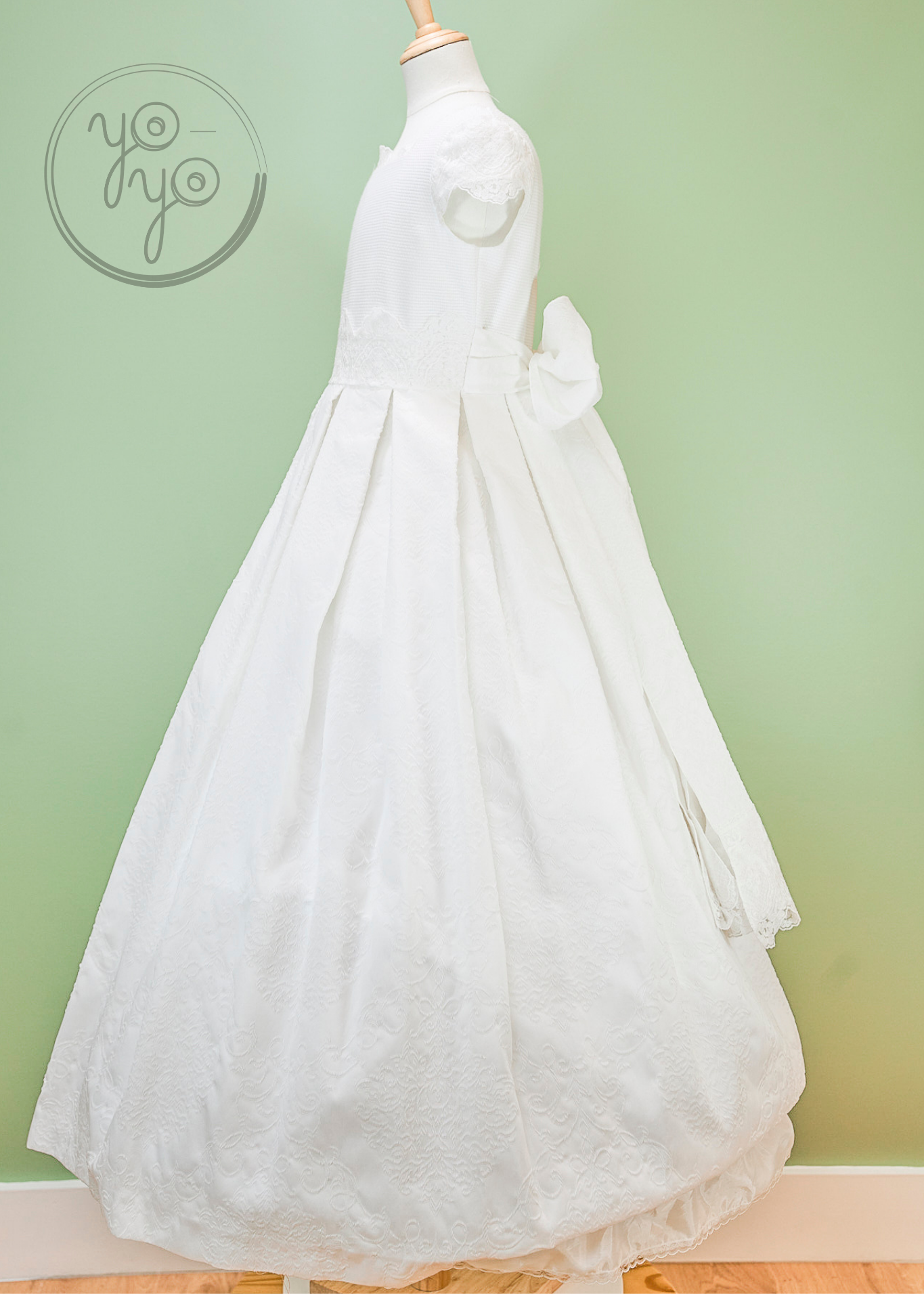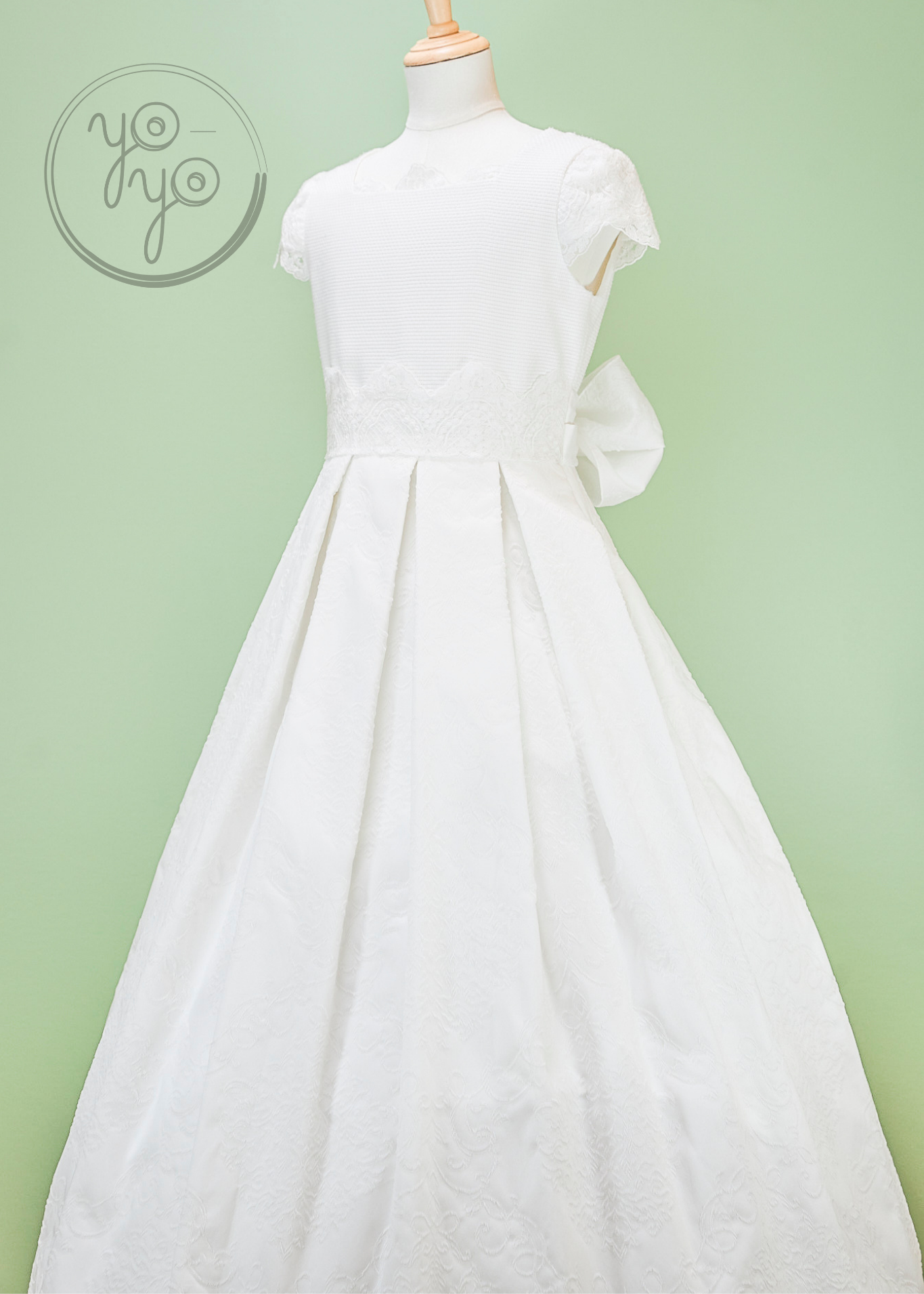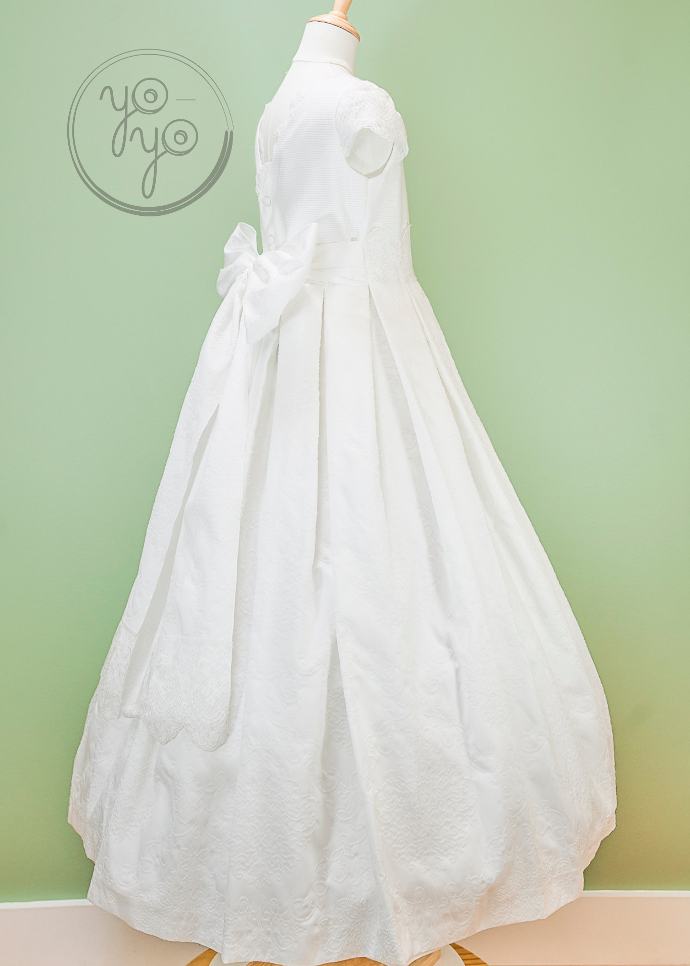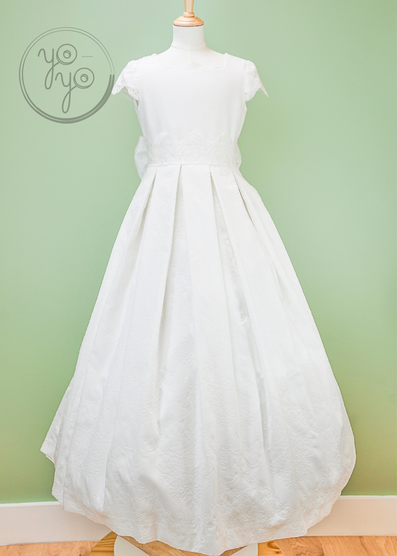 The Lea First Communion Dress blends tradition with a touch of modern elegance through its choice of fabric. Crafted from refined white jacquard, it offers a unique texture and structure while maintaining a classic silhouette.