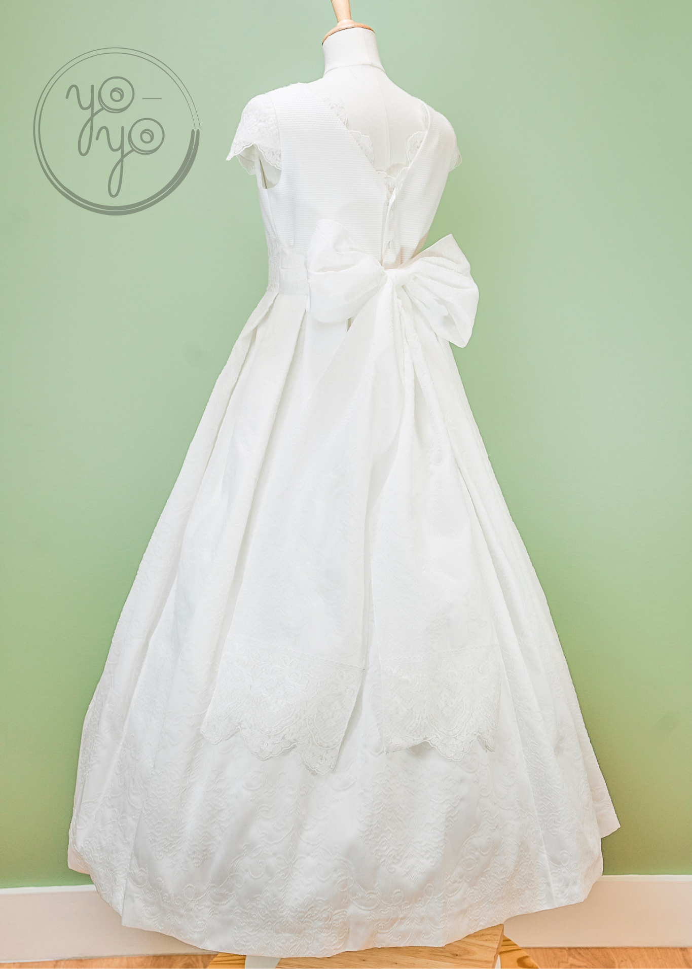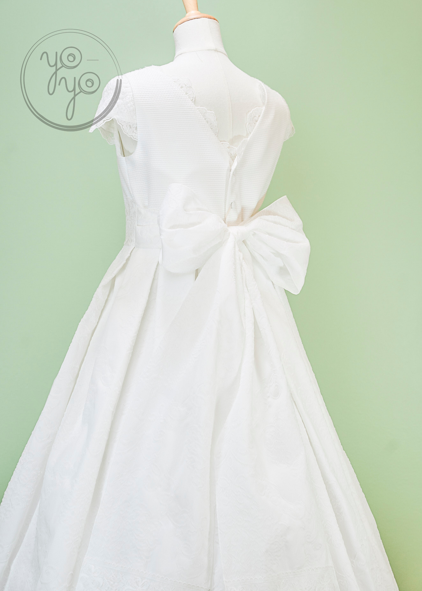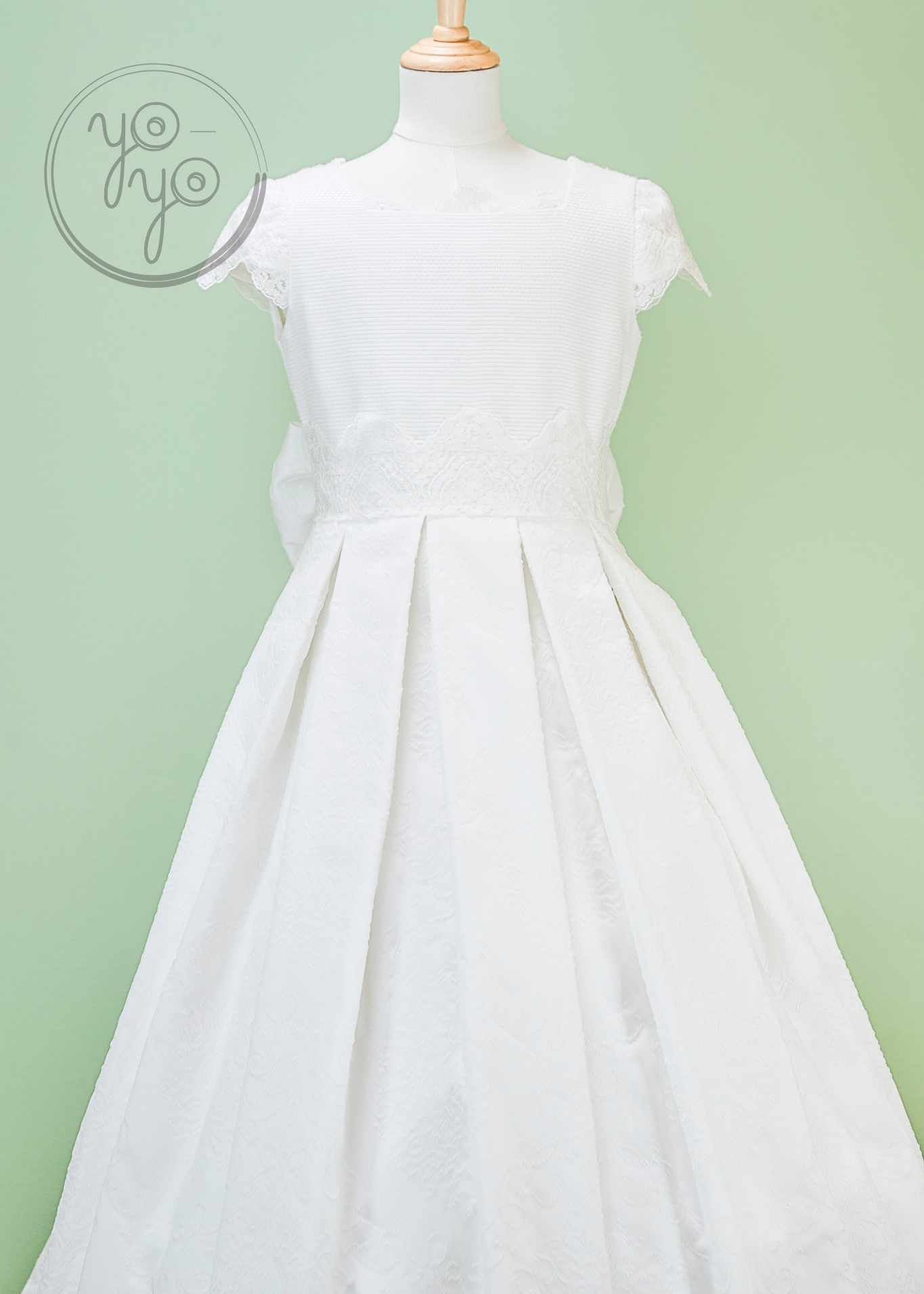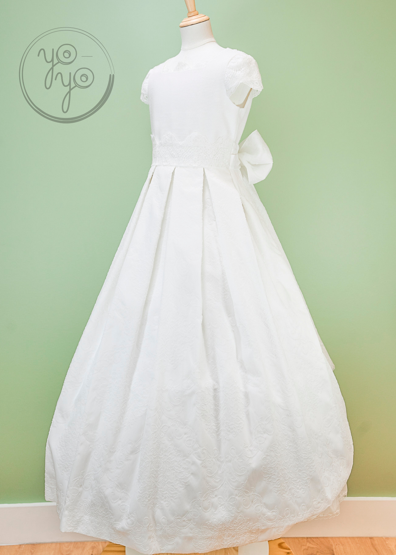 The Lea First Communion Dress blends tradition with a touch of modern elegance through its choice of fabric. Crafted from refined white jacquard, it offers a unique texture and structure while maintaining a classic silhouette.