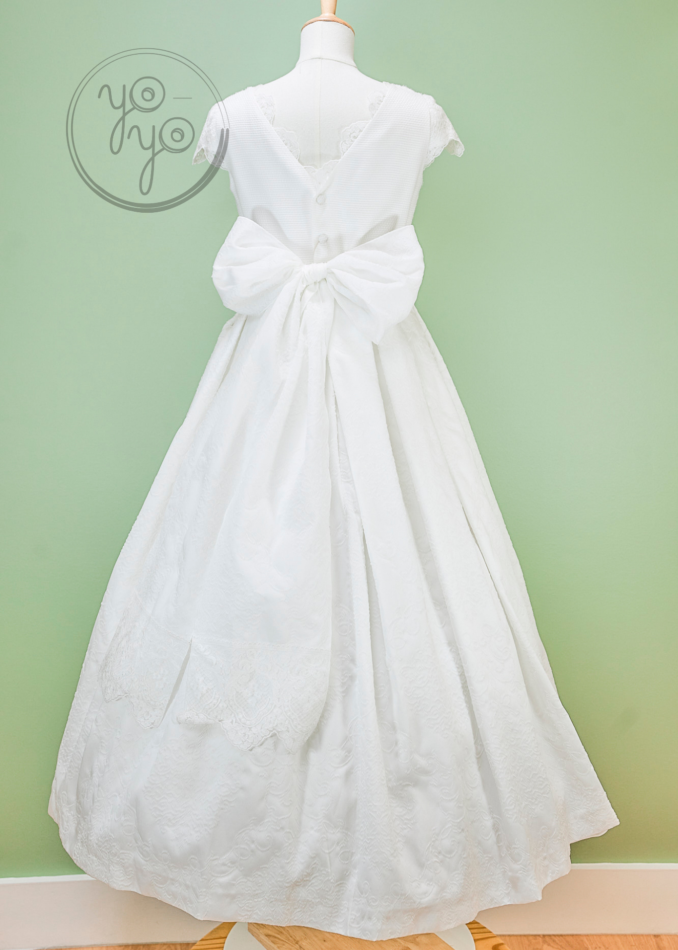 The gown features a V-back with delicate buttons and ties into a soft bow, creating a timeless and graceful finish.