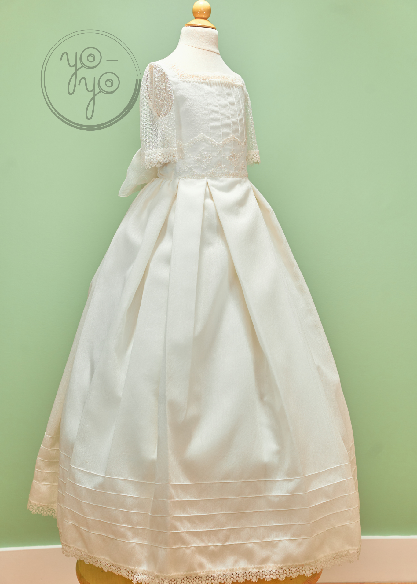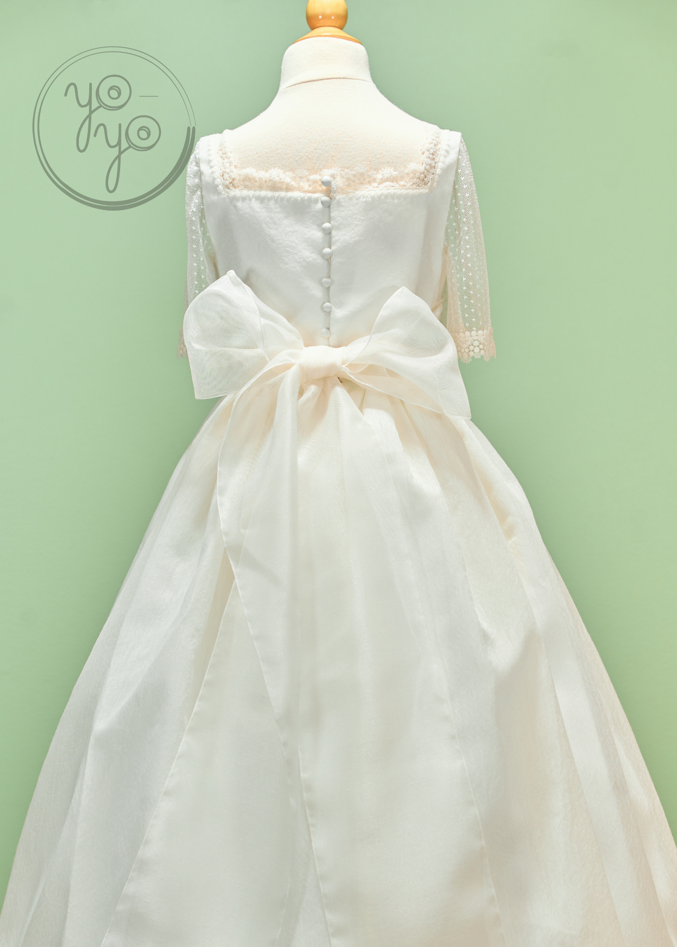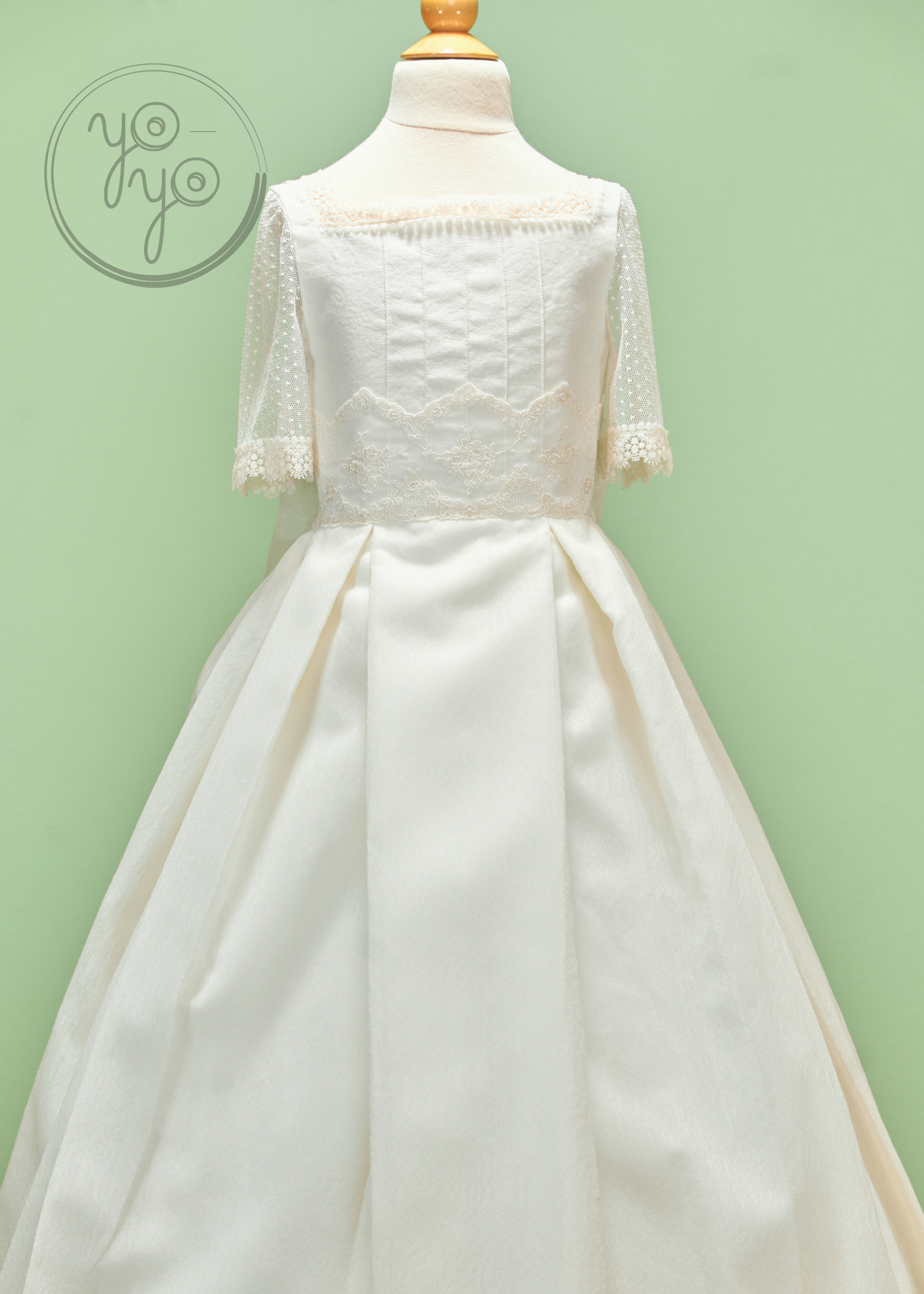 The Margot First Communion Dress is a unique hybrid design, blending traditional elegance with boho-inspired details. Crafted in an off-white jacquard-like fabric, this gown offers sophistication with a contemporary twist.
