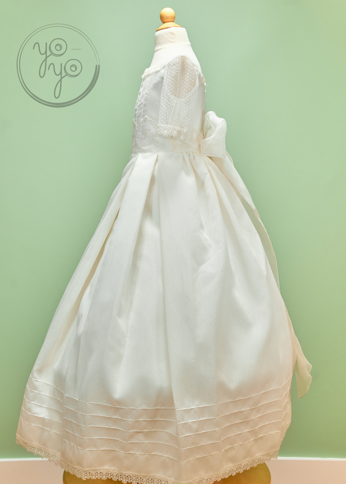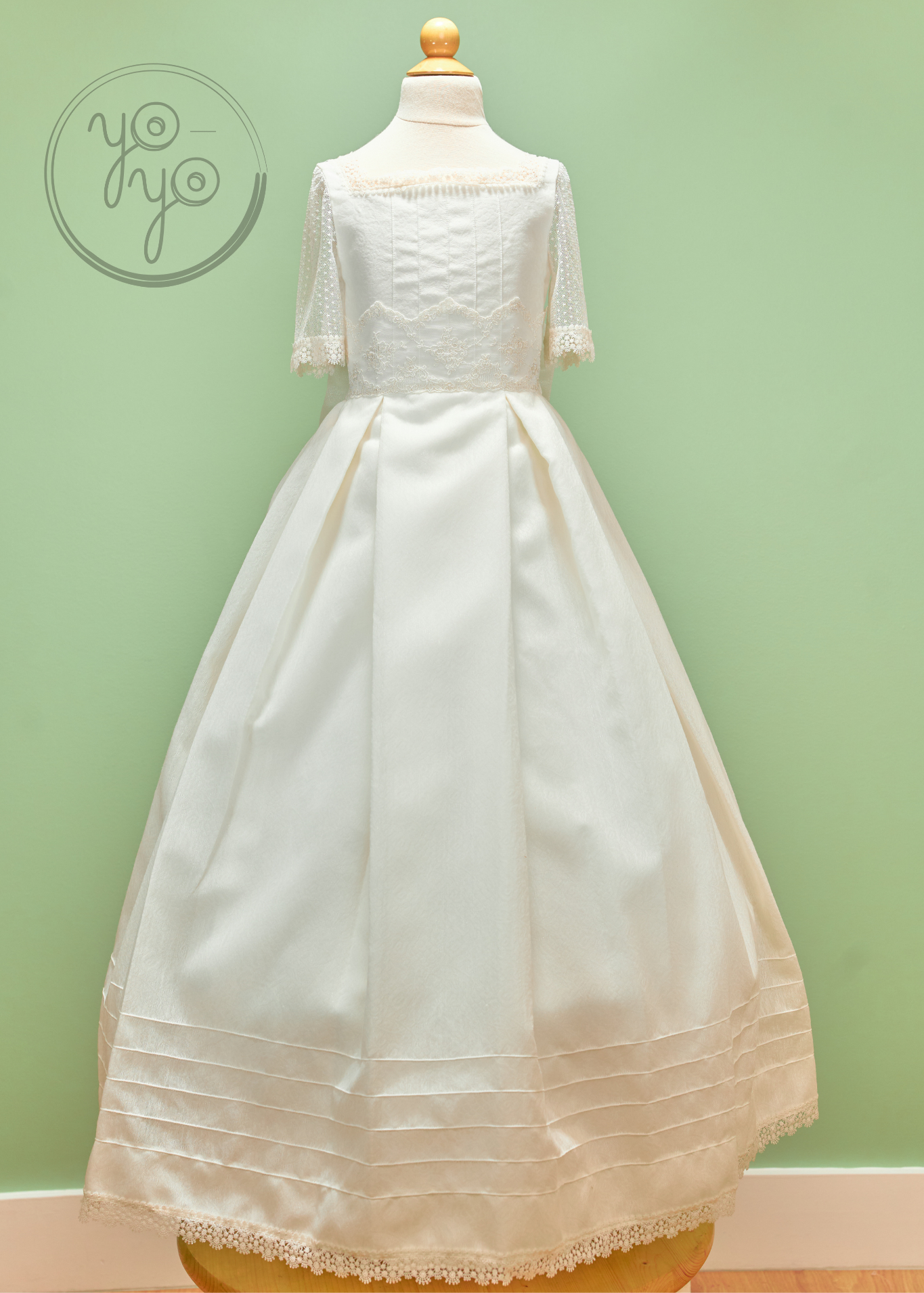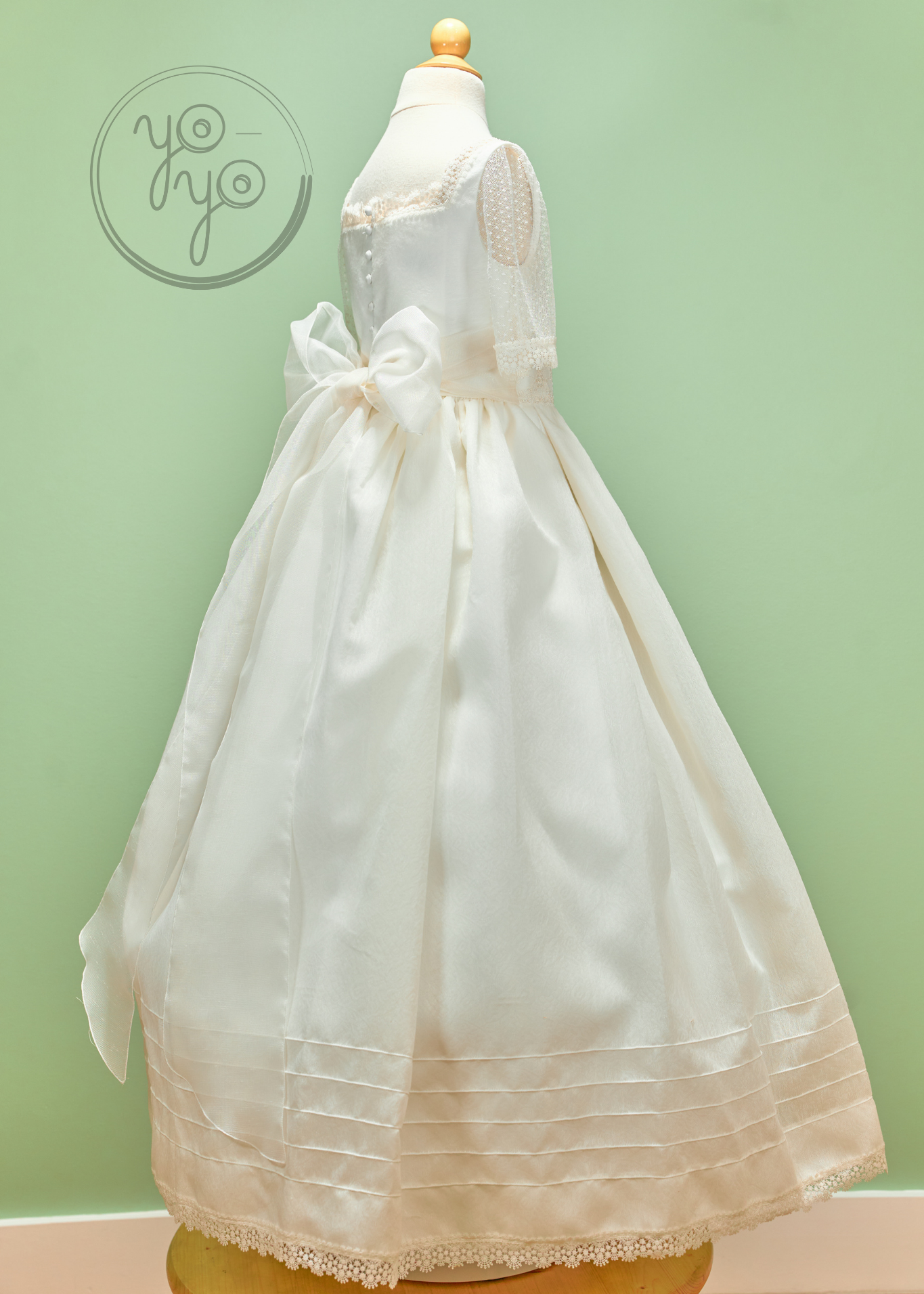 The Margot First Communion Dress is a unique hybrid design, blending traditional elegance with boho-inspired details. Crafted in an off-white jacquard-like fabric, this gown offers sophistication with a contemporary twist.